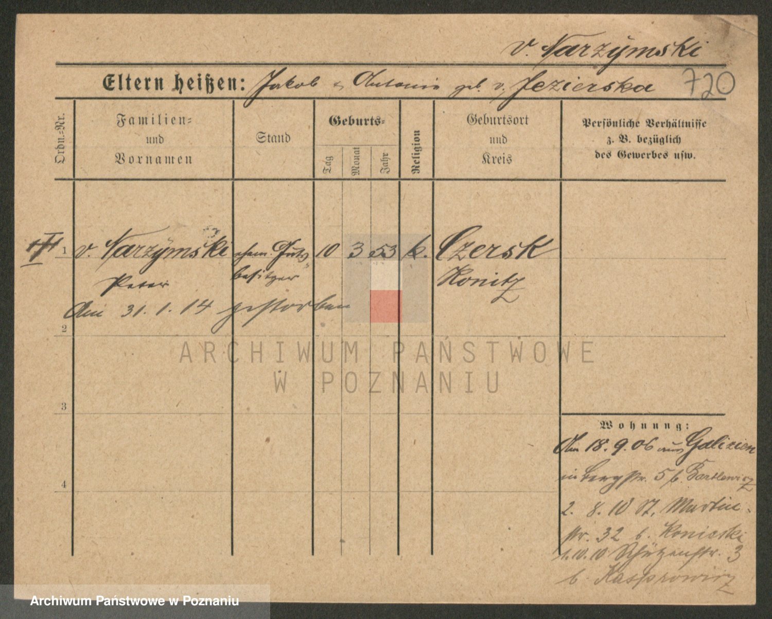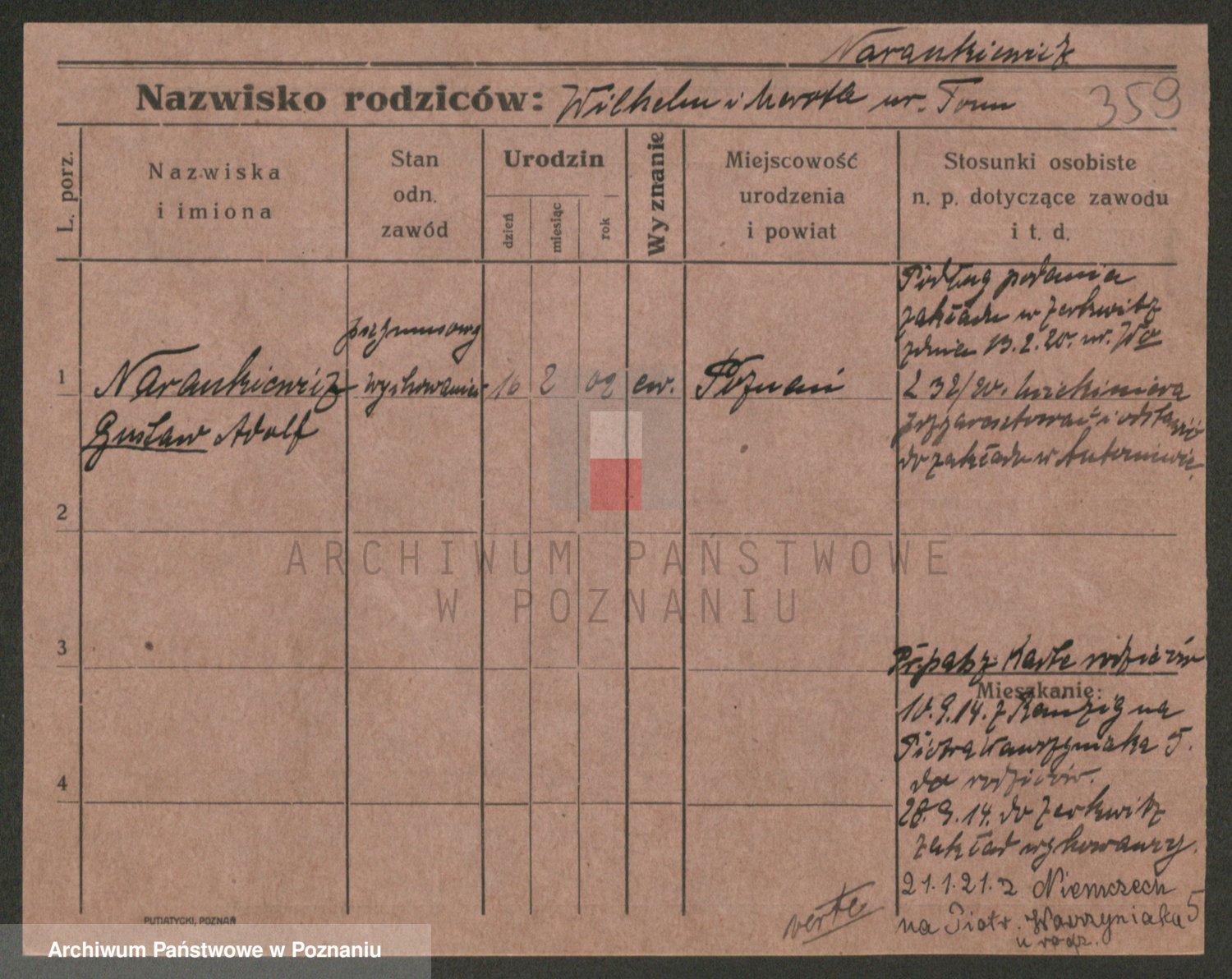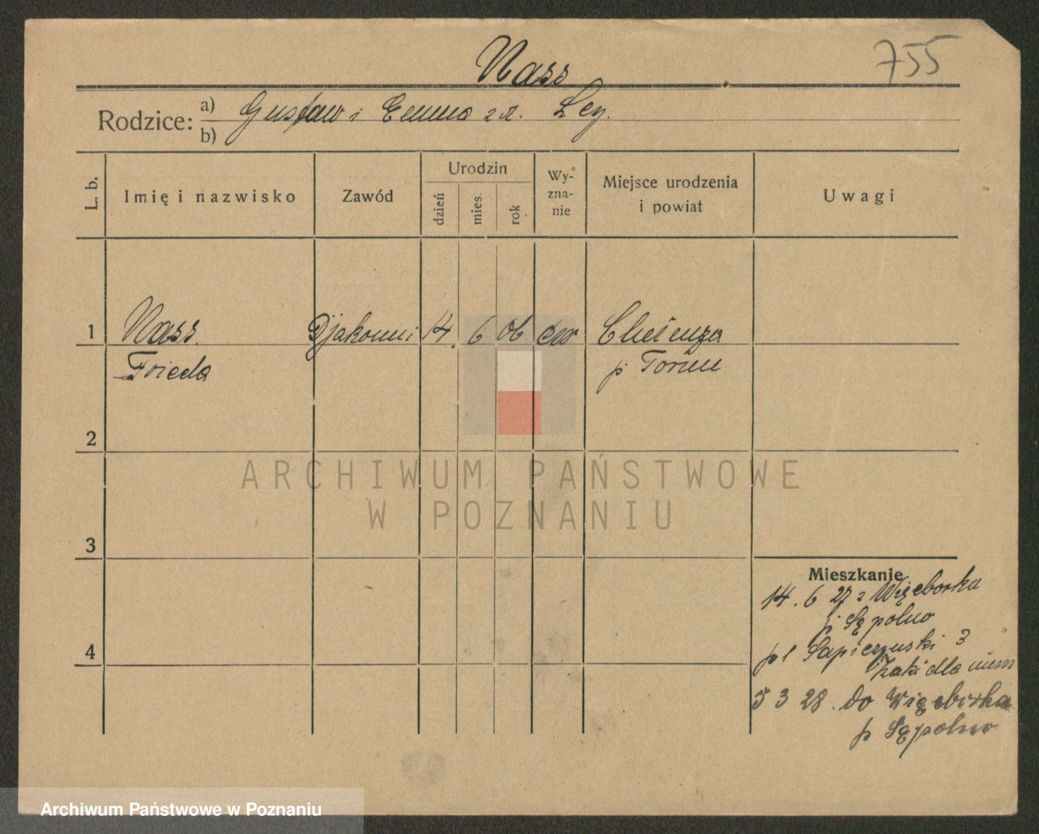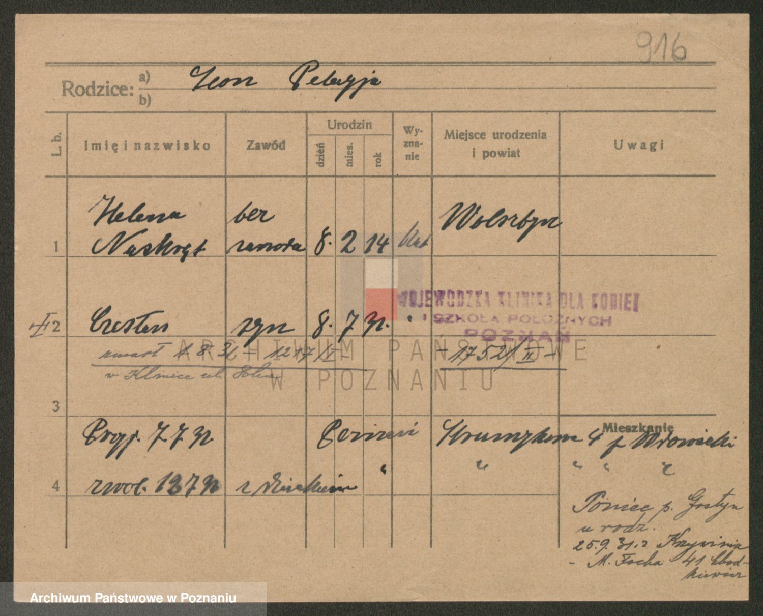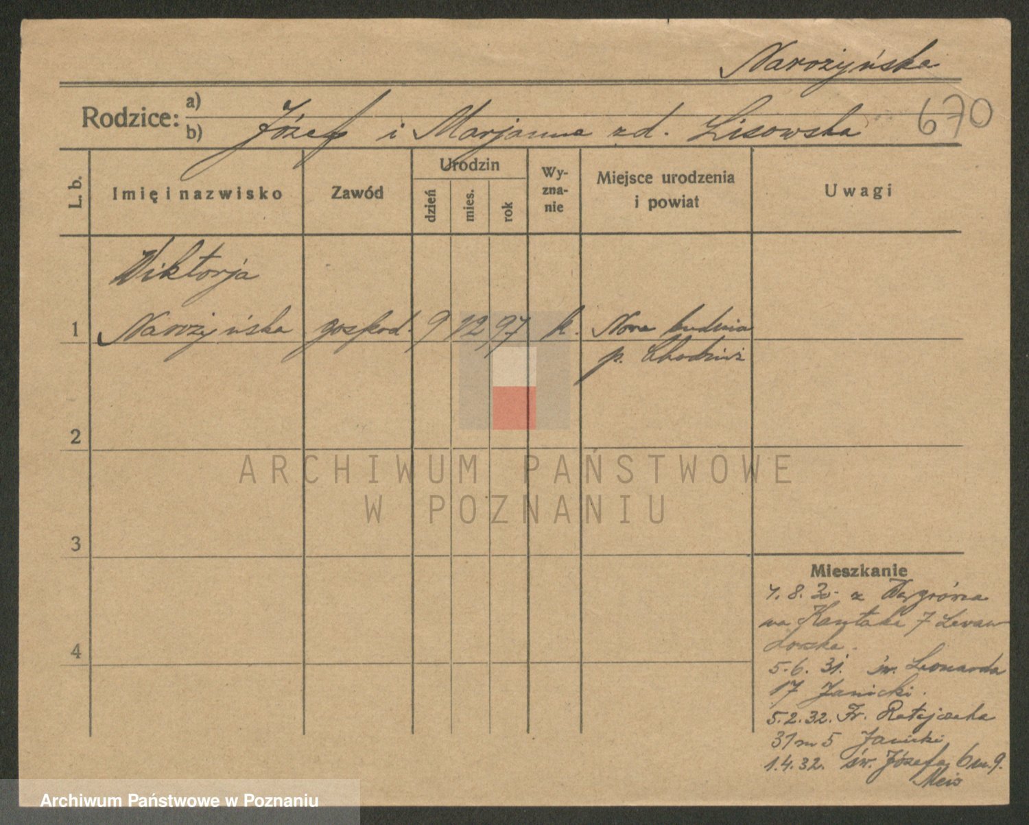 Podgląd karty osobowej dostępny jest po kliknięciu na nazwisko lub ikonkę karty. Można dokonywać powiększenia (ikony na górze) lub przechodzić między kolejnymi skanami (strzałki po bokach).
