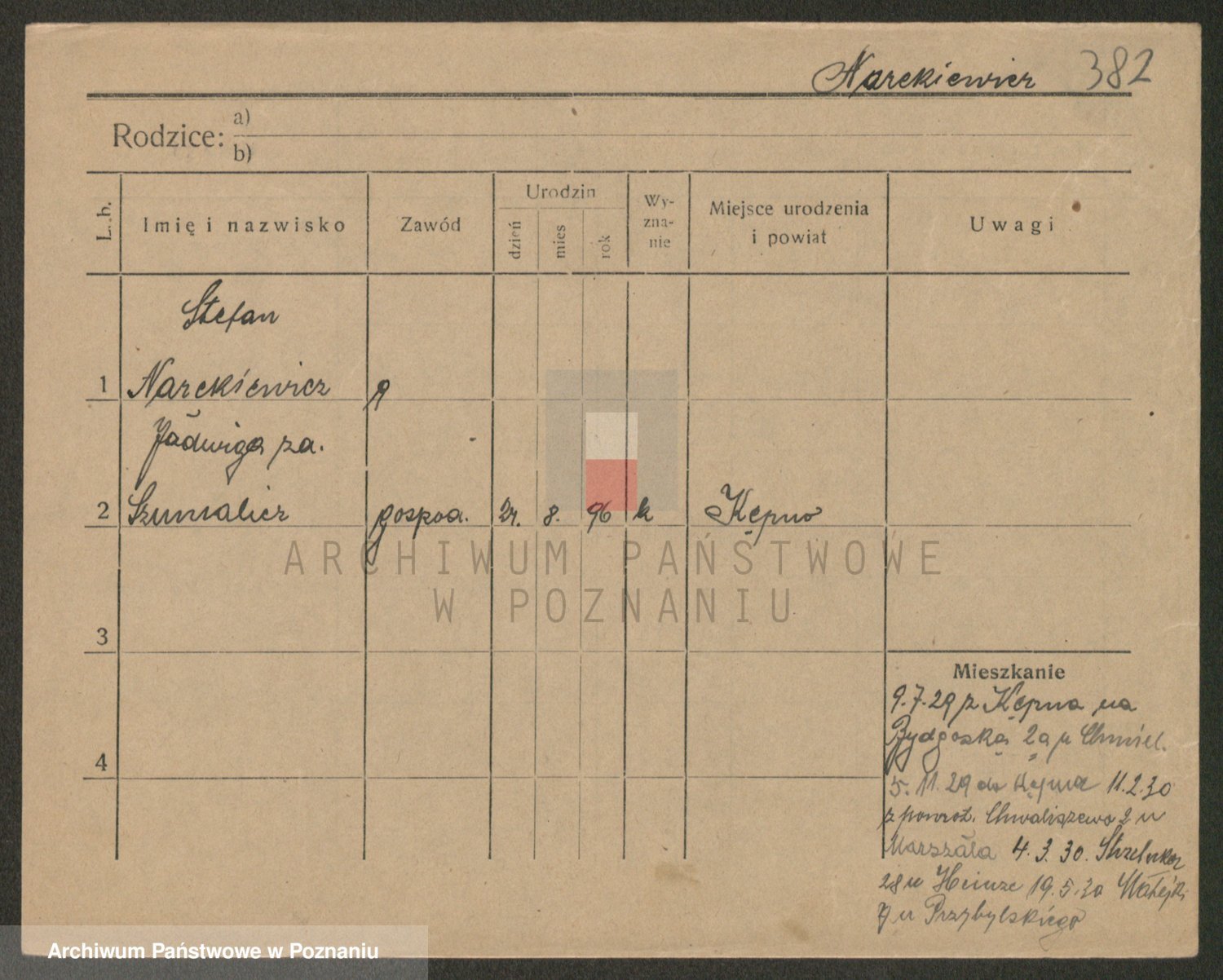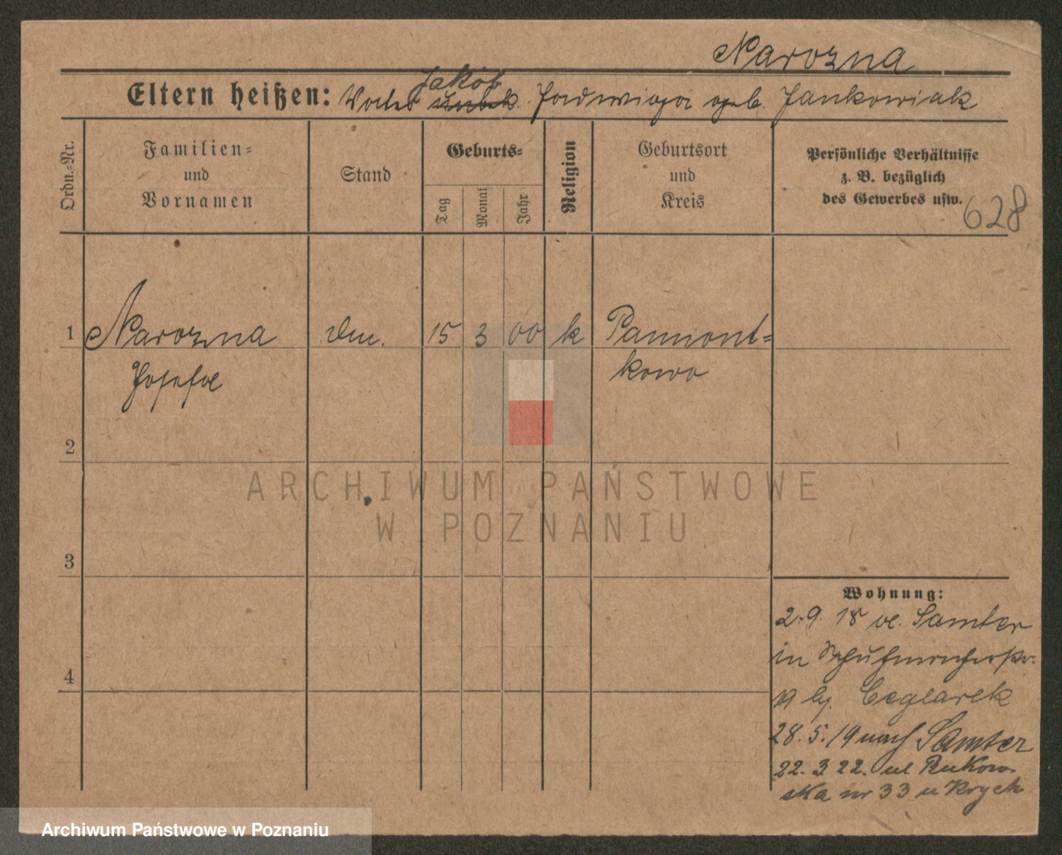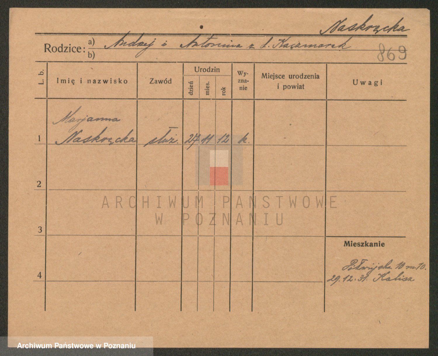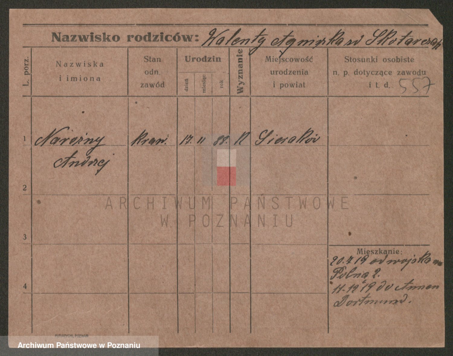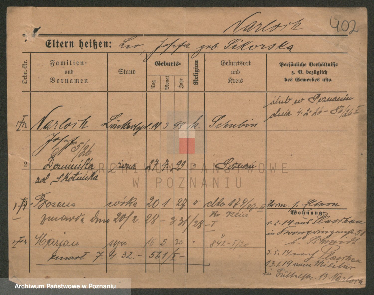 Podgląd karty osobowej dostępny jest po kliknięciu na nazwisko lub ikonkę karty. Można dokonywać powiększenia (ikony na górze) lub przechodzić między kolejnymi skanami (strzałki po bokach).