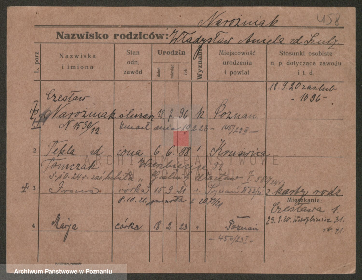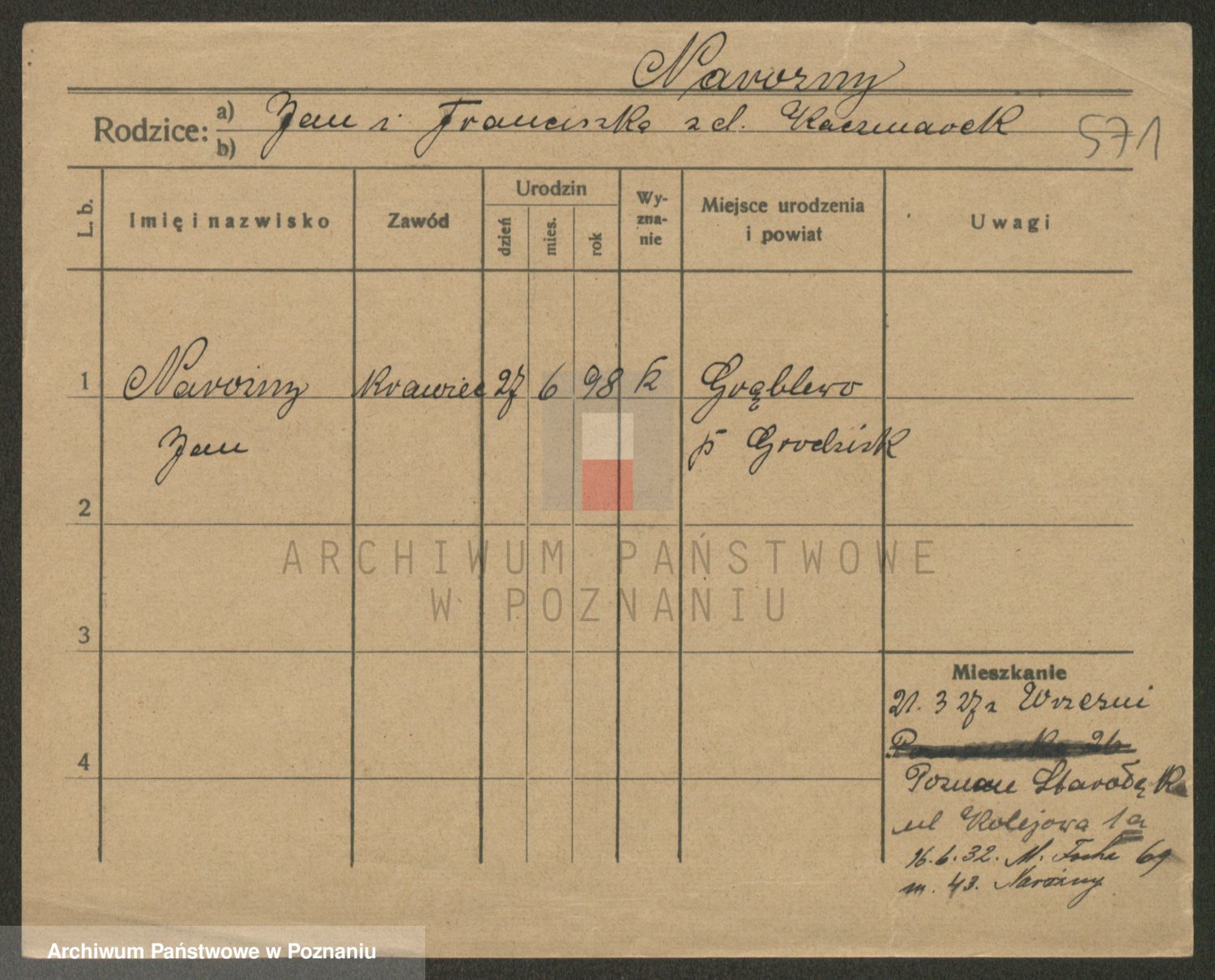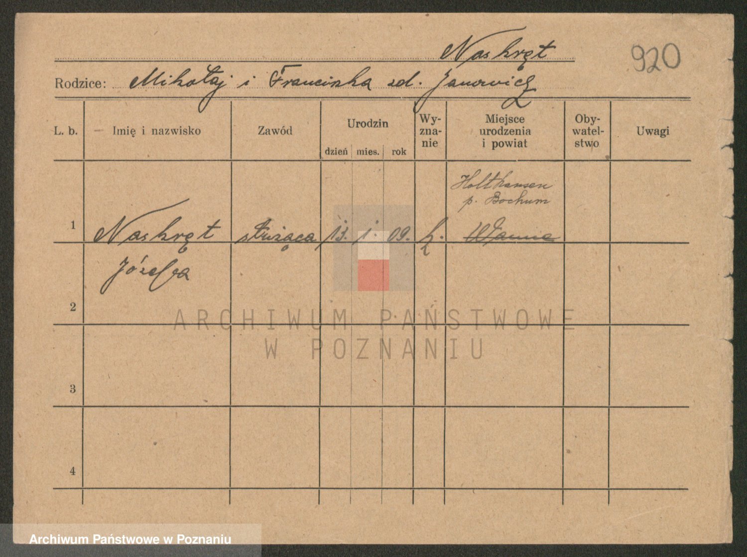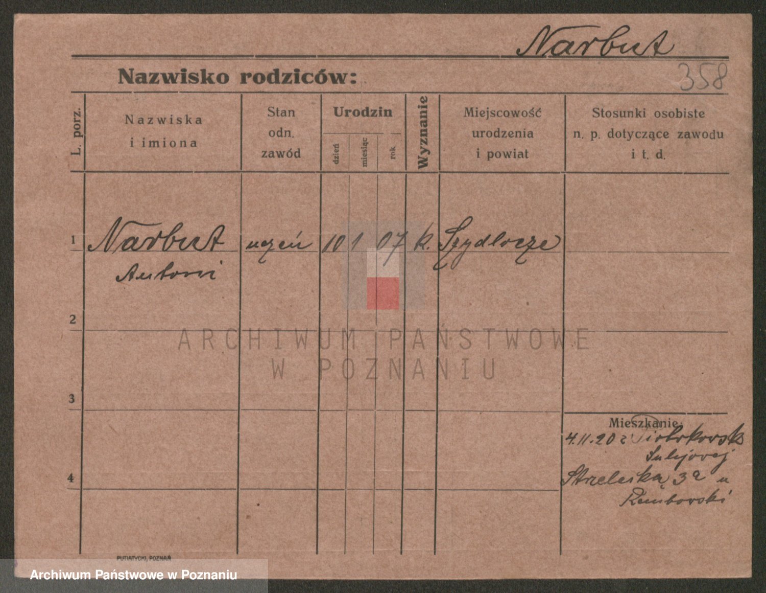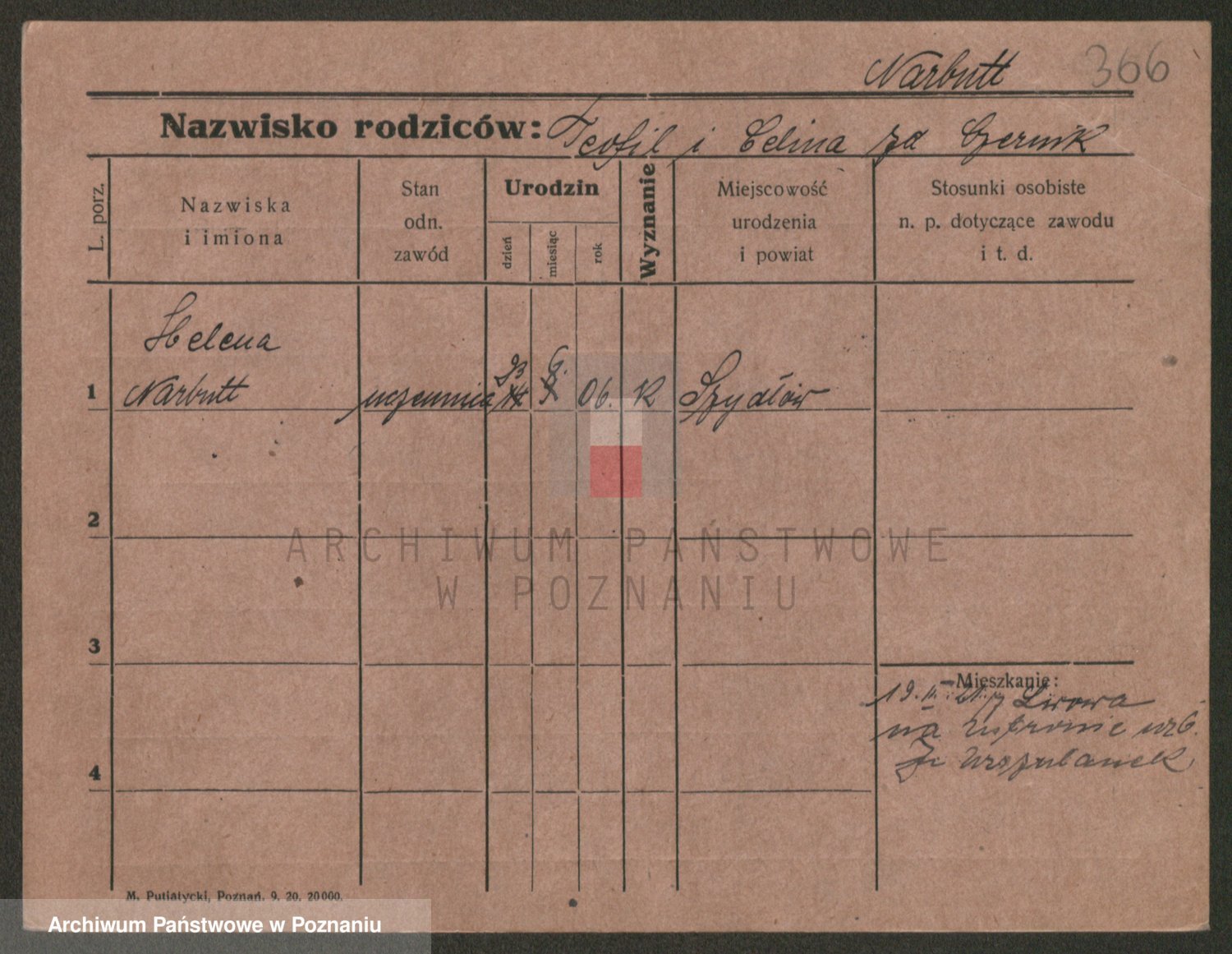 Podgląd karty osobowej dostępny jest po kliknięciu na nazwisko lub ikonkę karty. Można dokonywać powiększenia (ikony na górze) lub przechodzić między kolejnymi skanami (strzałki po bokach).