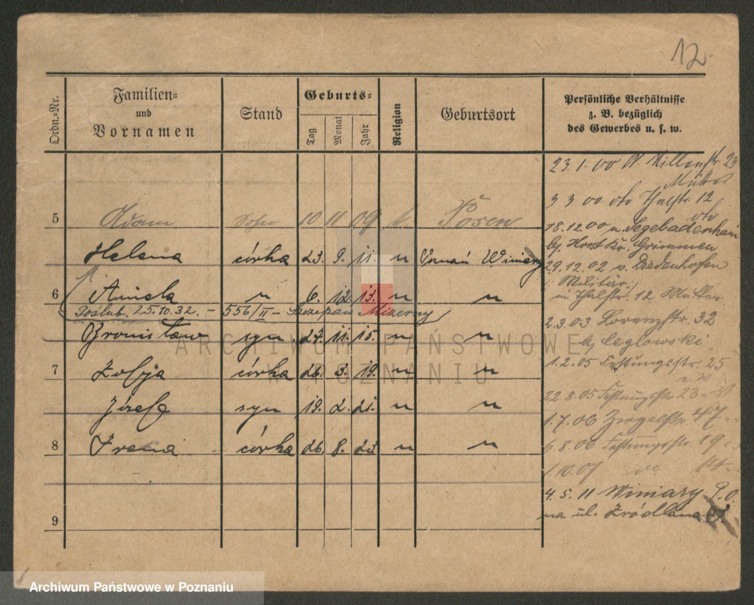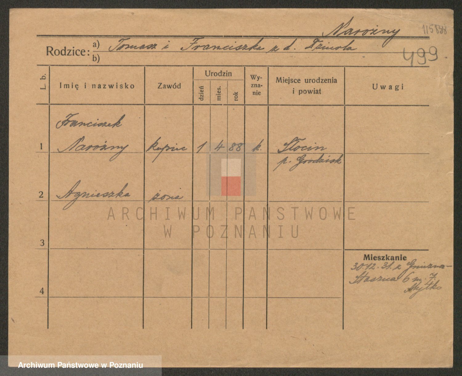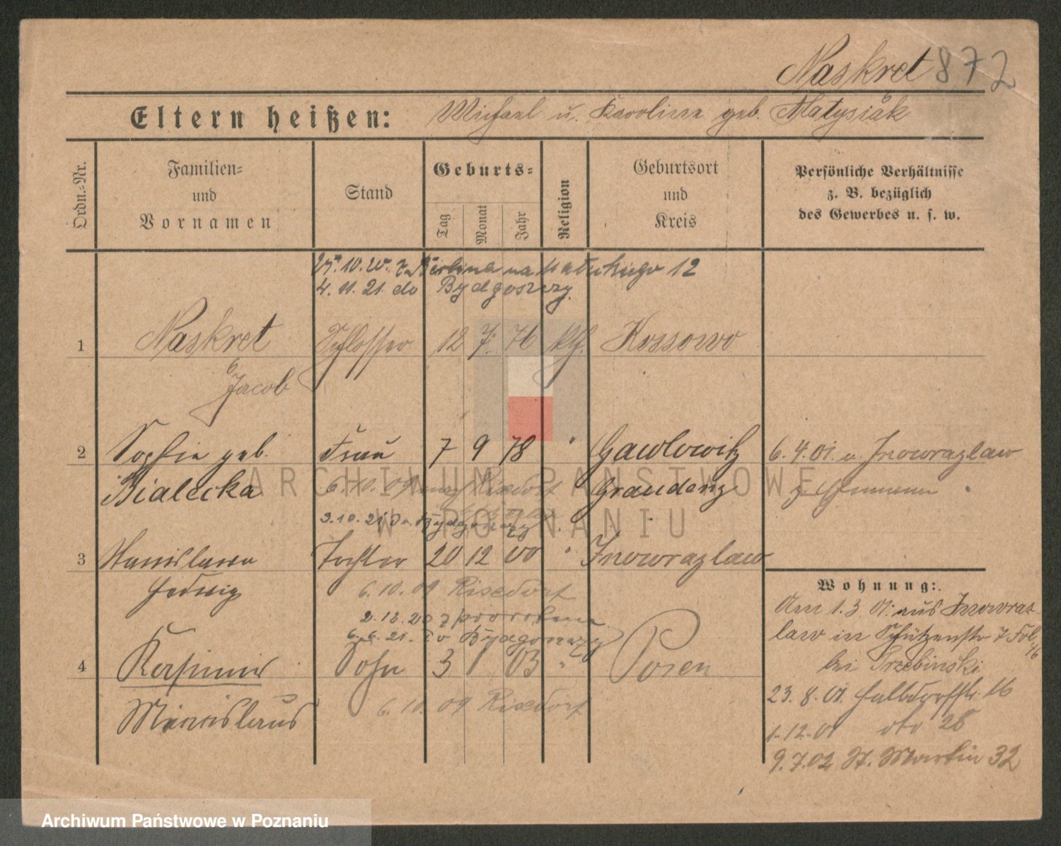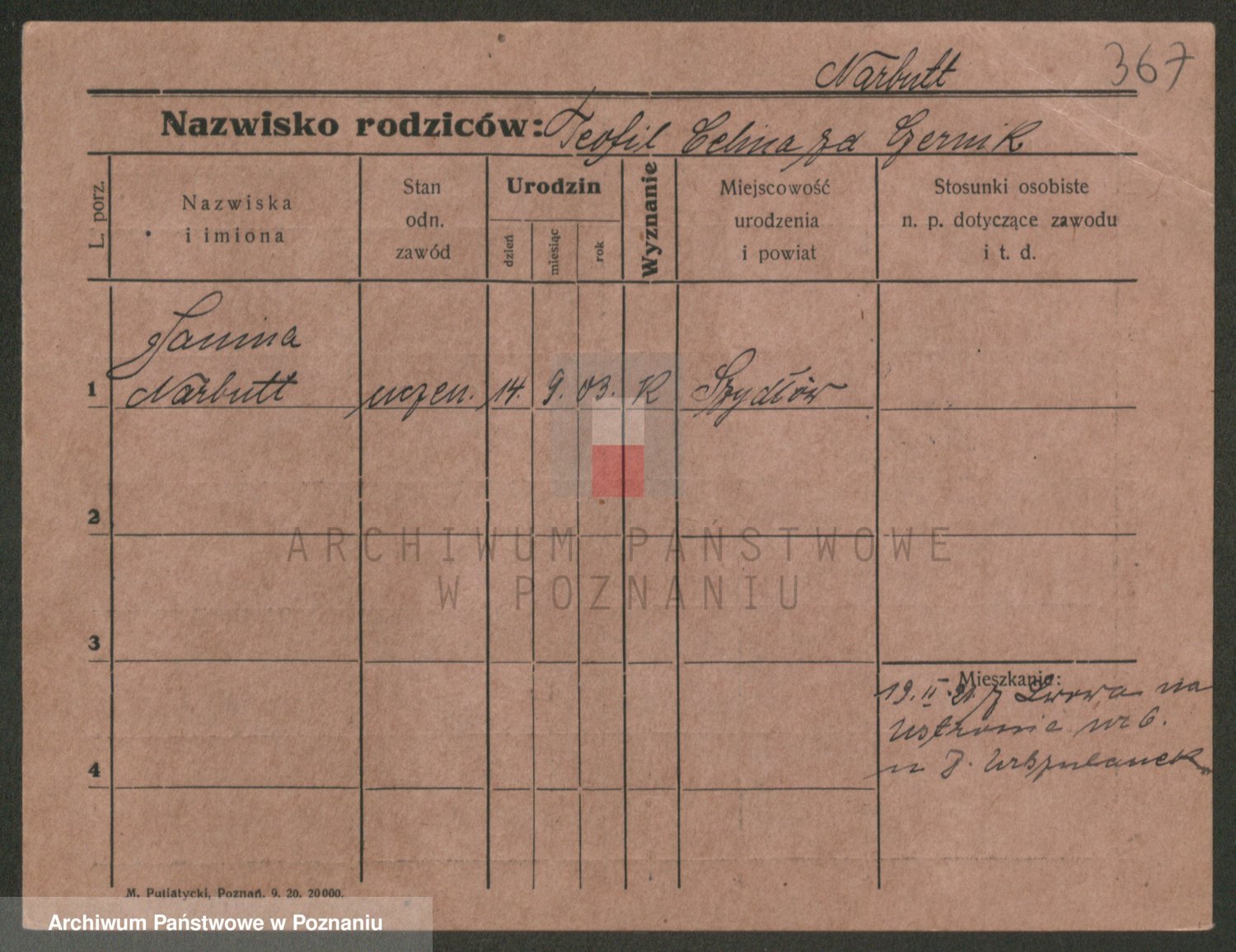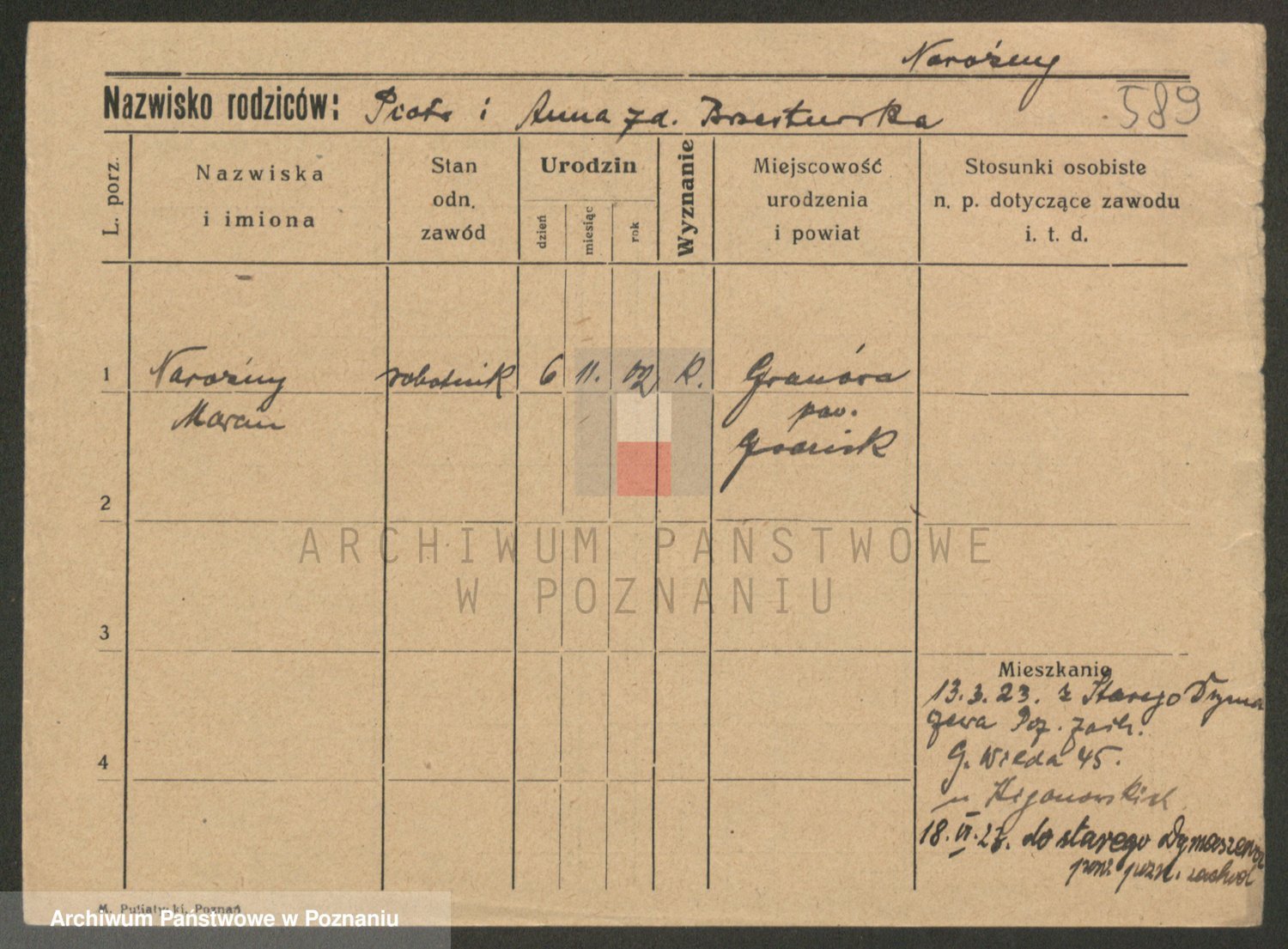 Podgląd karty osobowej dostępny jest po kliknięciu na nazwisko lub ikonkę karty. Można dokonywać powiększenia (ikony na górze) lub przechodzić między kolejnymi skanami (strzałki po bokach).
