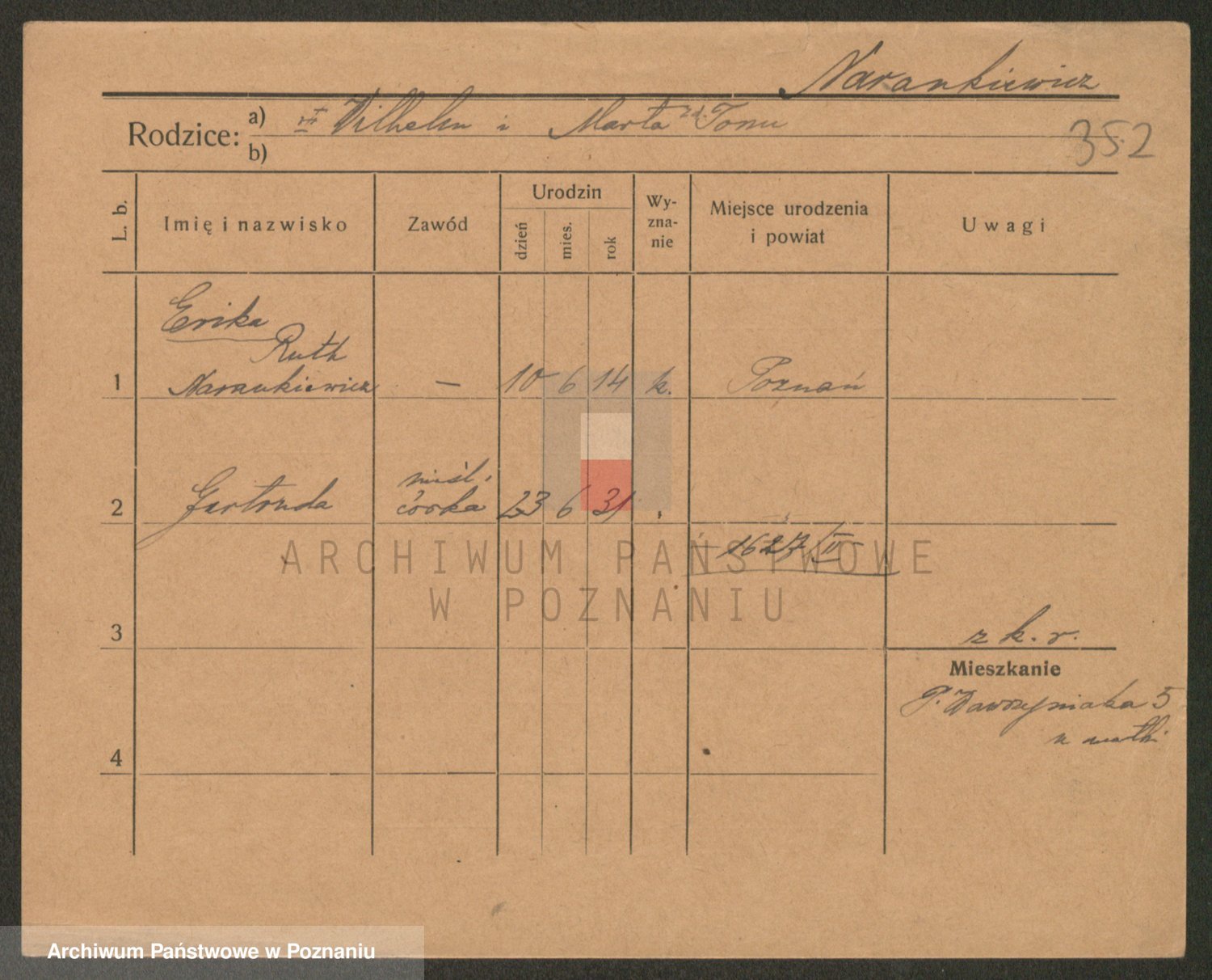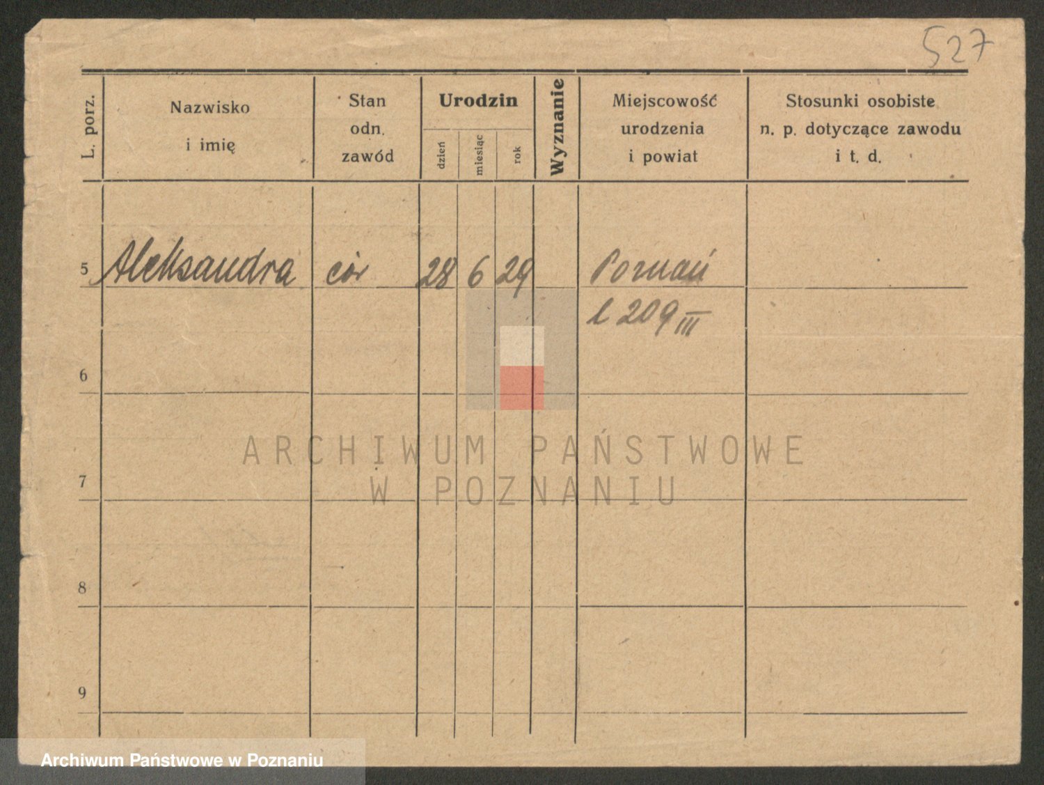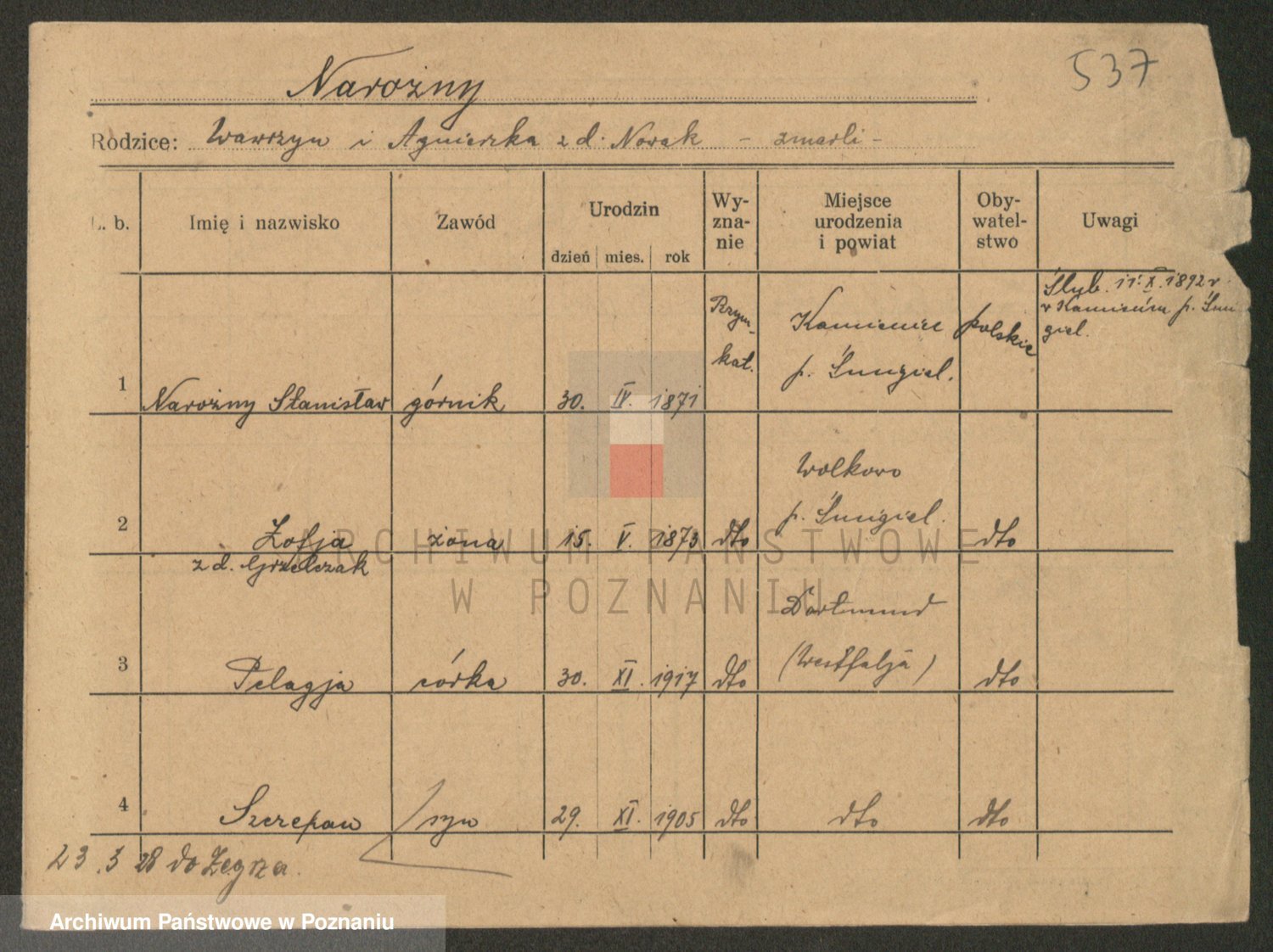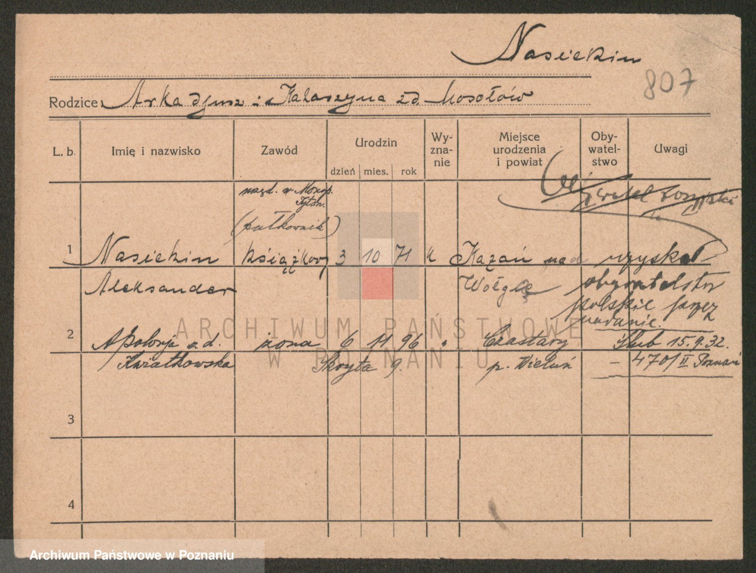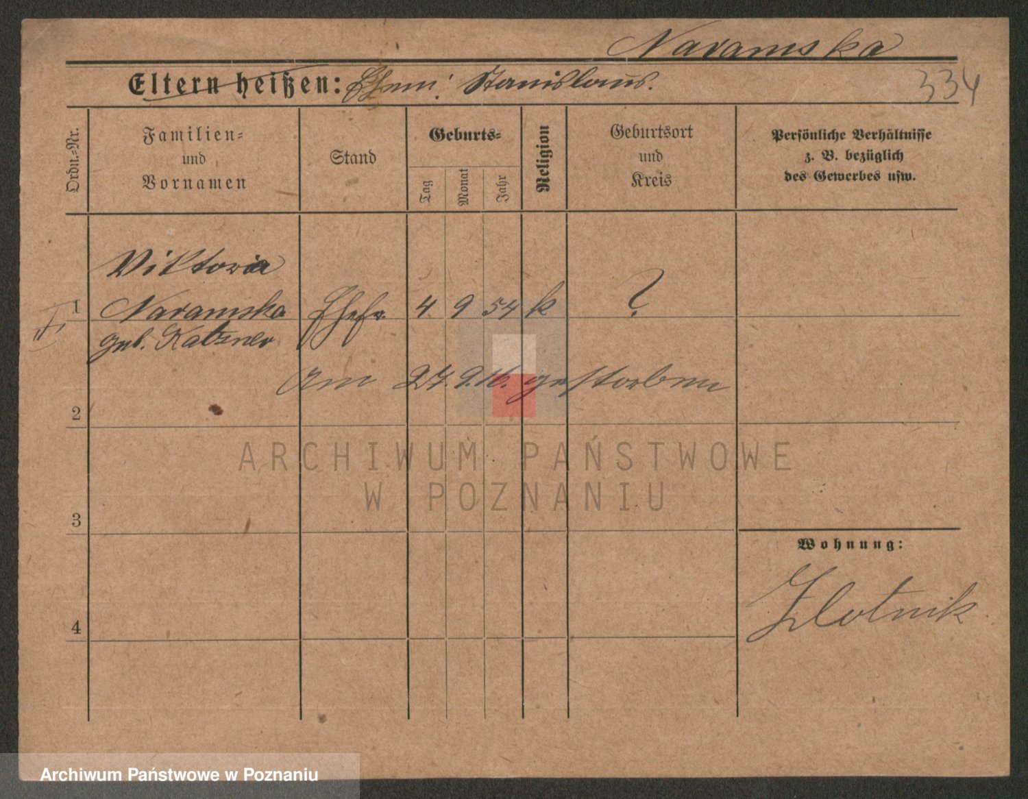 Podgląd karty osobowej dostępny jest po kliknięciu na nazwisko lub ikonkę karty. Można dokonywać powiększenia (ikony na górze) lub przechodzić między kolejnymi skanami (strzałki po bokach).