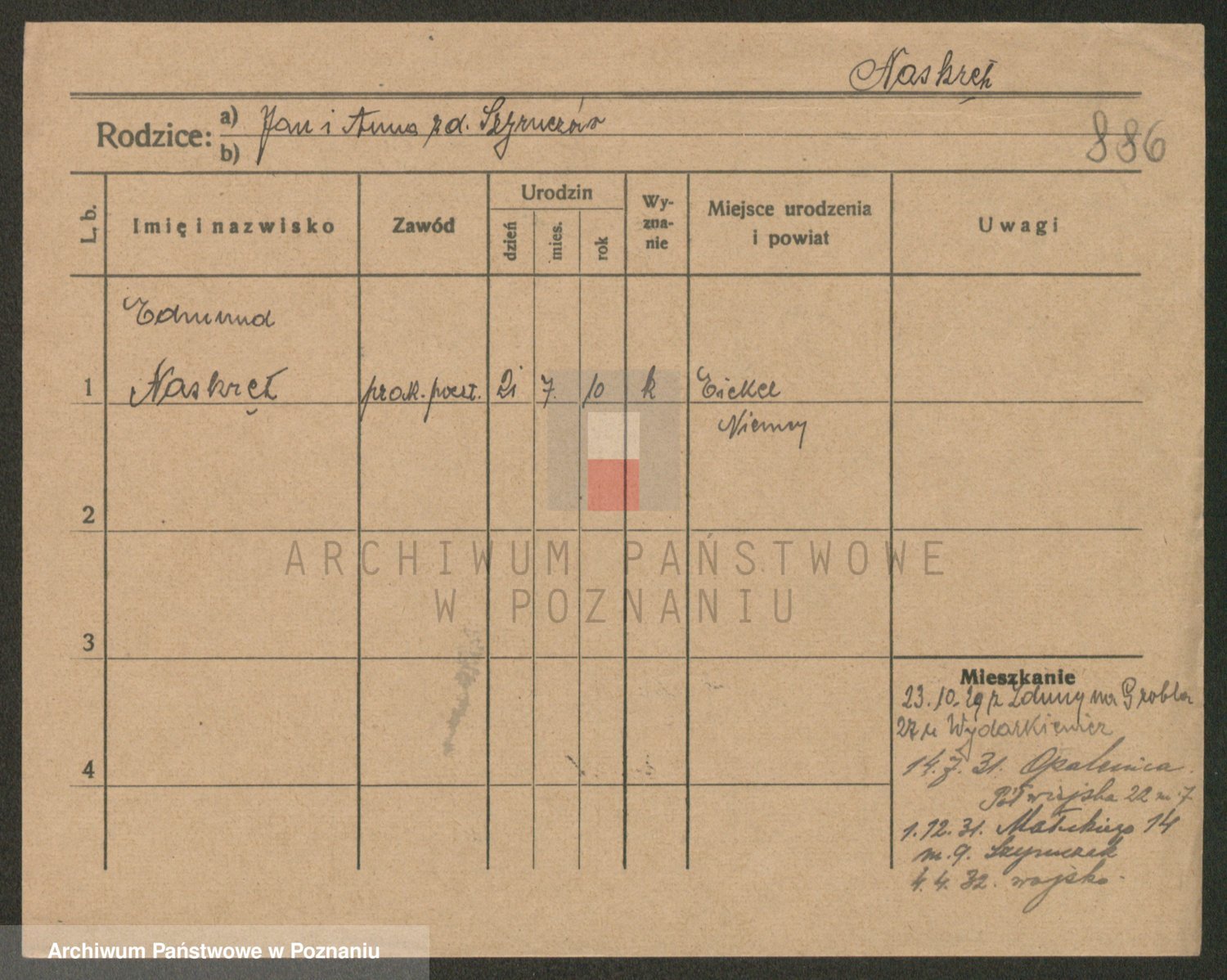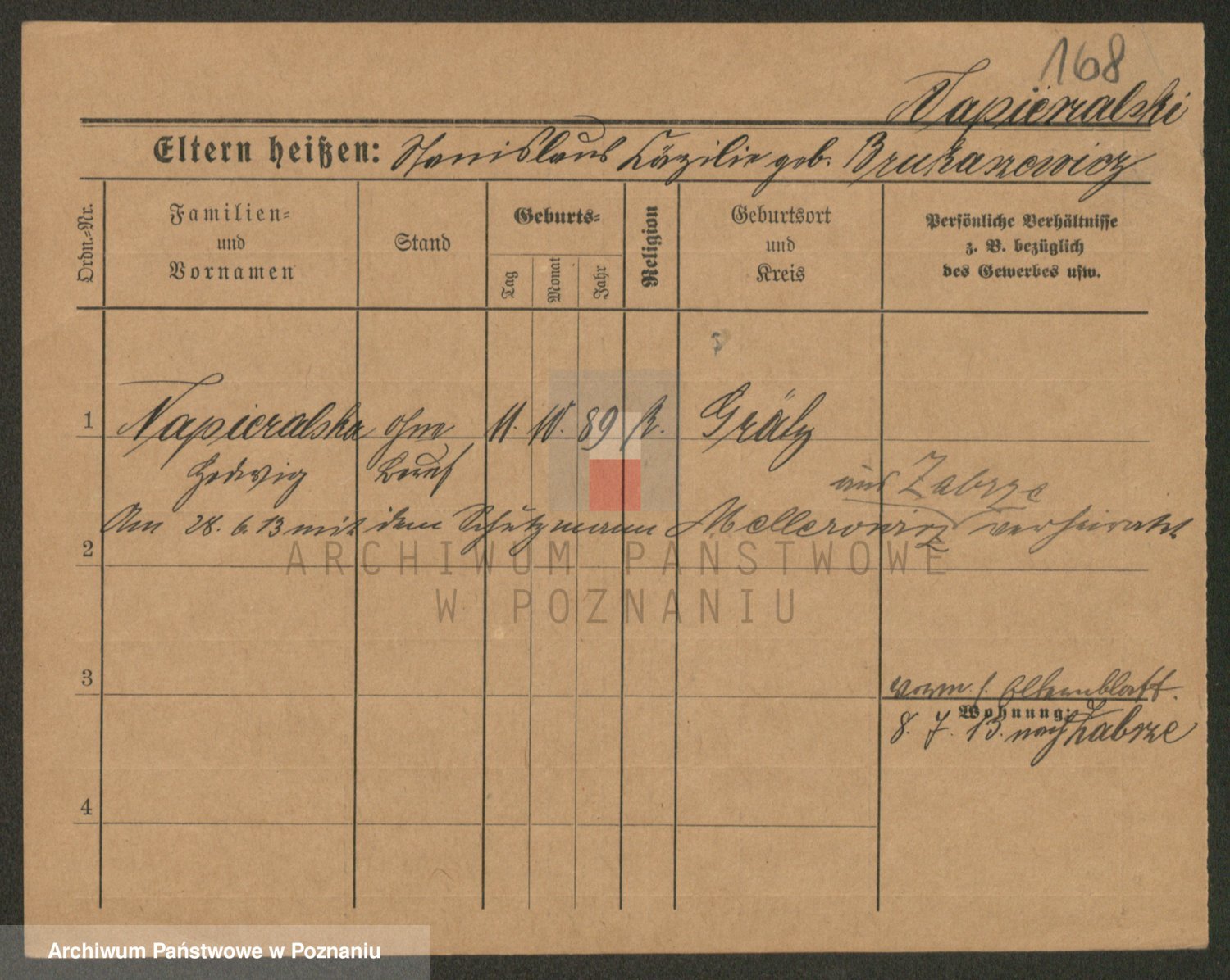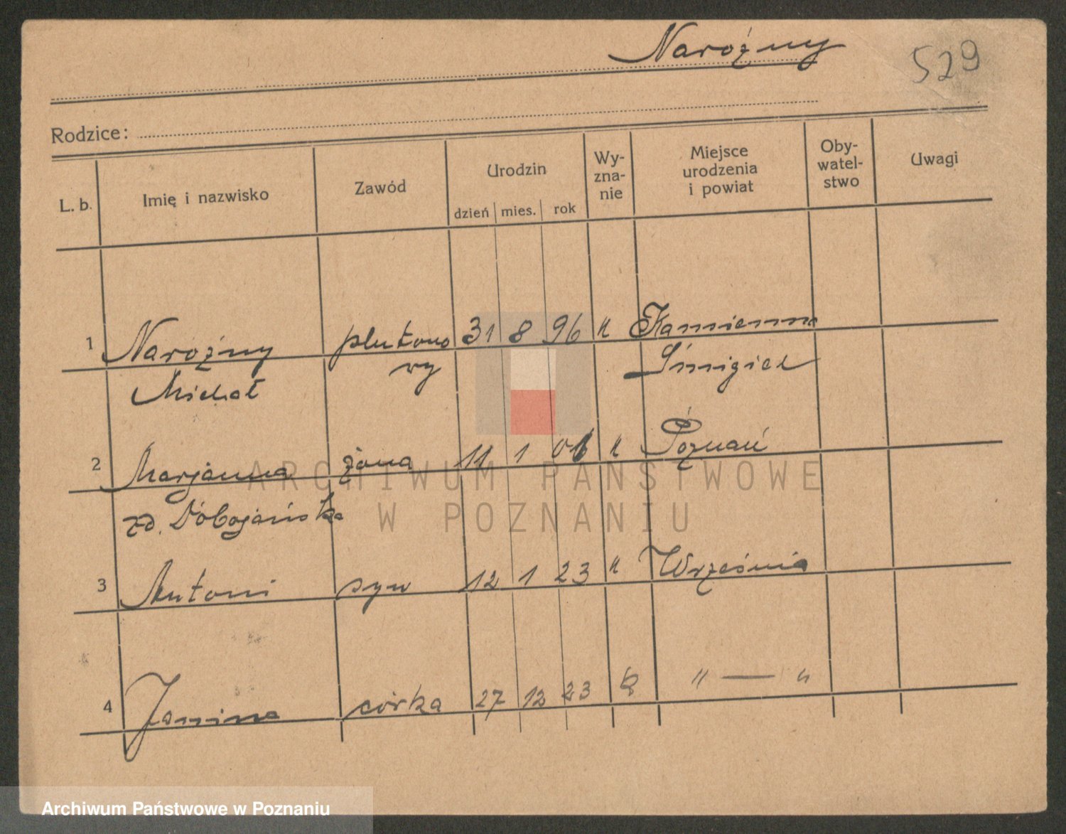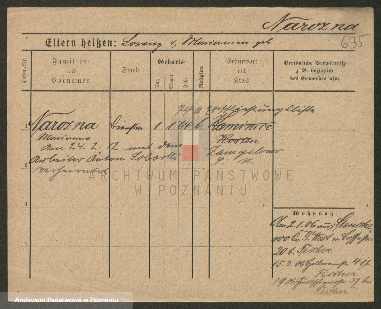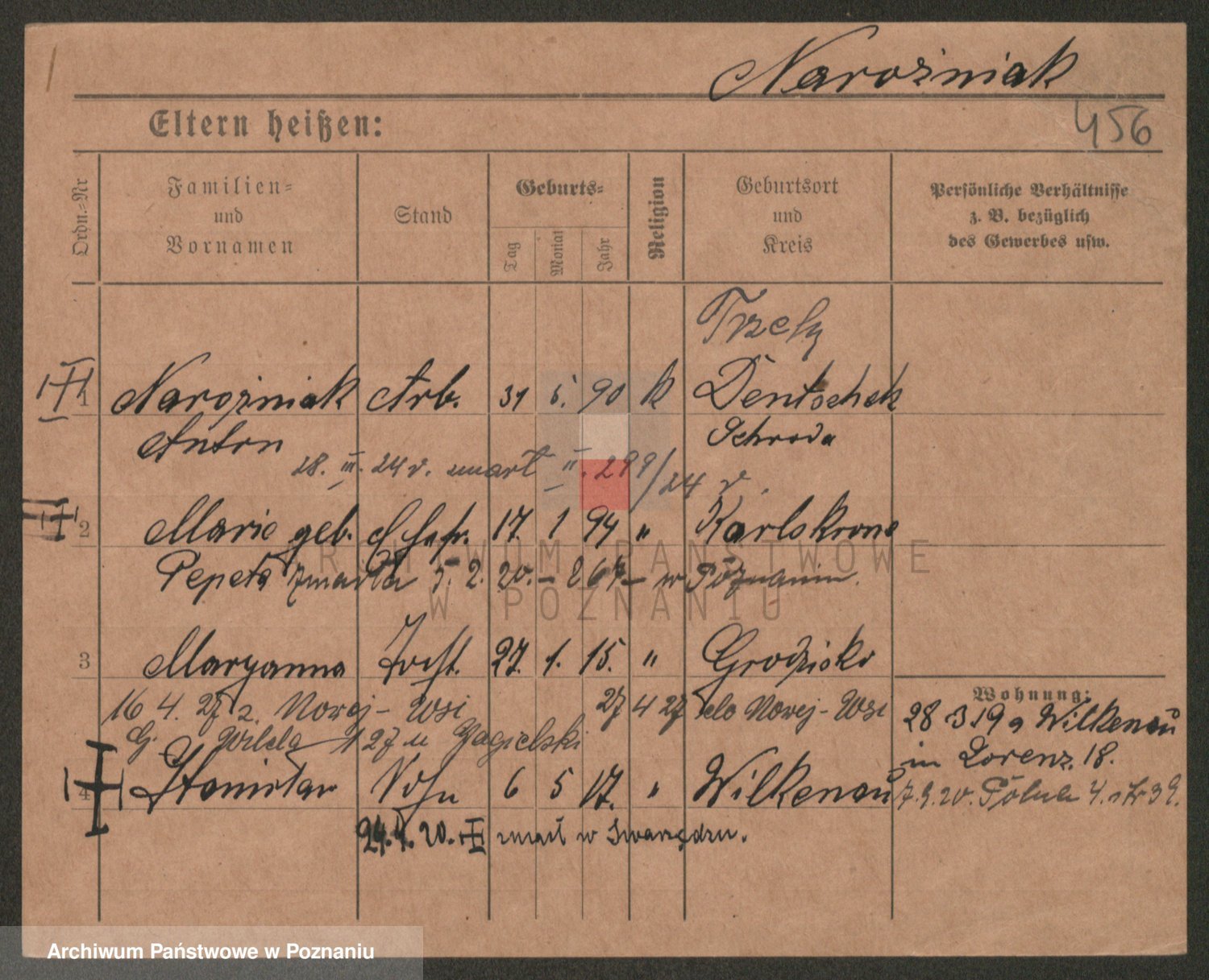 Podgląd karty osobowej dostępny jest po kliknięciu na nazwisko lub ikonkę karty. Można dokonywać powiększenia (ikony na górze) lub przechodzić między kolejnymi skanami (strzałki po bokach).