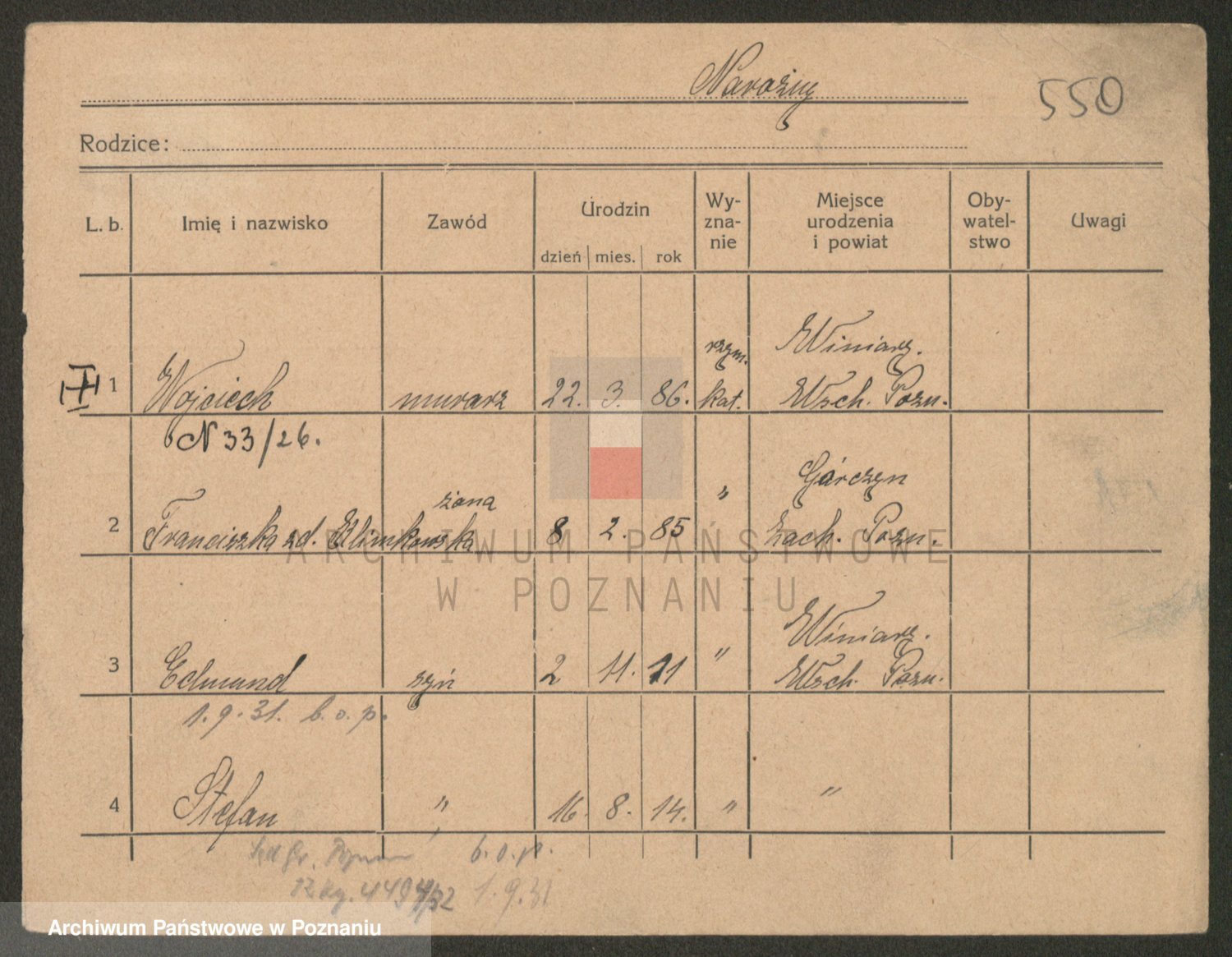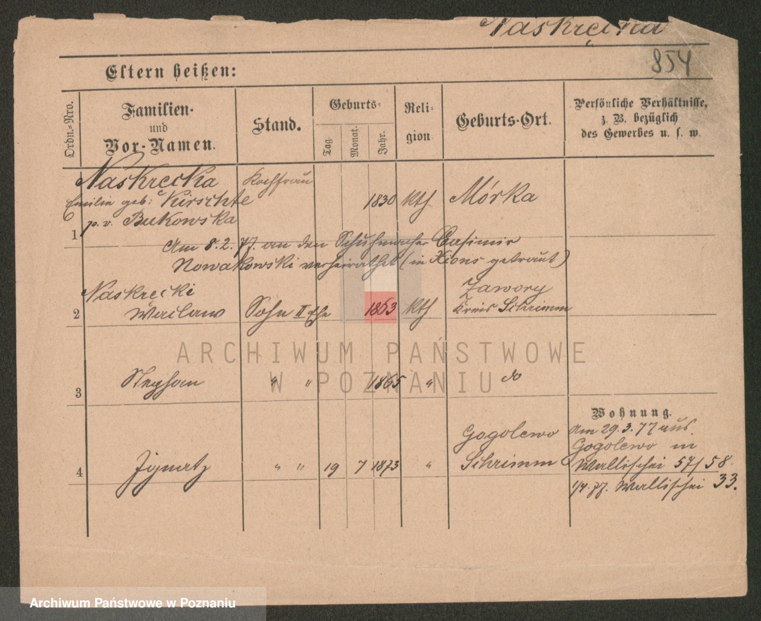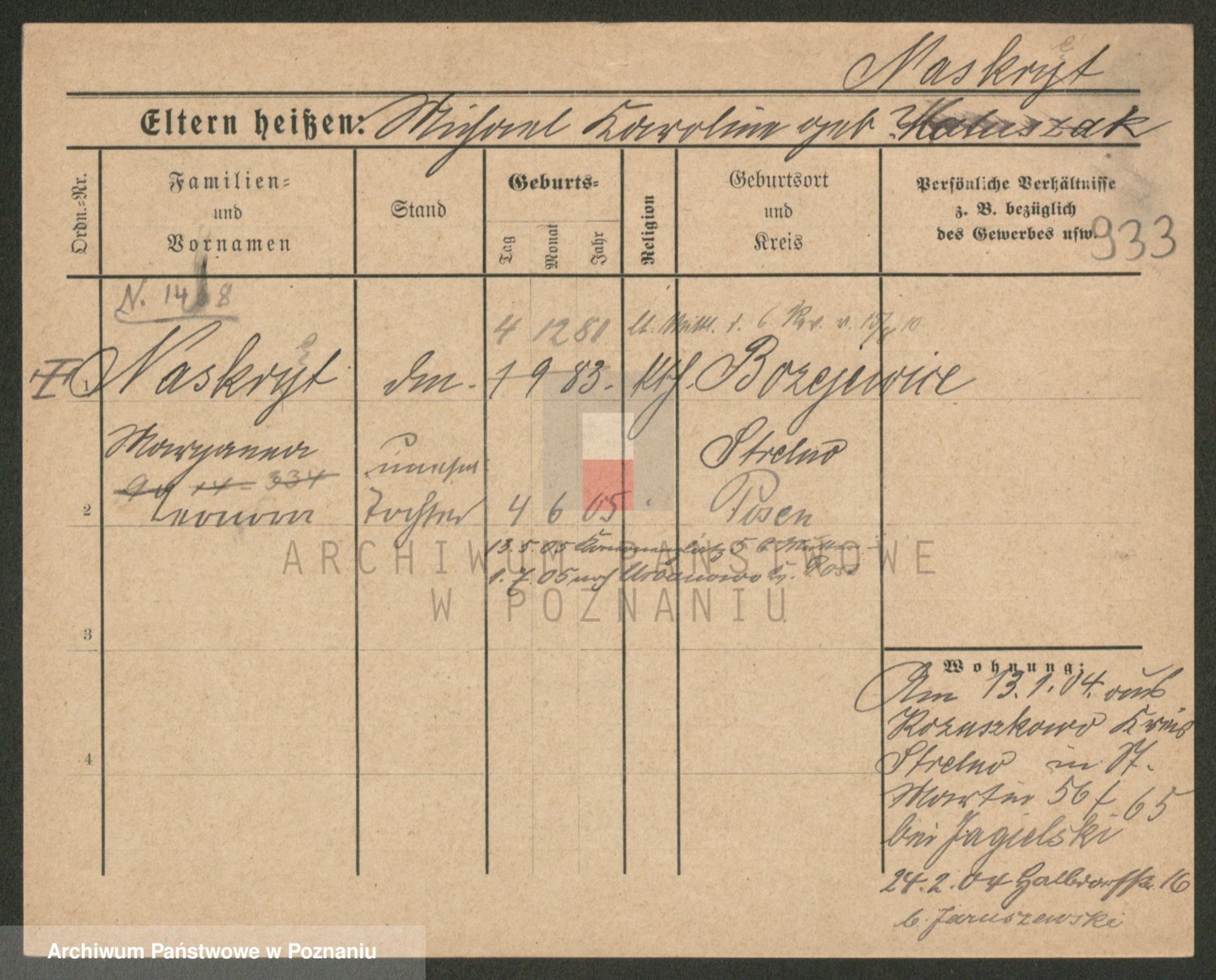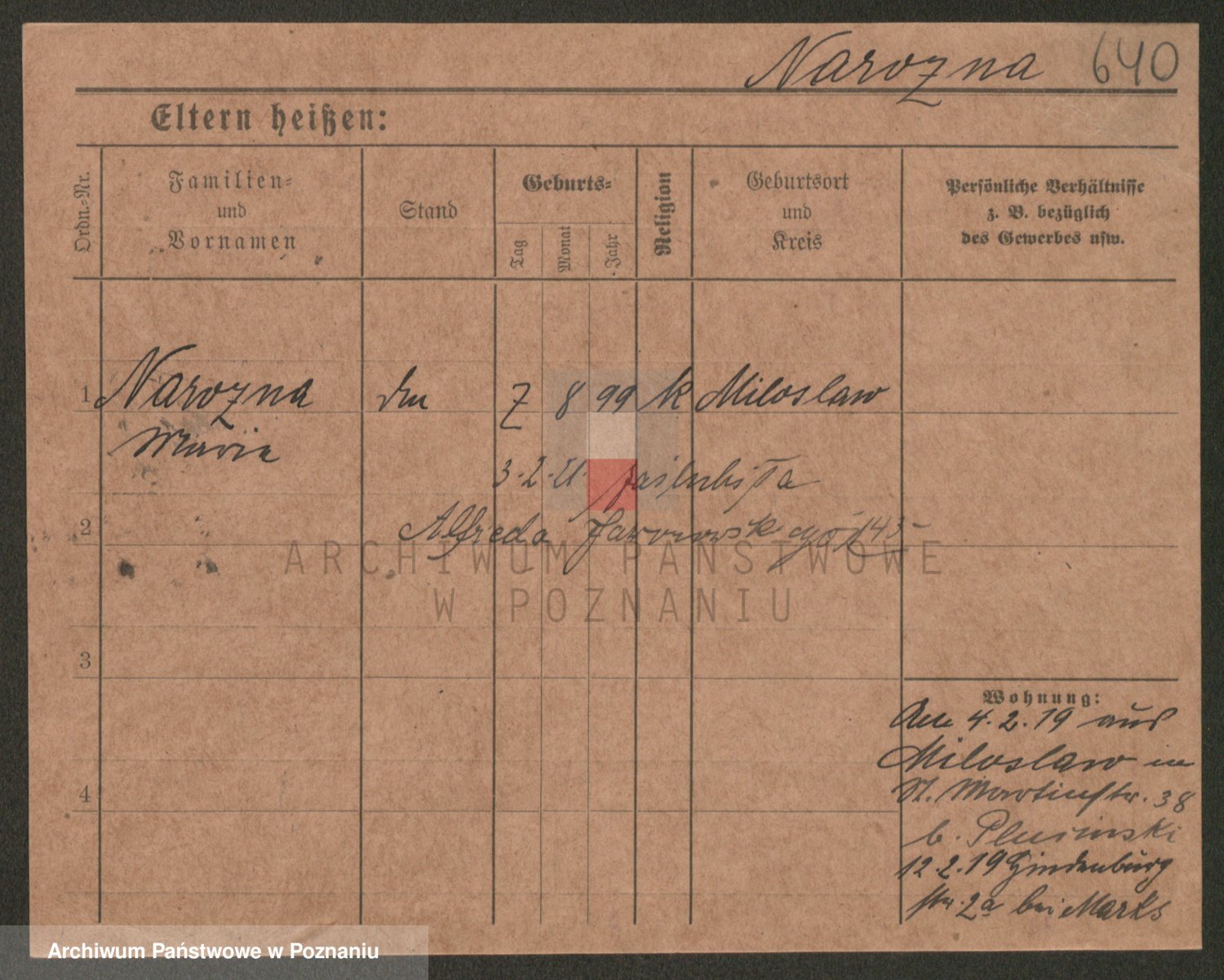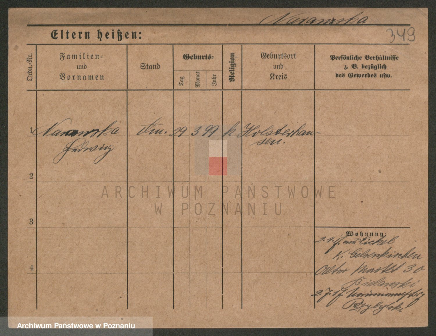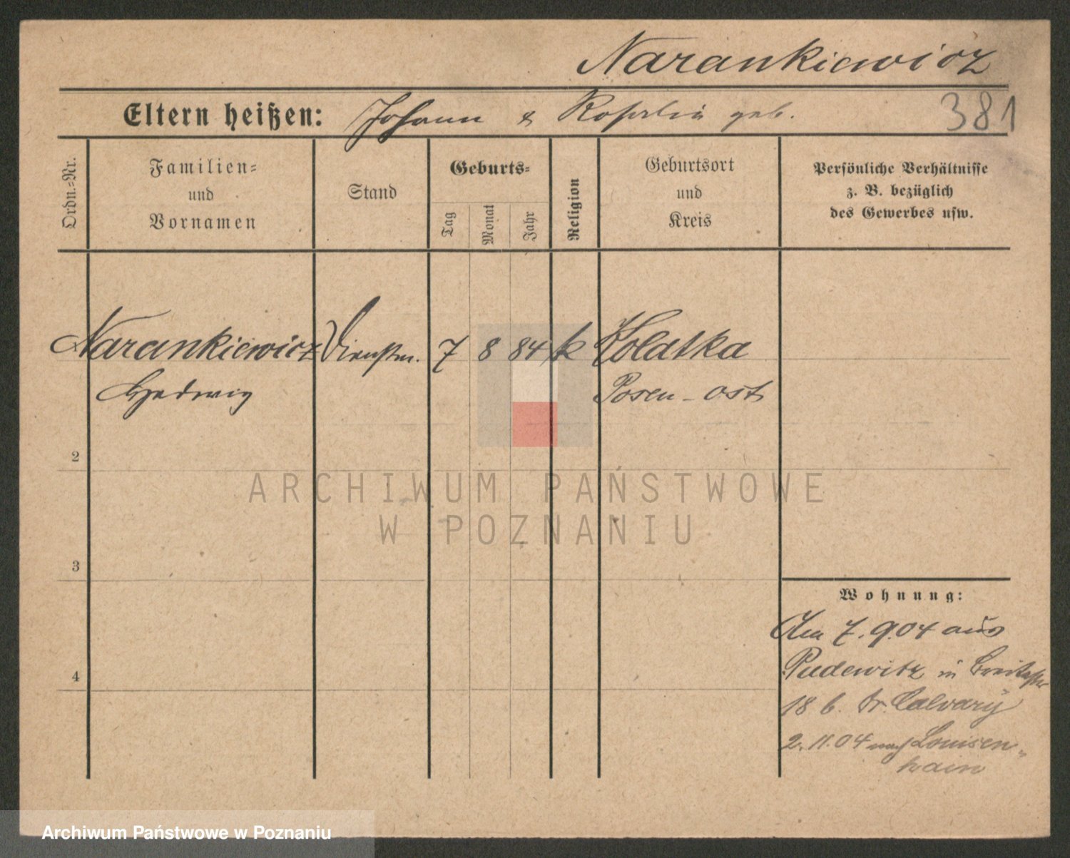 Podgląd karty osobowej dostępny jest po kliknięciu na nazwisko lub ikonkę karty. Można dokonywać powiększenia (ikony na górze) lub przechodzić między kolejnymi skanami (strzałki po bokach).