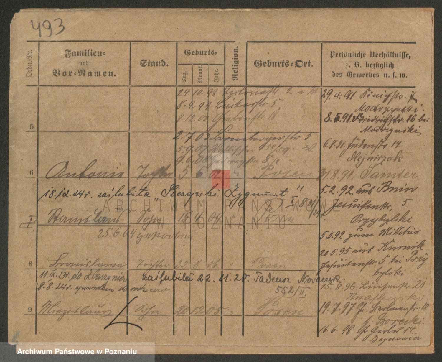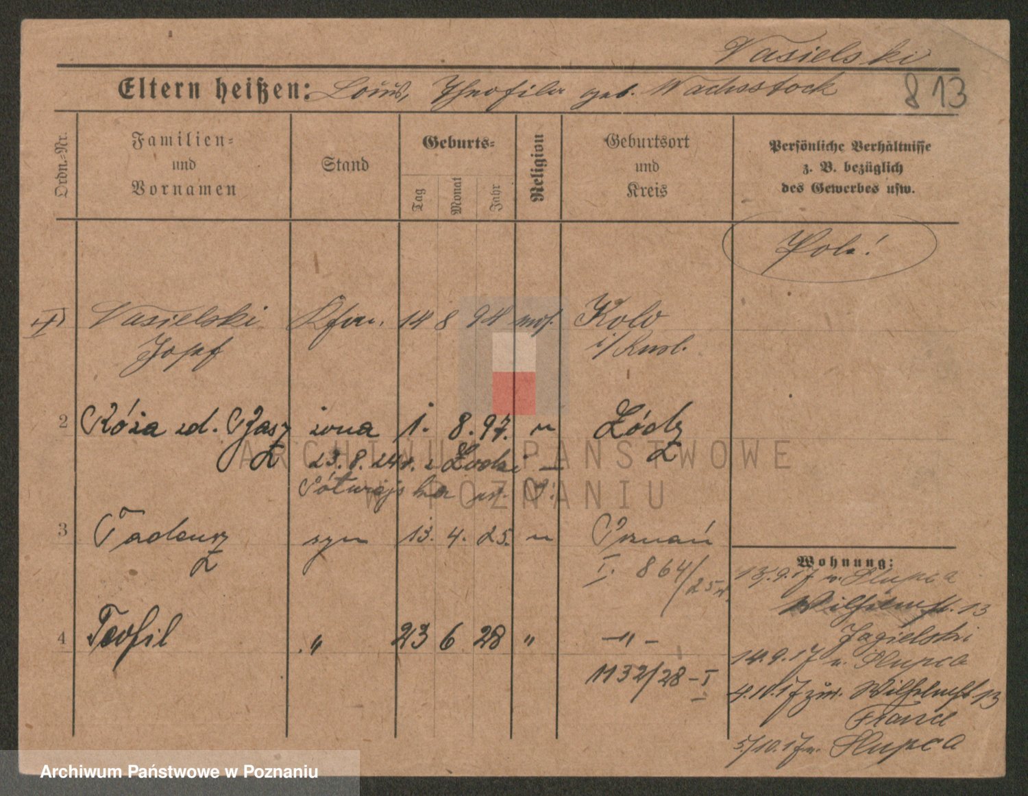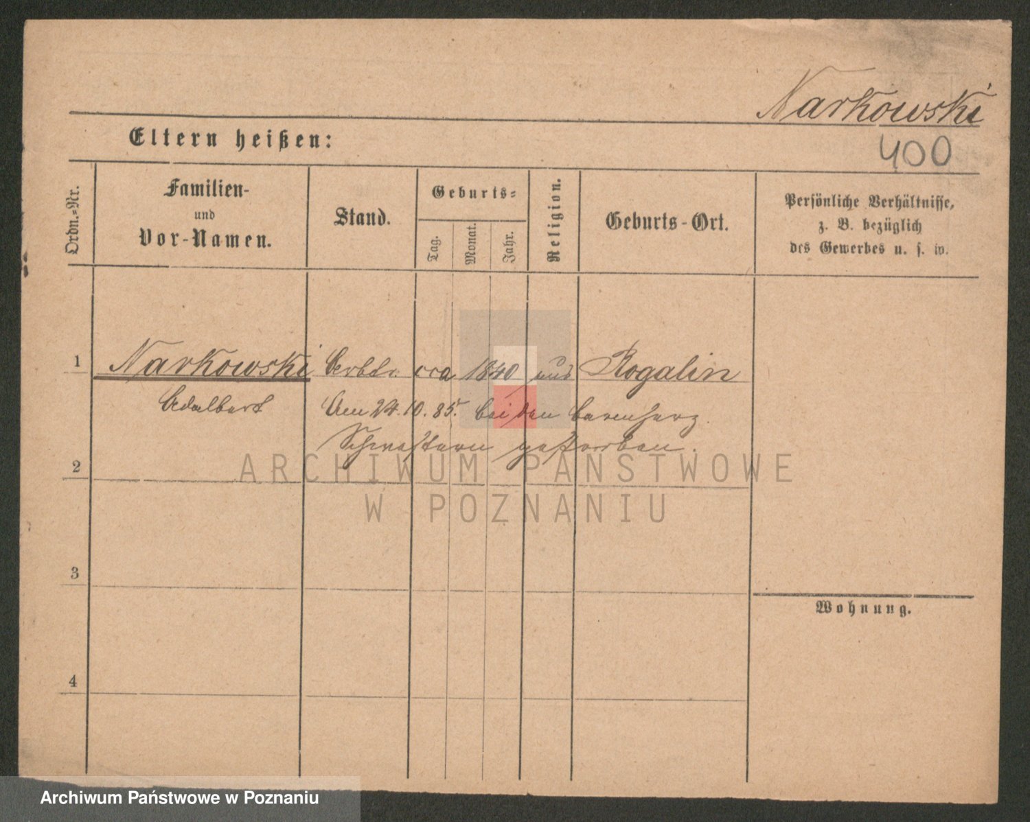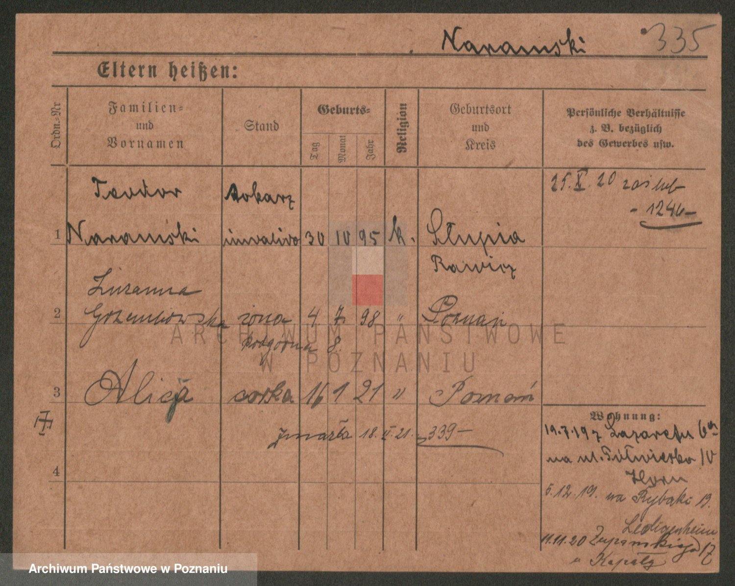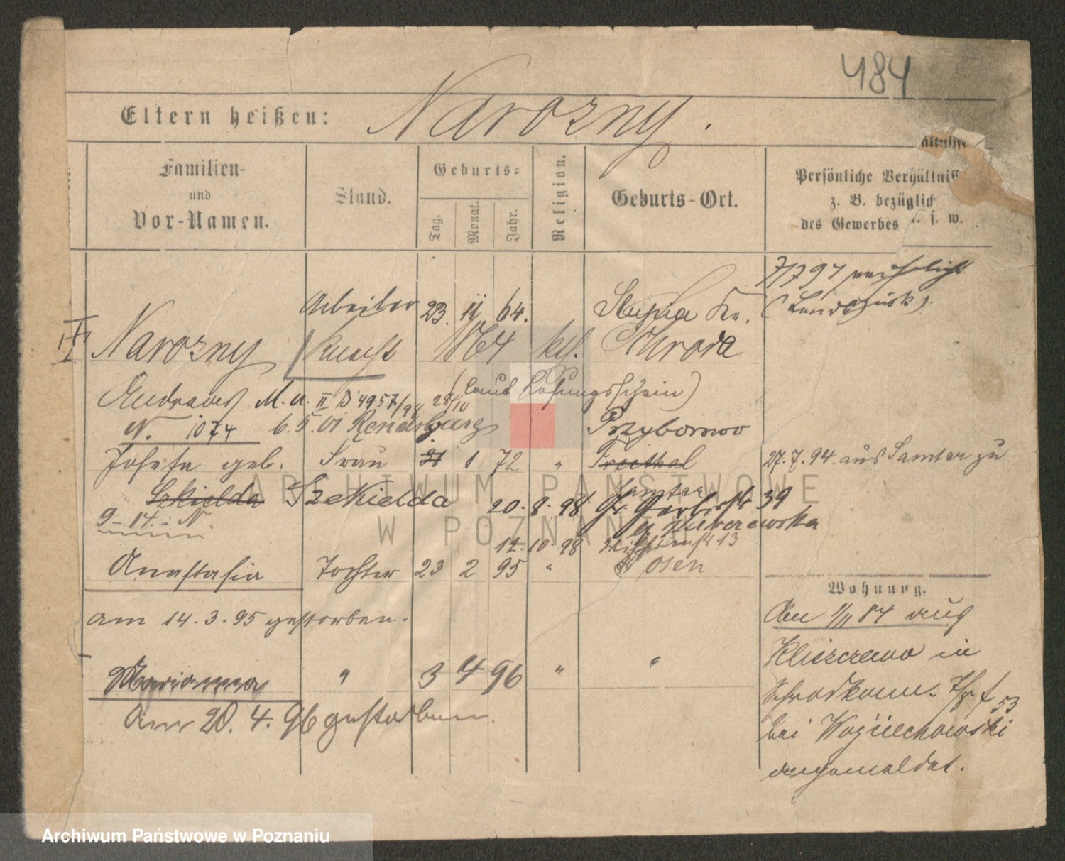 Podgląd karty osobowej dostępny jest po kliknięciu na nazwisko lub ikonkę karty. Można dokonywać powiększenia (ikony na górze) lub przechodzić między kolejnymi skanami (strzałki po bokach).