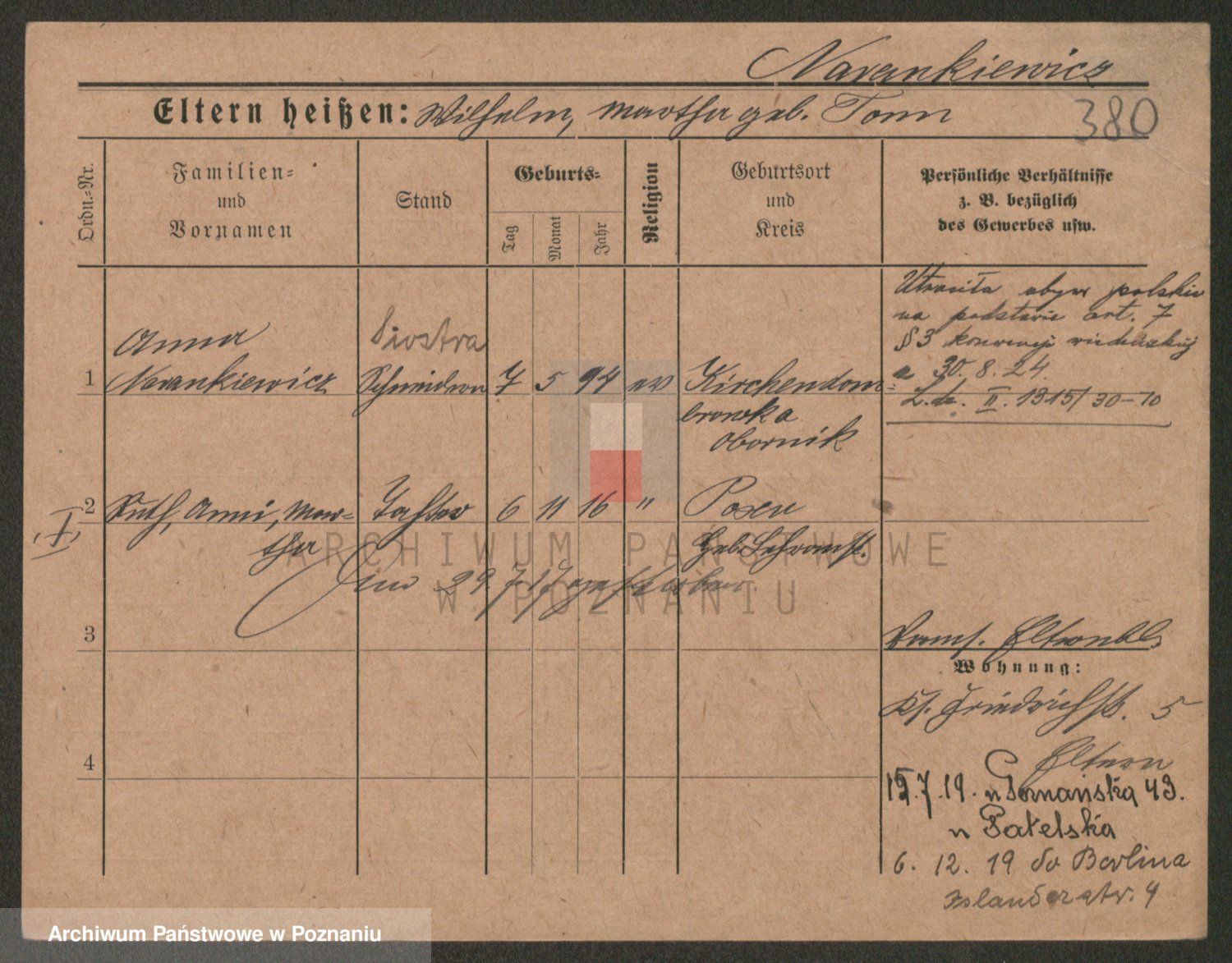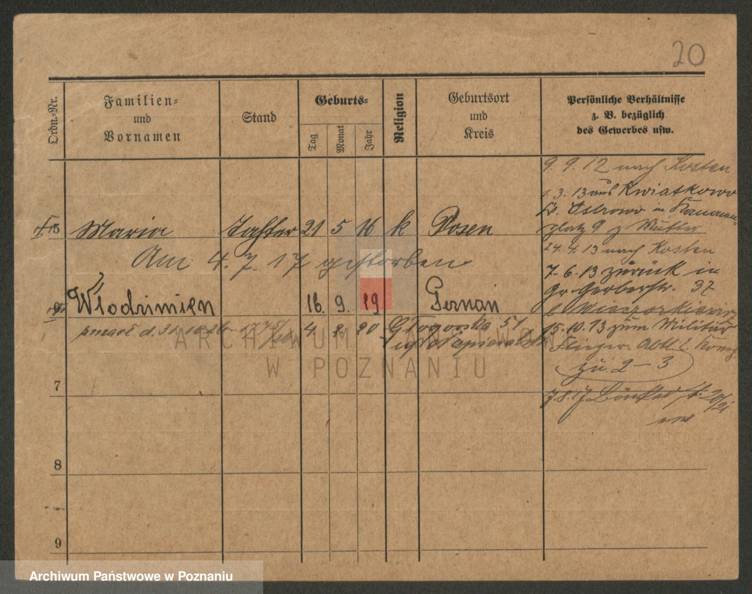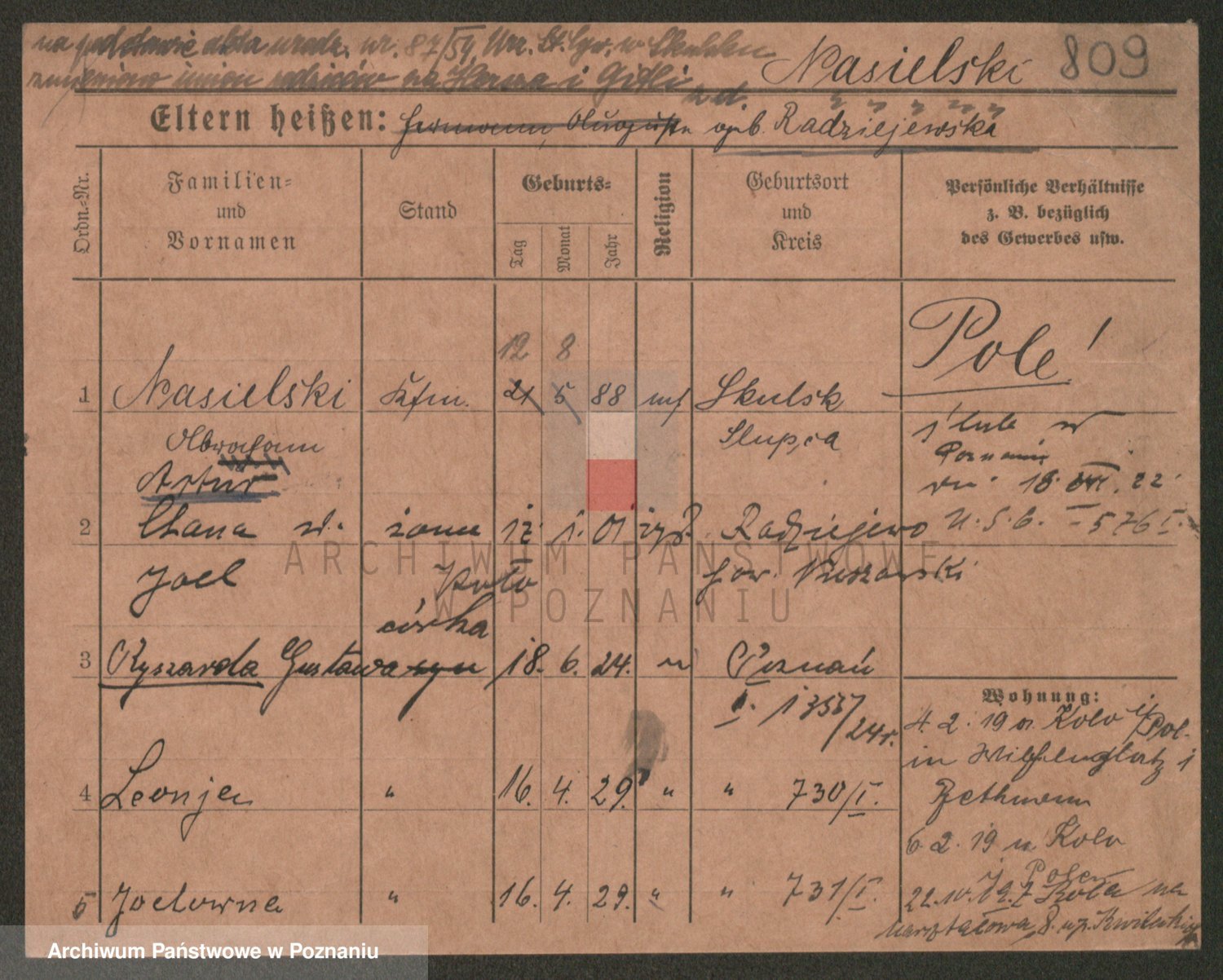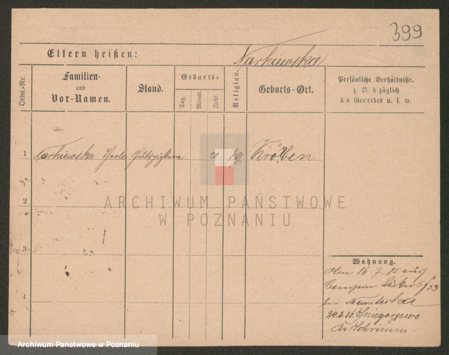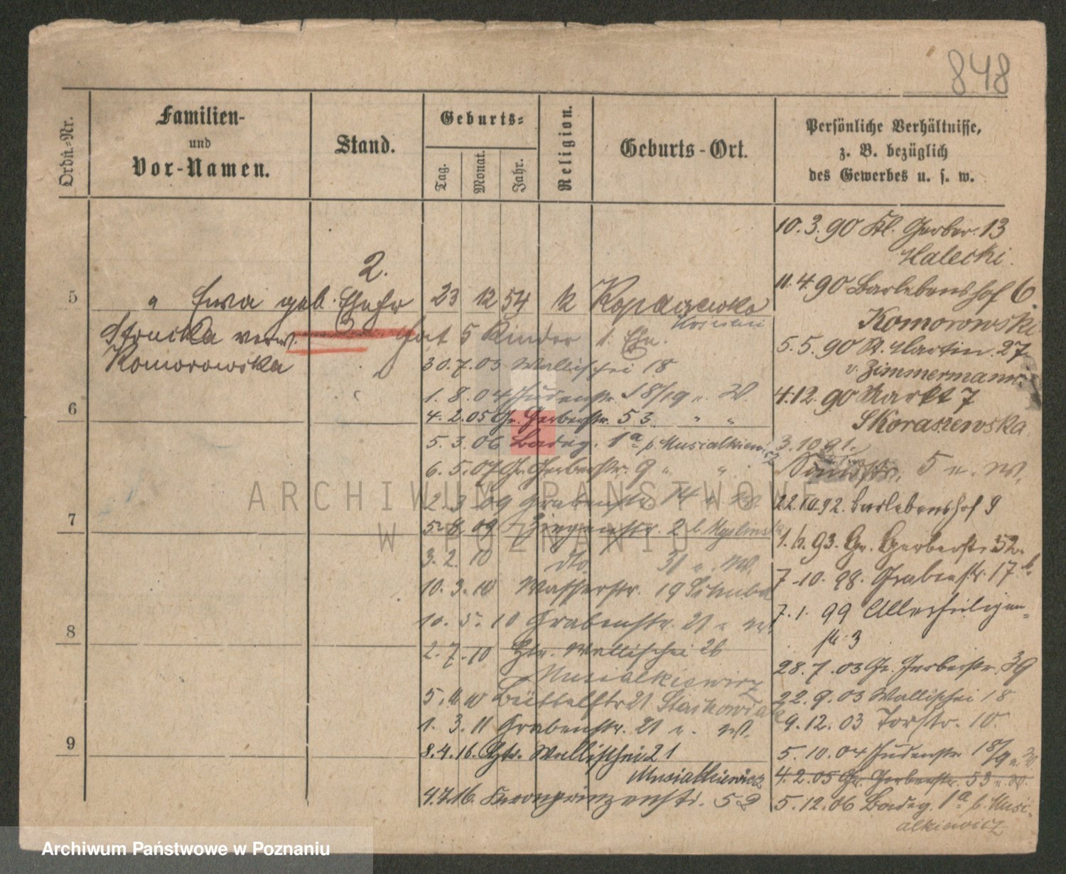 Podgląd karty osobowej dostępny jest po kliknięciu na nazwisko lub ikonkę karty. Można dokonywać powiększenia (ikony na górze) lub przechodzić między kolejnymi skanami (strzałki po bokach).