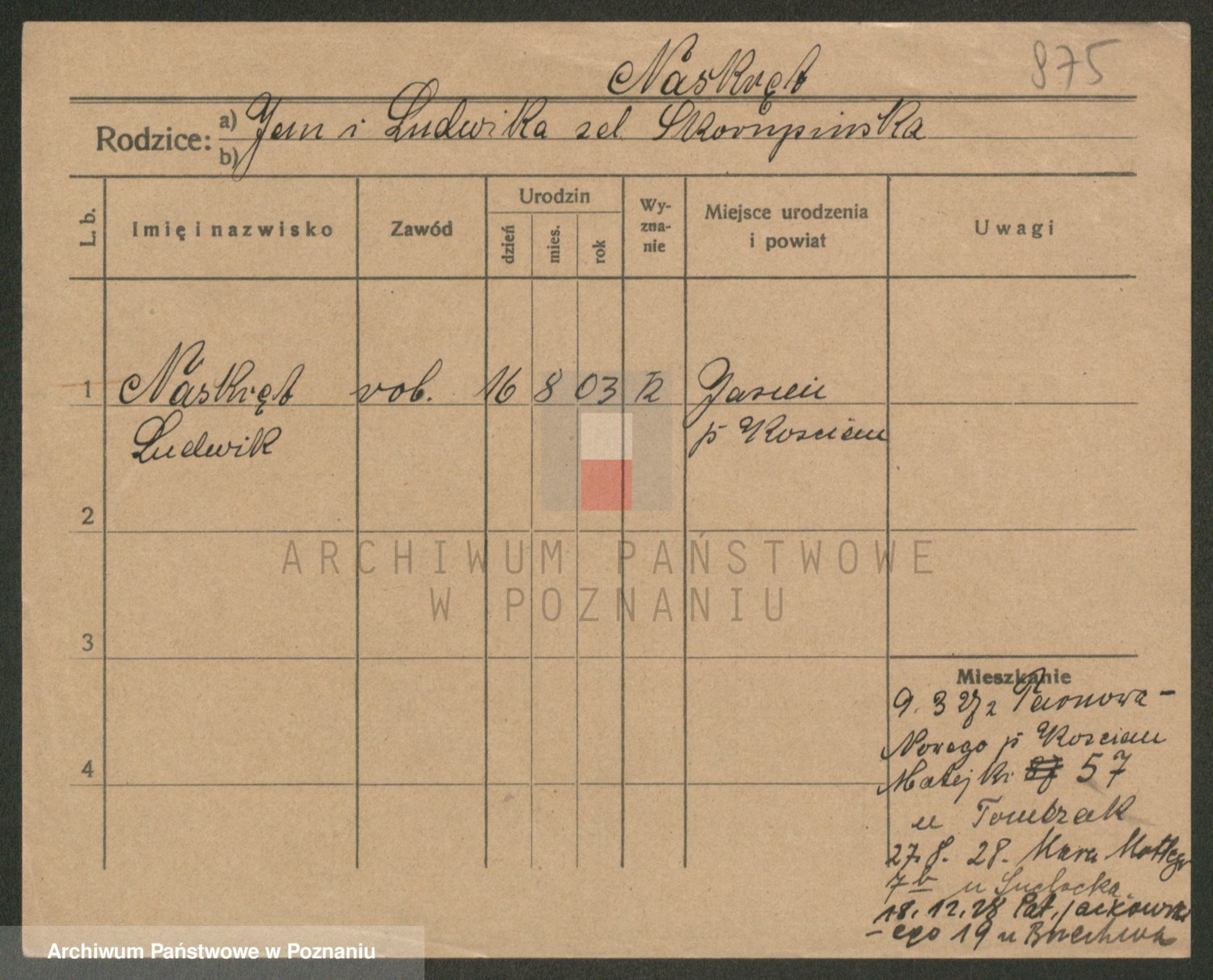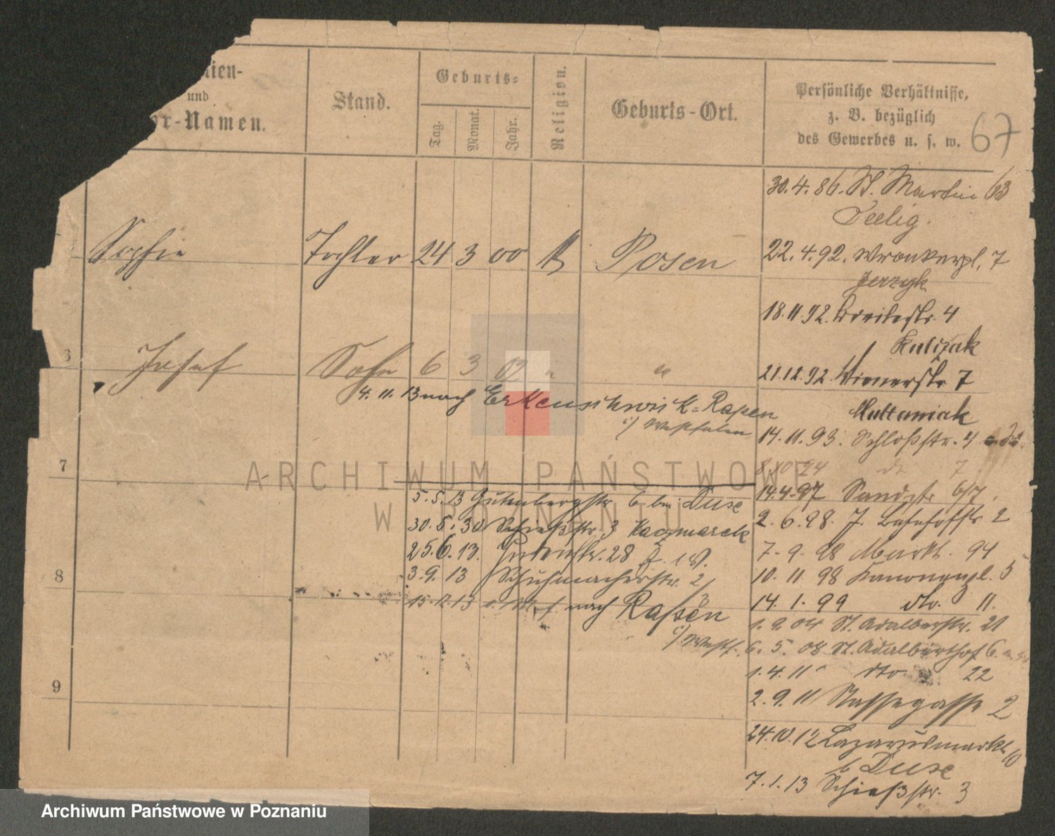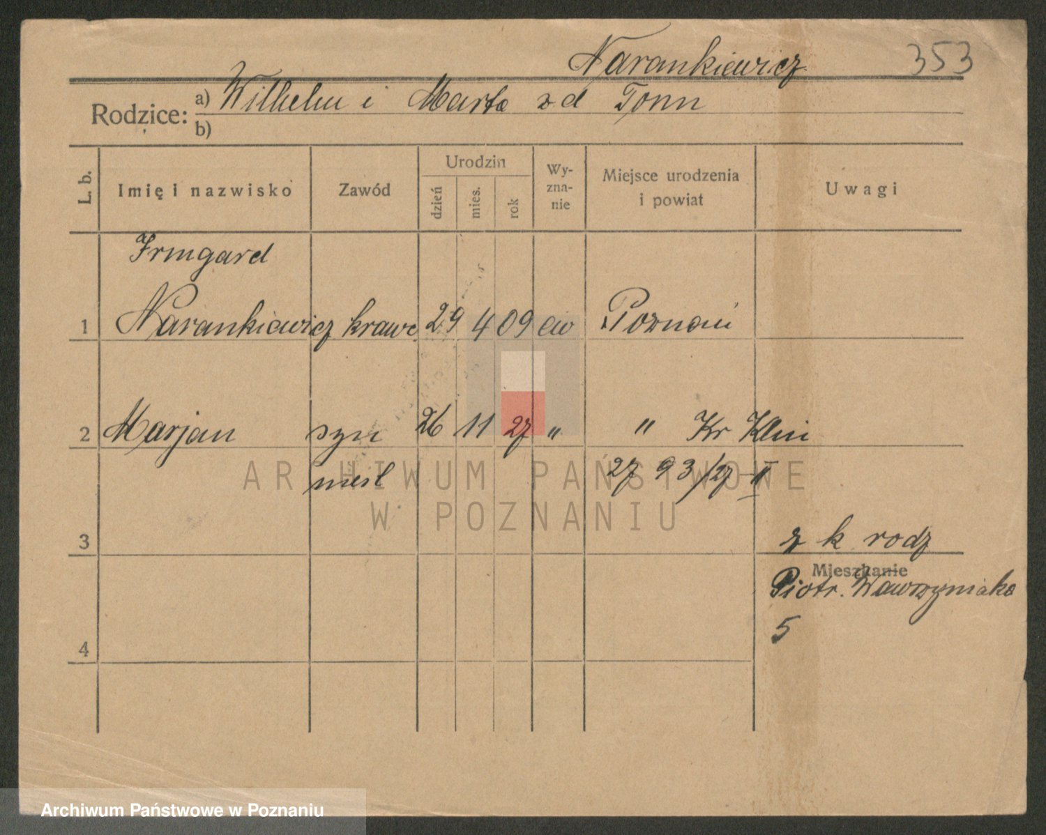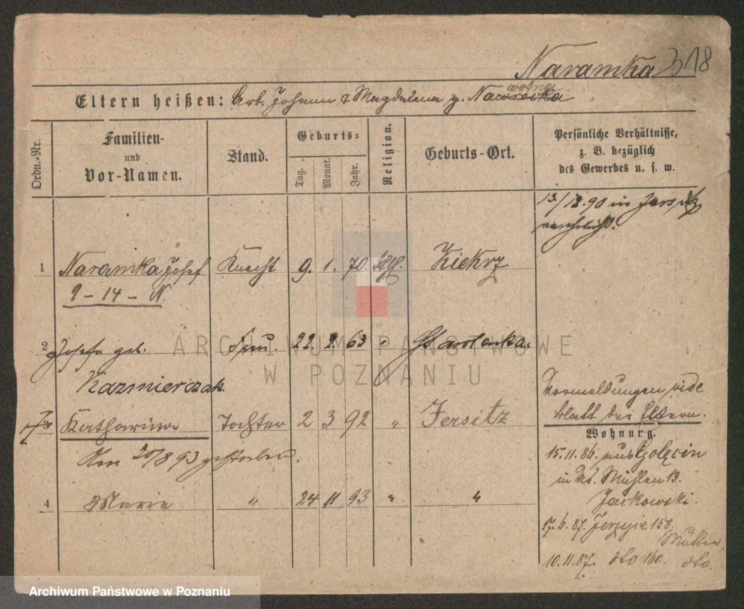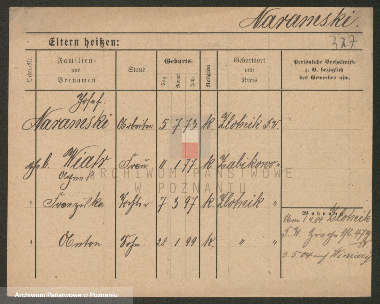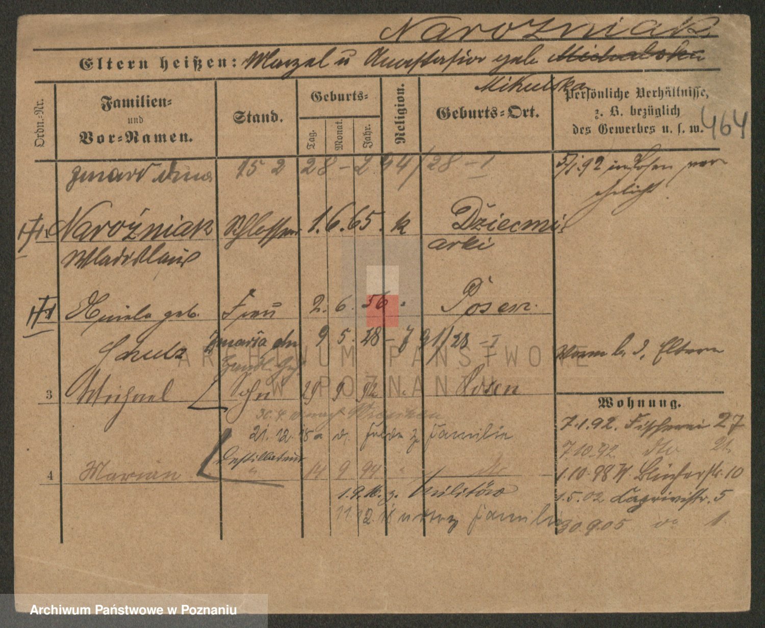 Podgląd karty osobowej dostępny jest po kliknięciu na nazwisko lub ikonkę karty. Można dokonywać powiększenia (ikony na górze) lub przechodzić między kolejnymi skanami (strzałki po bokach).