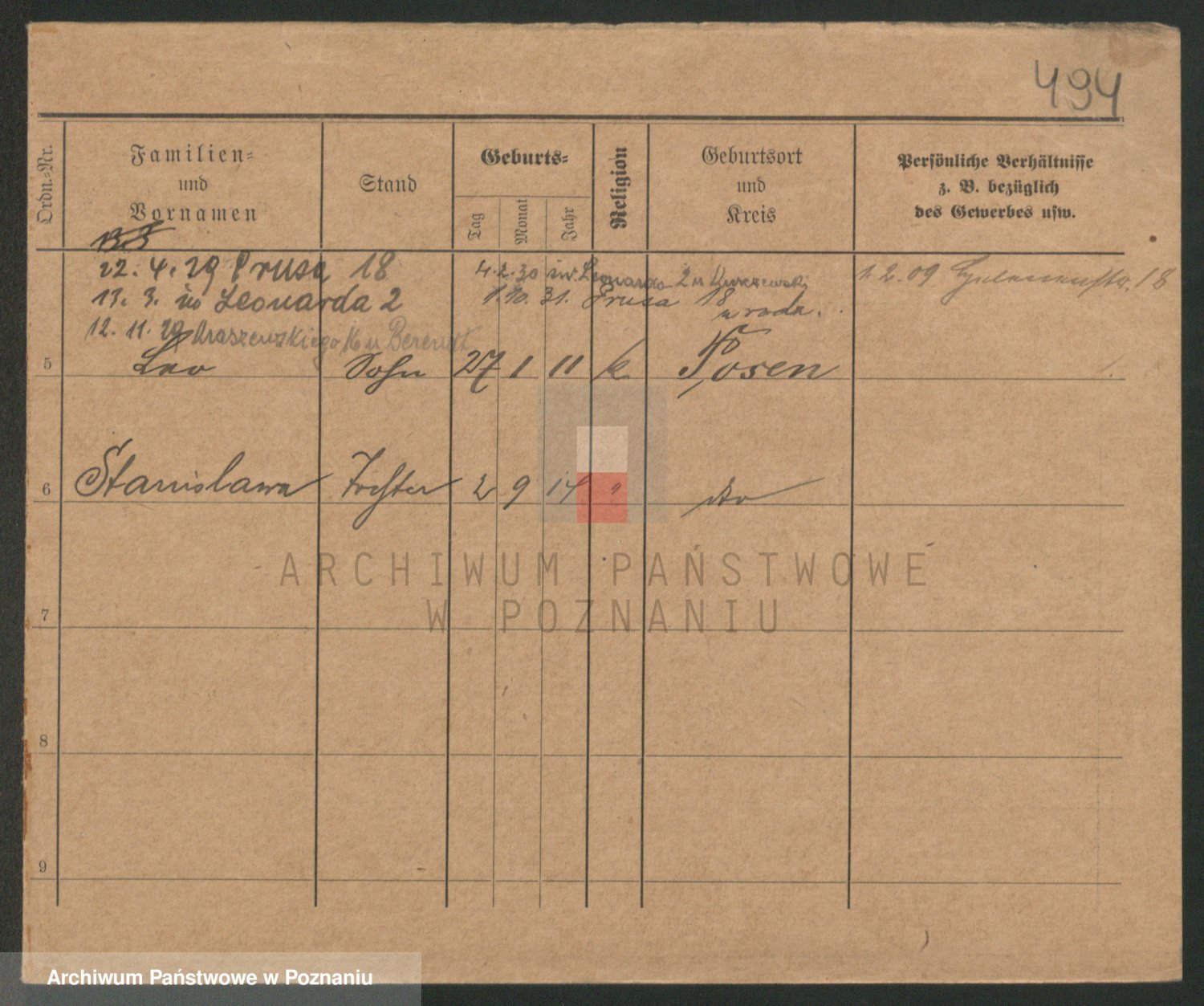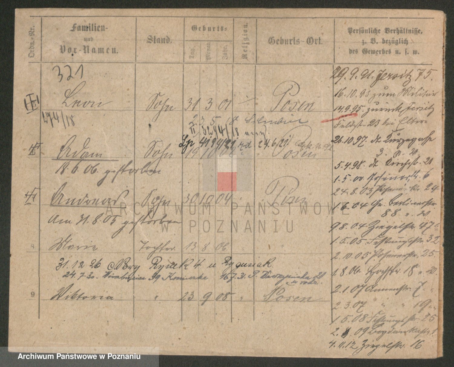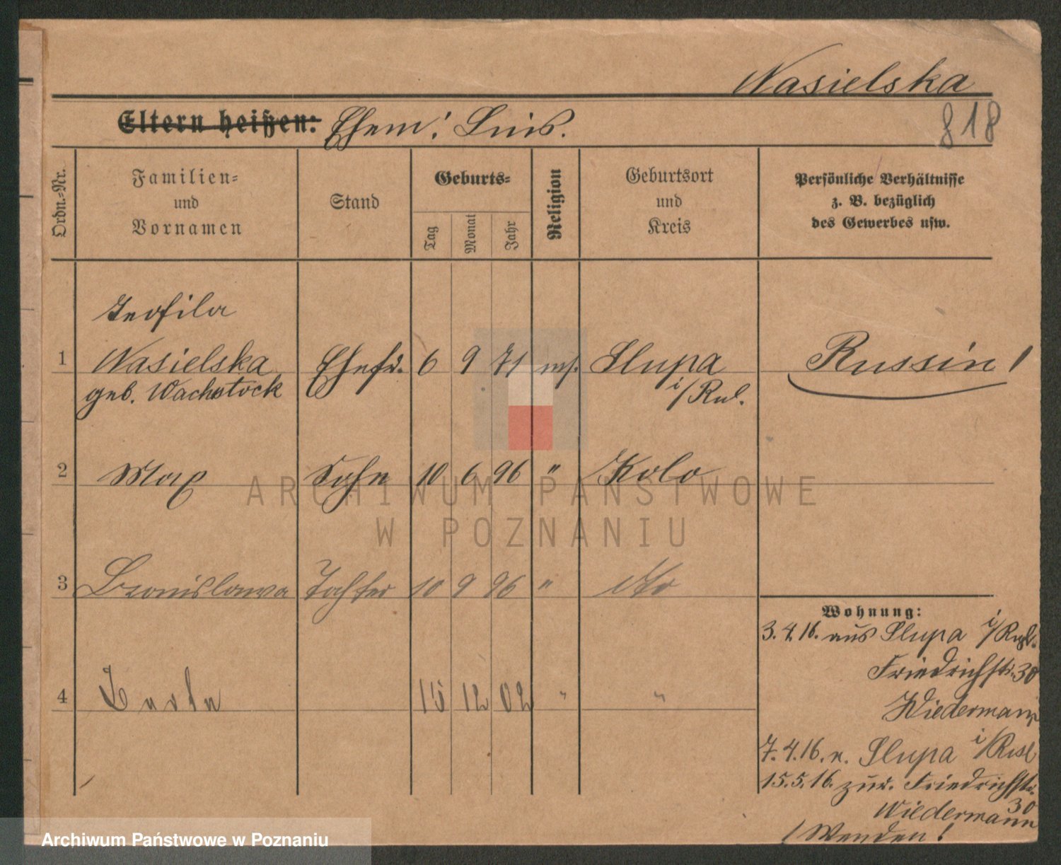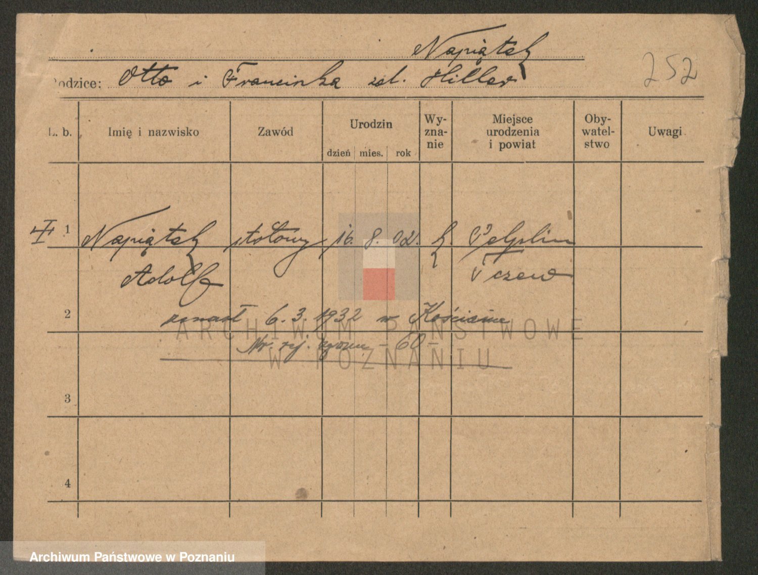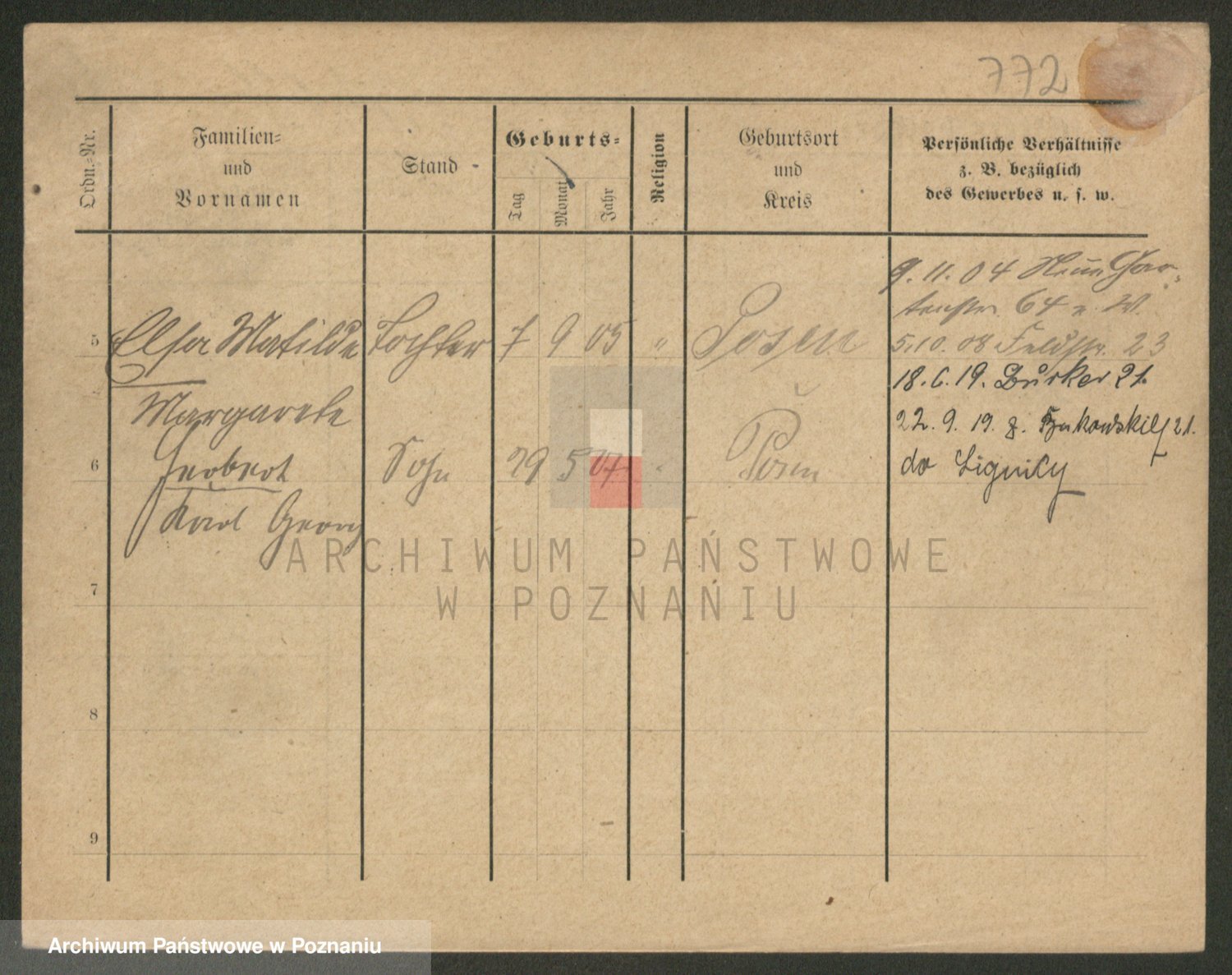 Podgląd karty osobowej dostępny jest po kliknięciu na nazwisko lub ikonkę karty. Można dokonywać powiększenia (ikony na górze) lub przechodzić między kolejnymi skanami (strzałki po bokach).