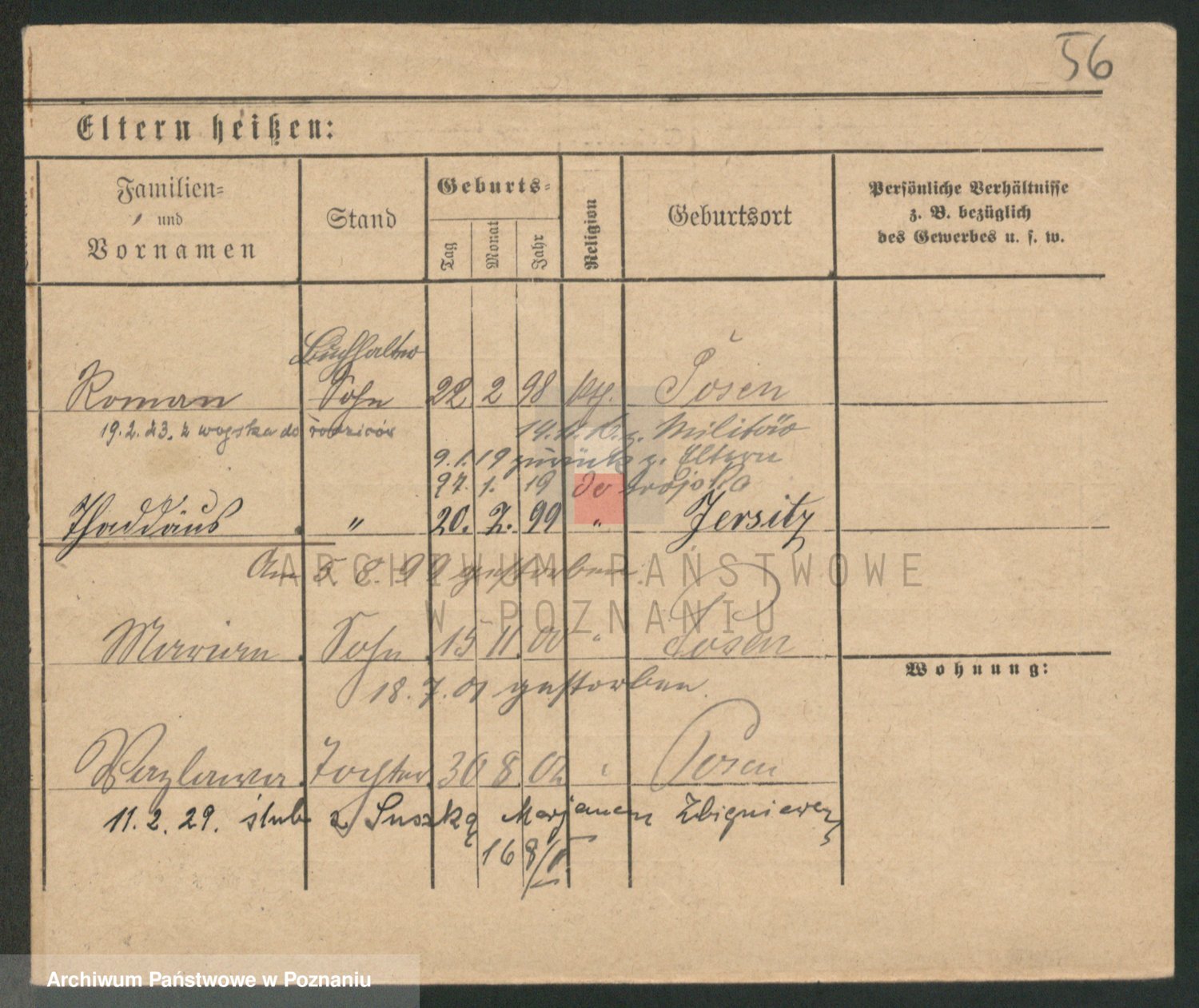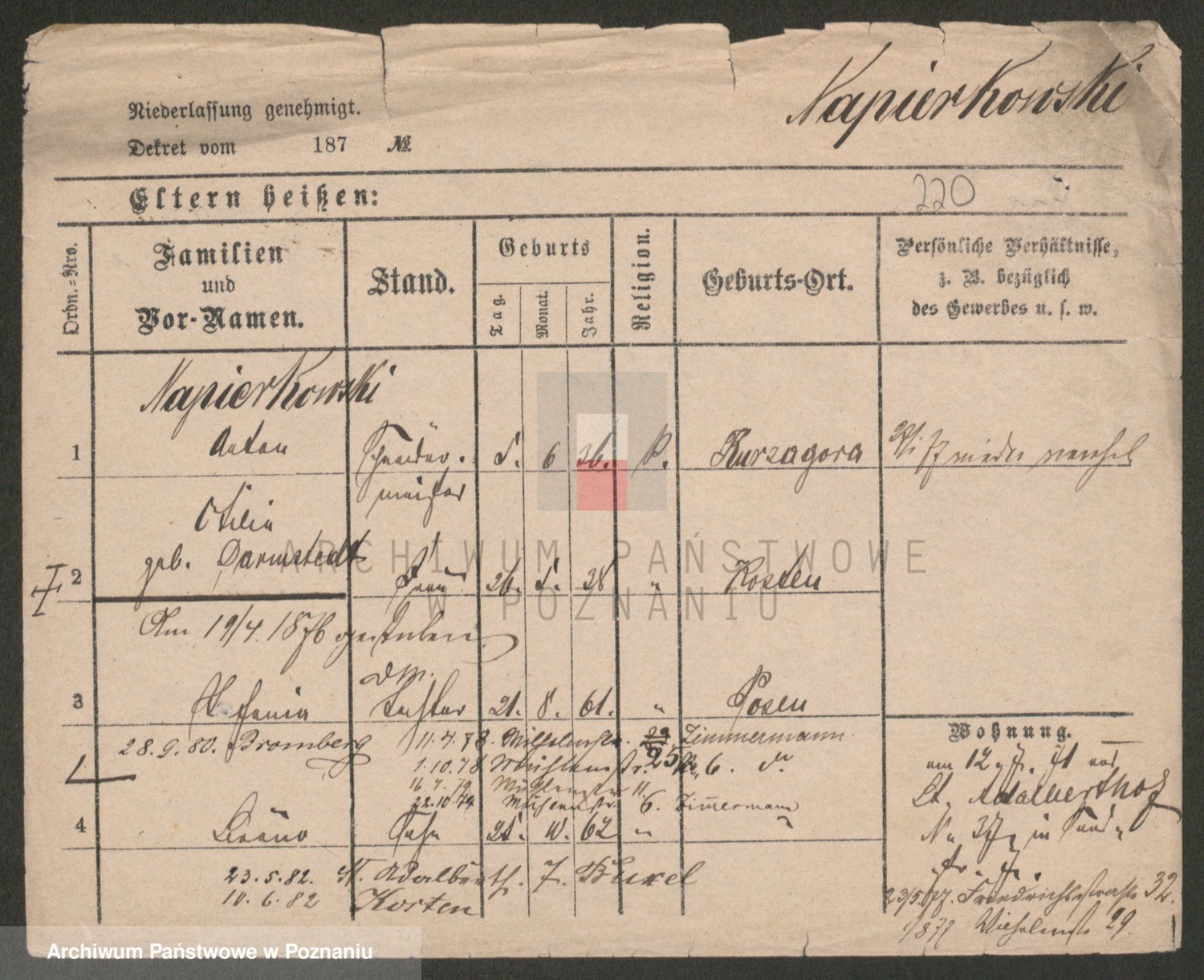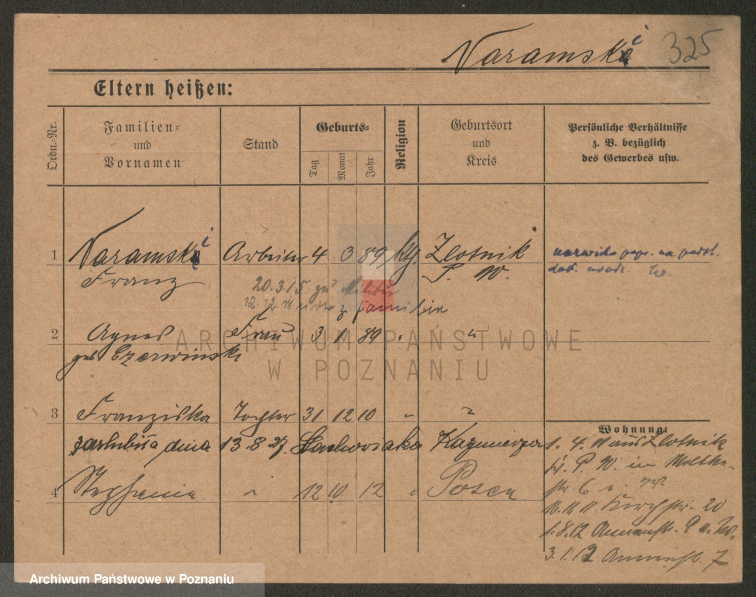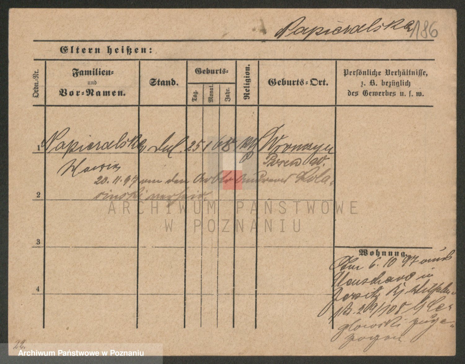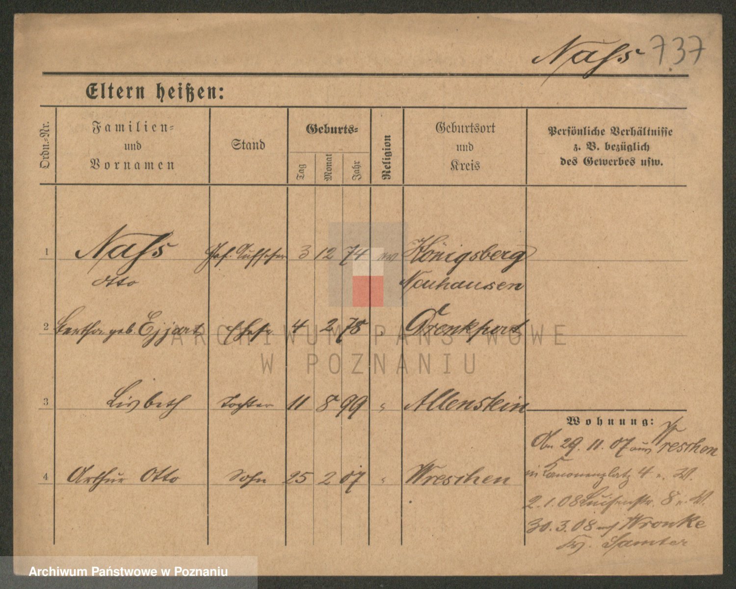Podgląd karty osobowej dostępny jest po kliknięciu na nazwisko lub ikonkę karty. Można dokonywać powiększenia (ikony na górze) lub przechodzić między kolejnymi skanami (strzałki po bokach).