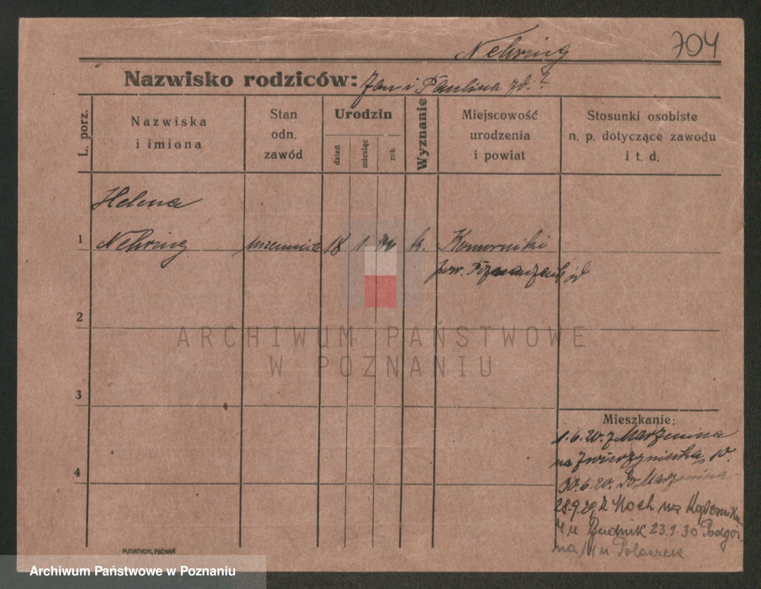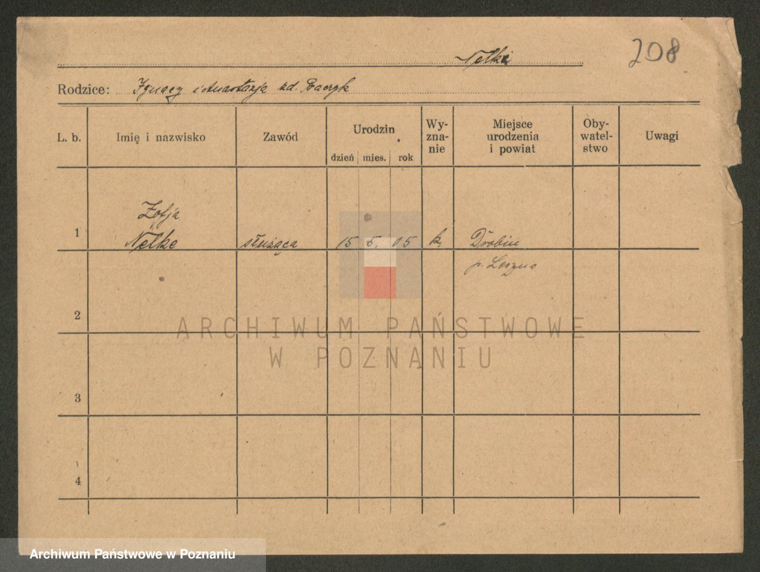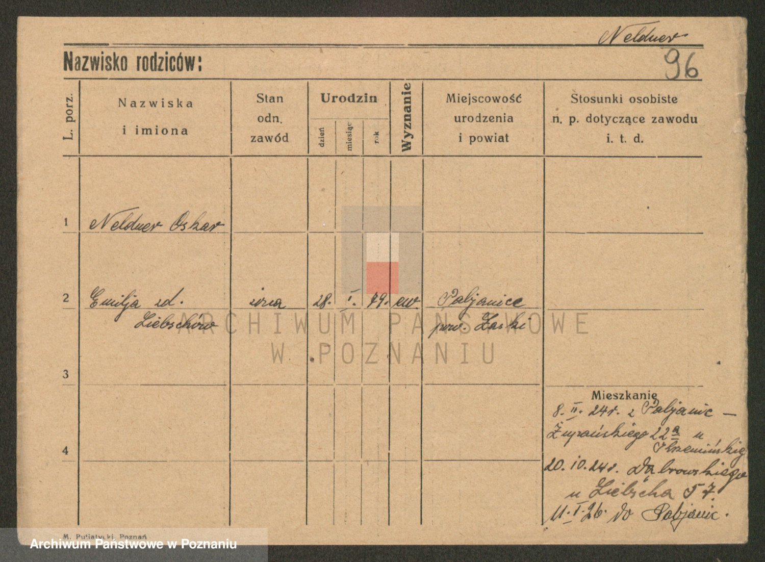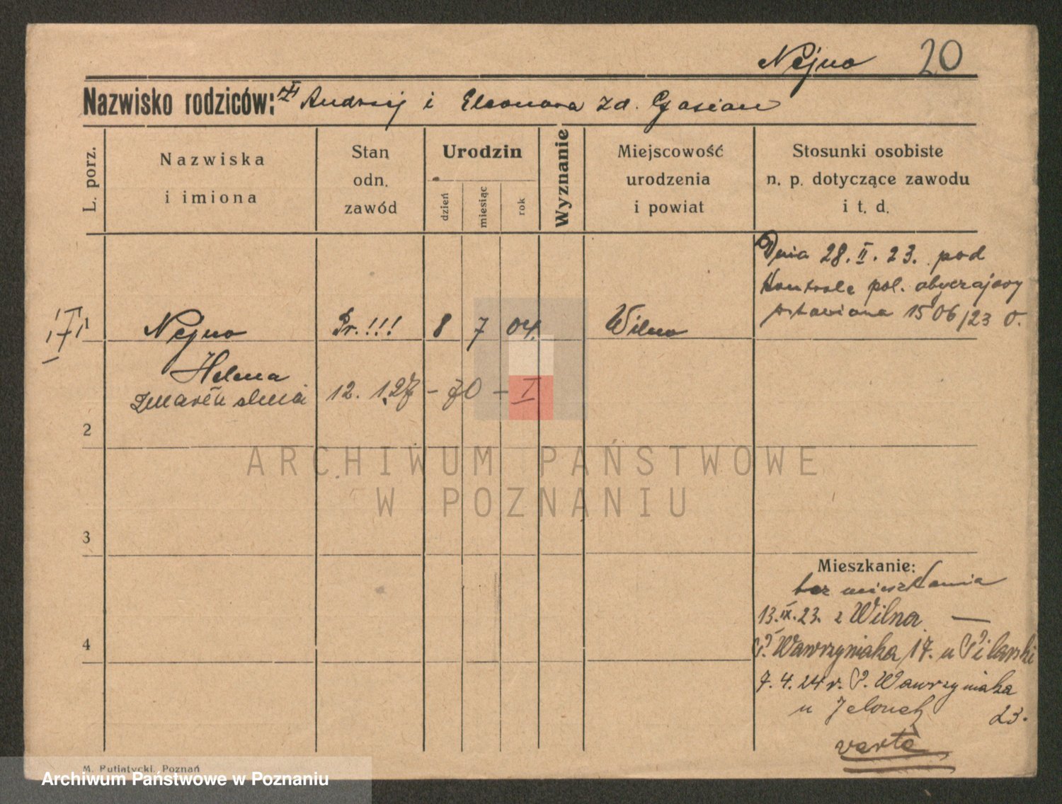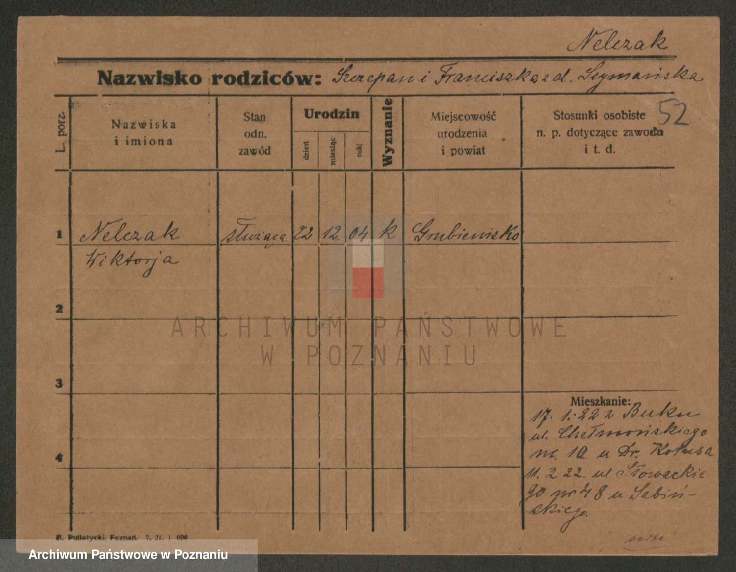 Podgląd karty osobowej dostępny jest po kliknięciu na nazwisko lub ikonkę karty. Można dokonywać powiększenia (ikony na górze) lub przechodzić między kolejnymi skanami (strzałki po bokach).
