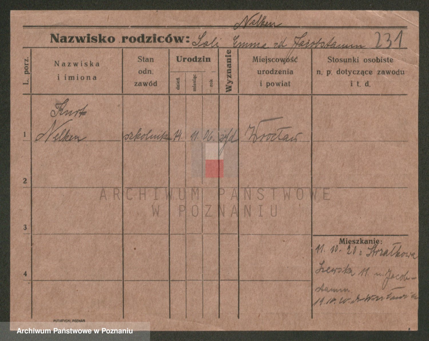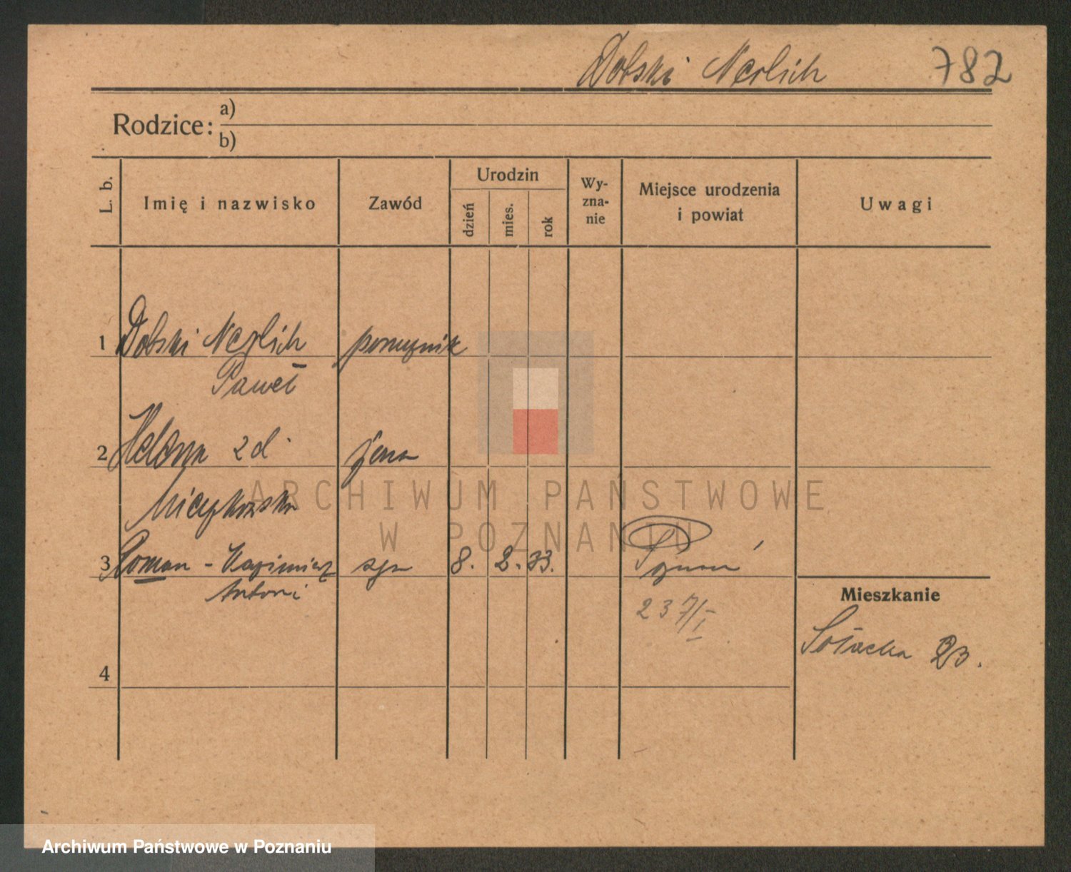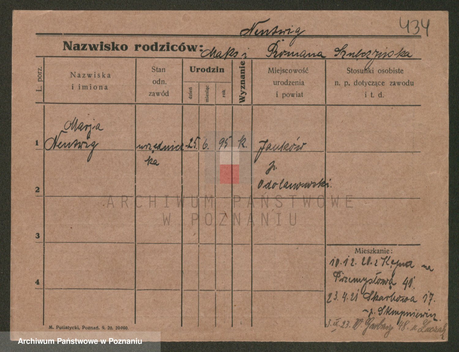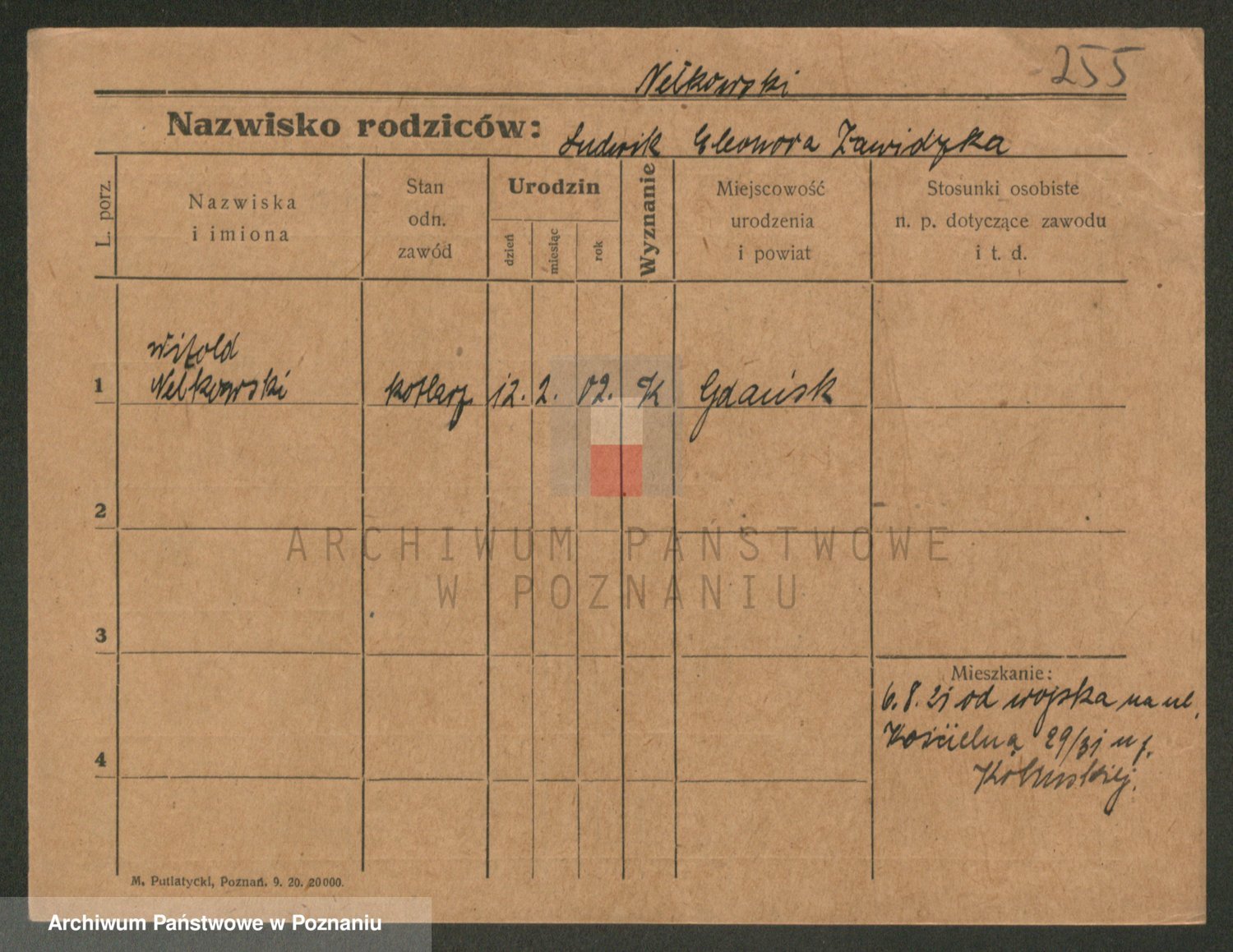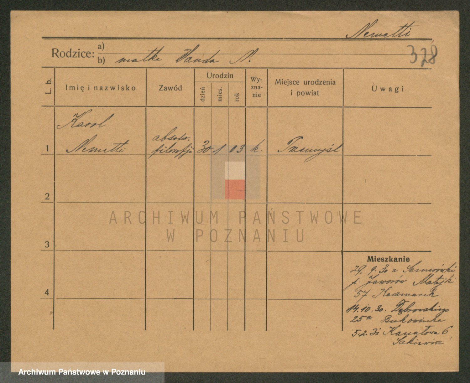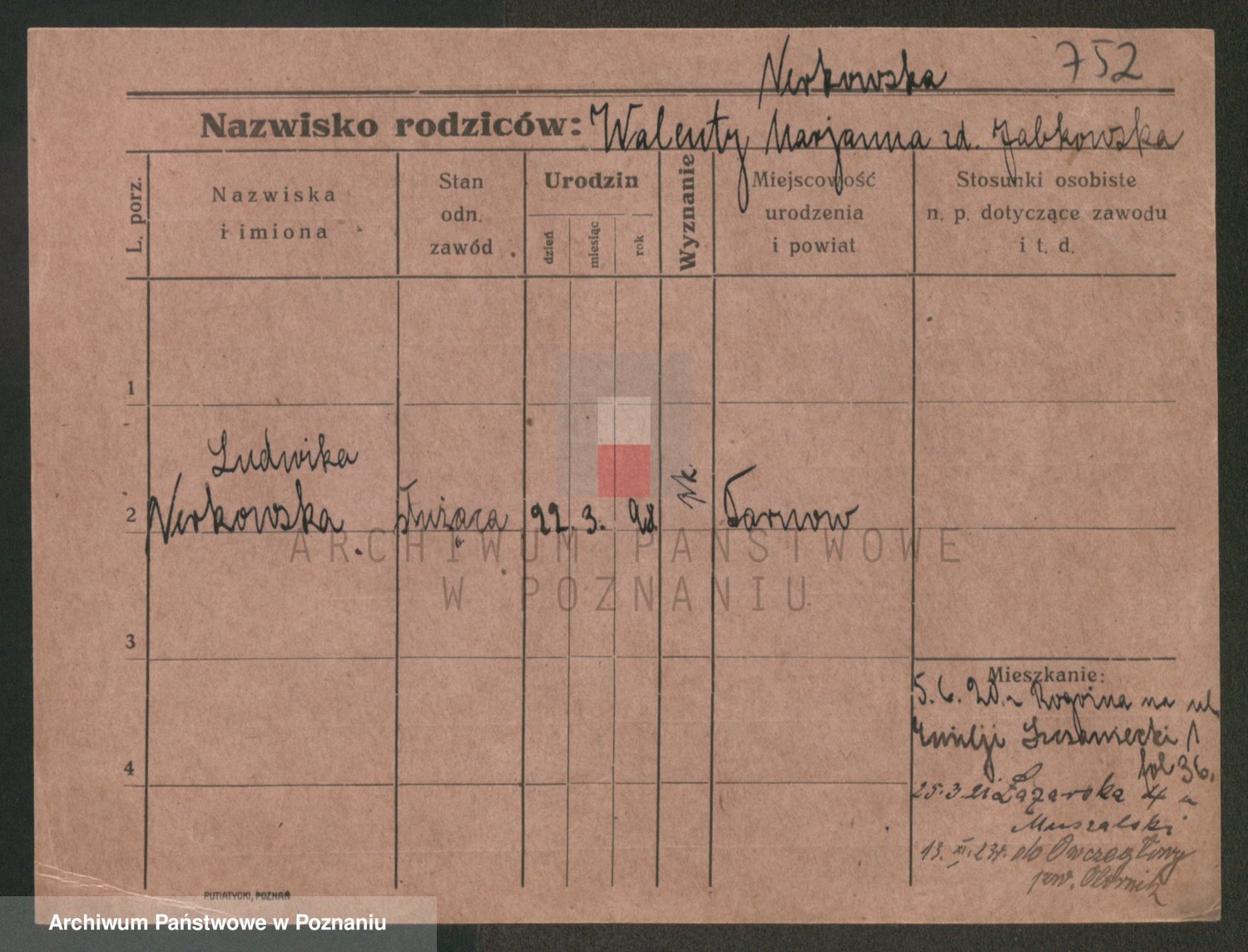 Podgląd karty osobowej dostępny jest po kliknięciu na nazwisko lub ikonkę karty. Można dokonywać powiększenia (ikony na górze) lub przechodzić między kolejnymi skanami (strzałki po bokach).