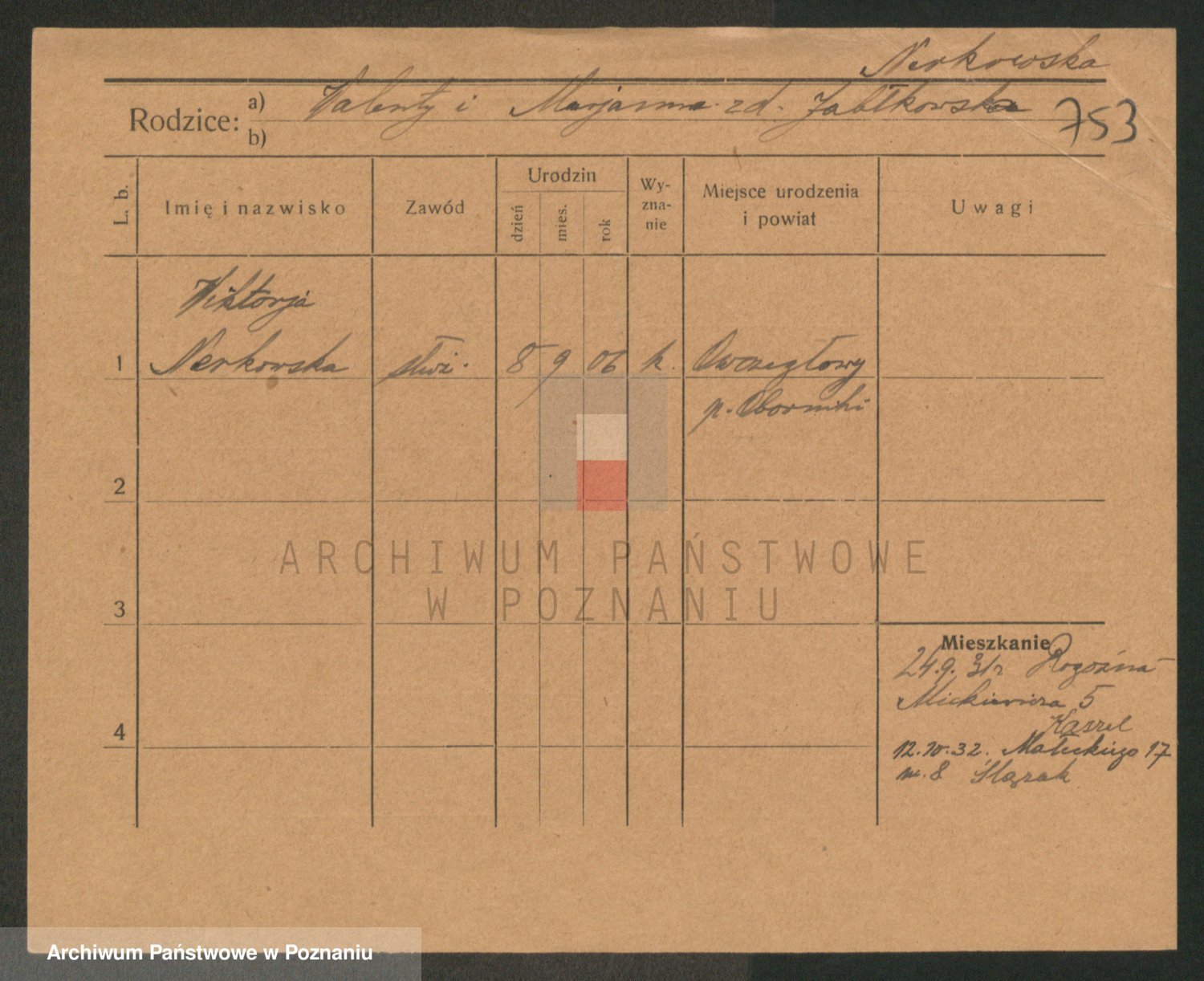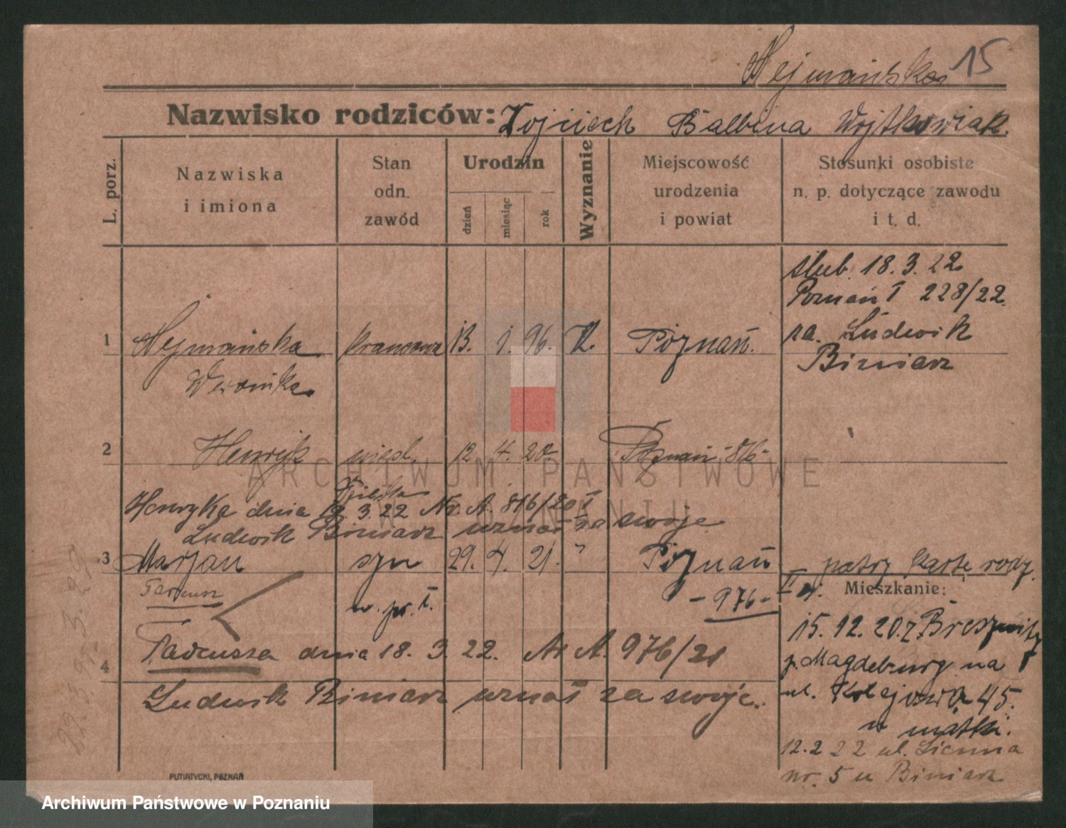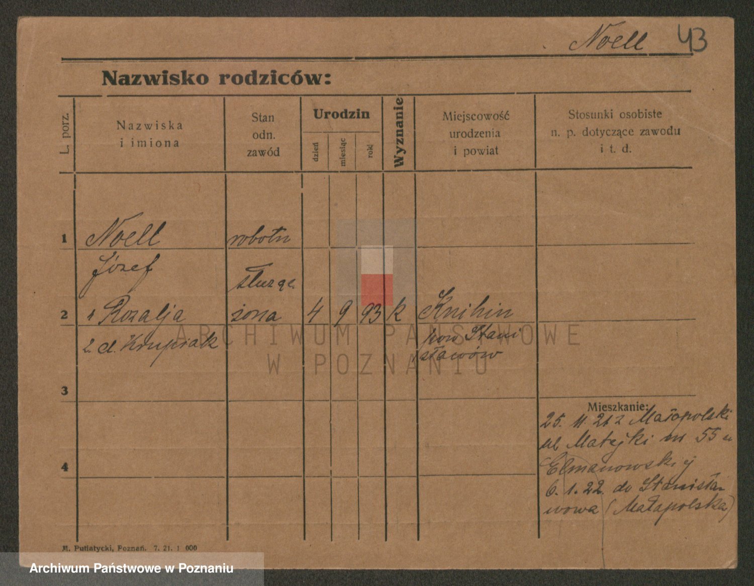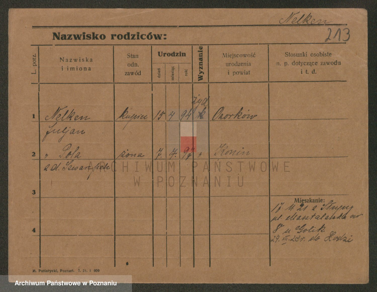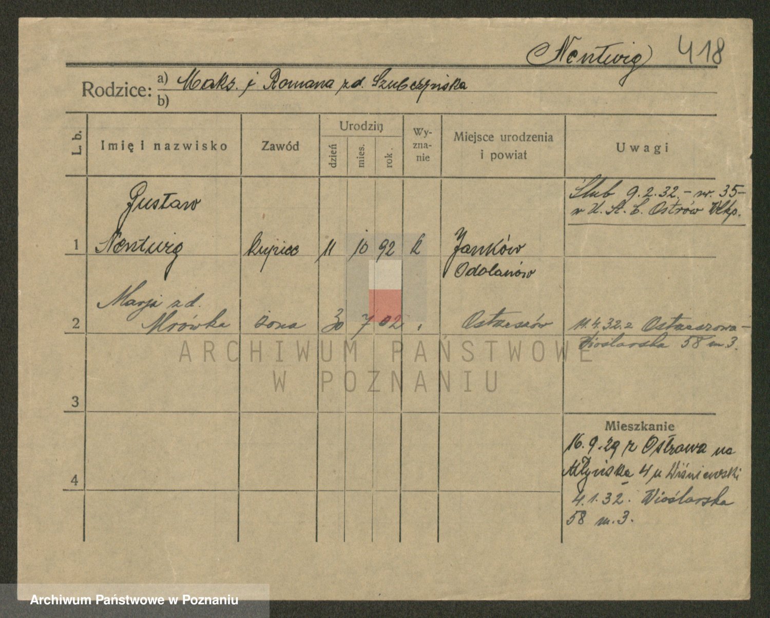 Podgląd karty osobowej dostępny jest po kliknięciu na nazwisko lub ikonkę karty. Można dokonywać powiększenia (ikony na górze) lub przechodzić między kolejnymi skanami (strzałki po bokach).