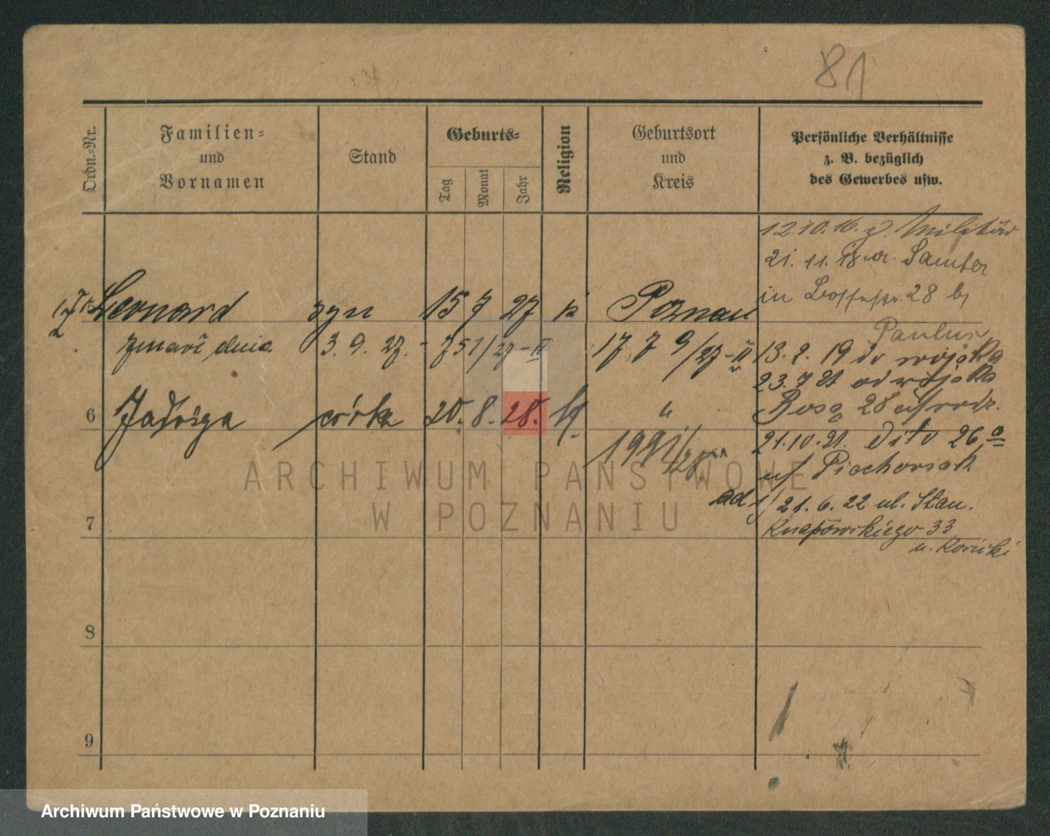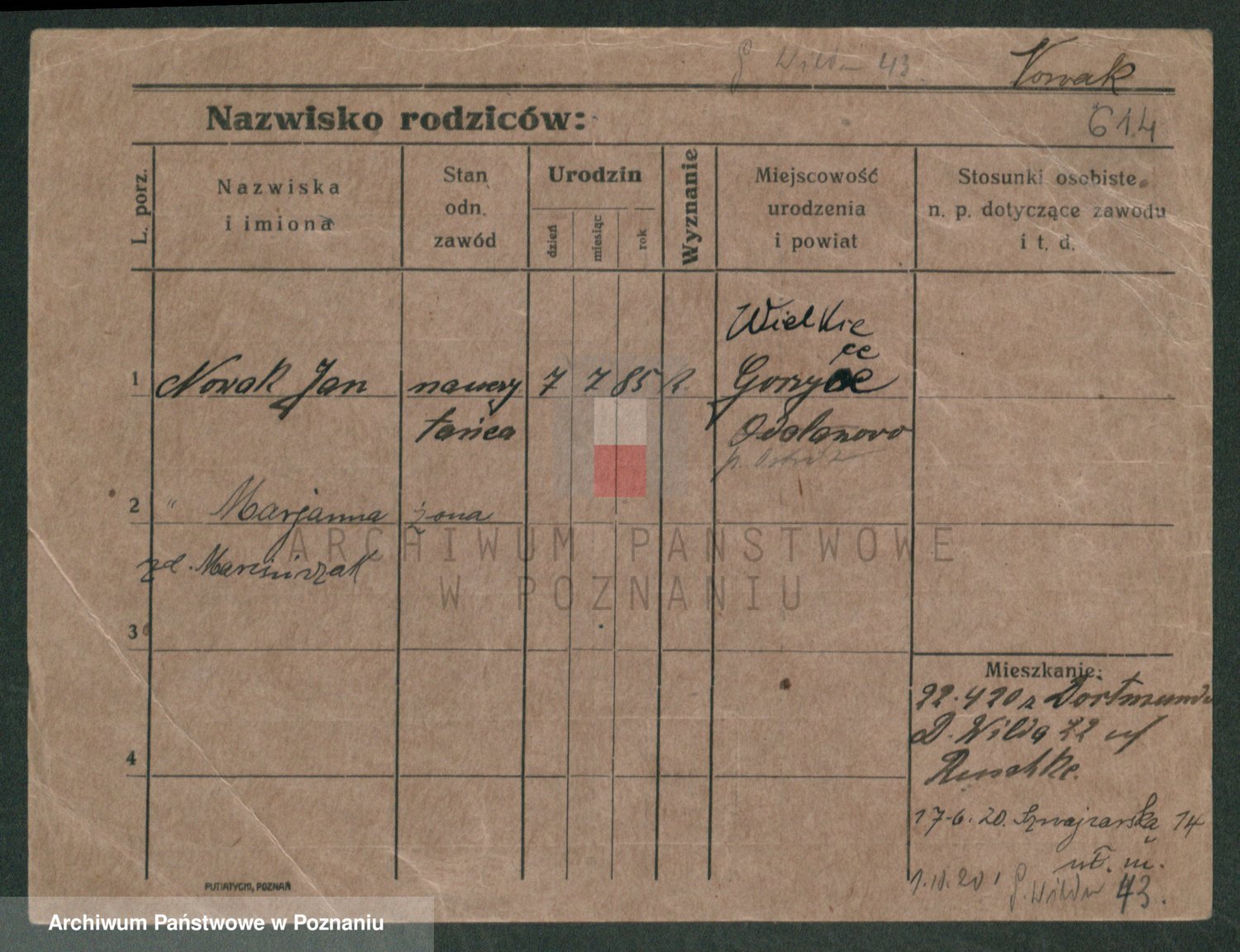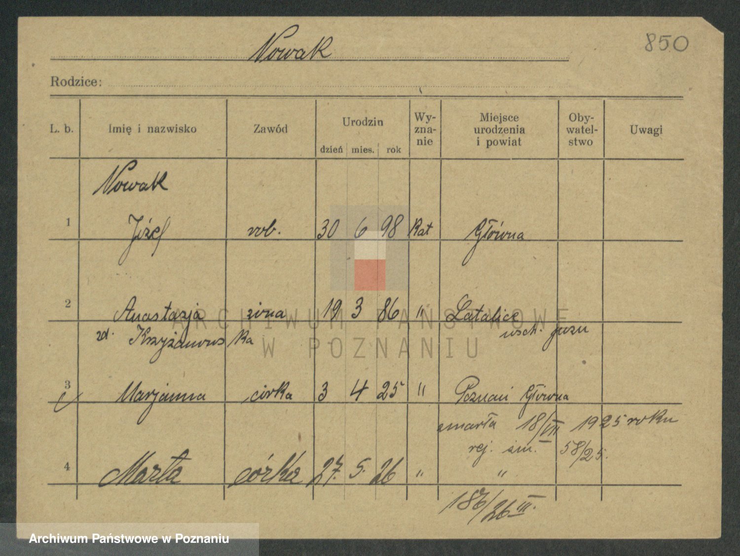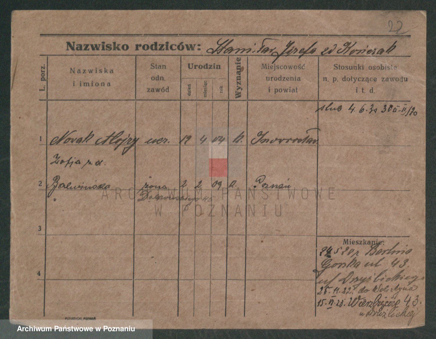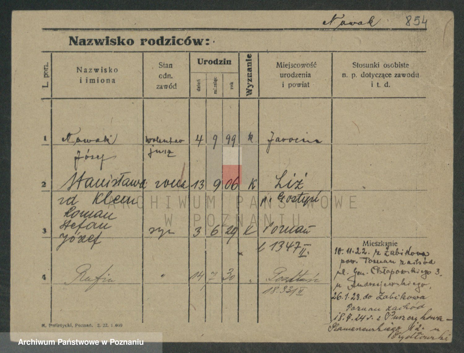 Podgląd karty osobowej dostępny jest po kliknięciu na nazwisko lub ikonkę karty. Można dokonywać powiększenia (ikony na górze) lub przechodzić między kolejnymi skanami (strzałki po bokach).