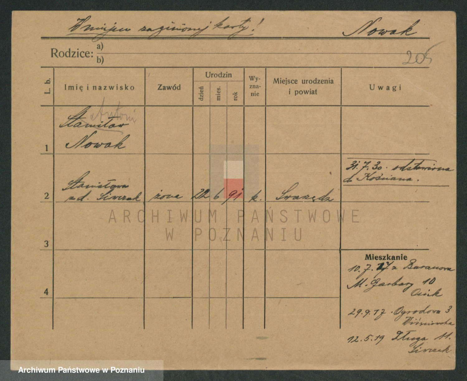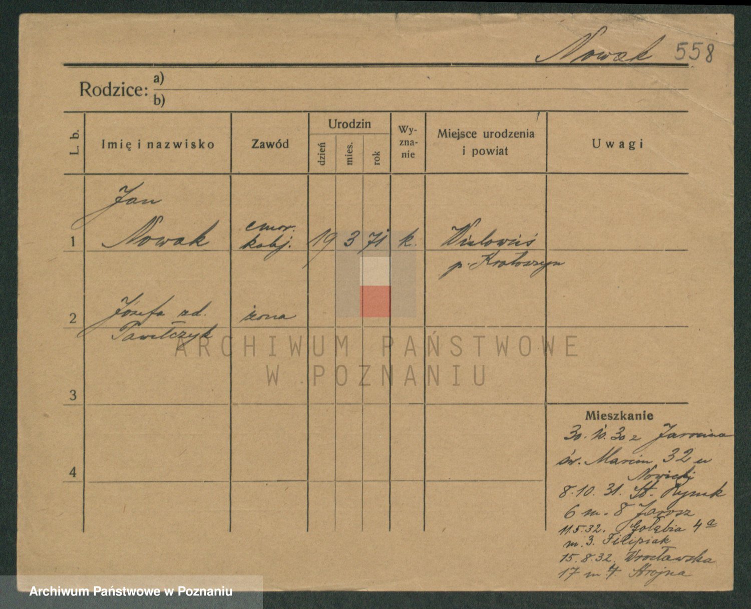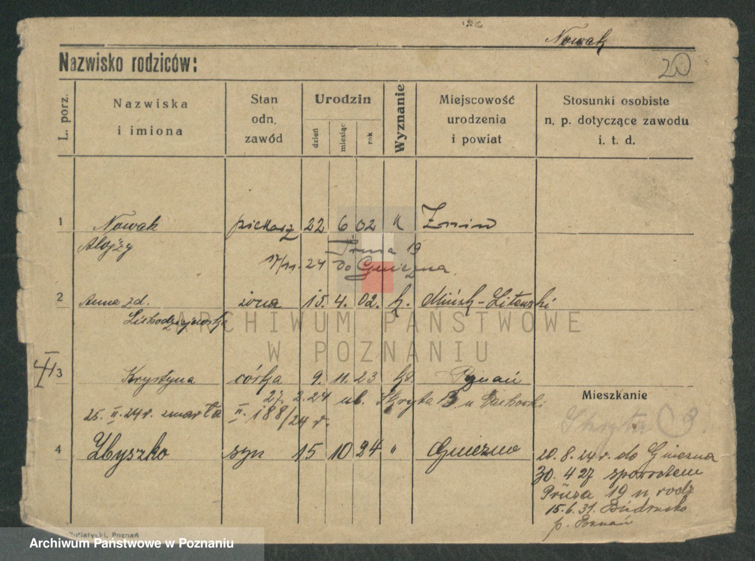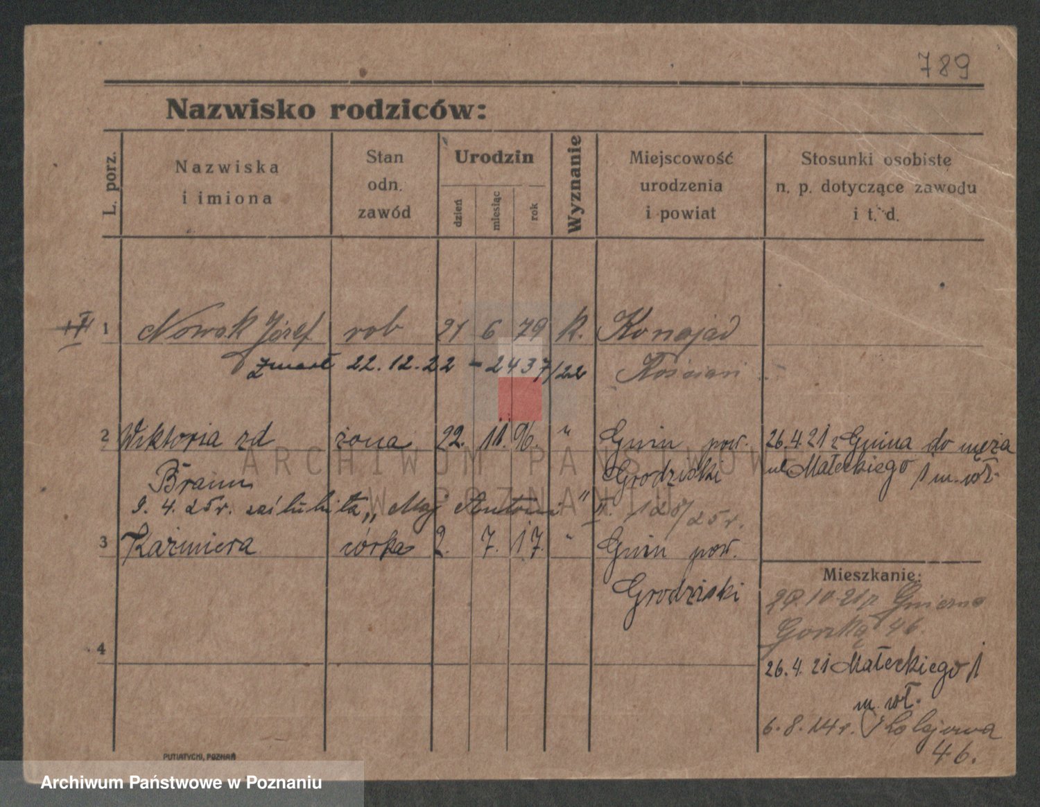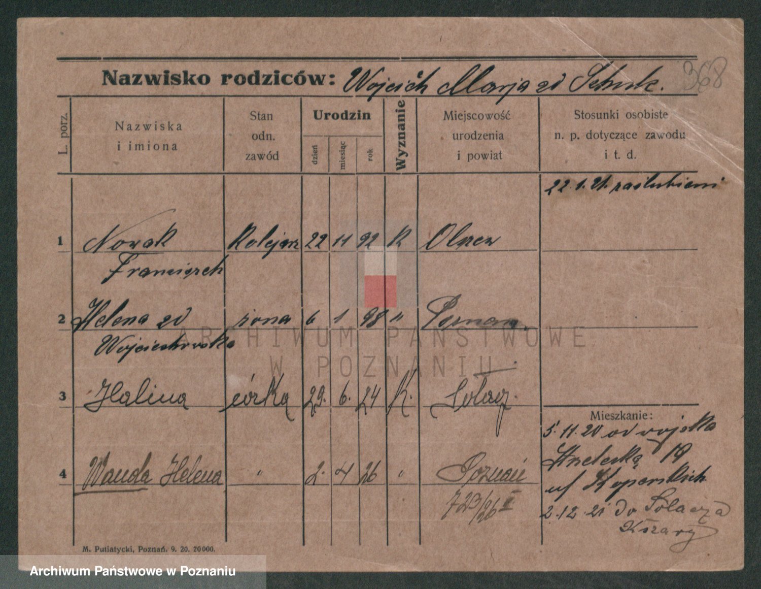 Podgląd karty osobowej dostępny jest po kliknięciu na nazwisko lub ikonkę karty. Można dokonywać powiększenia (ikony na górze) lub przechodzić między kolejnymi skanami (strzałki po bokach).