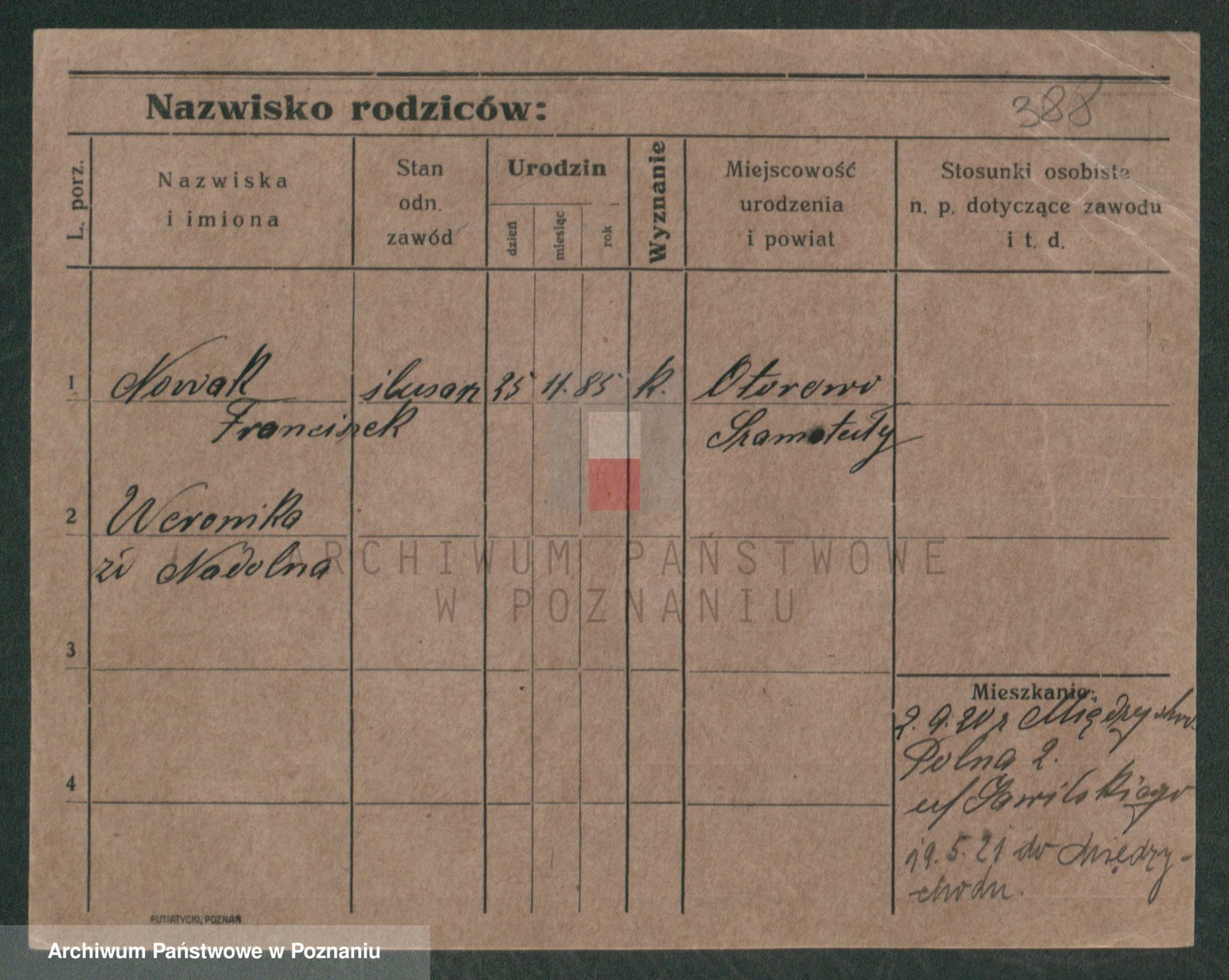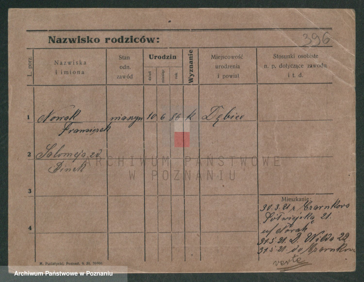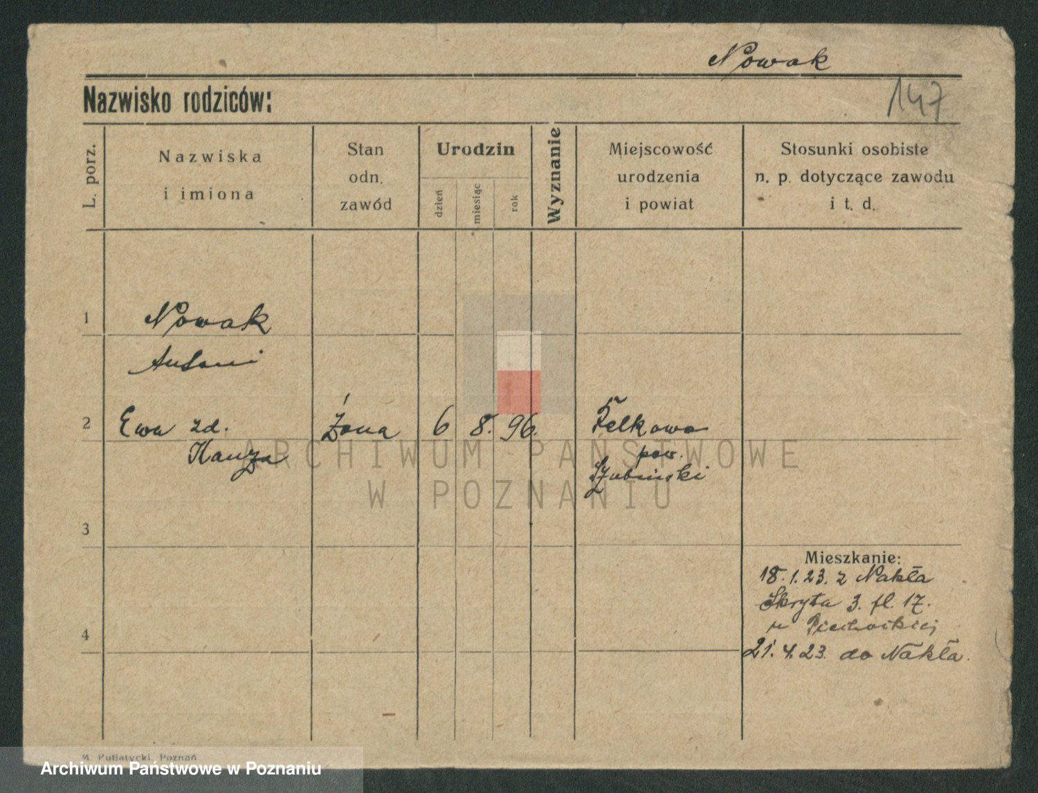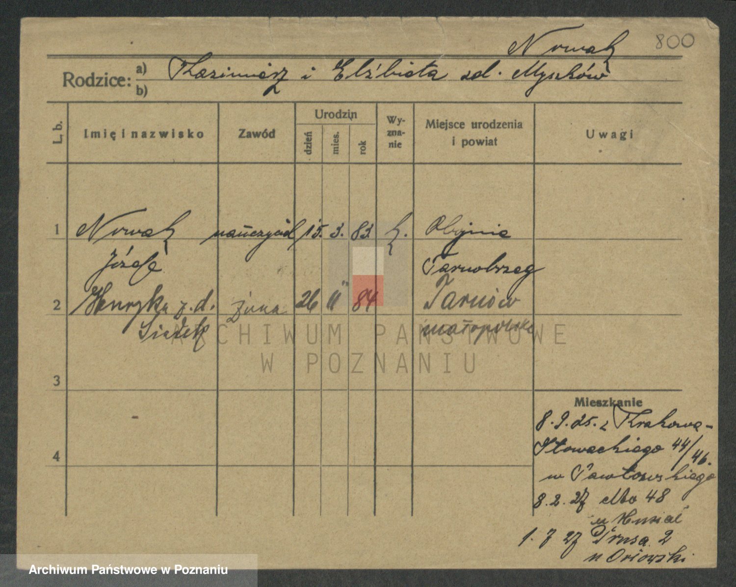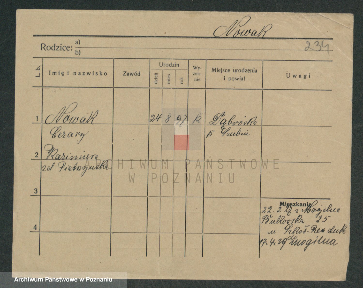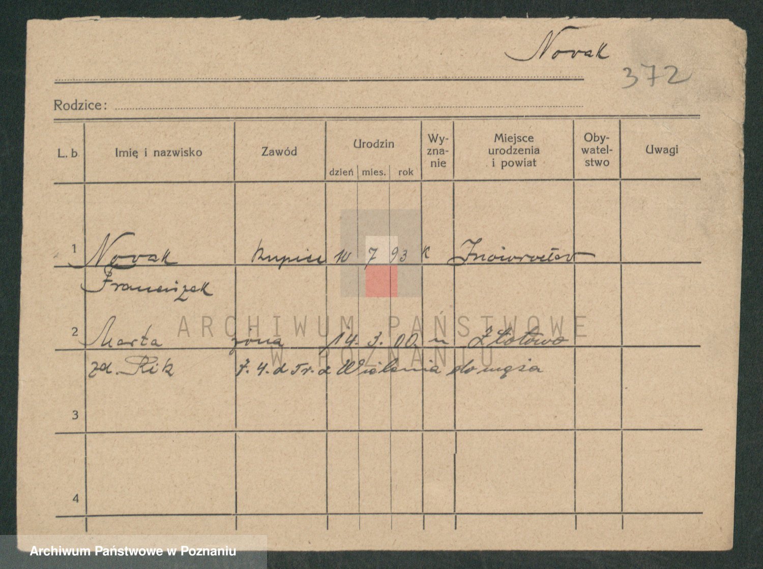 Podgląd karty osobowej dostępny jest po kliknięciu na nazwisko lub ikonkę karty. Można dokonywać powiększenia (ikony na górze) lub przechodzić między kolejnymi skanami (strzałki po bokach).