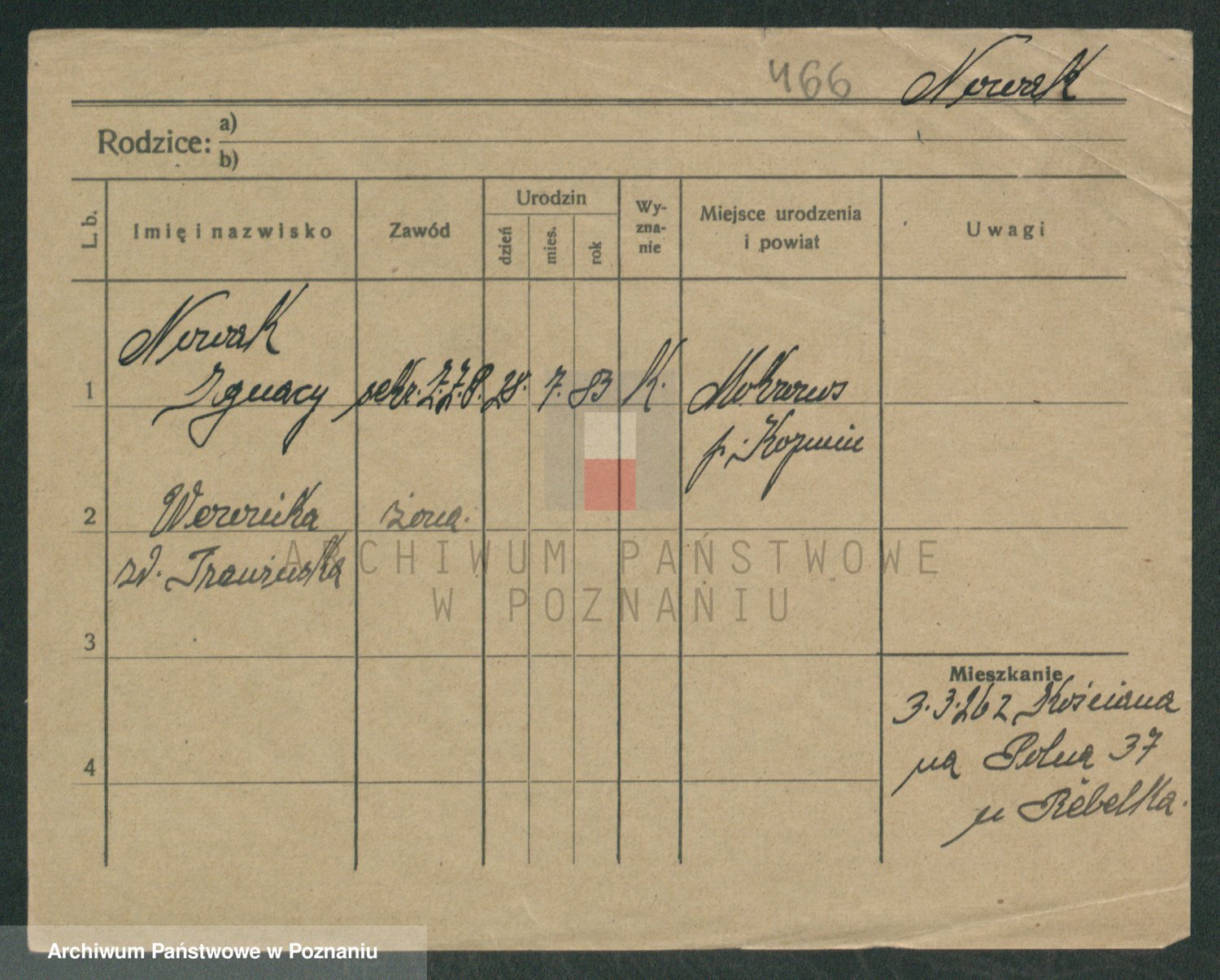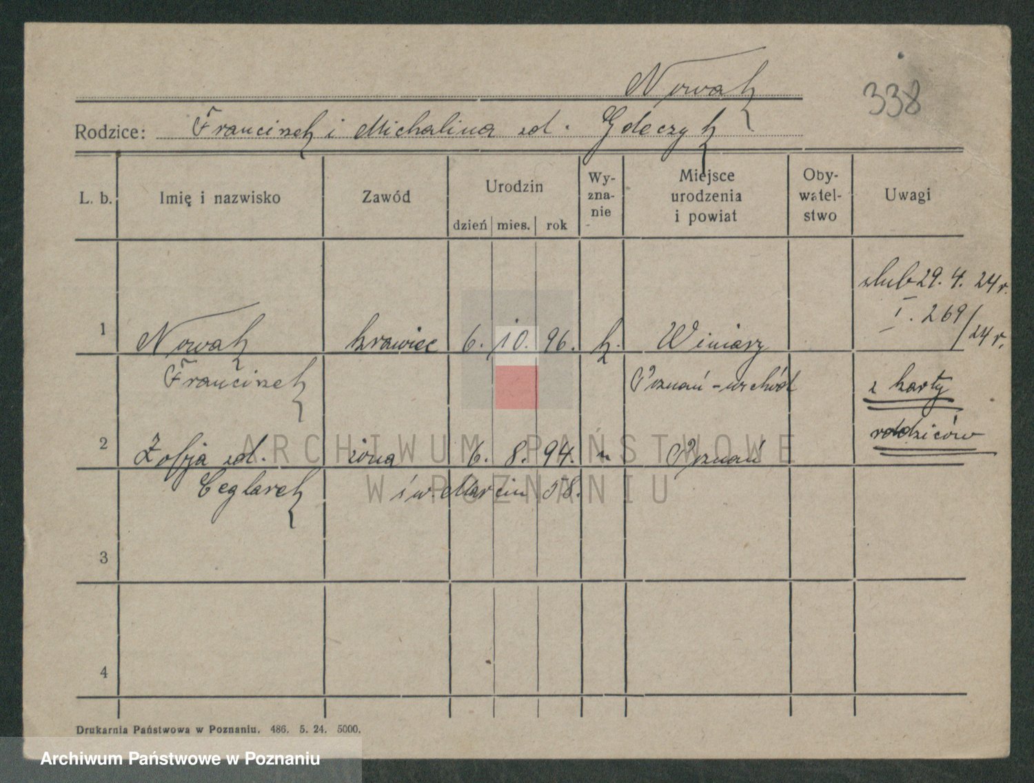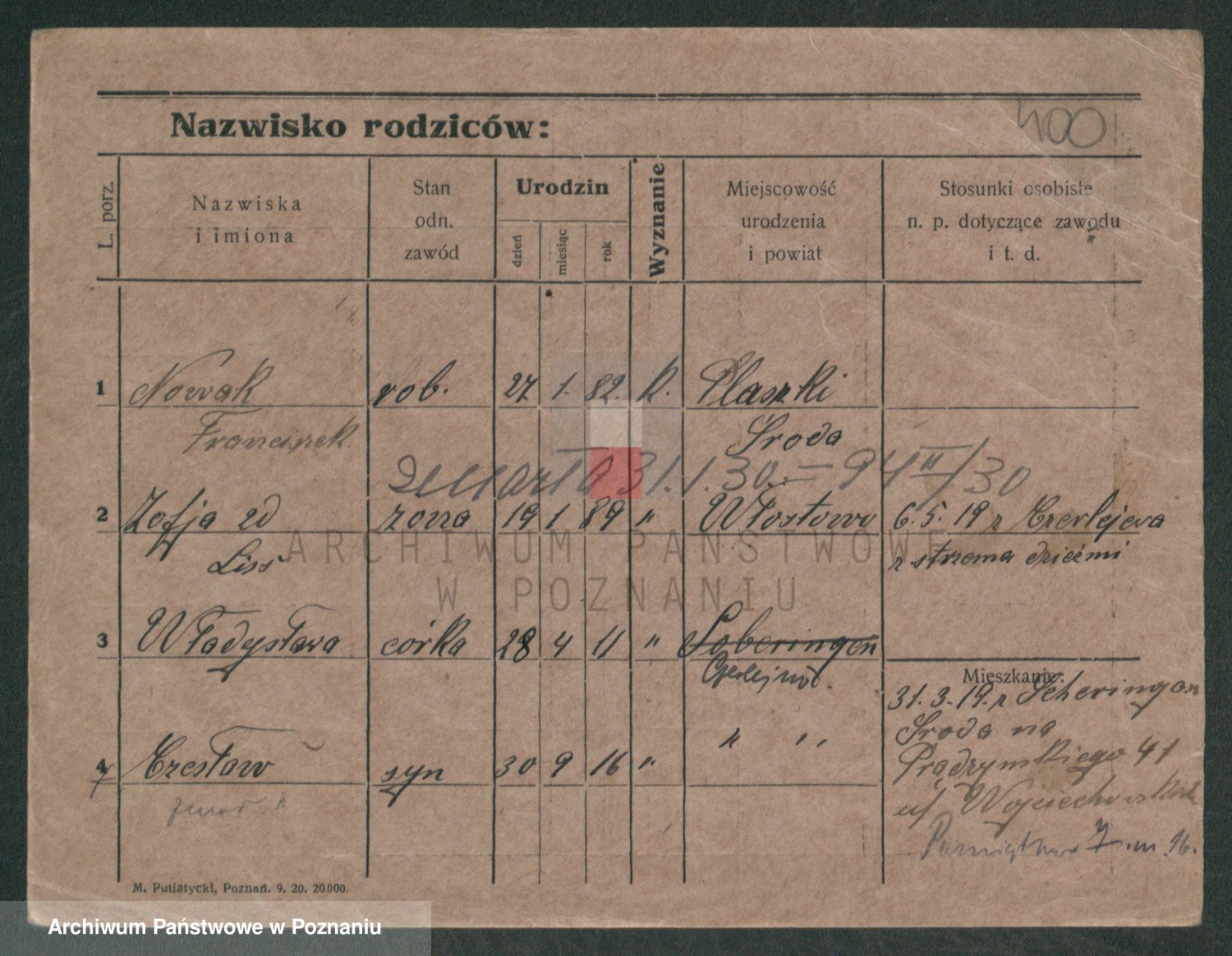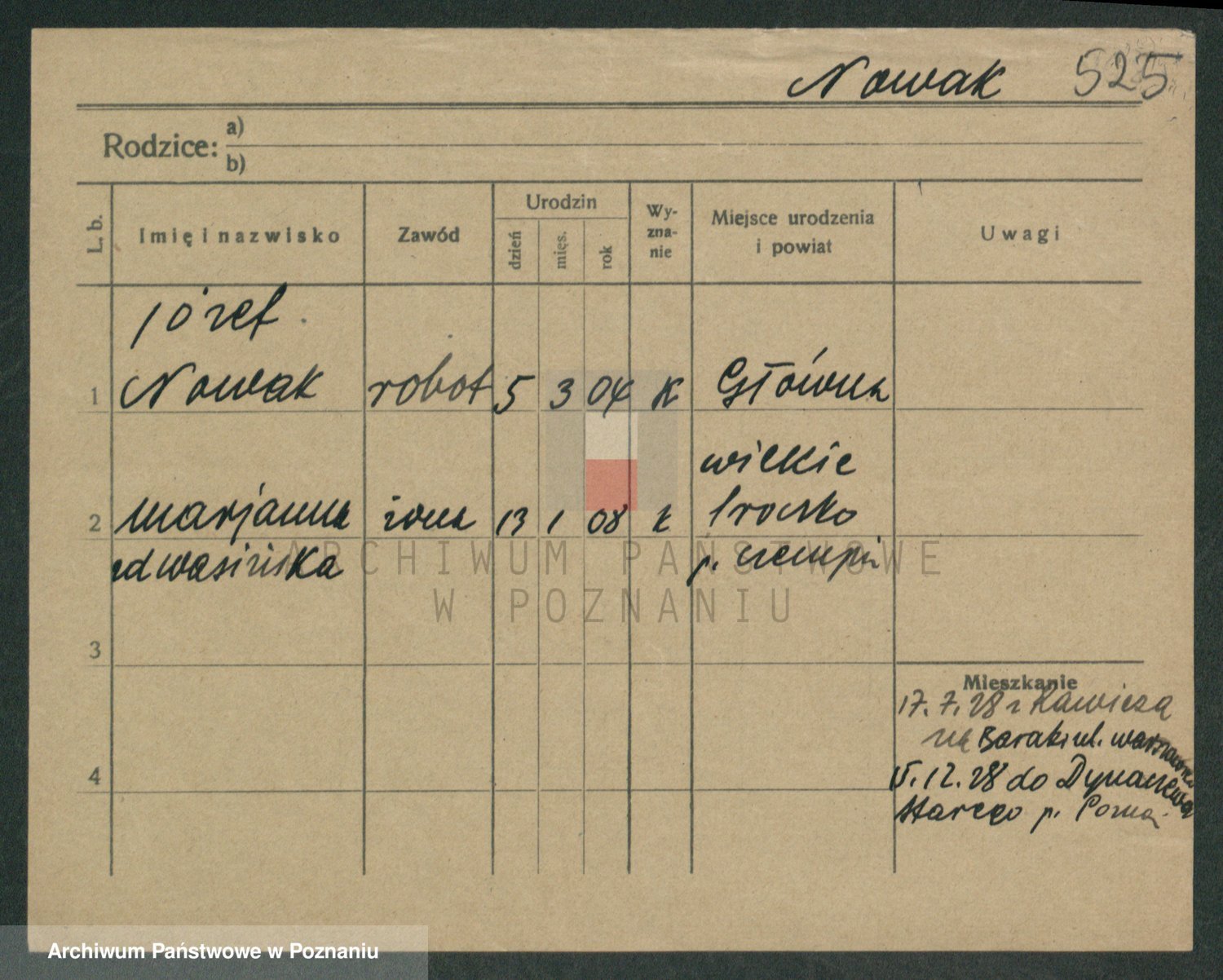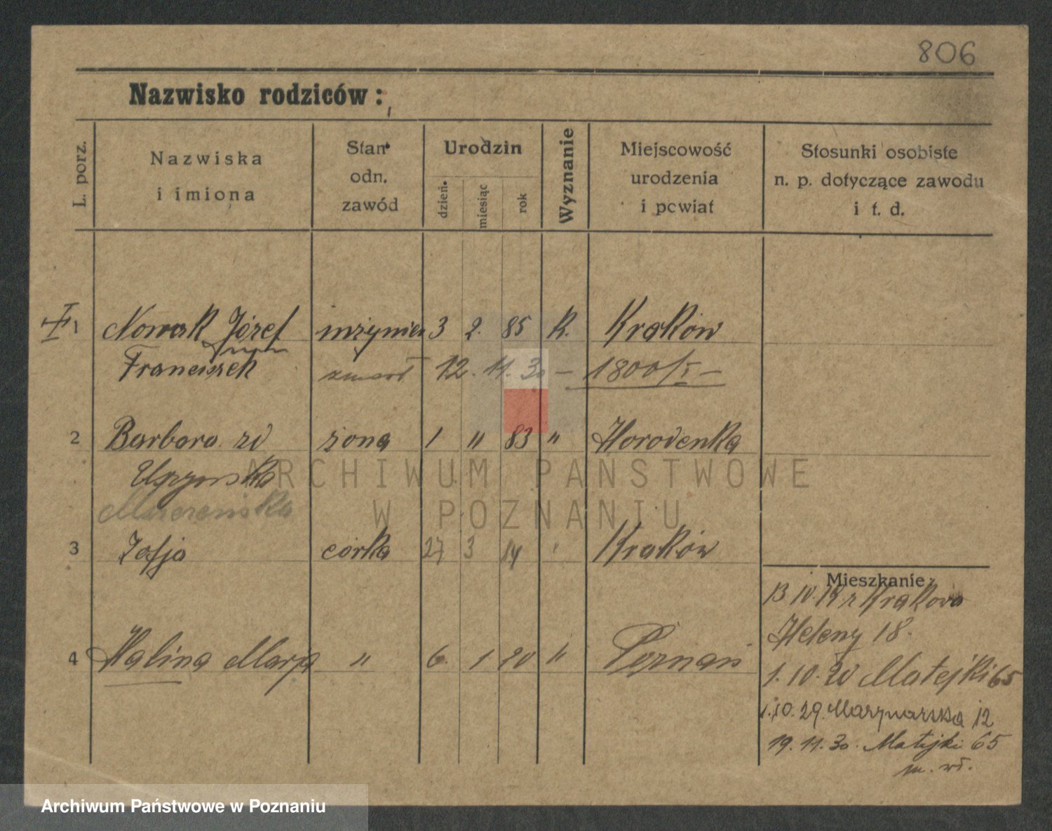 Podgląd karty osobowej dostępny jest po kliknięciu na nazwisko lub ikonkę karty. Można dokonywać powiększenia (ikony na górze) lub przechodzić między kolejnymi skanami (strzałki po bokach).