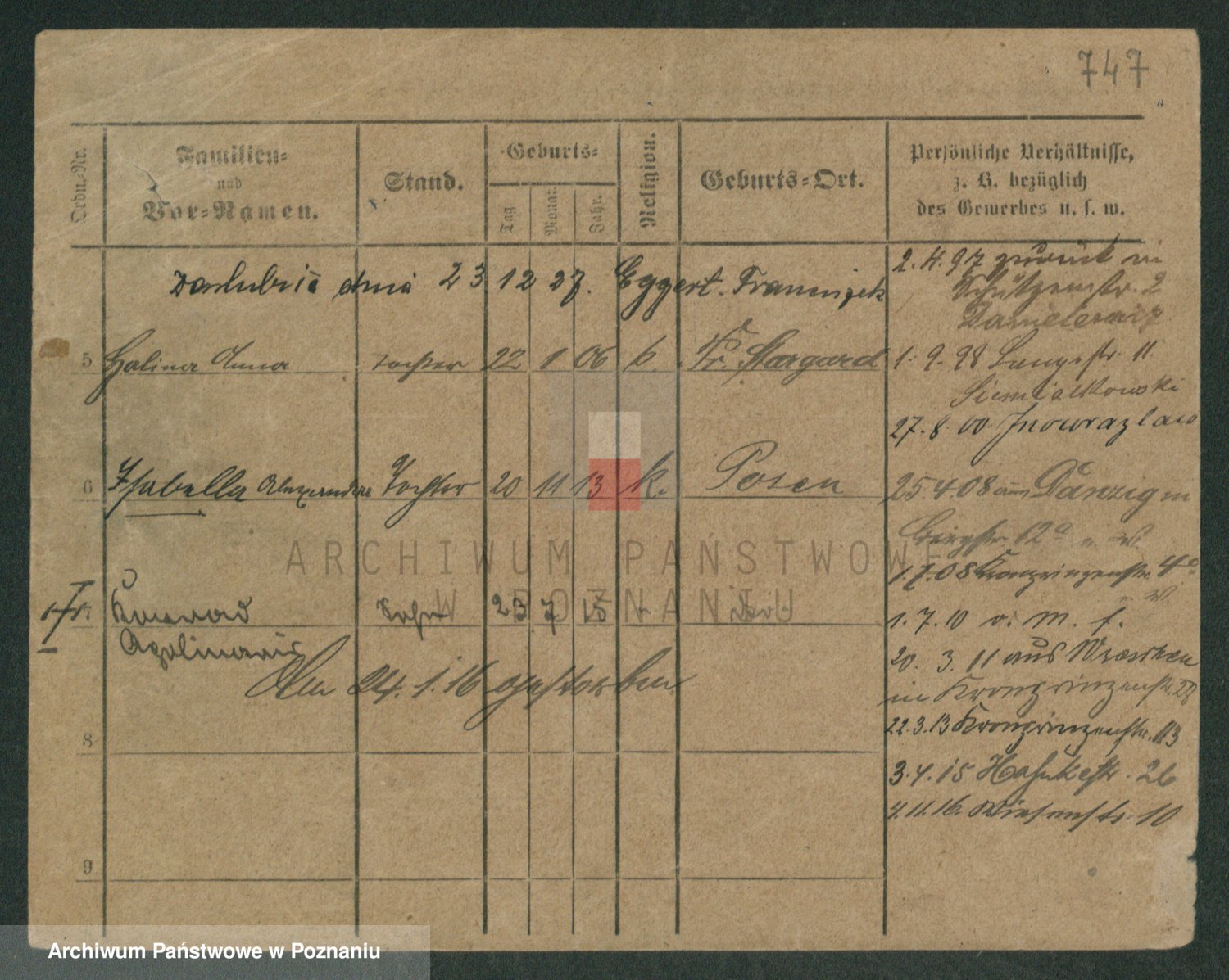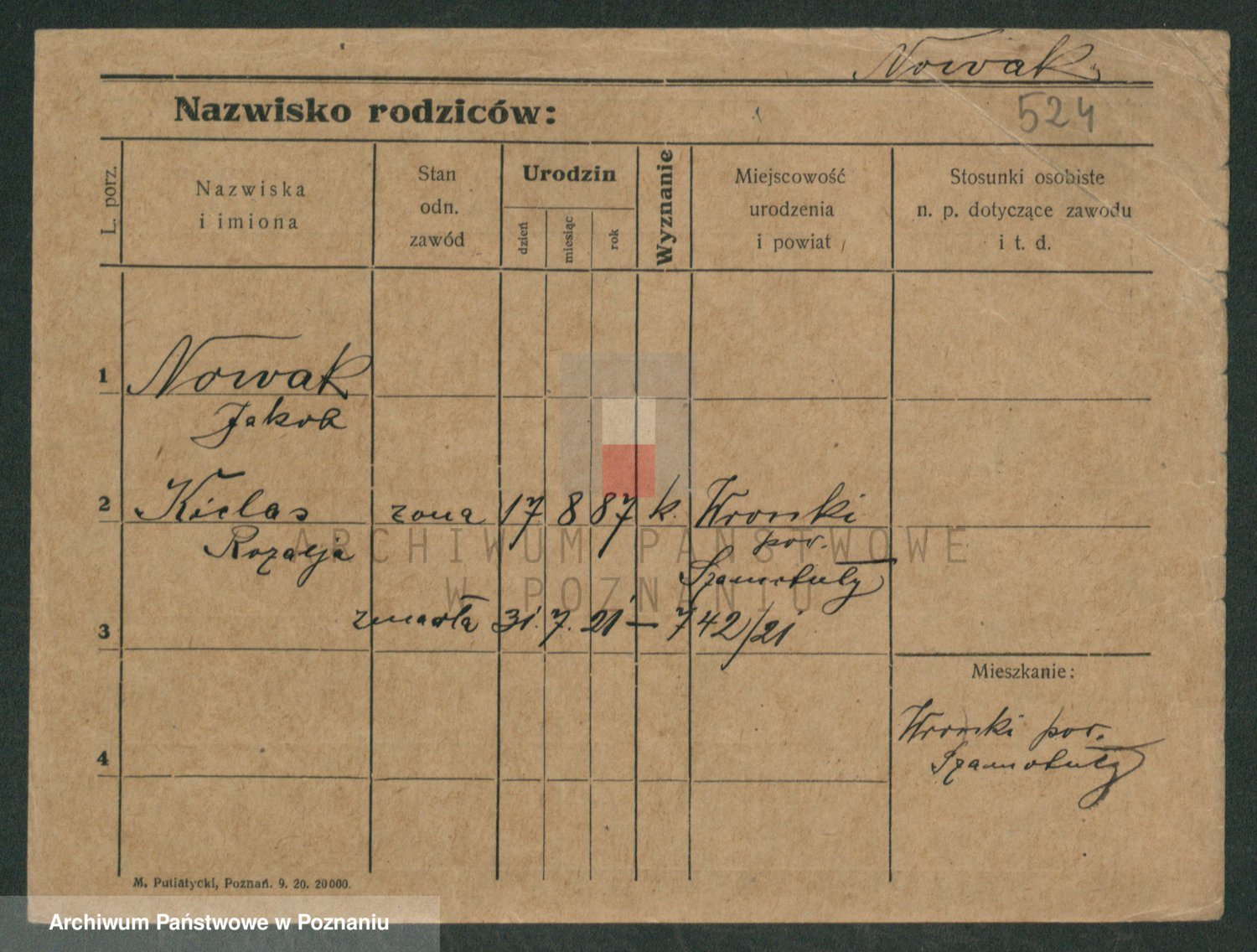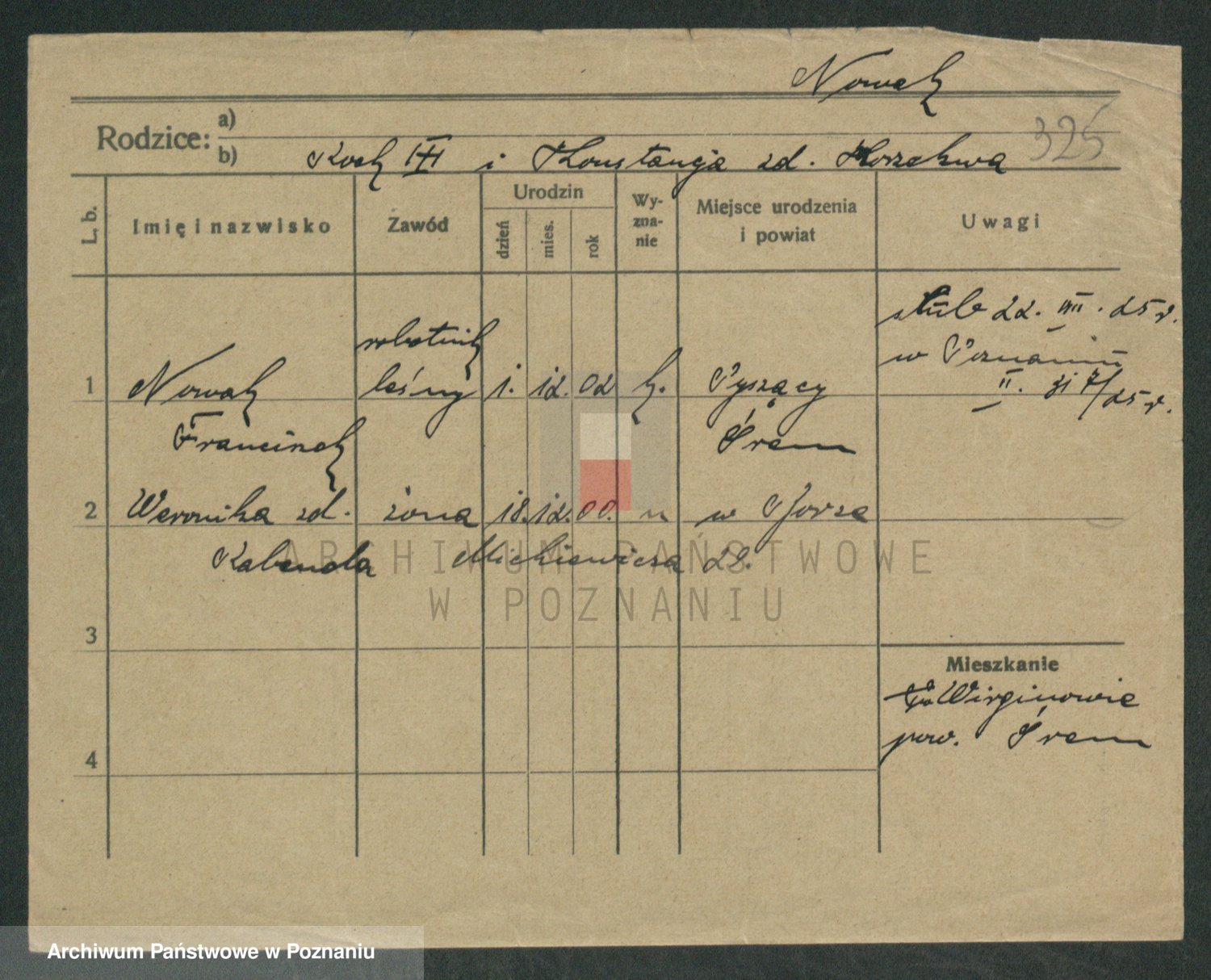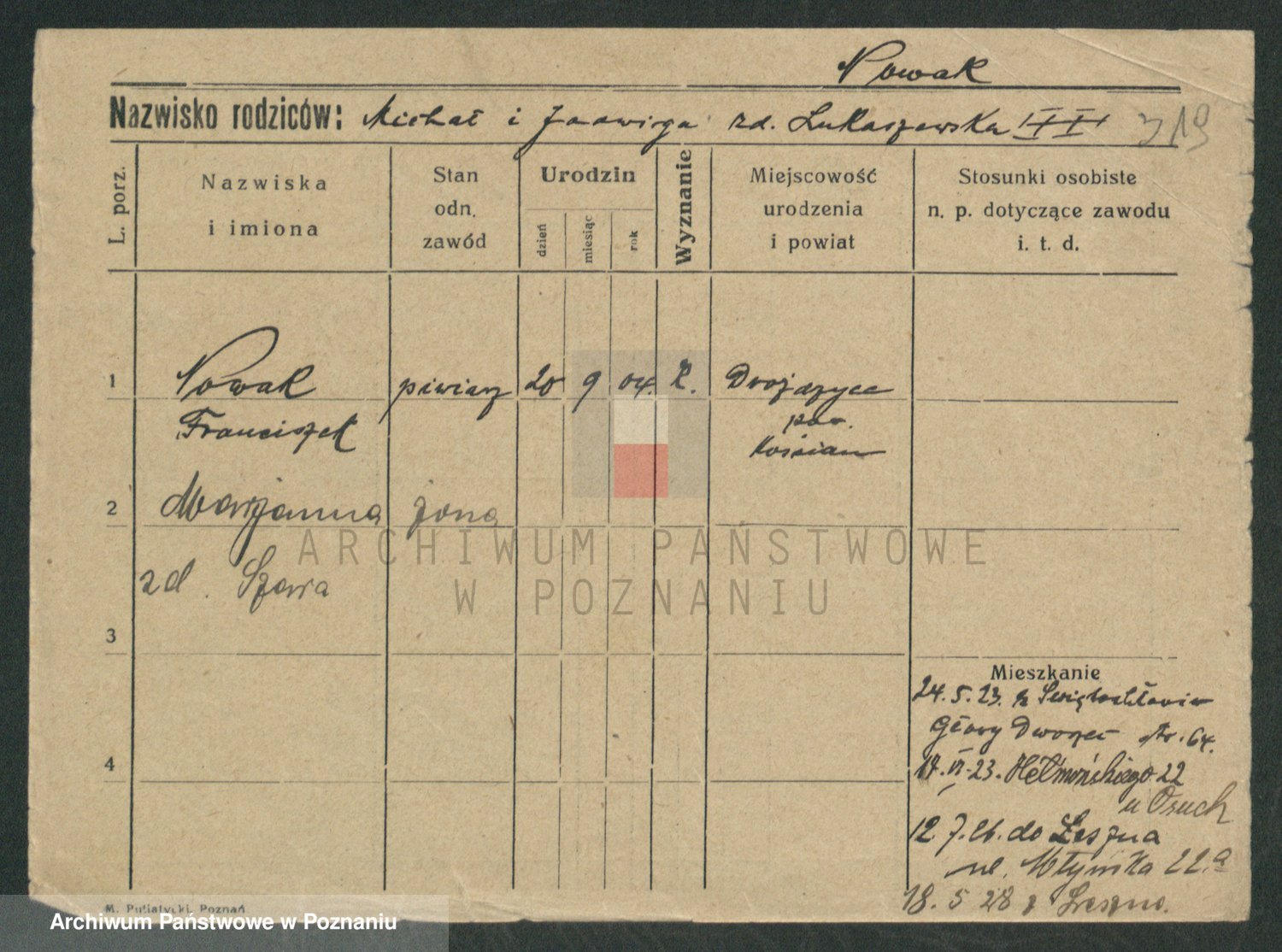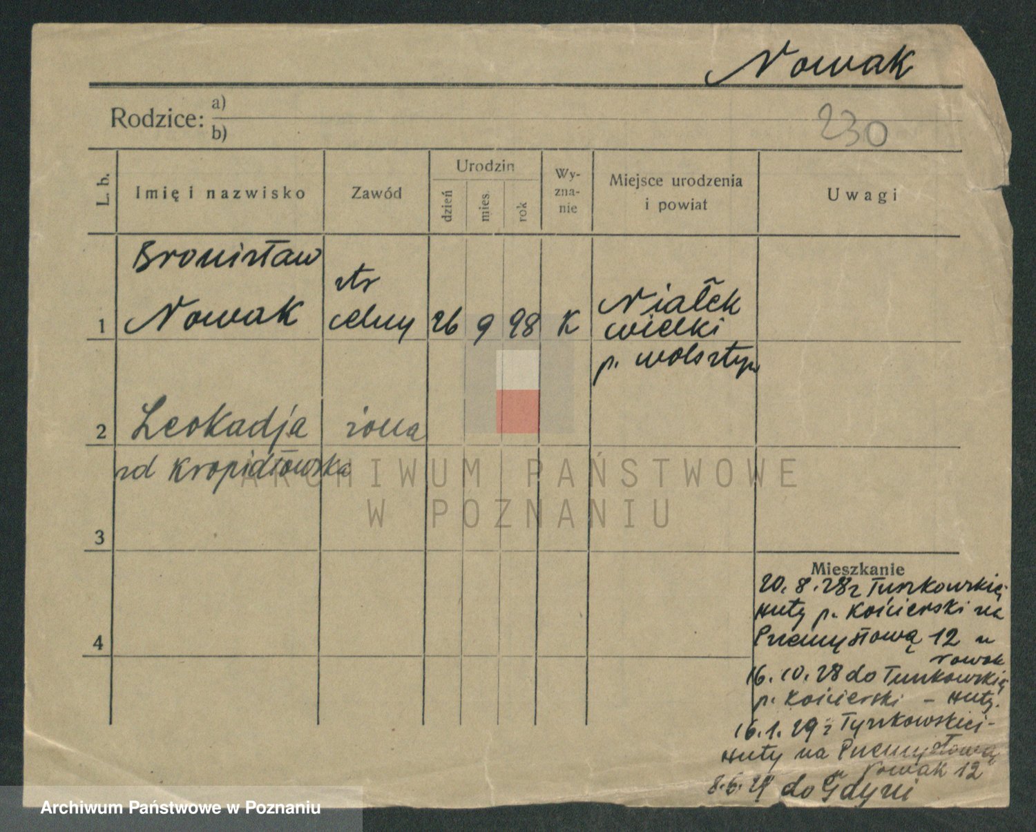 Podgląd karty osobowej dostępny jest po kliknięciu na nazwisko lub ikonkę karty. Można dokonywać powiększenia (ikony na górze) lub przechodzić między kolejnymi skanami (strzałki po bokach).
