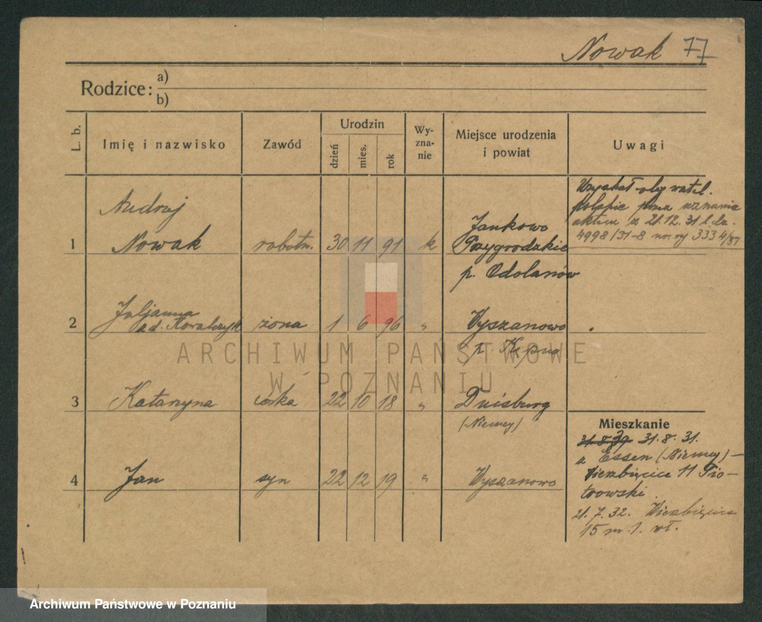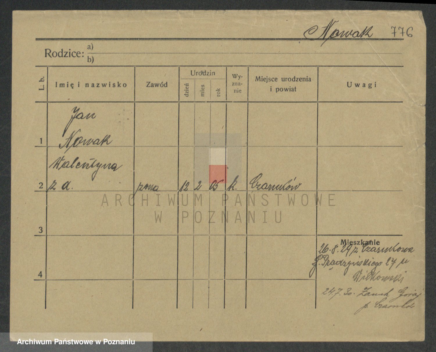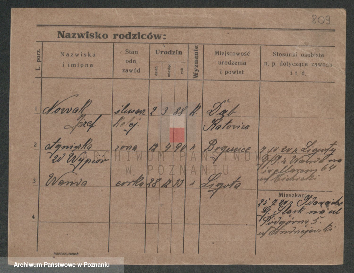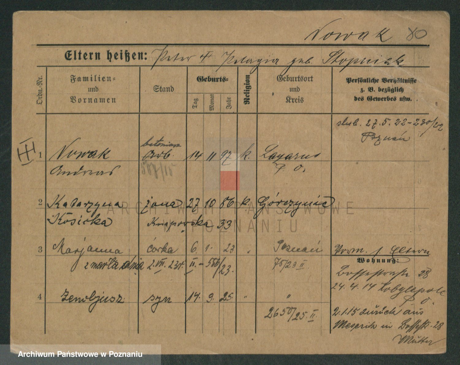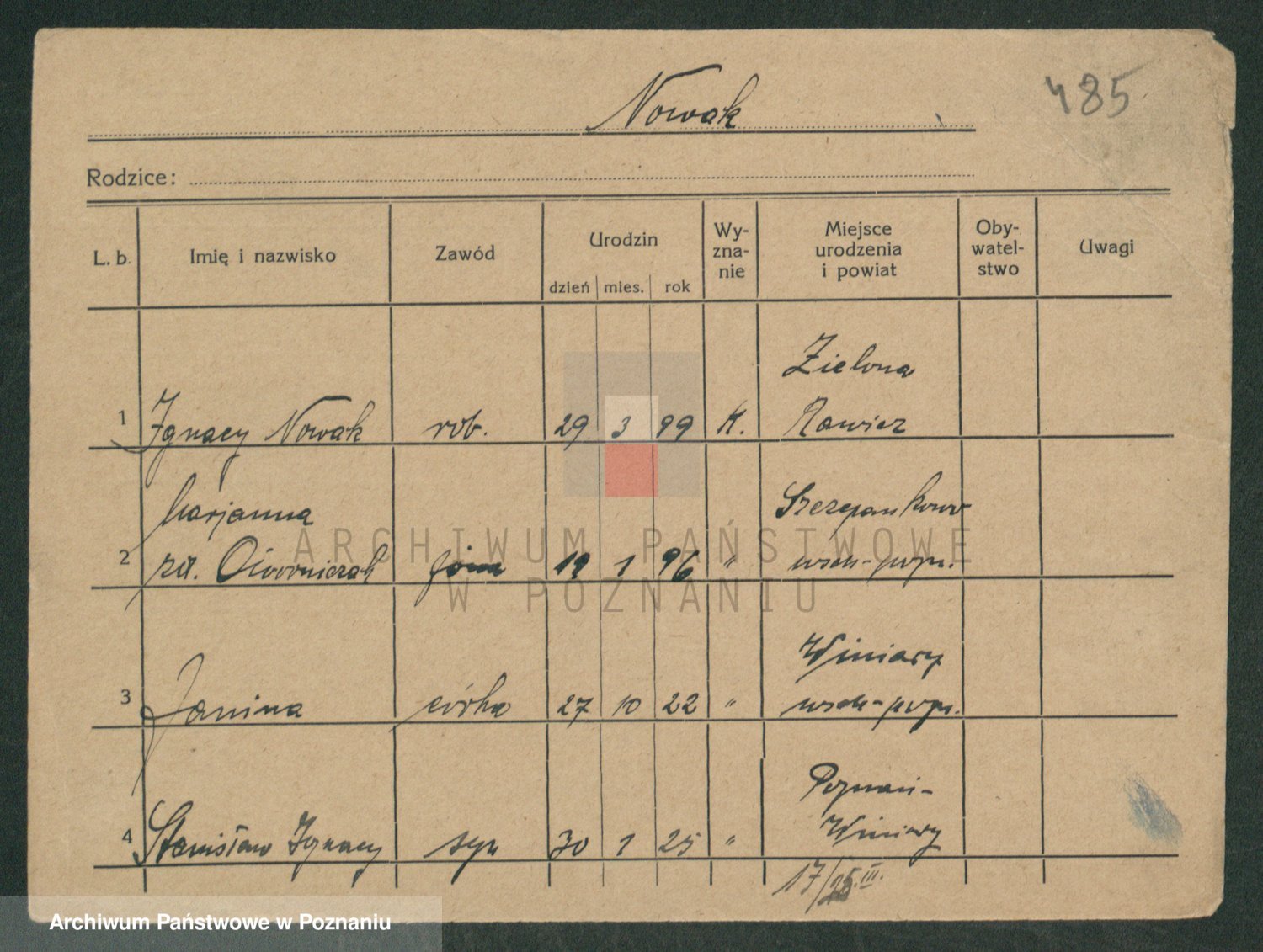 Podgląd karty osobowej dostępny jest po kliknięciu na nazwisko lub ikonkę karty. Można dokonywać powiększenia (ikony na górze) lub przechodzić między kolejnymi skanami (strzałki po bokach).