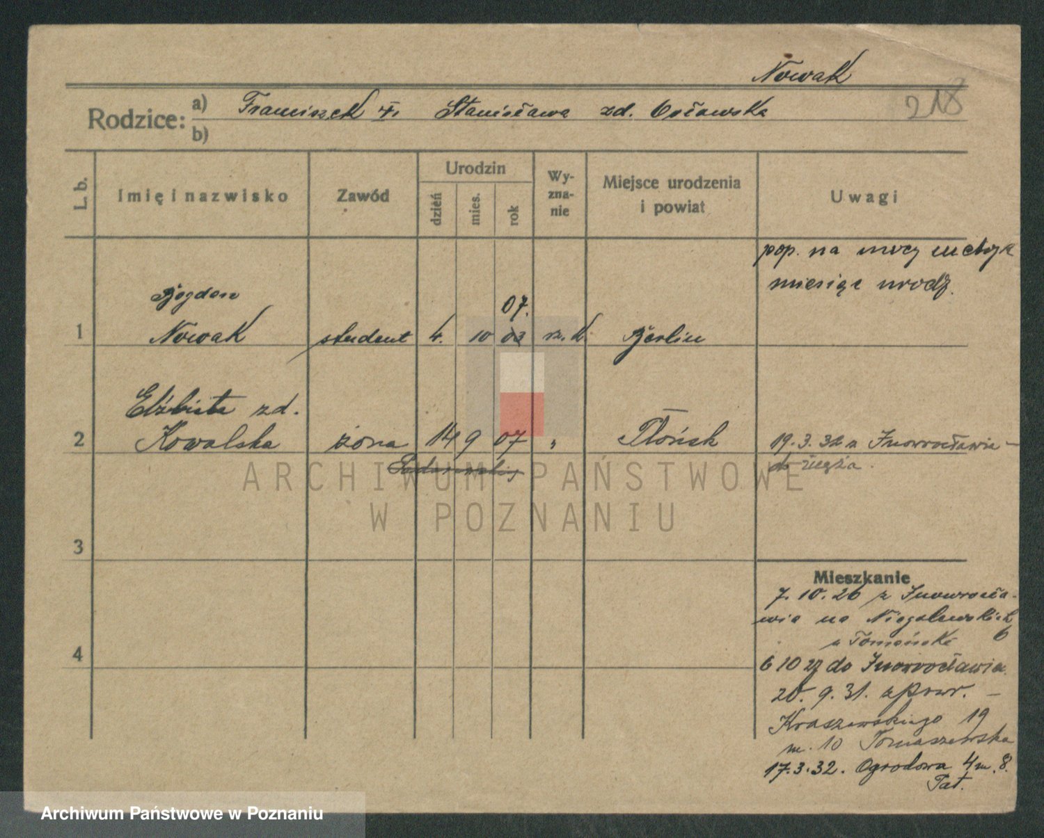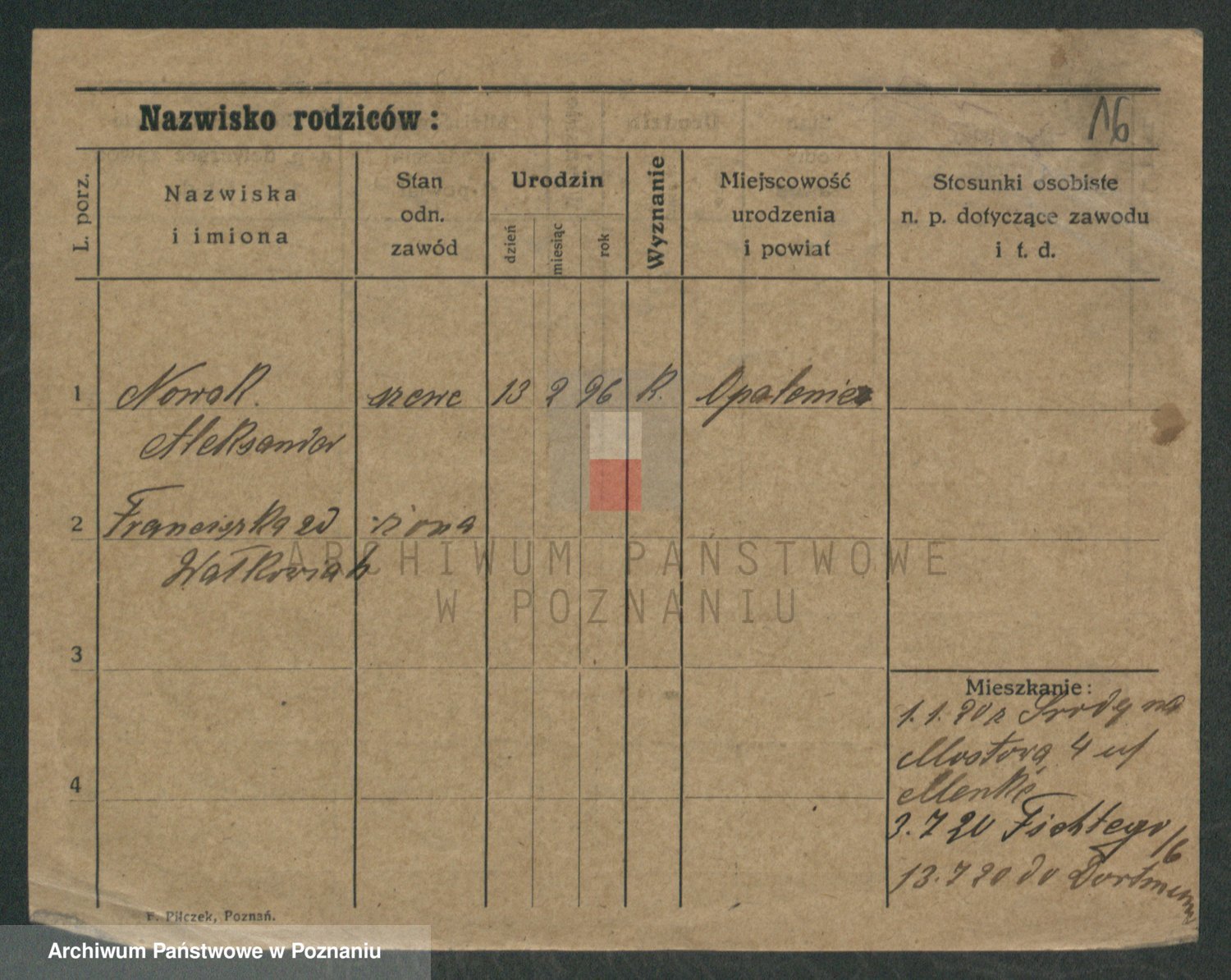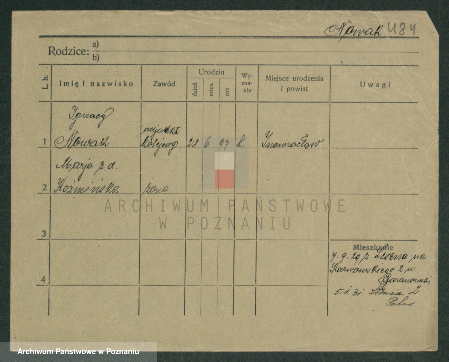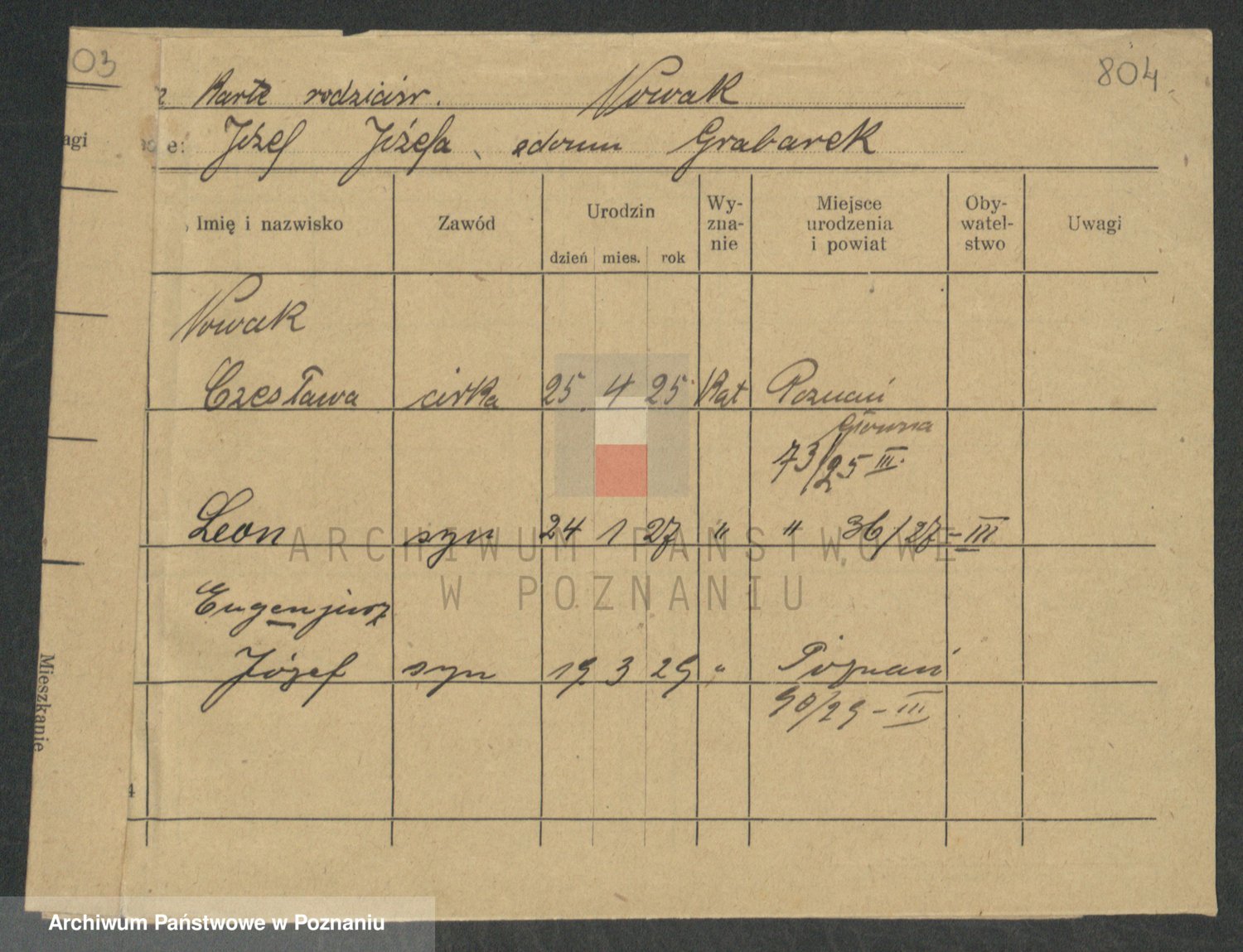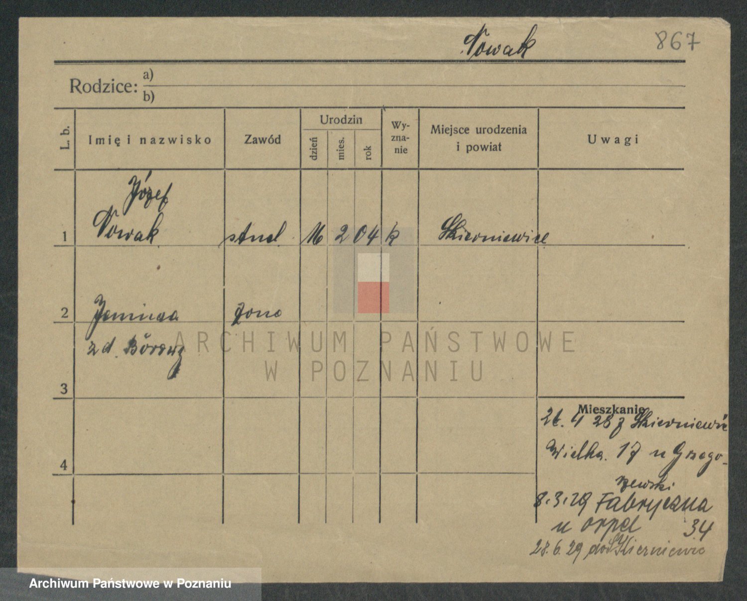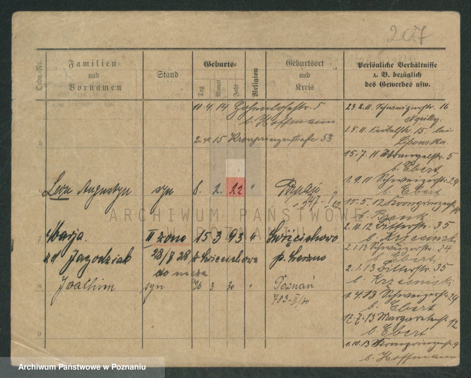Podgląd karty osobowej dostępny jest po kliknięciu na nazwisko lub ikonkę karty. Można dokonywać powiększenia (ikony na górze) lub przechodzić między kolejnymi skanami (strzałki po bokach).