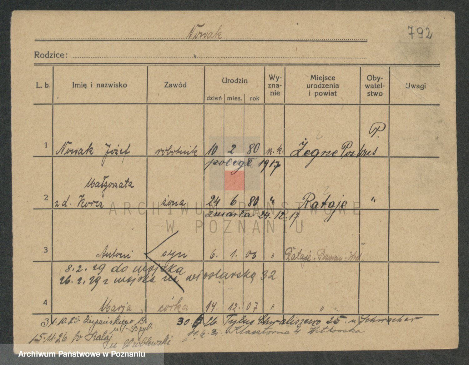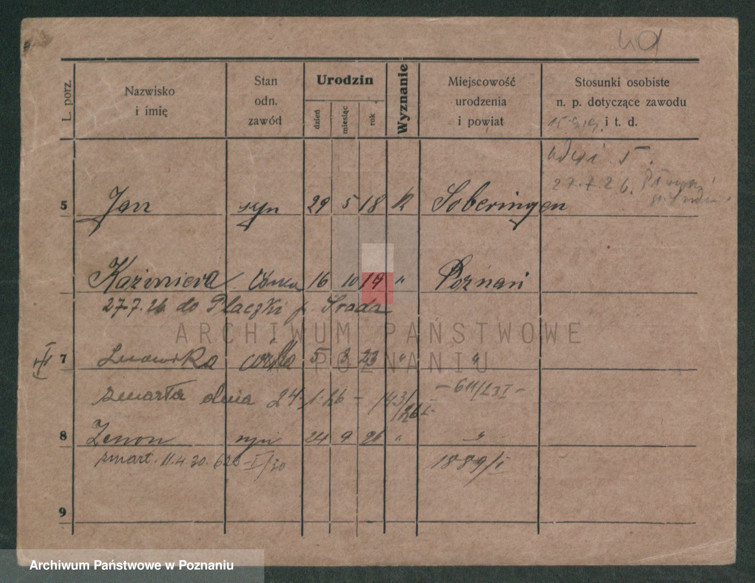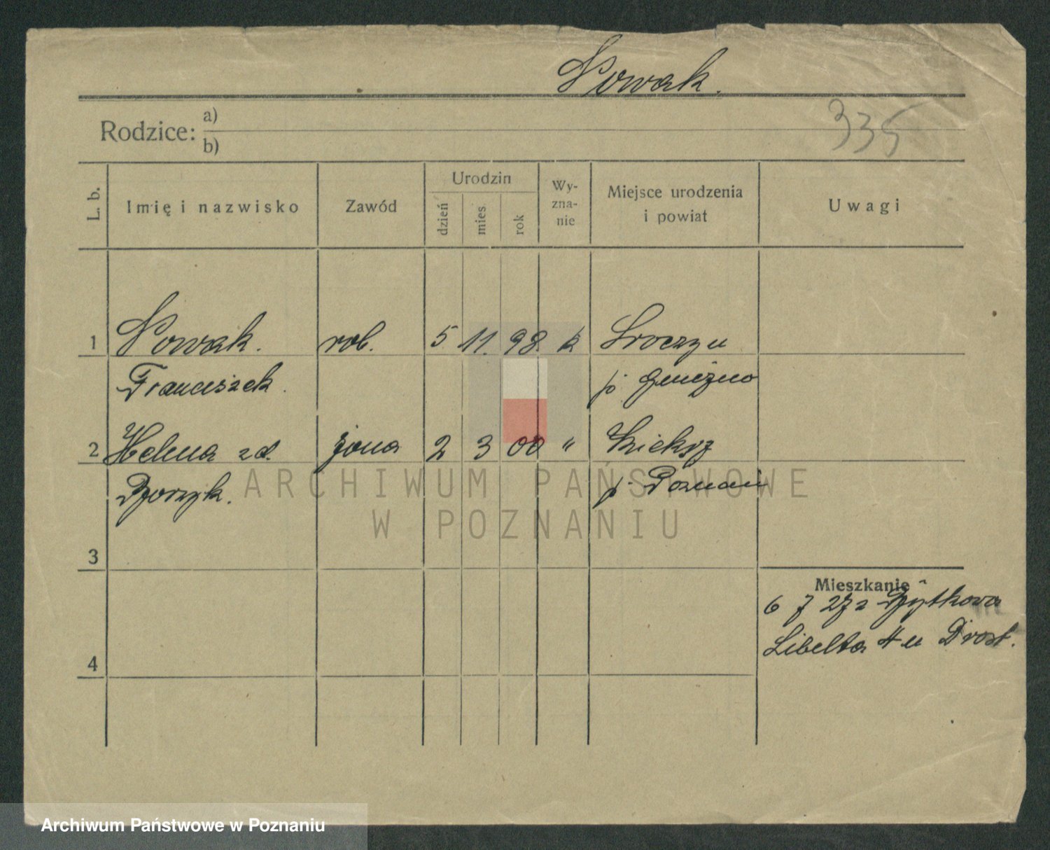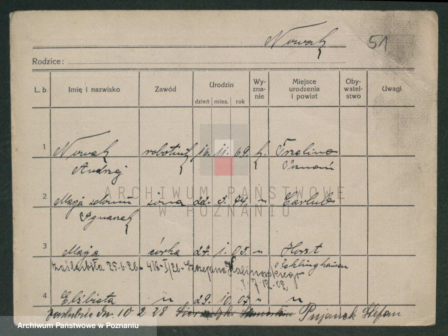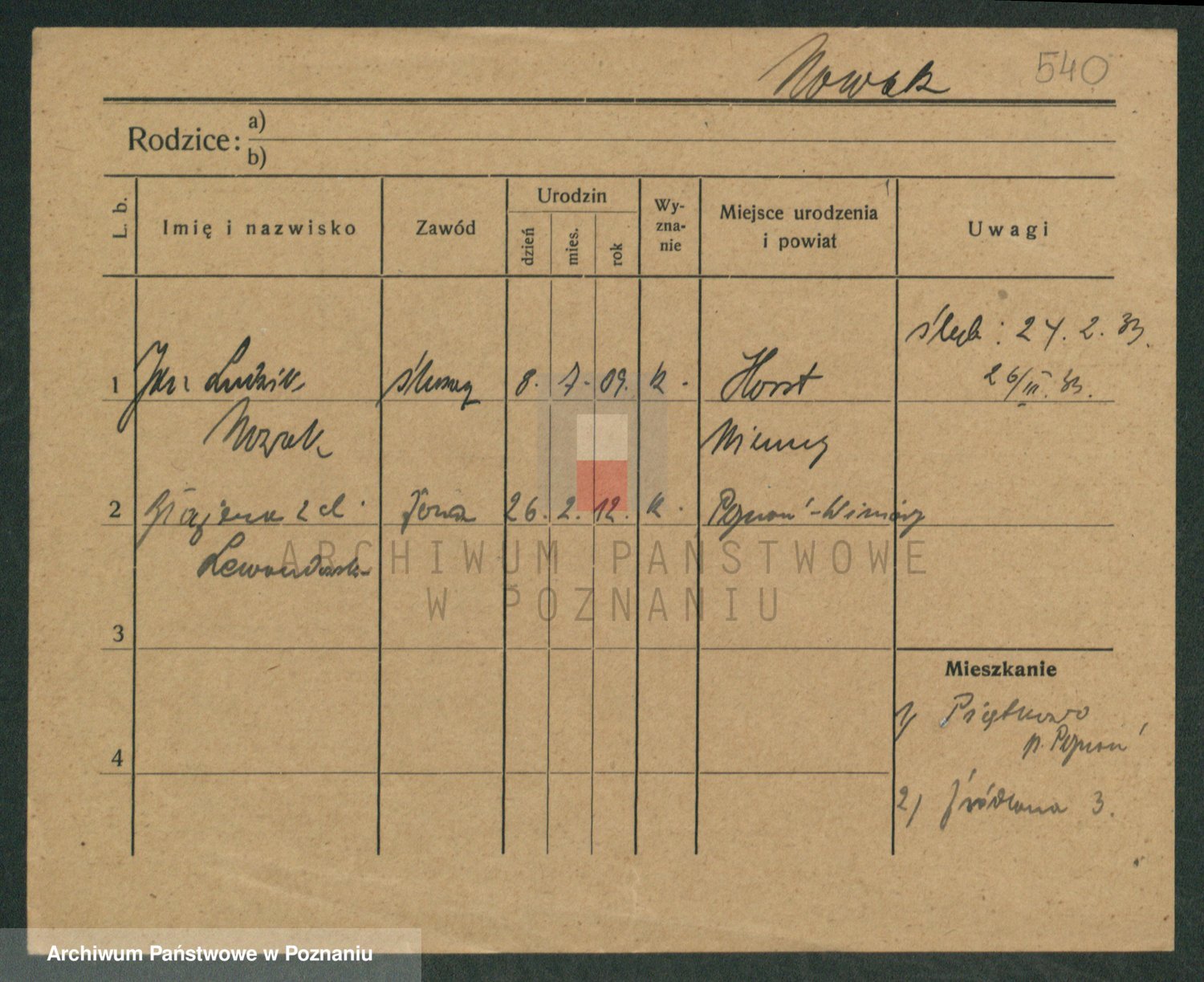 Podgląd karty osobowej dostępny jest po kliknięciu na nazwisko lub ikonkę karty. Można dokonywać powiększenia (ikony na górze) lub przechodzić między kolejnymi skanami (strzałki po bokach).