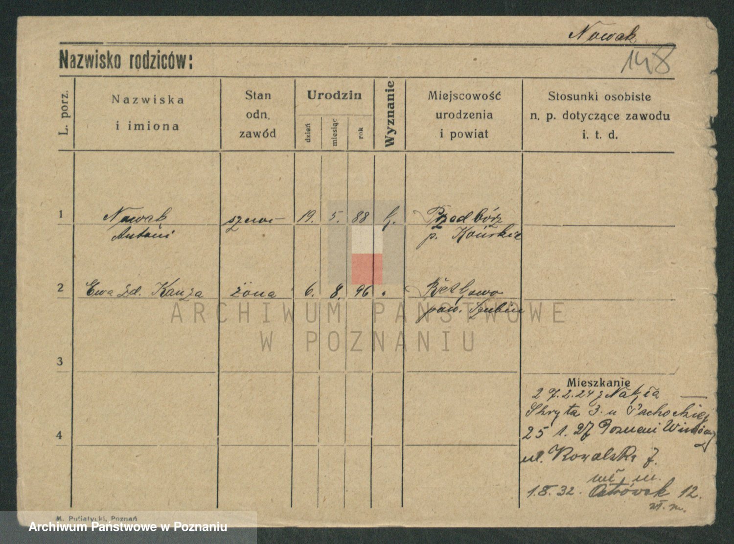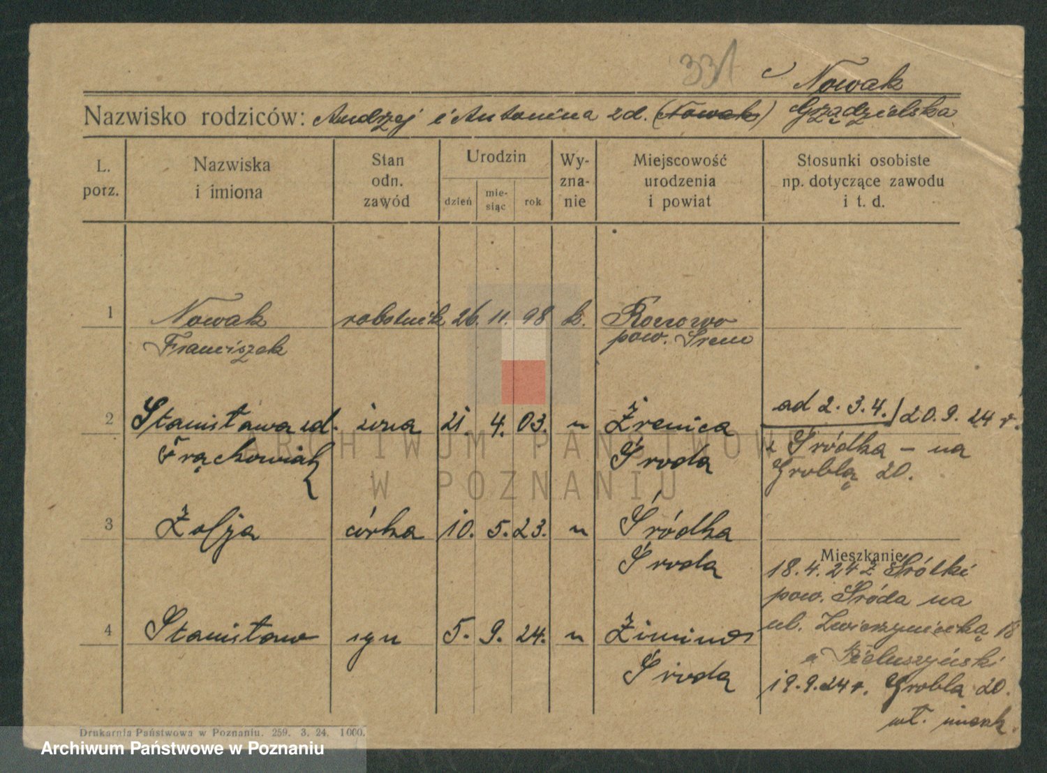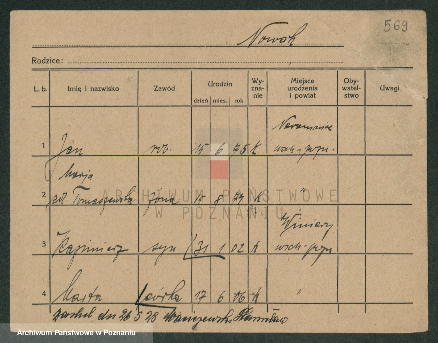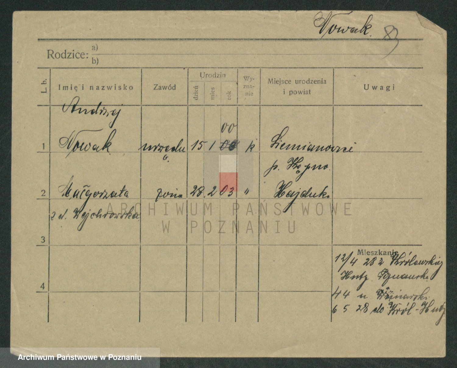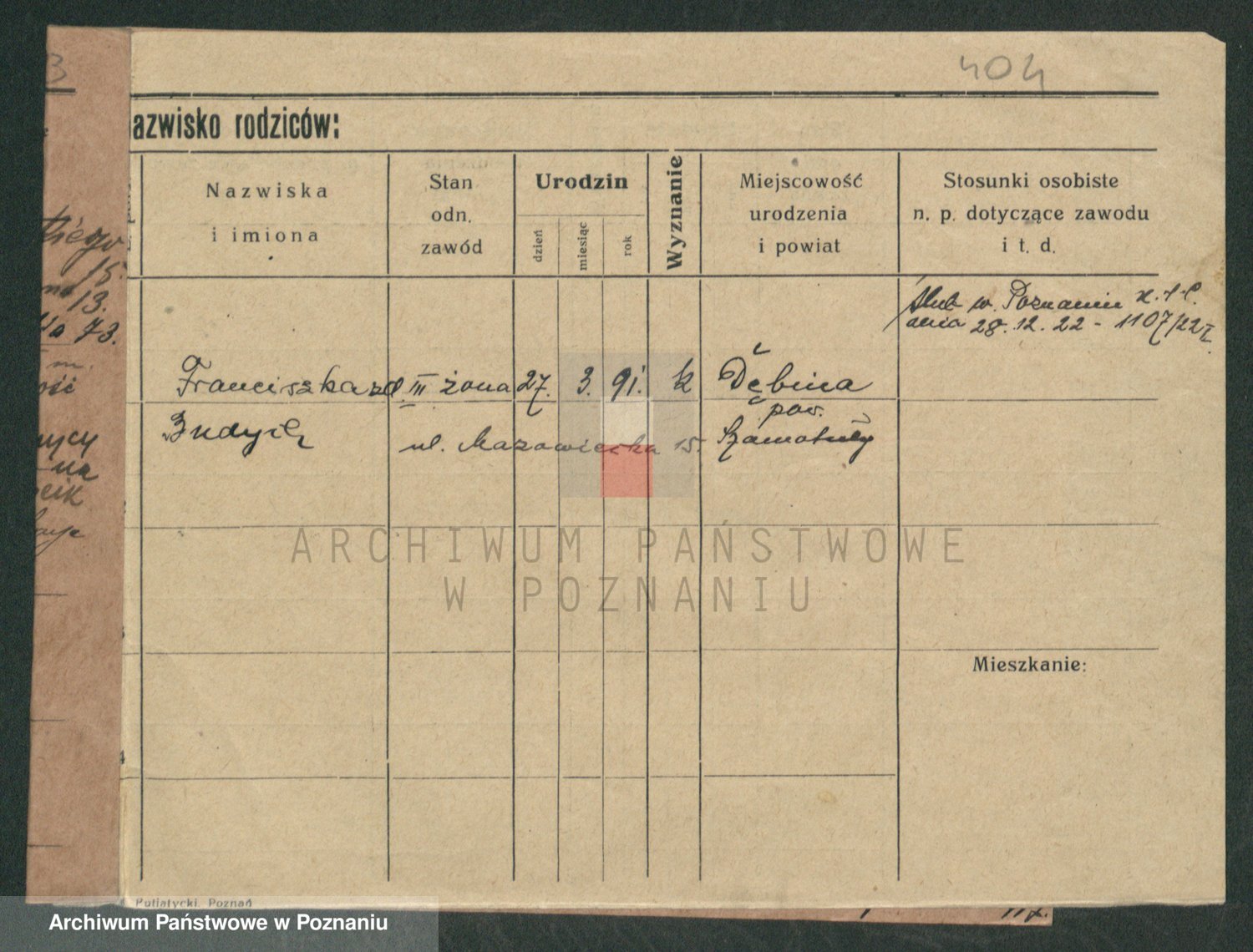 Podgląd karty osobowej dostępny jest po kliknięciu na nazwisko lub ikonkę karty. Można dokonywać powiększenia (ikony na górze) lub przechodzić między kolejnymi skanami (strzałki po bokach).