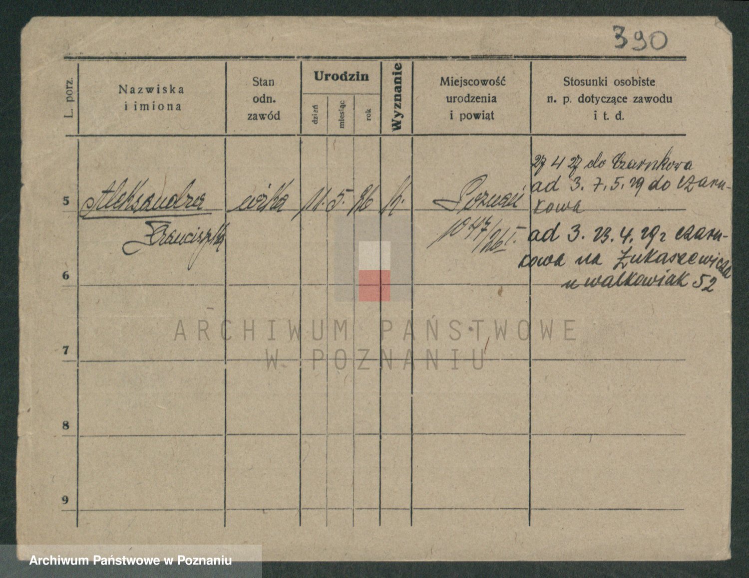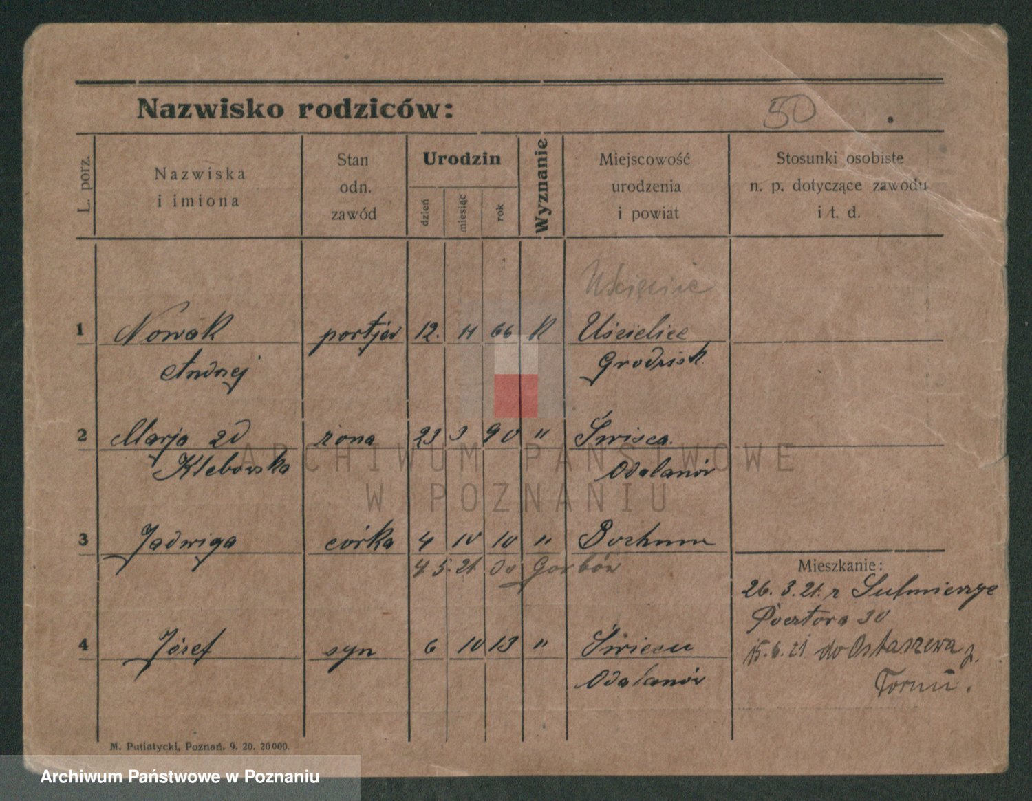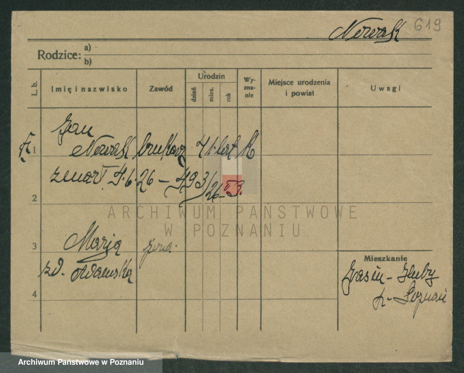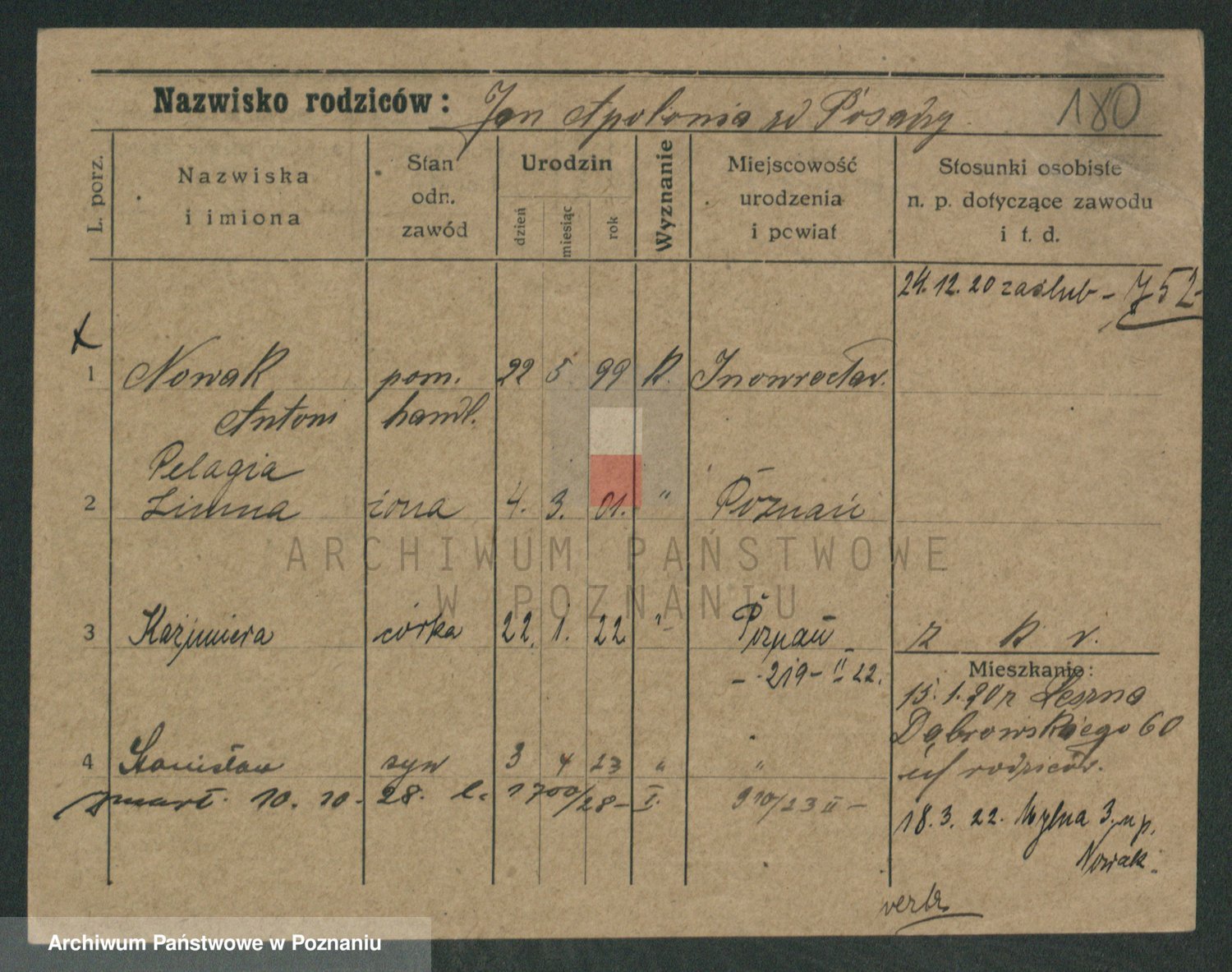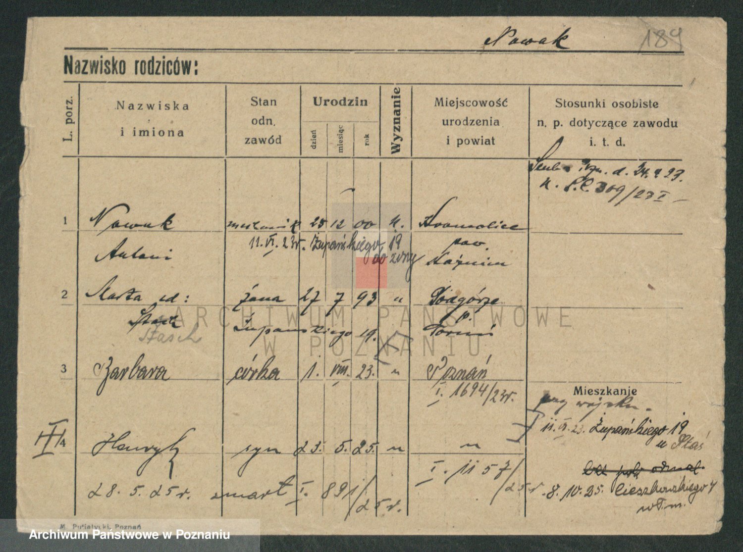 Podgląd karty osobowej dostępny jest po kliknięciu na nazwisko lub ikonkę karty. Można dokonywać powiększenia (ikony na górze) lub przechodzić między kolejnymi skanami (strzałki po bokach).