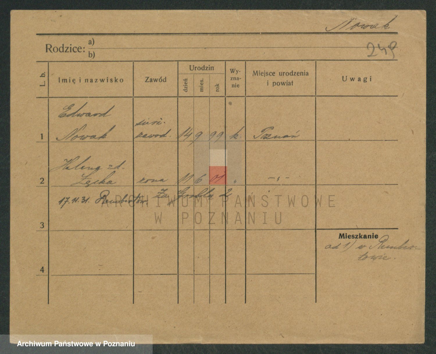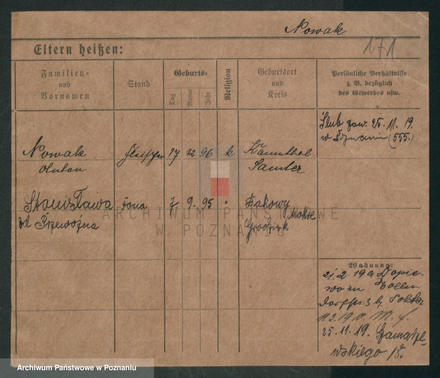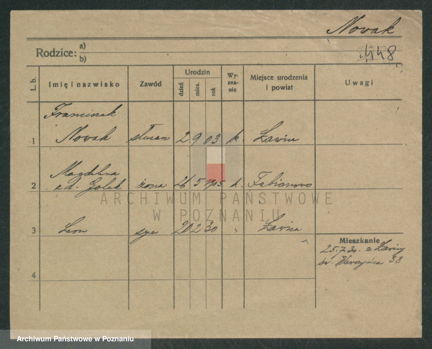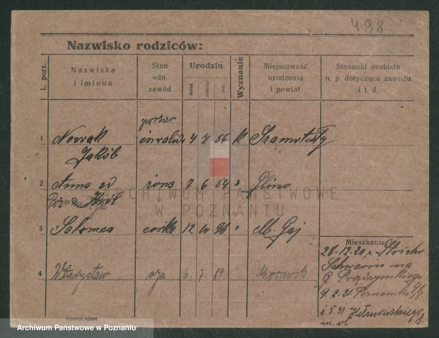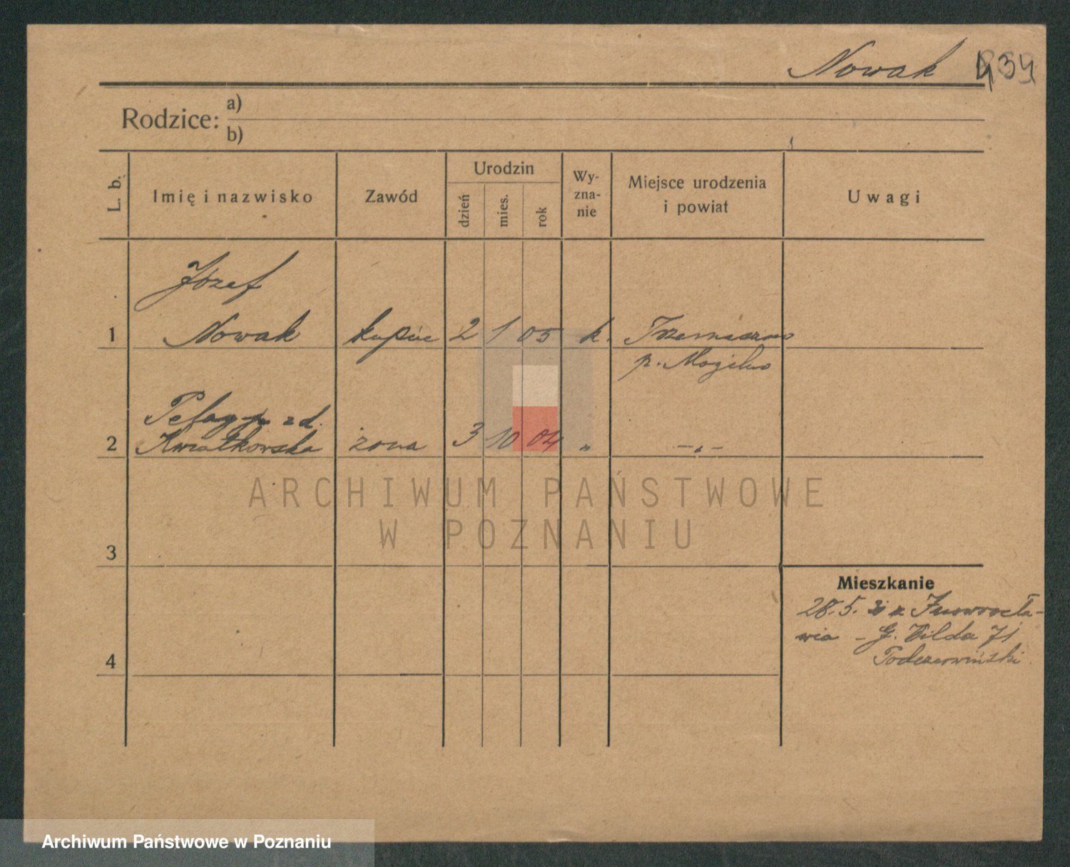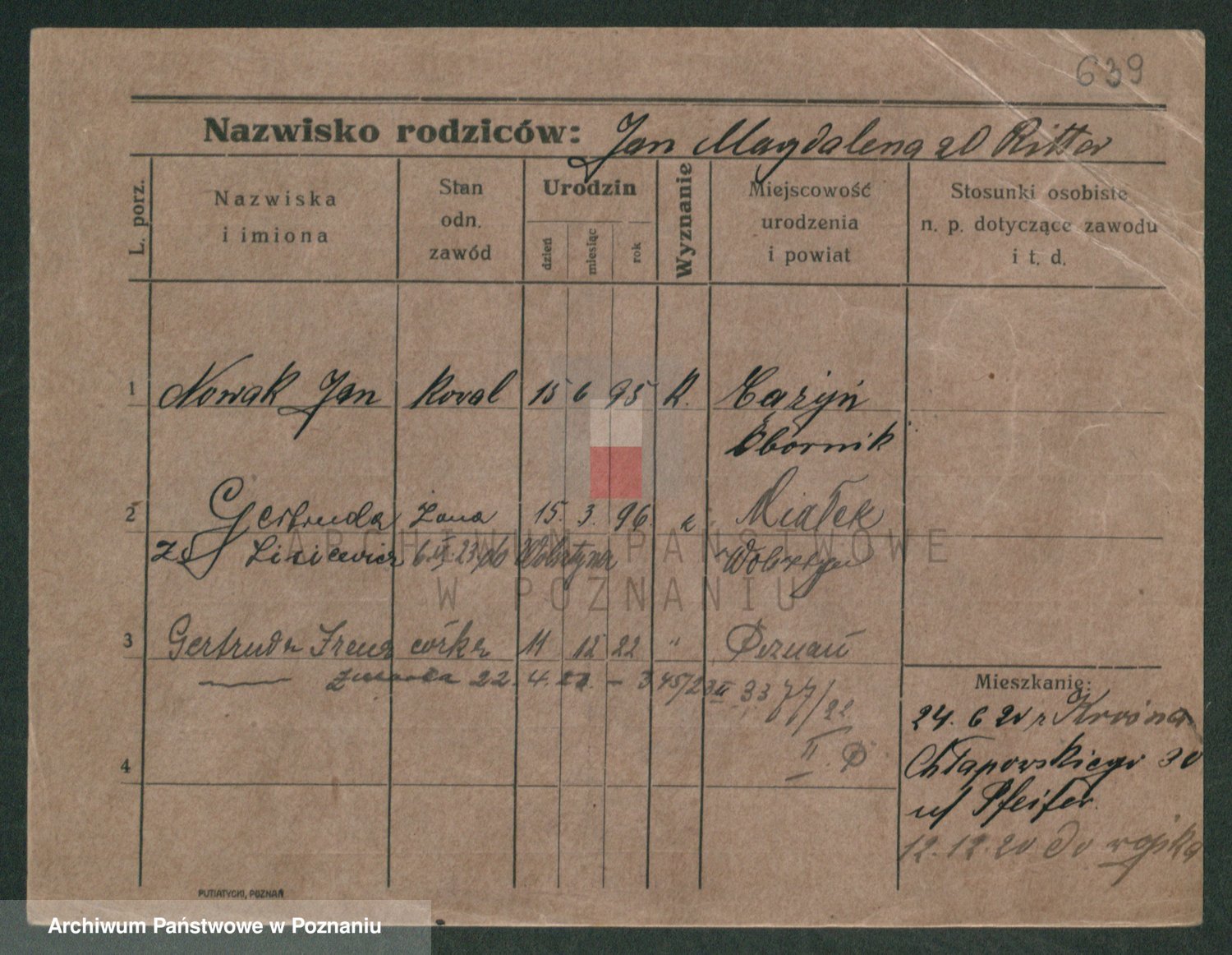 Podgląd karty osobowej dostępny jest po kliknięciu na nazwisko lub ikonkę karty. Można dokonywać powiększenia (ikony na górze) lub przechodzić między kolejnymi skanami (strzałki po bokach).