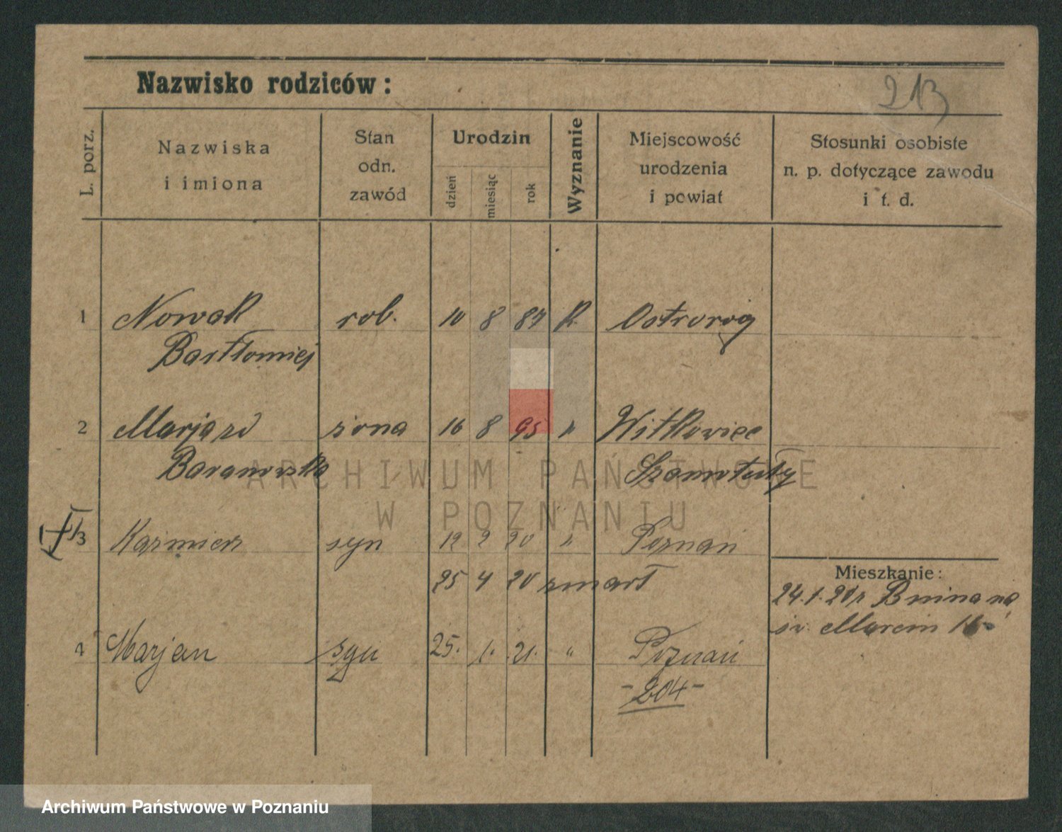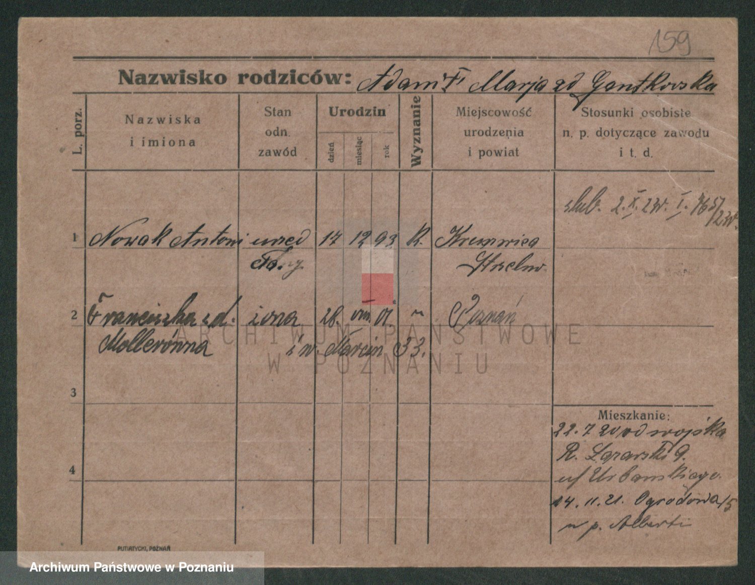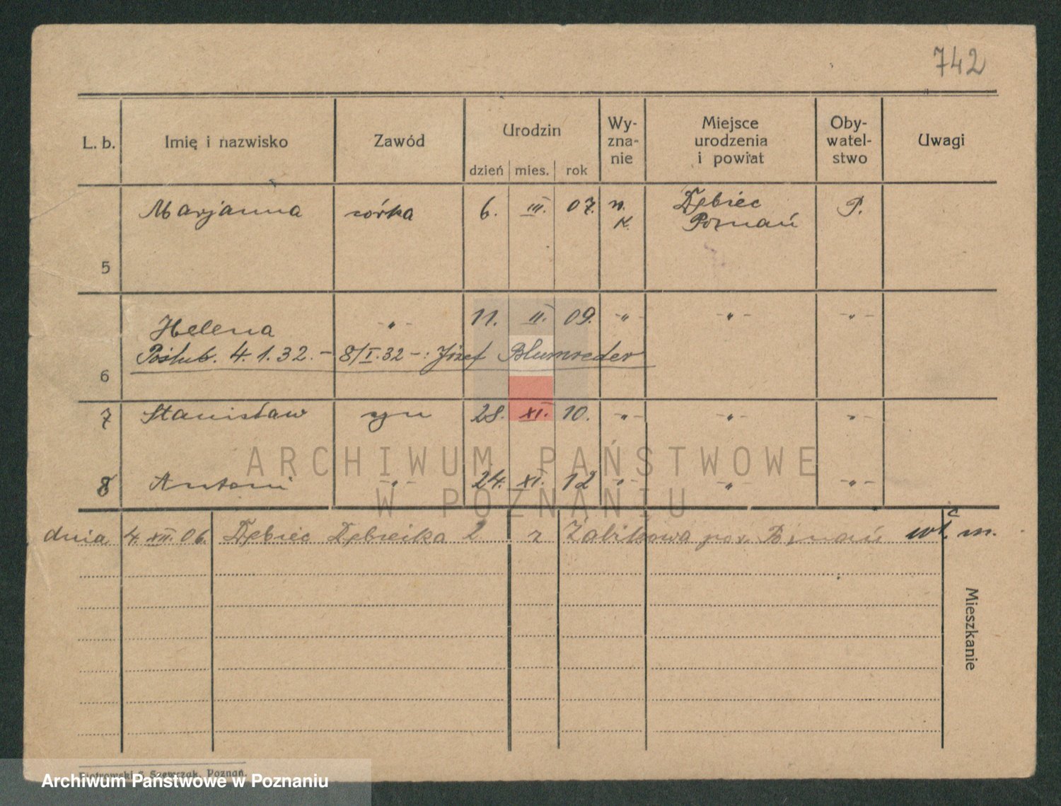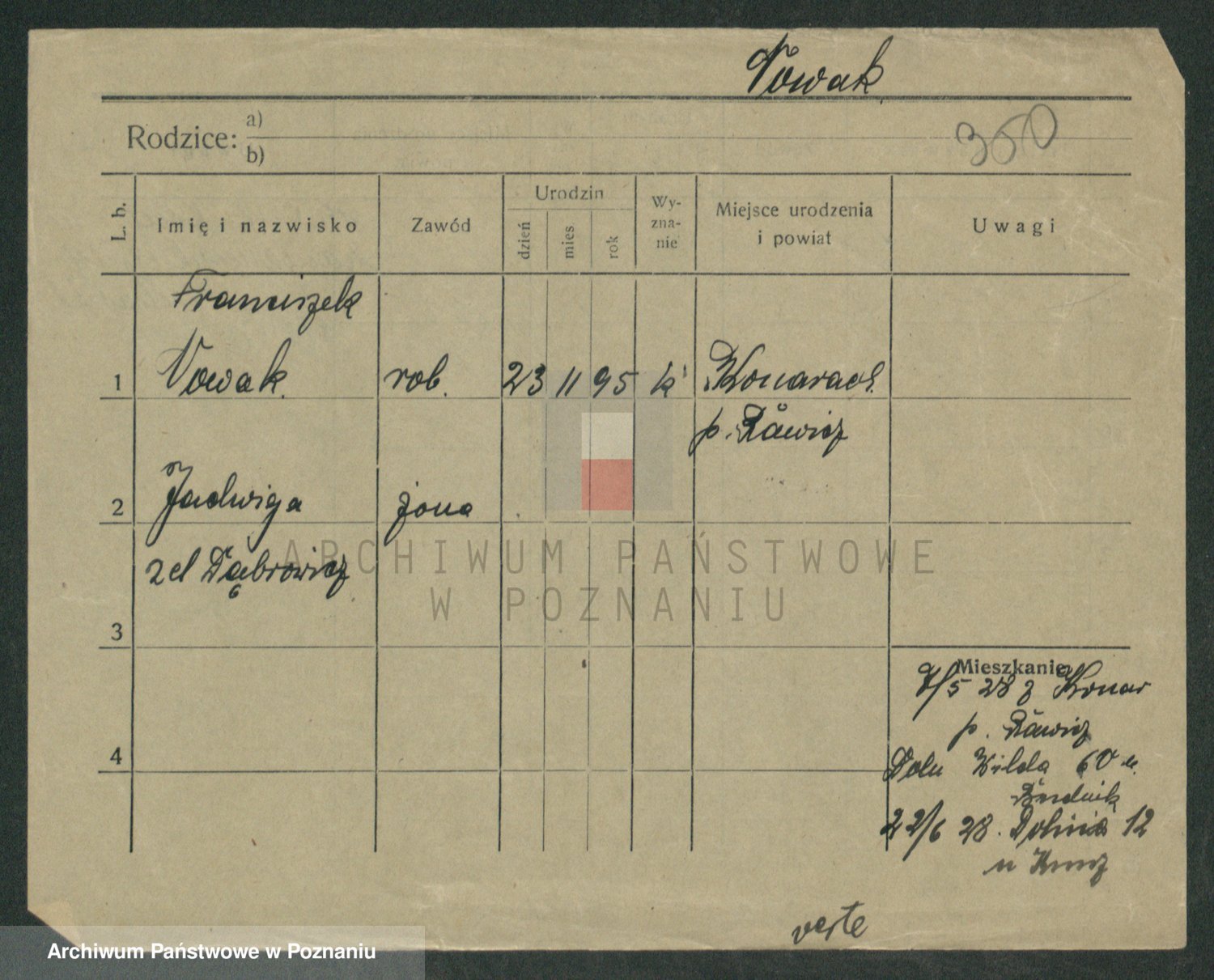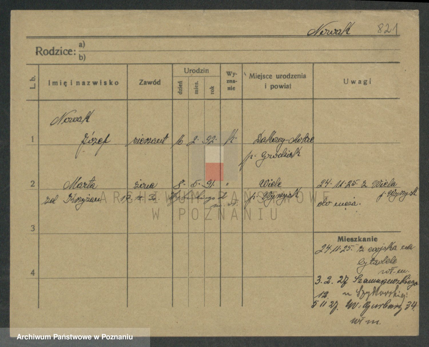 Podgląd karty osobowej dostępny jest po kliknięciu na nazwisko lub ikonkę karty. Można dokonywać powiększenia (ikony na górze) lub przechodzić między kolejnymi skanami (strzałki po bokach).
