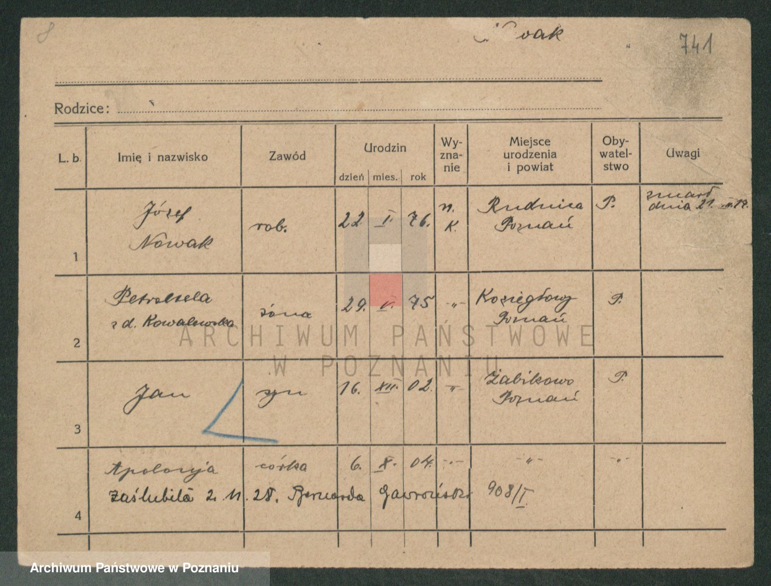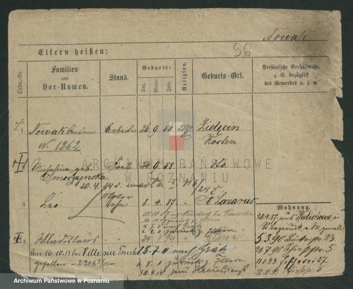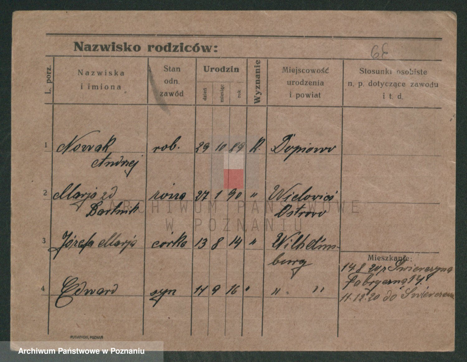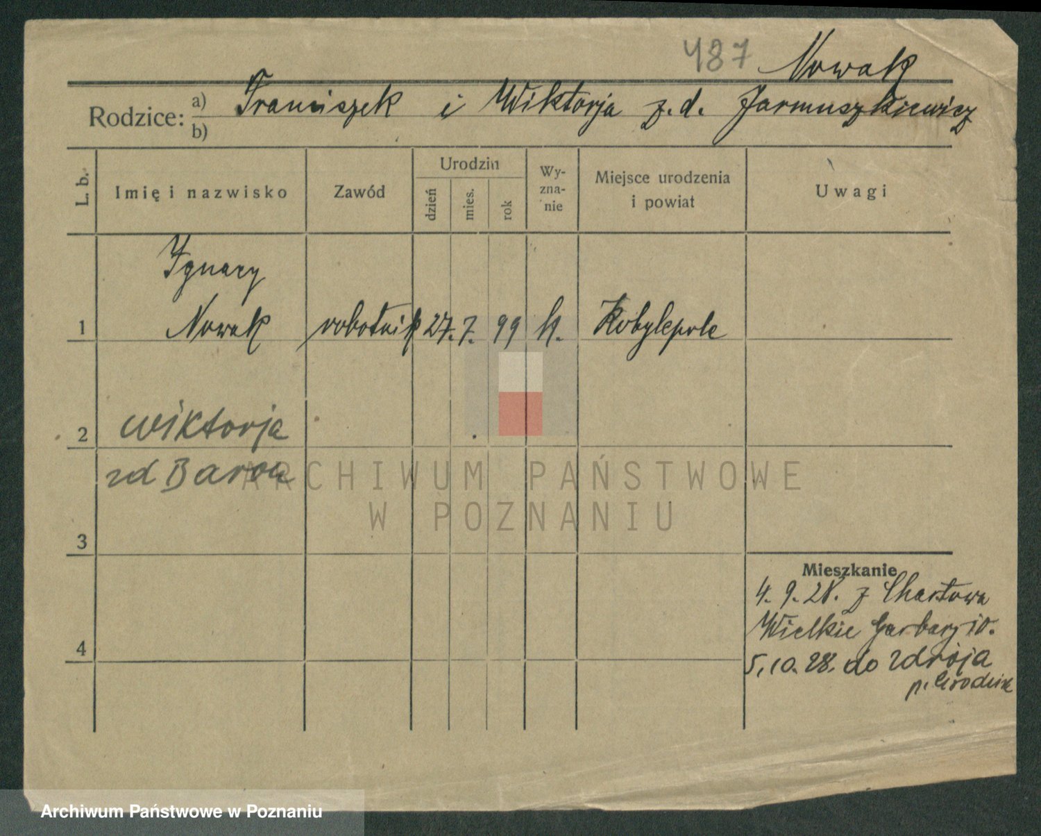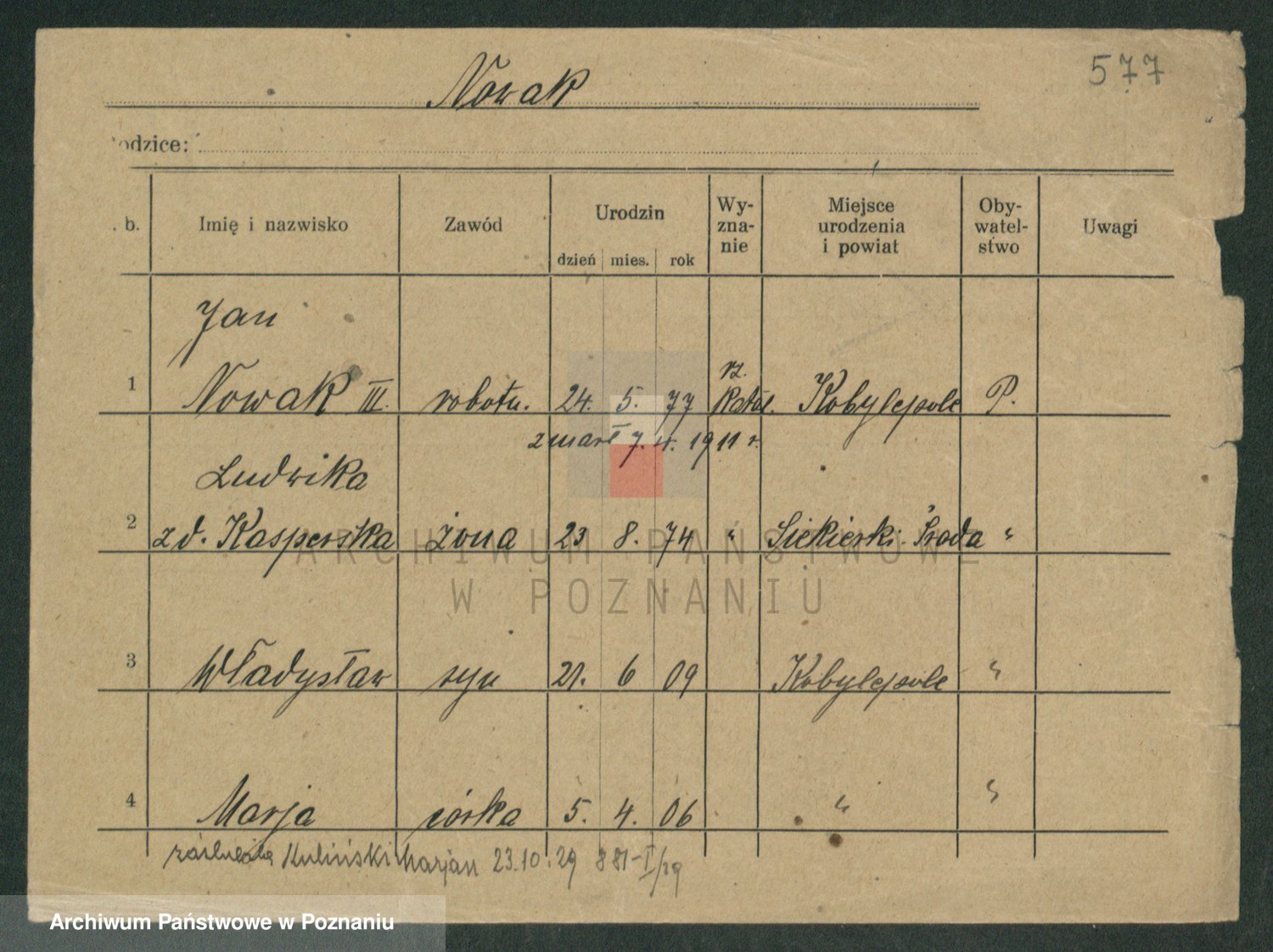 Podgląd karty osobowej dostępny jest po kliknięciu na nazwisko lub ikonkę karty. Można dokonywać powiększenia (ikony na górze) lub przechodzić między kolejnymi skanami (strzałki po bokach).