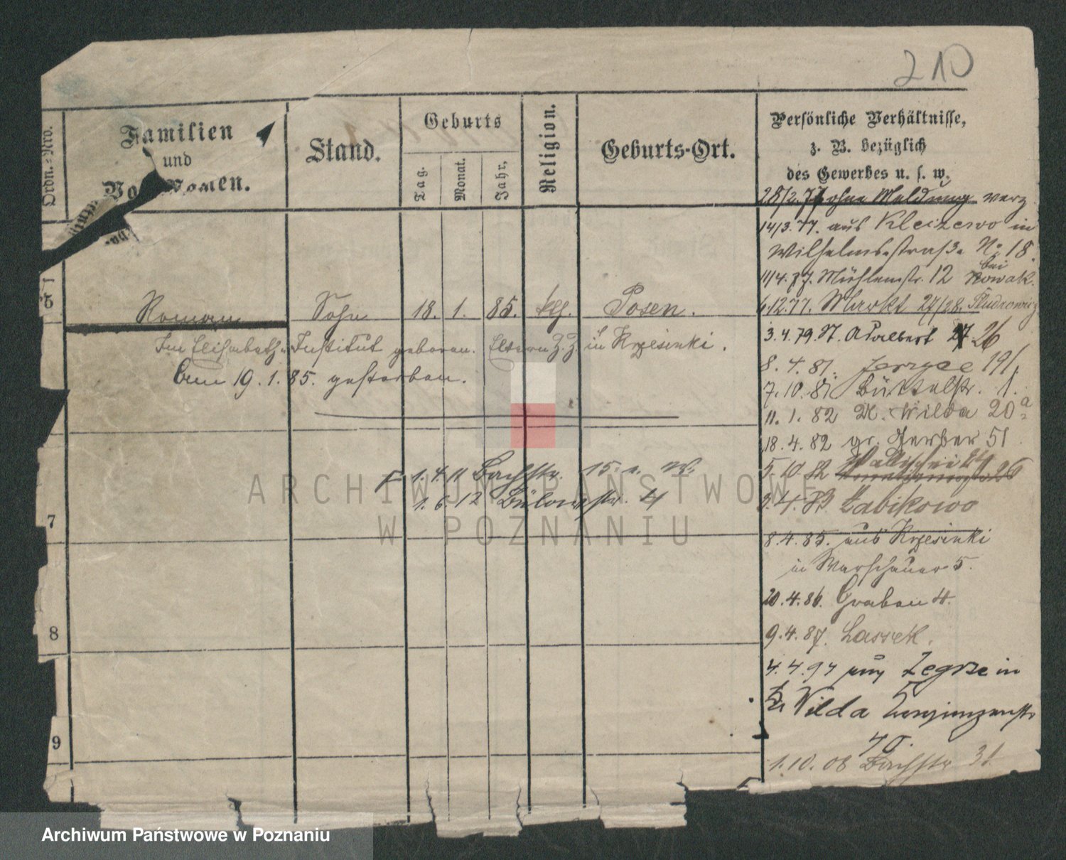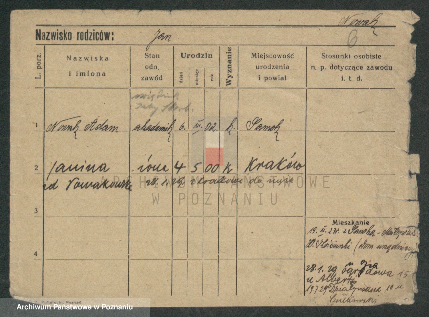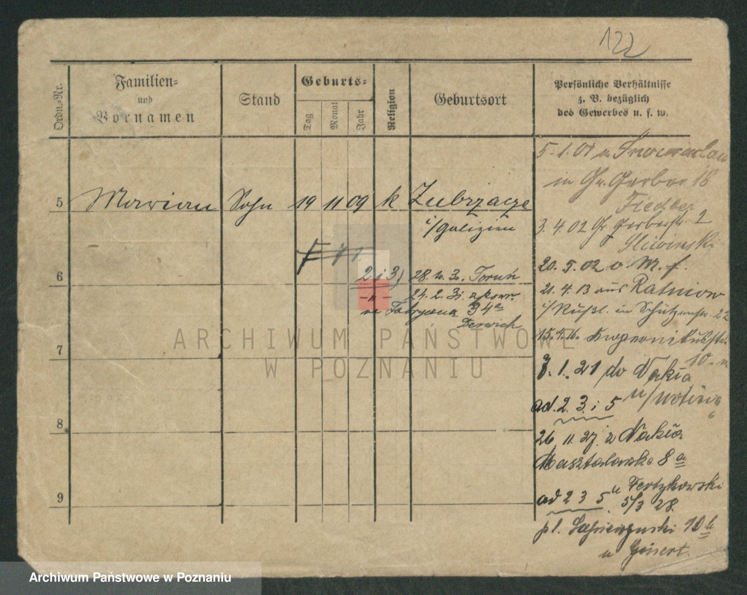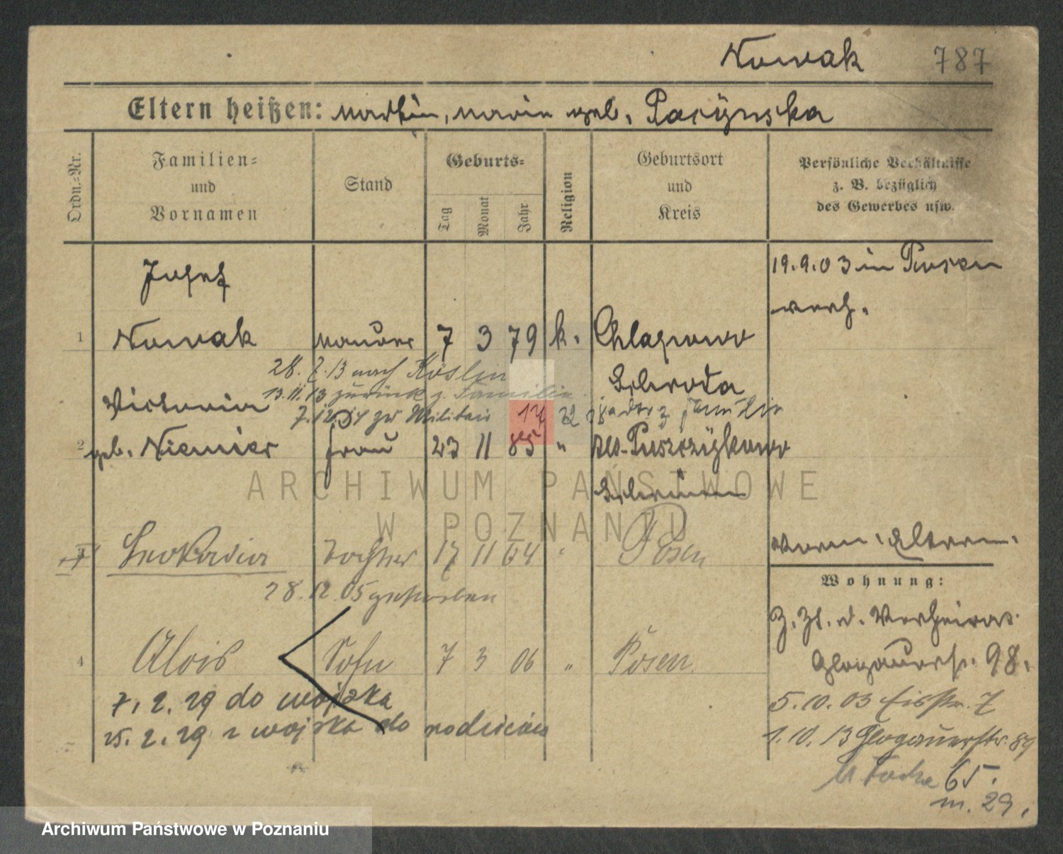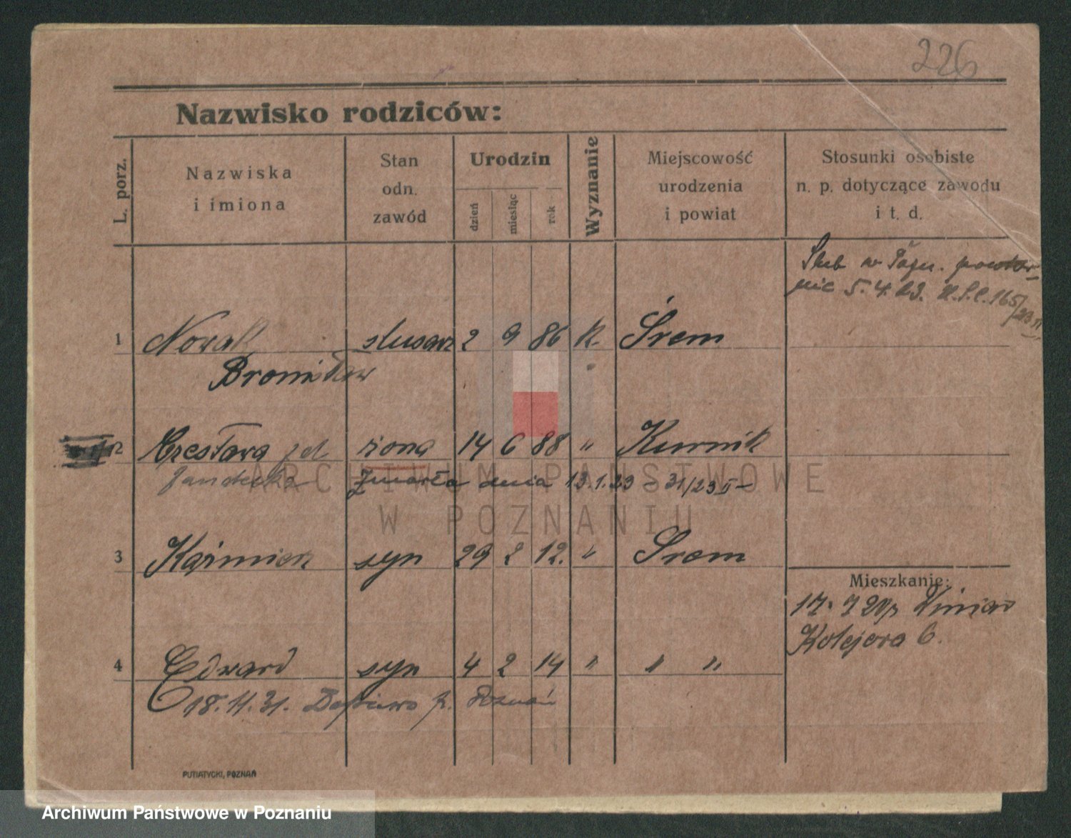 Podgląd karty osobowej dostępny jest po kliknięciu na nazwisko lub ikonkę karty. Można dokonywać powiększenia (ikony na górze) lub przechodzić między kolejnymi skanami (strzałki po bokach).
