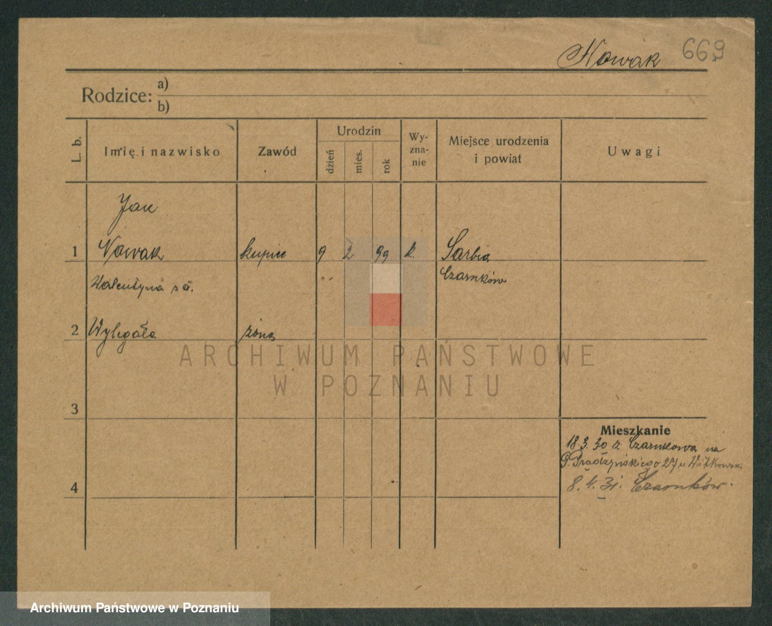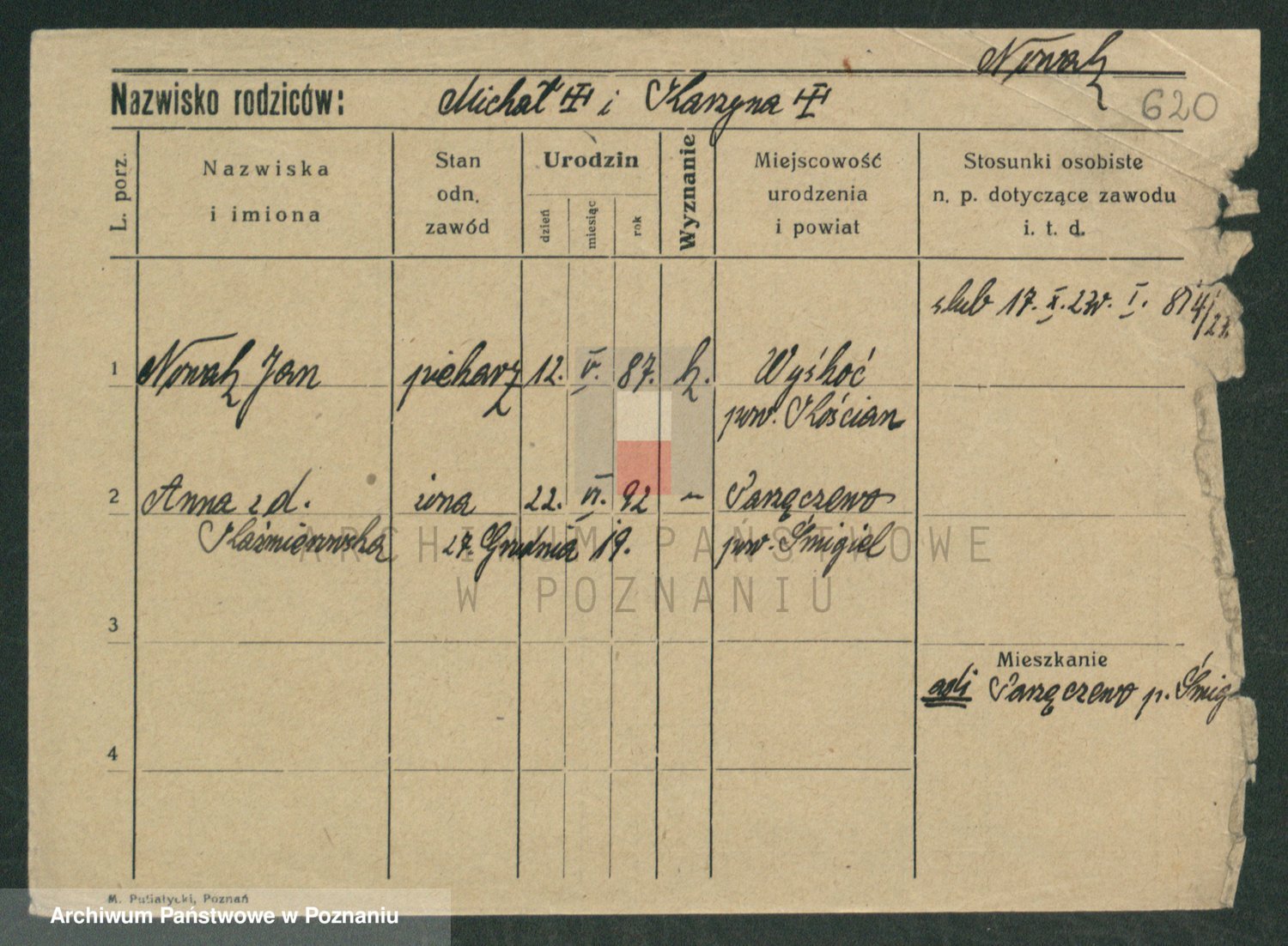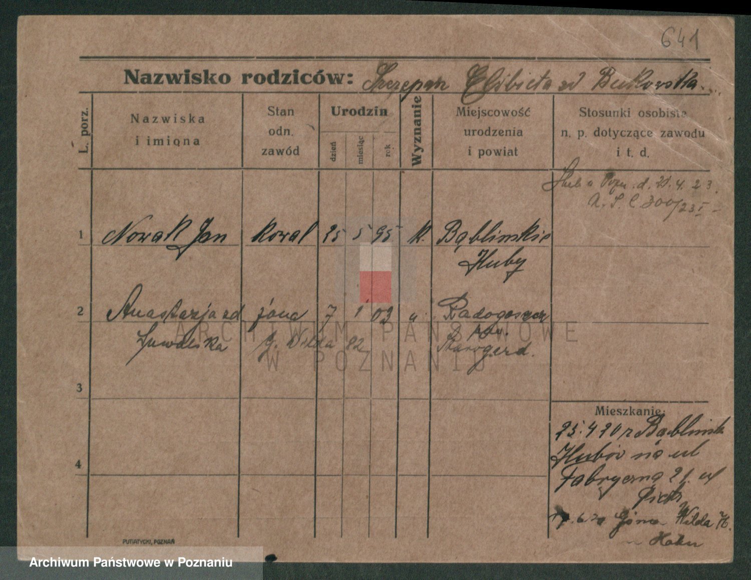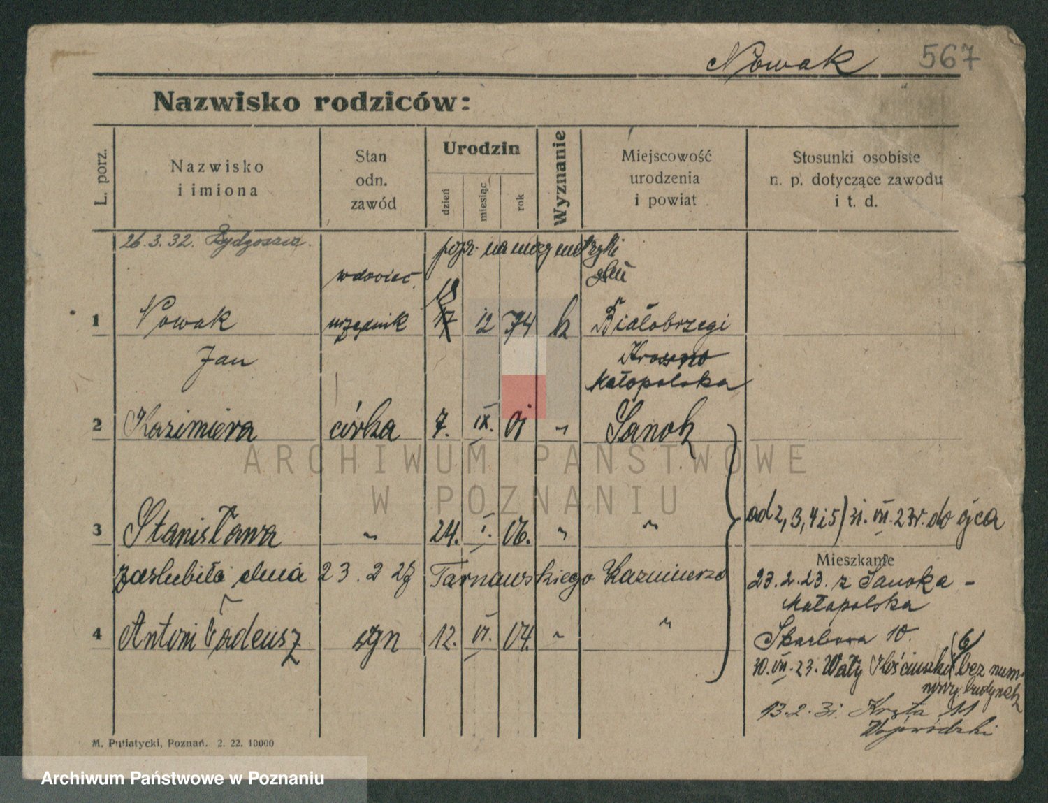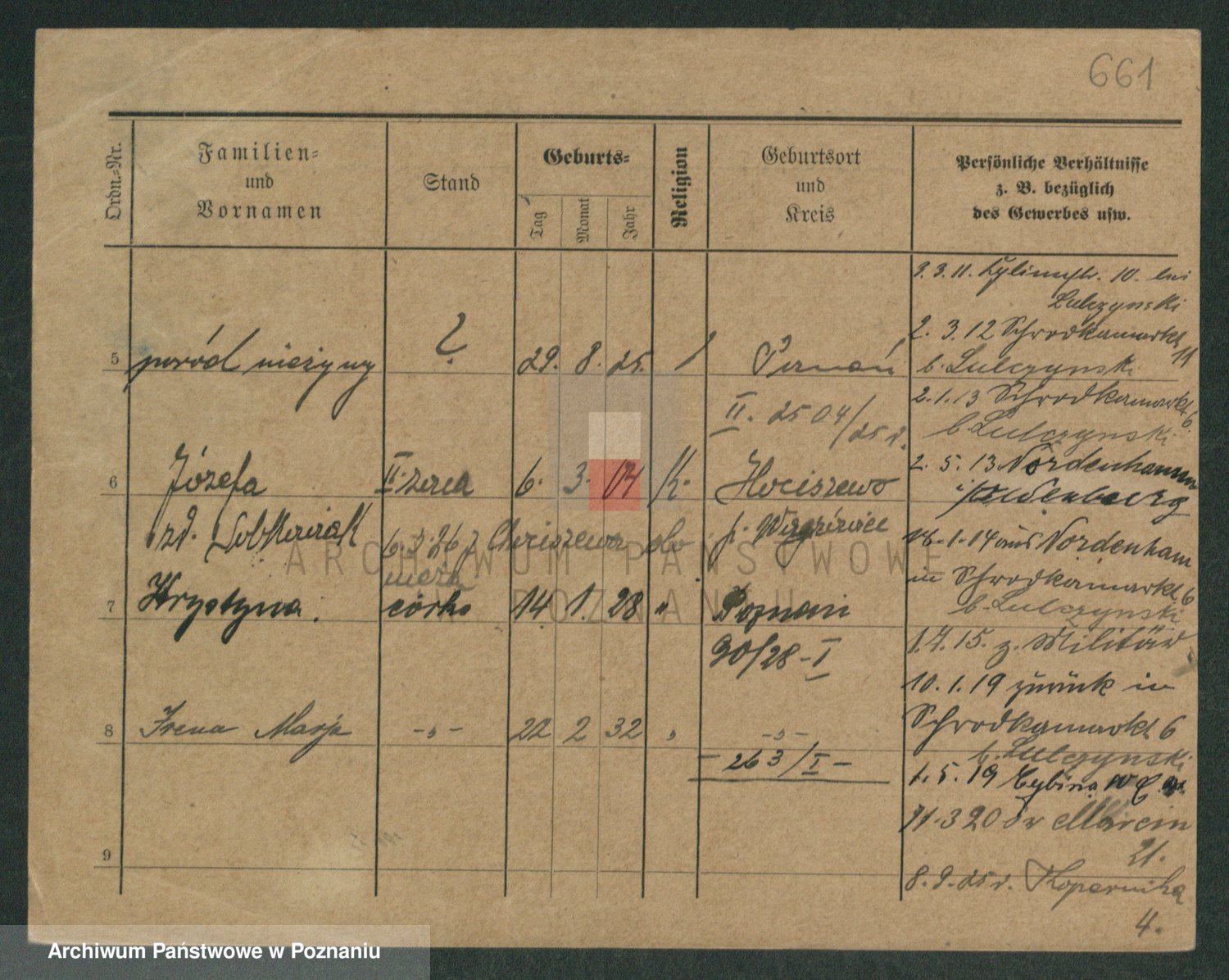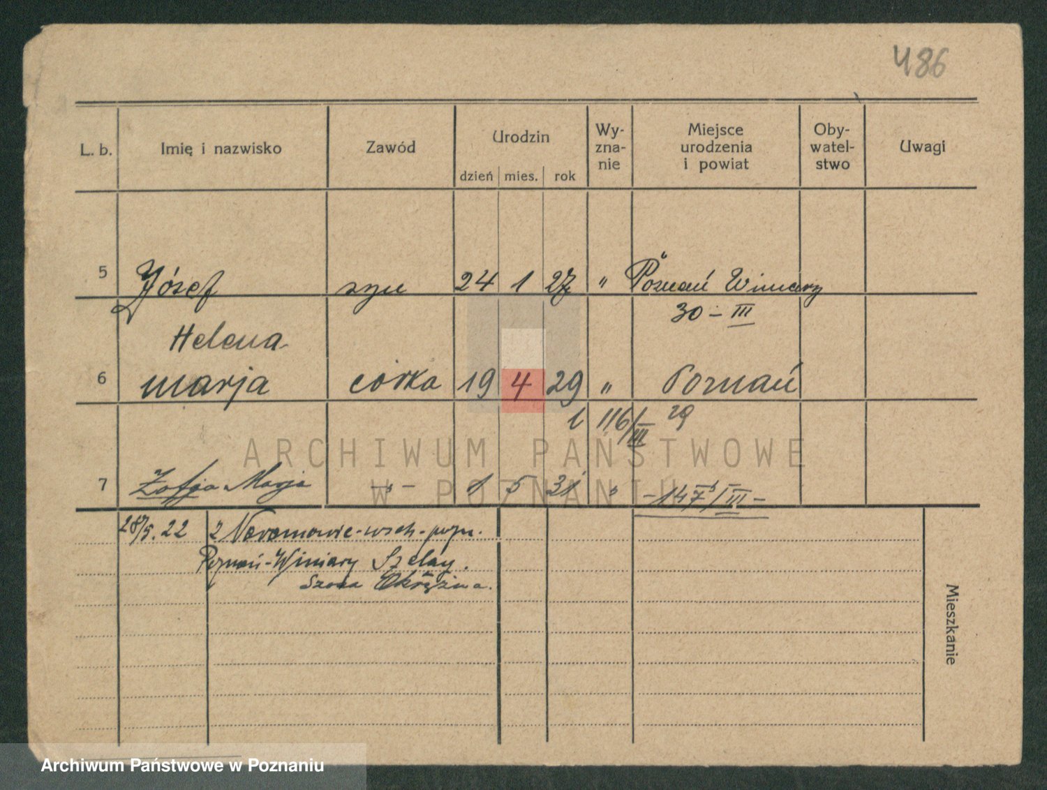 Podgląd karty osobowej dostępny jest po kliknięciu na nazwisko lub ikonkę karty. Można dokonywać powiększenia (ikony na górze) lub przechodzić między kolejnymi skanami (strzałki po bokach).