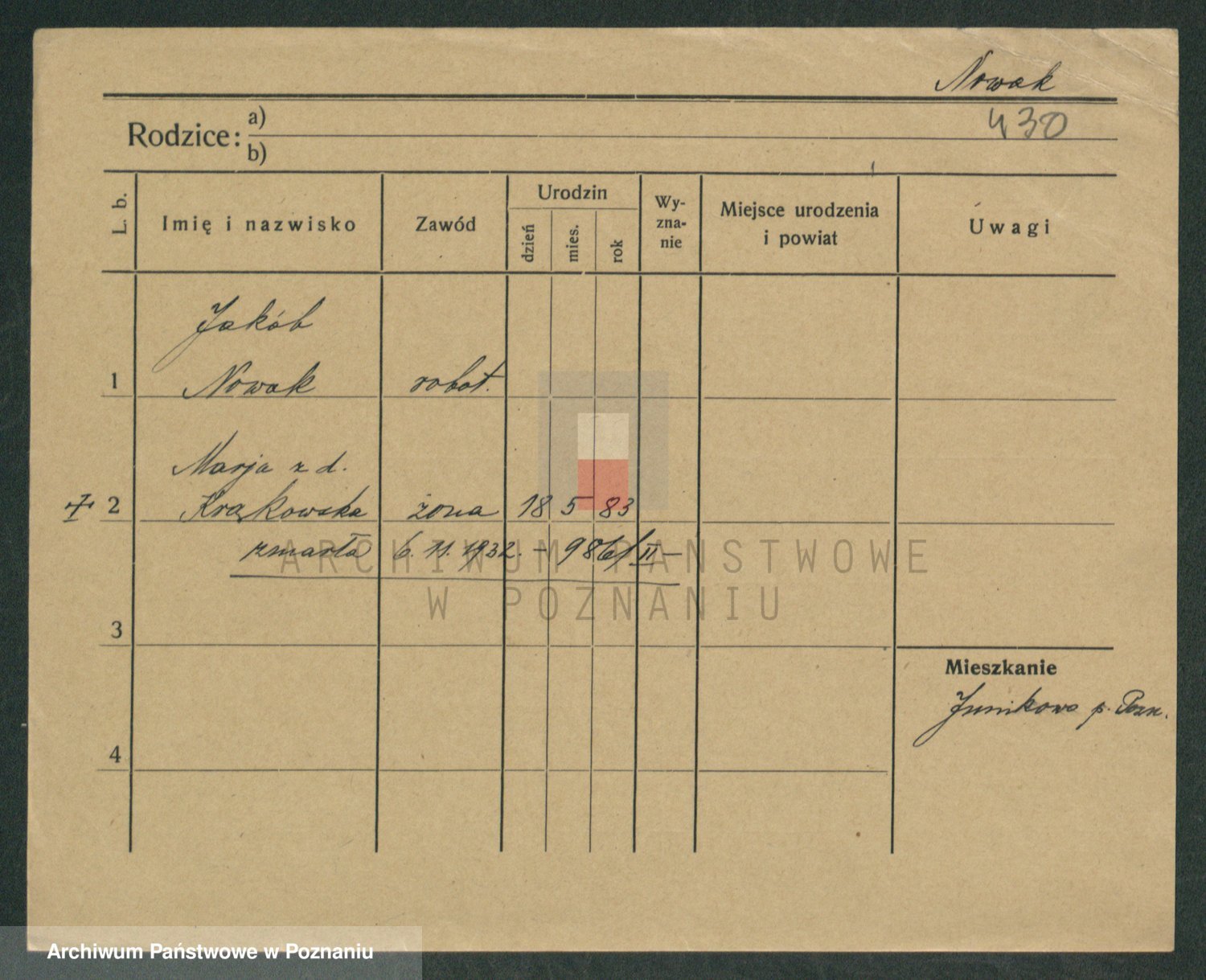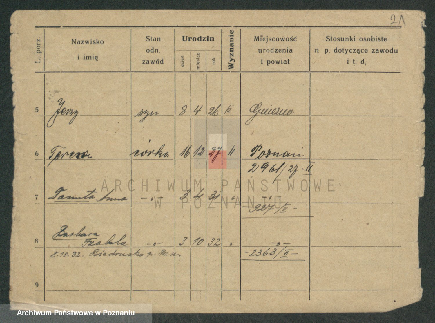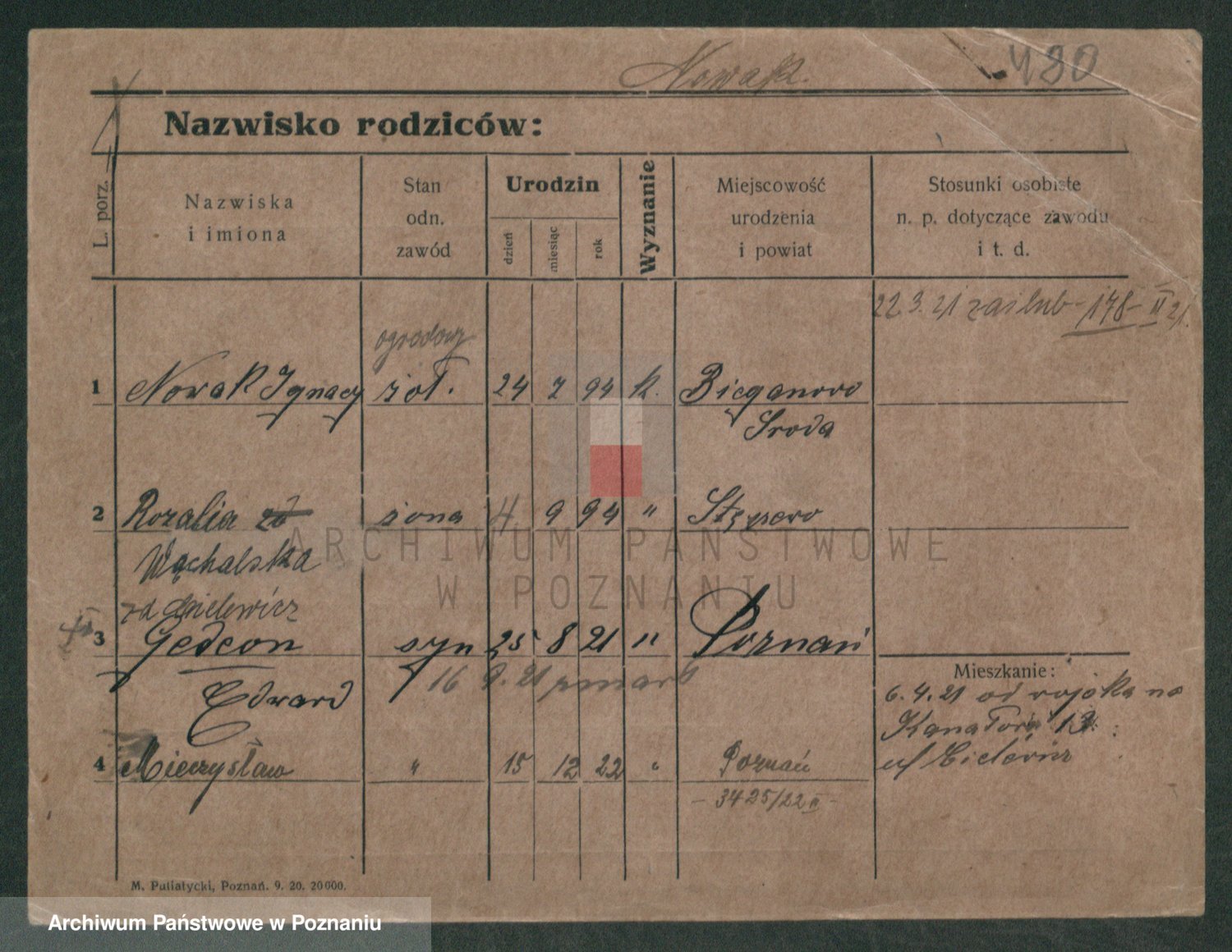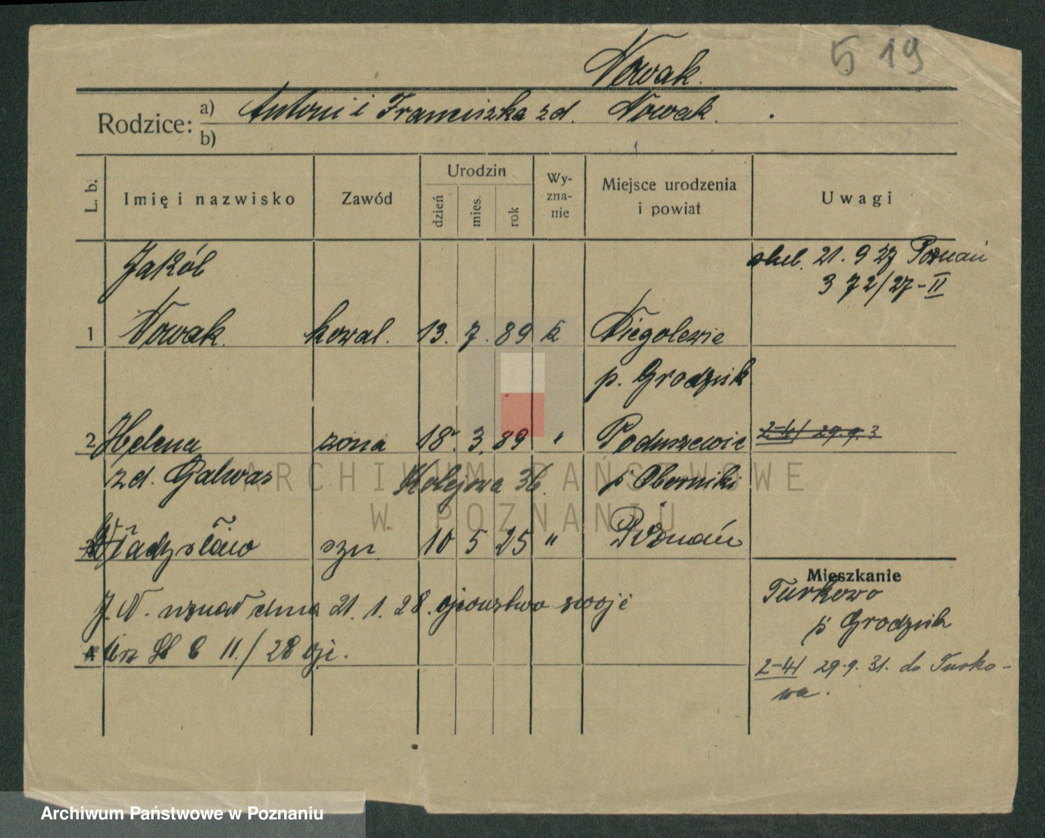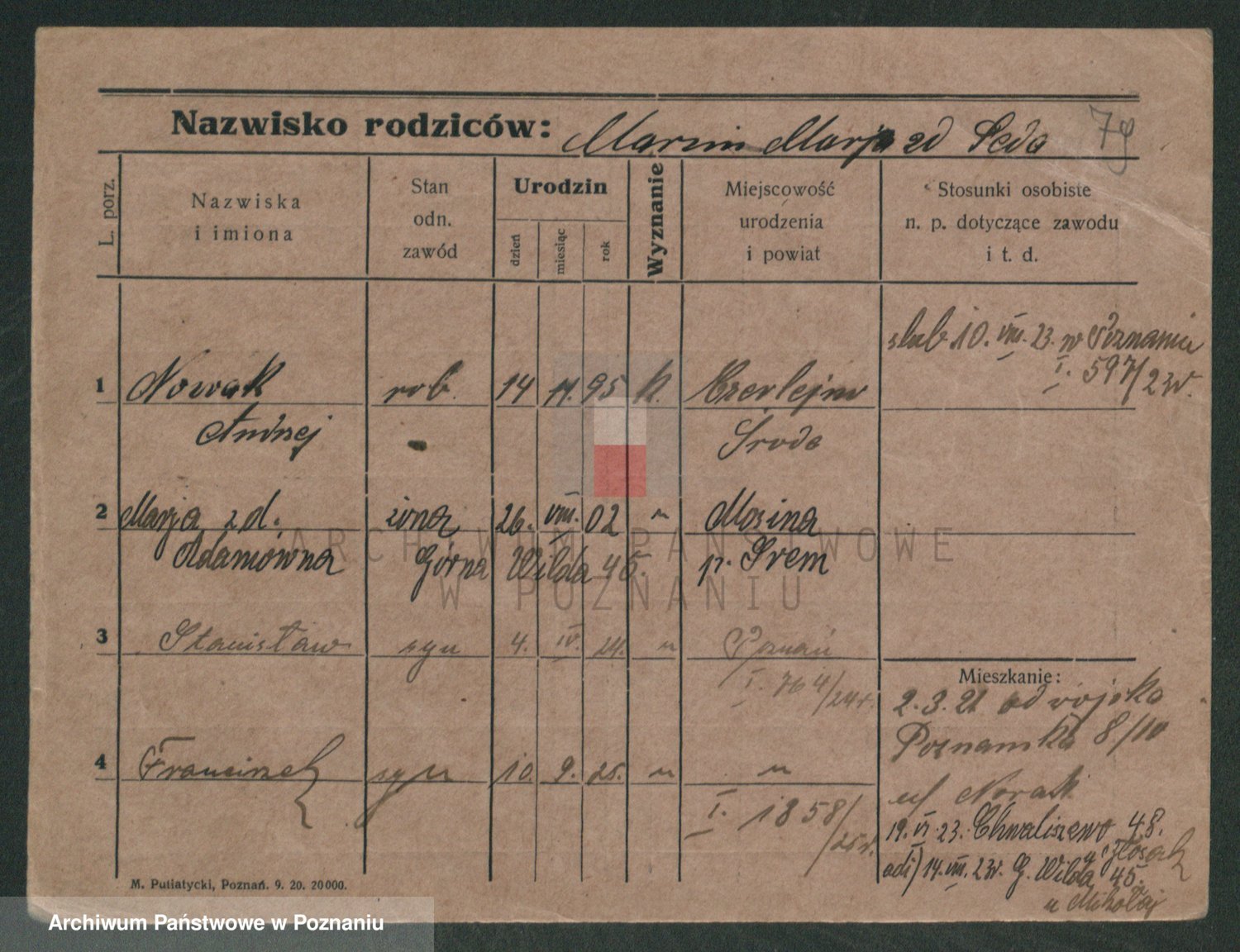 Podgląd karty osobowej dostępny jest po kliknięciu na nazwisko lub ikonkę karty. Można dokonywać powiększenia (ikony na górze) lub przechodzić między kolejnymi skanami (strzałki po bokach).