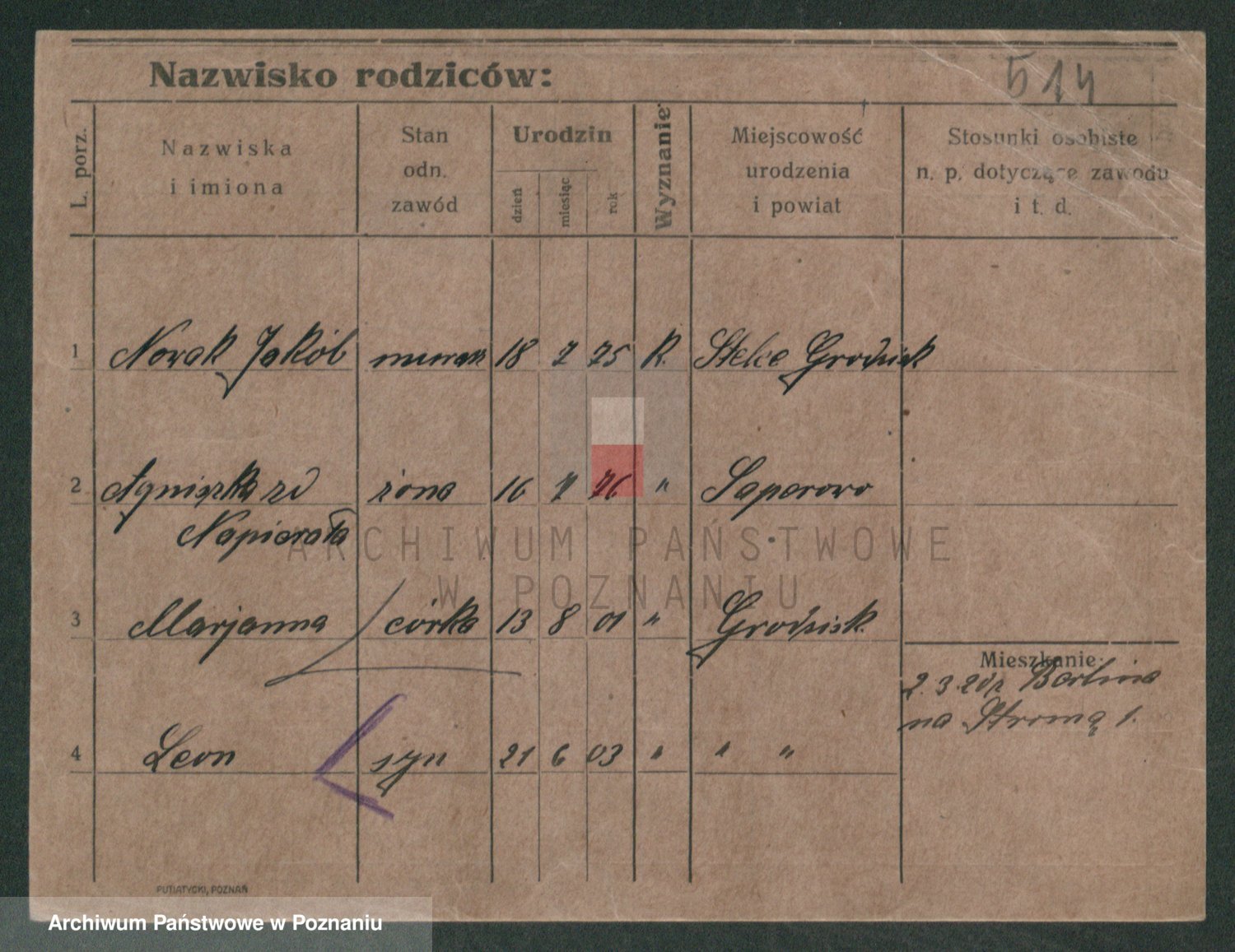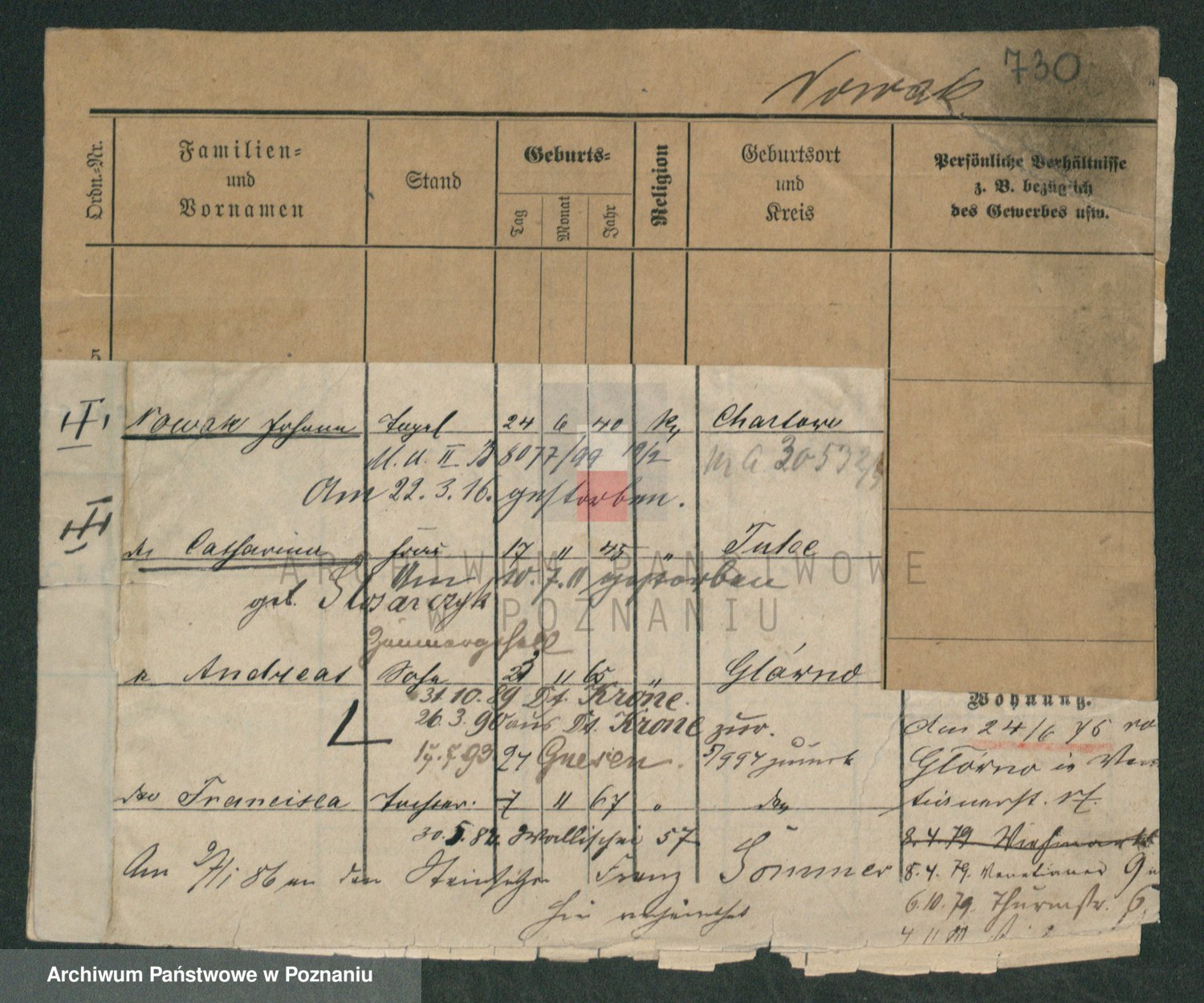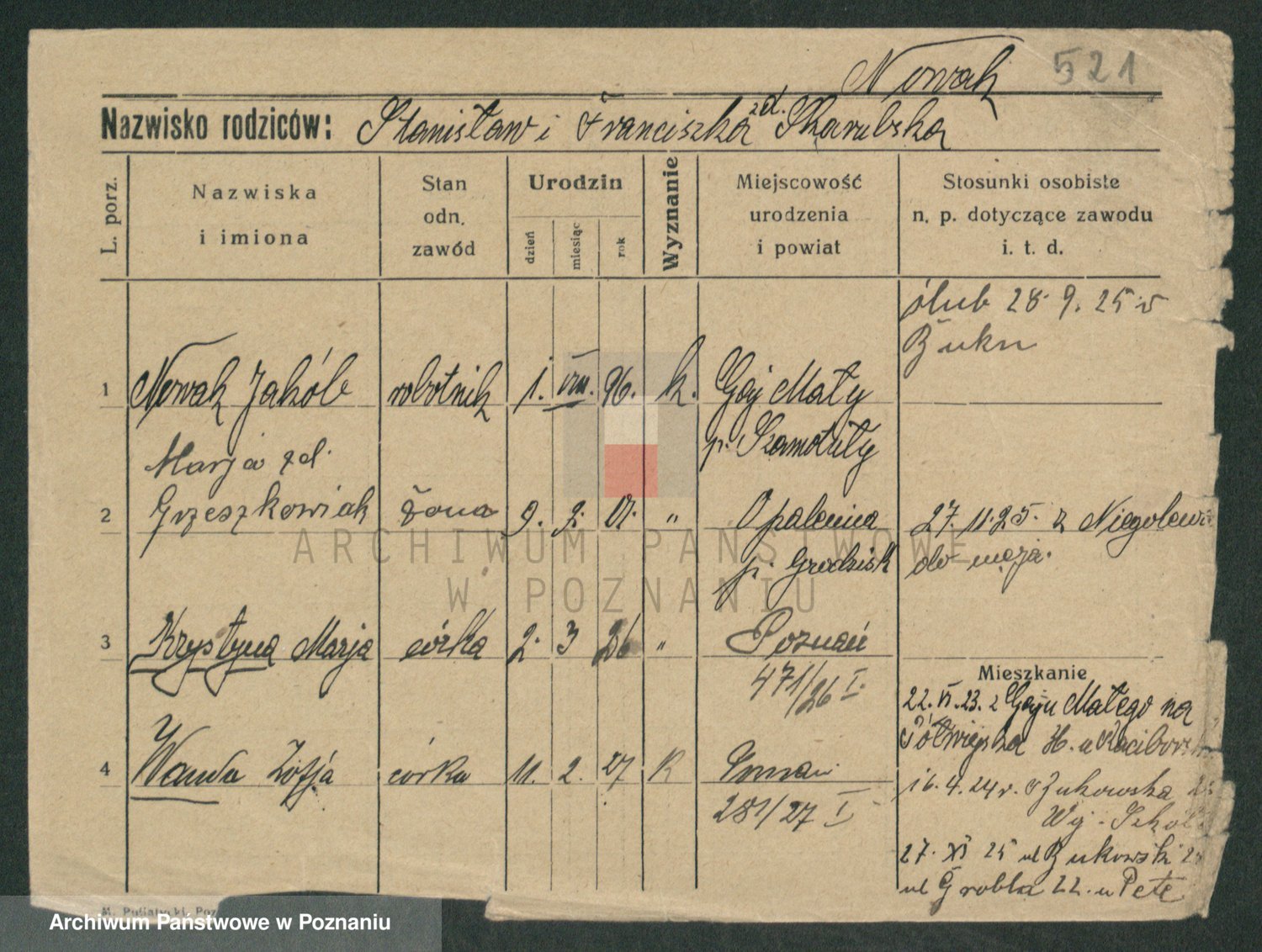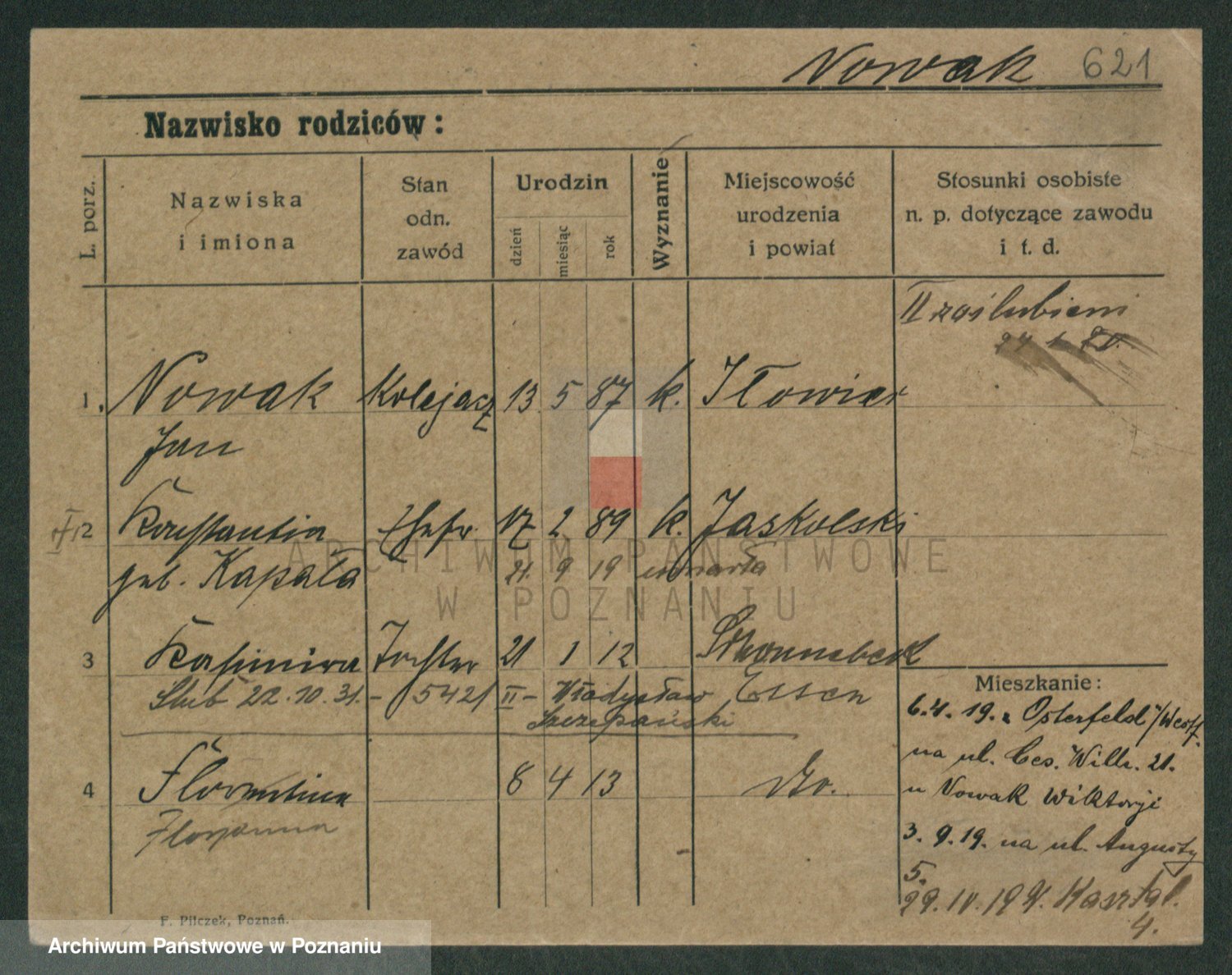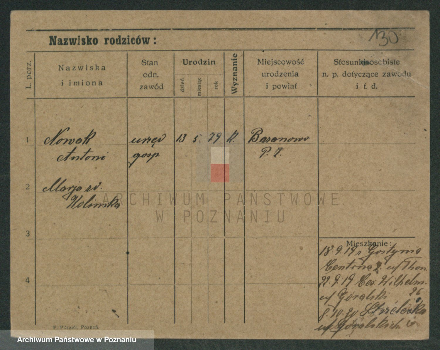 Podgląd karty osobowej dostępny jest po kliknięciu na nazwisko lub ikonkę karty. Można dokonywać powiększenia (ikony na górze) lub przechodzić między kolejnymi skanami (strzałki po bokach).