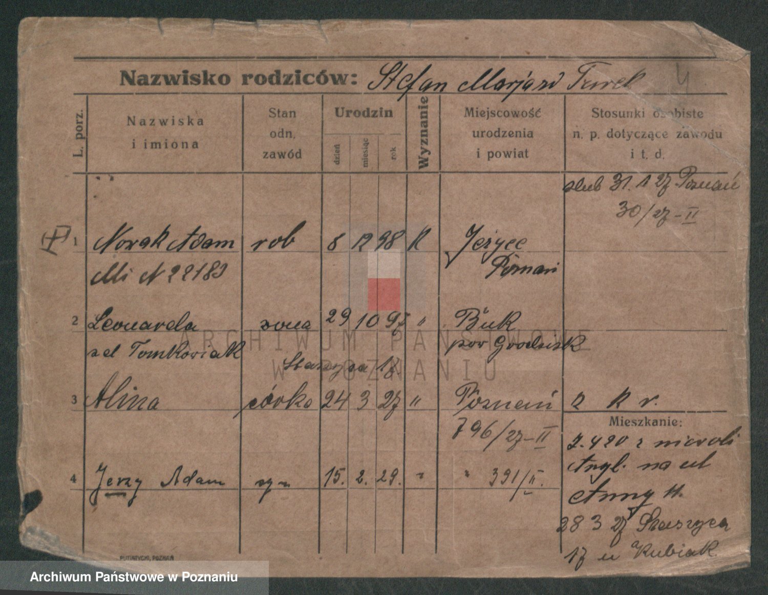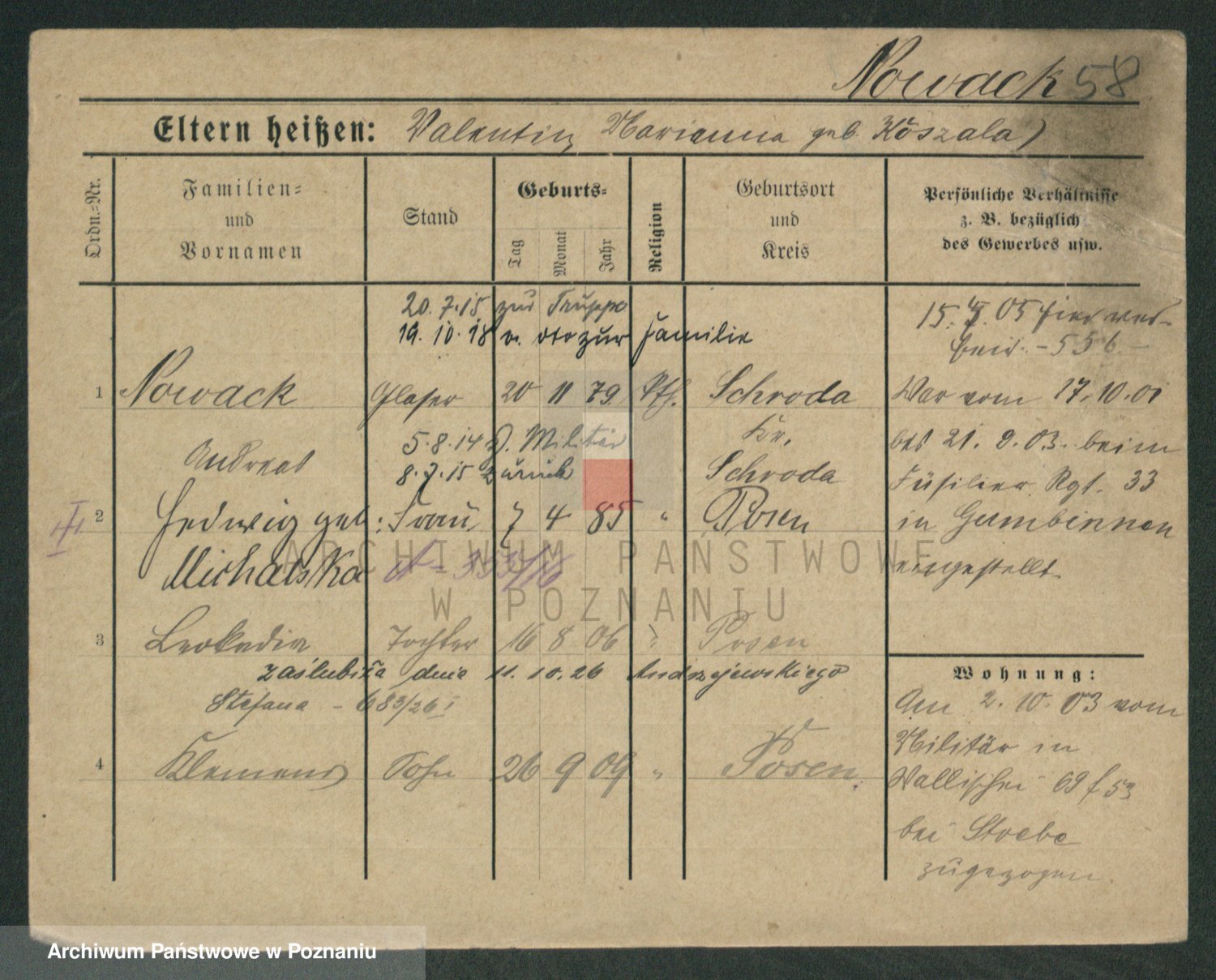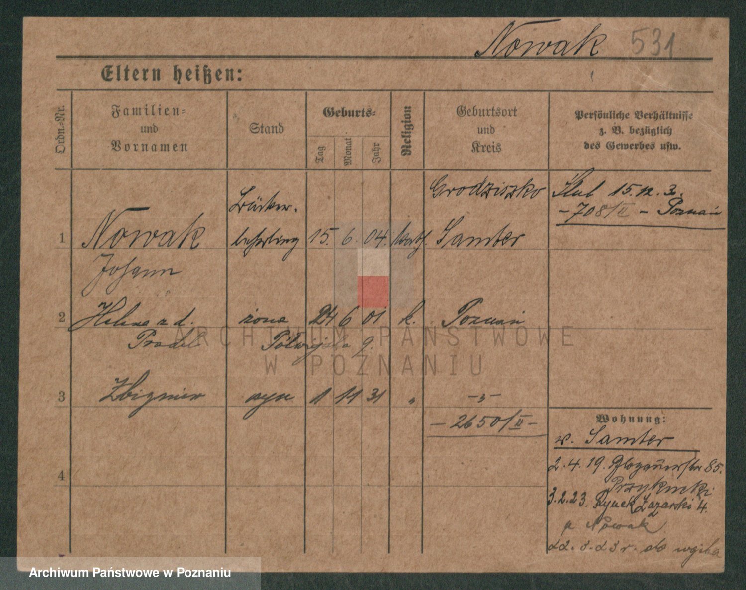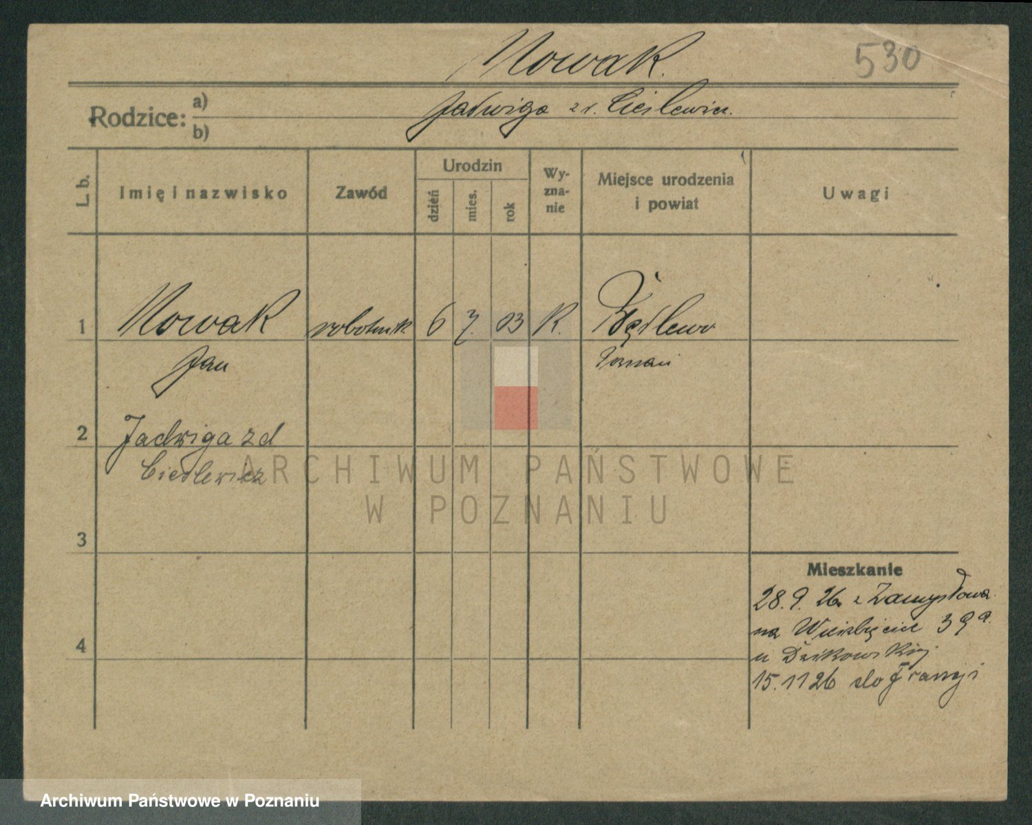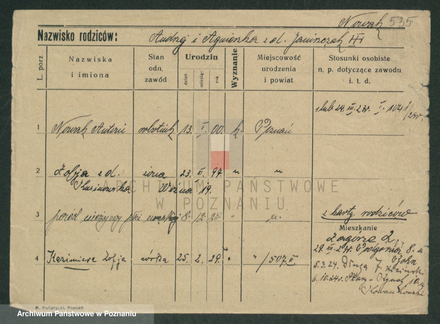 Podgląd karty osobowej dostępny jest po kliknięciu na nazwisko lub ikonkę karty. Można dokonywać powiększenia (ikony na górze) lub przechodzić między kolejnymi skanami (strzałki po bokach).