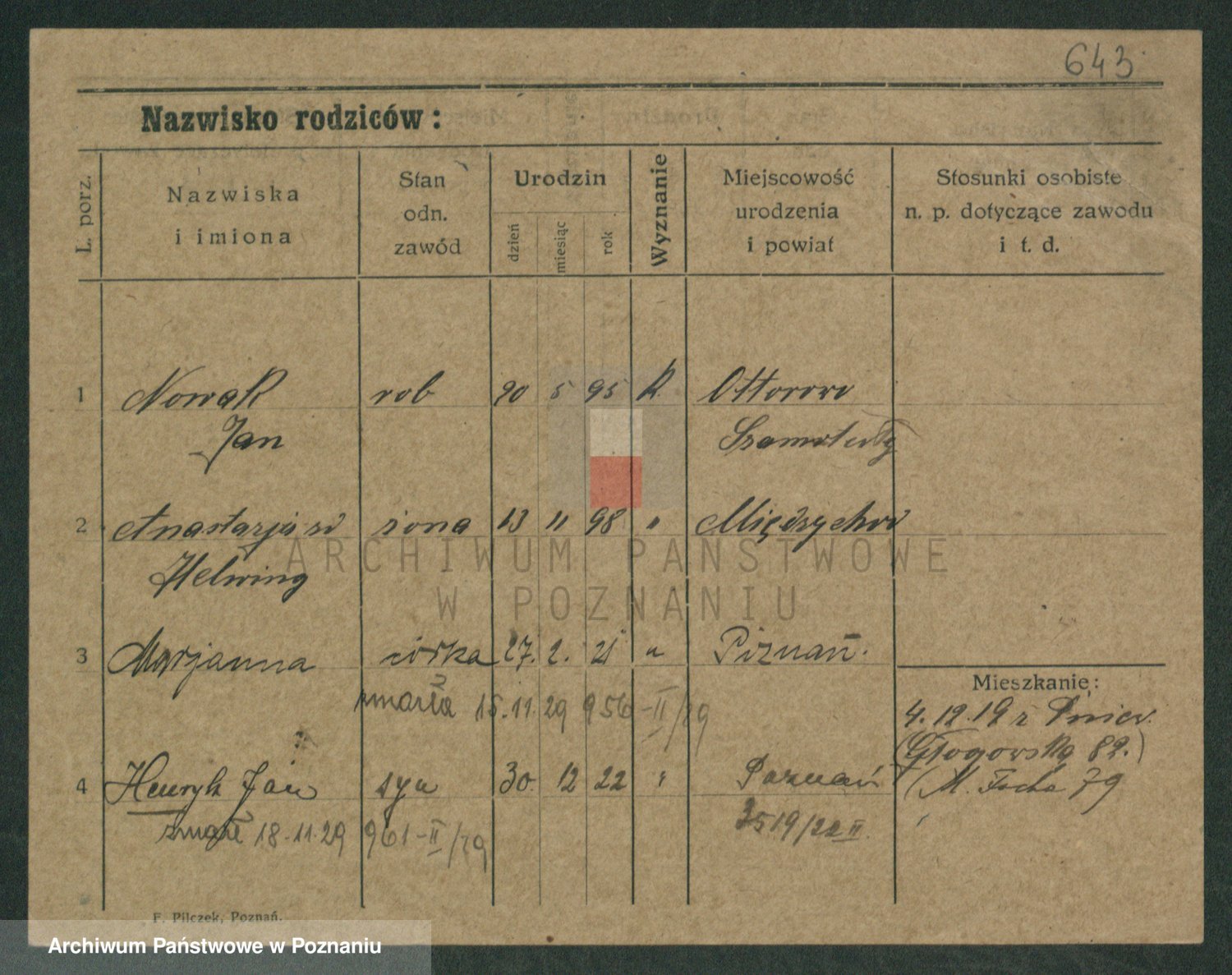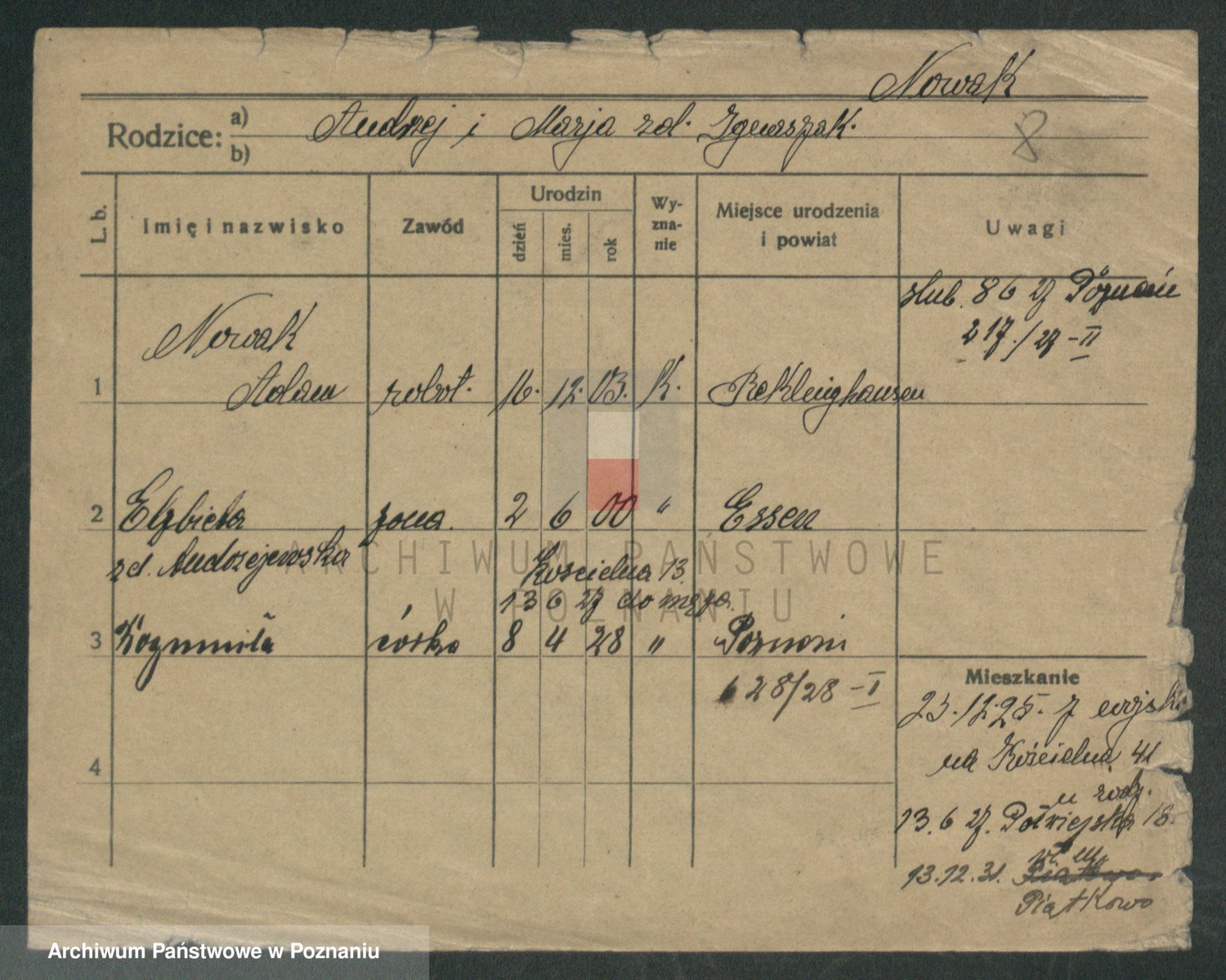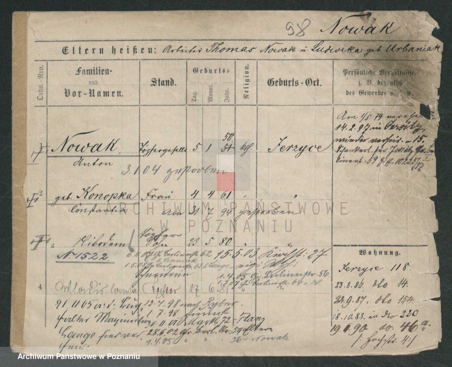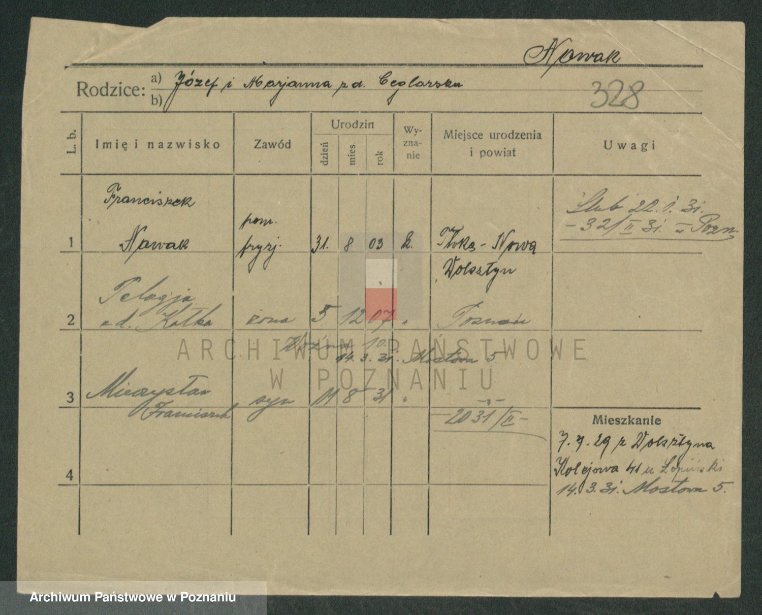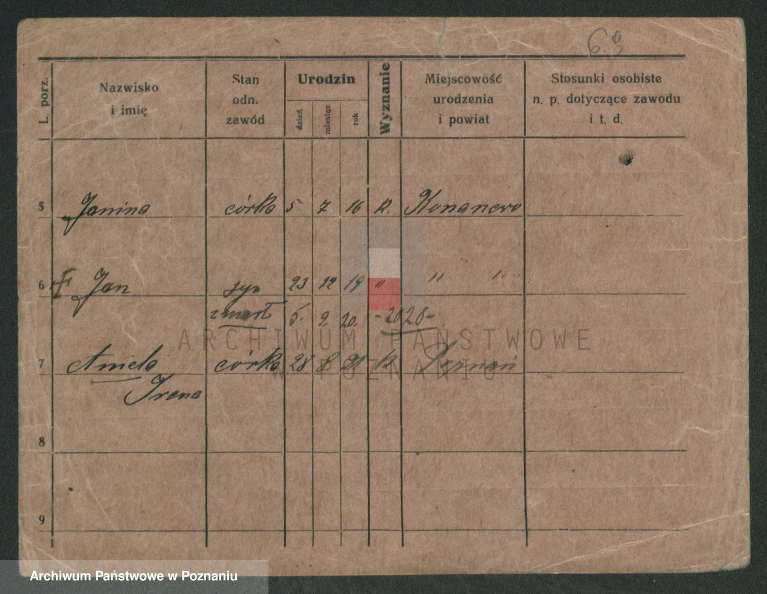 Podgląd karty osobowej dostępny jest po kliknięciu na nazwisko lub ikonkę karty. Można dokonywać powiększenia (ikony na górze) lub przechodzić między kolejnymi skanami (strzałki po bokach).