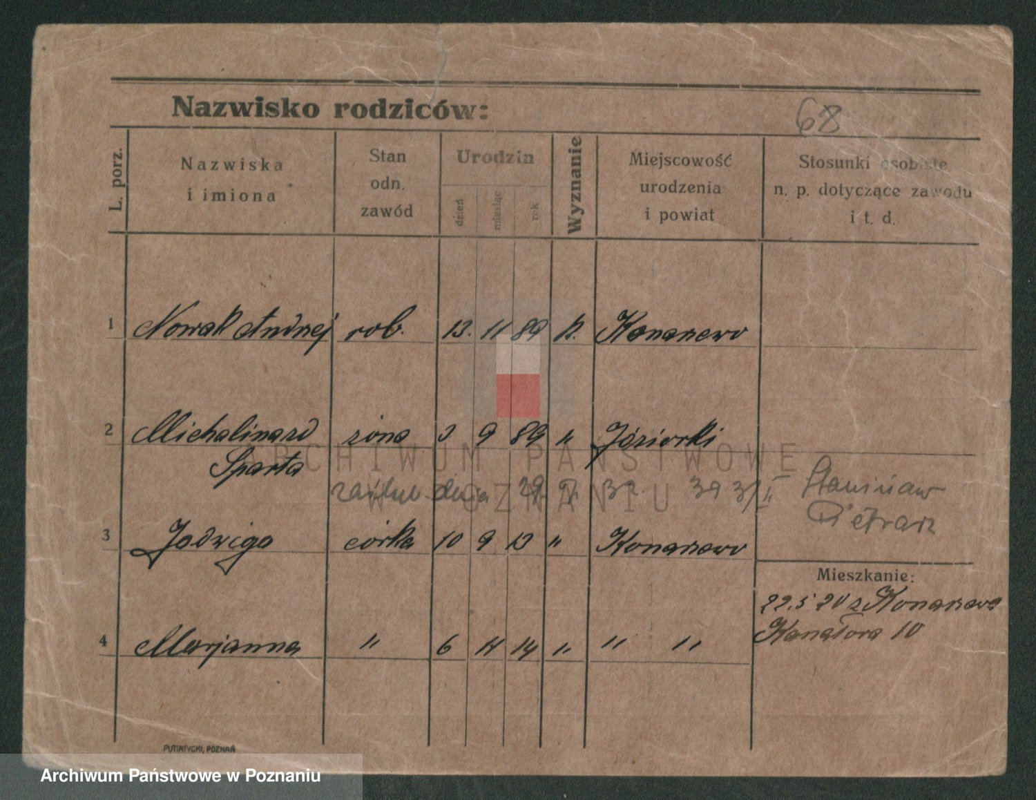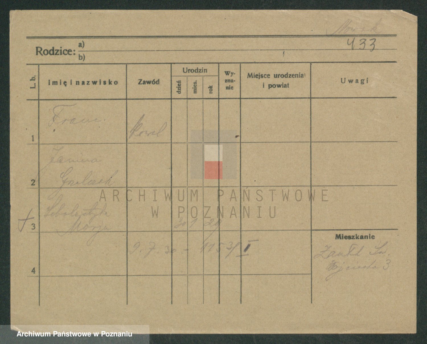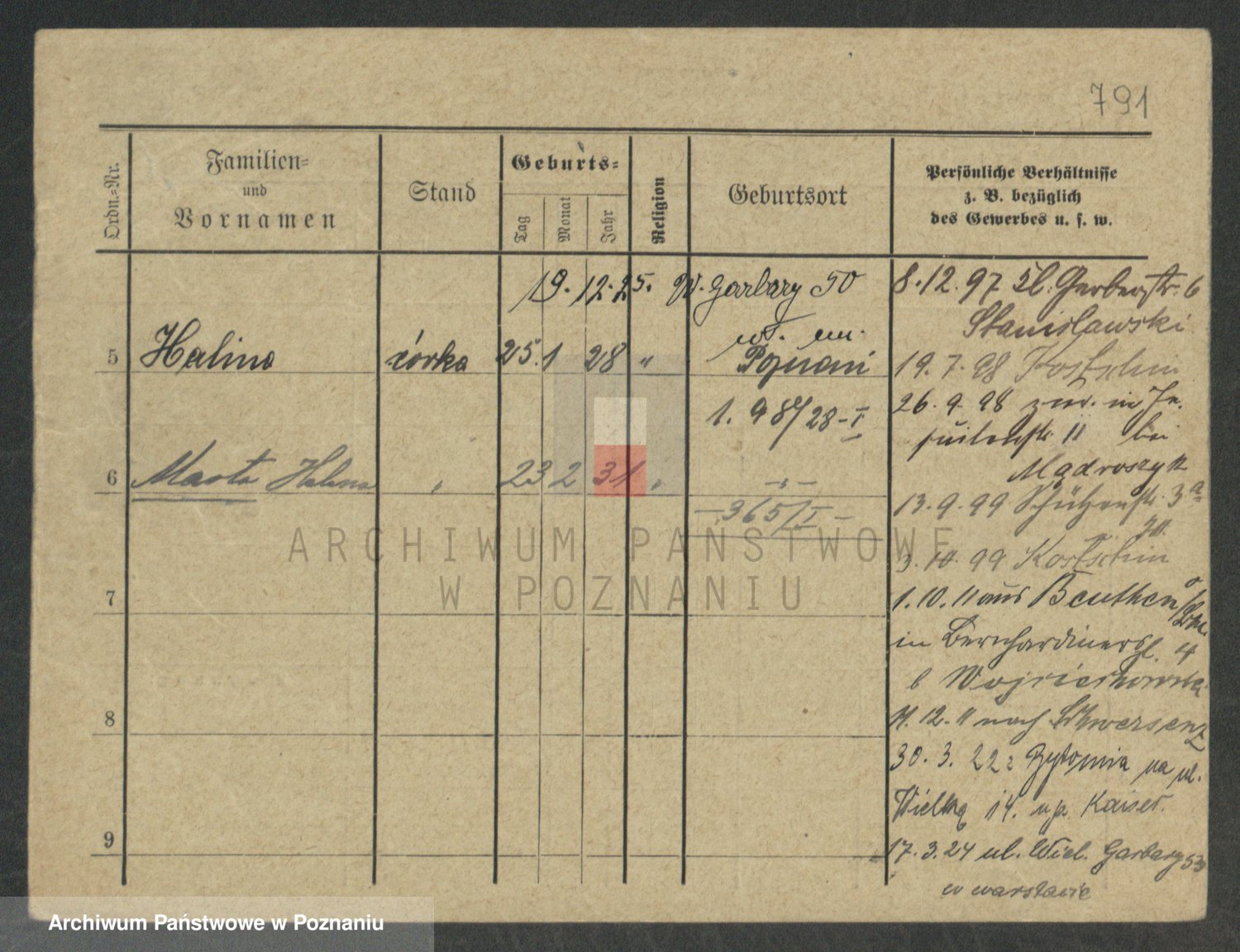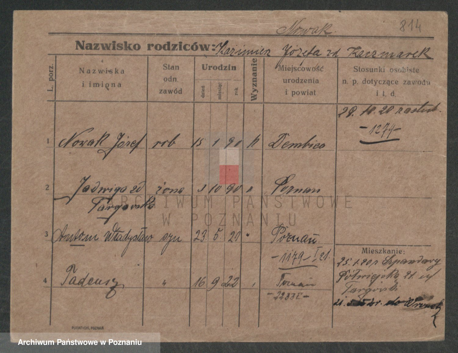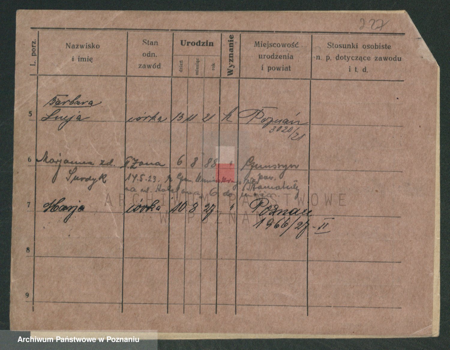 Podgląd karty osobowej dostępny jest po kliknięciu na nazwisko lub ikonkę karty. Można dokonywać powiększenia (ikony na górze) lub przechodzić między kolejnymi skanami (strzałki po bokach).