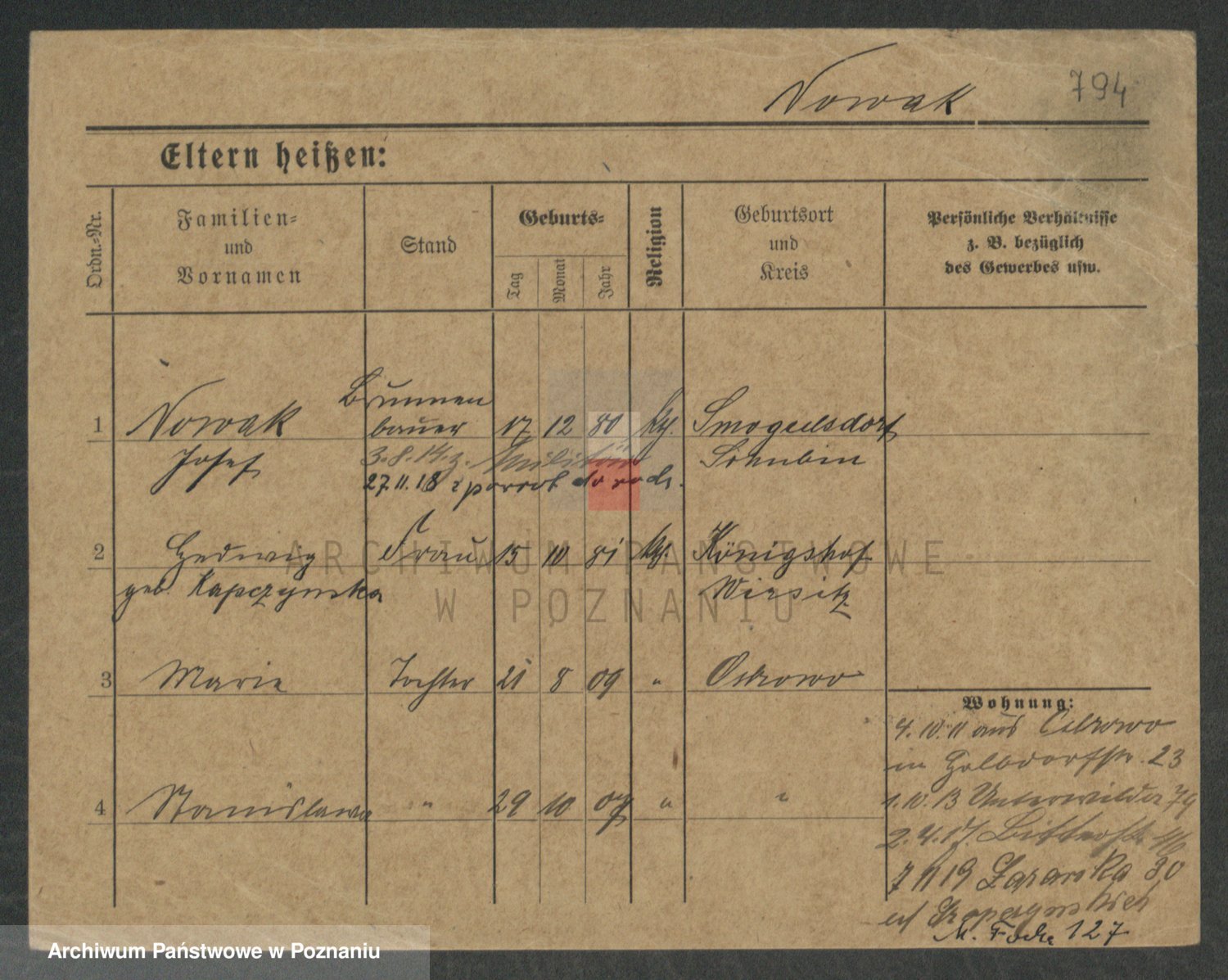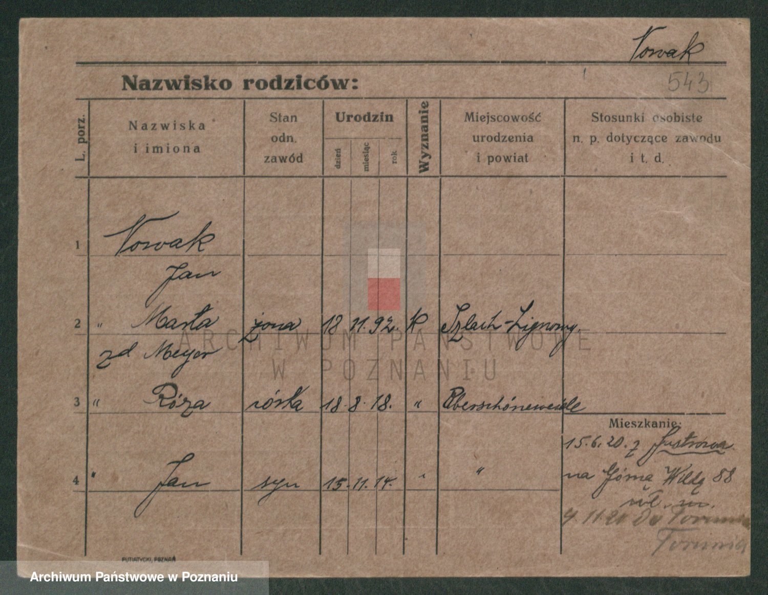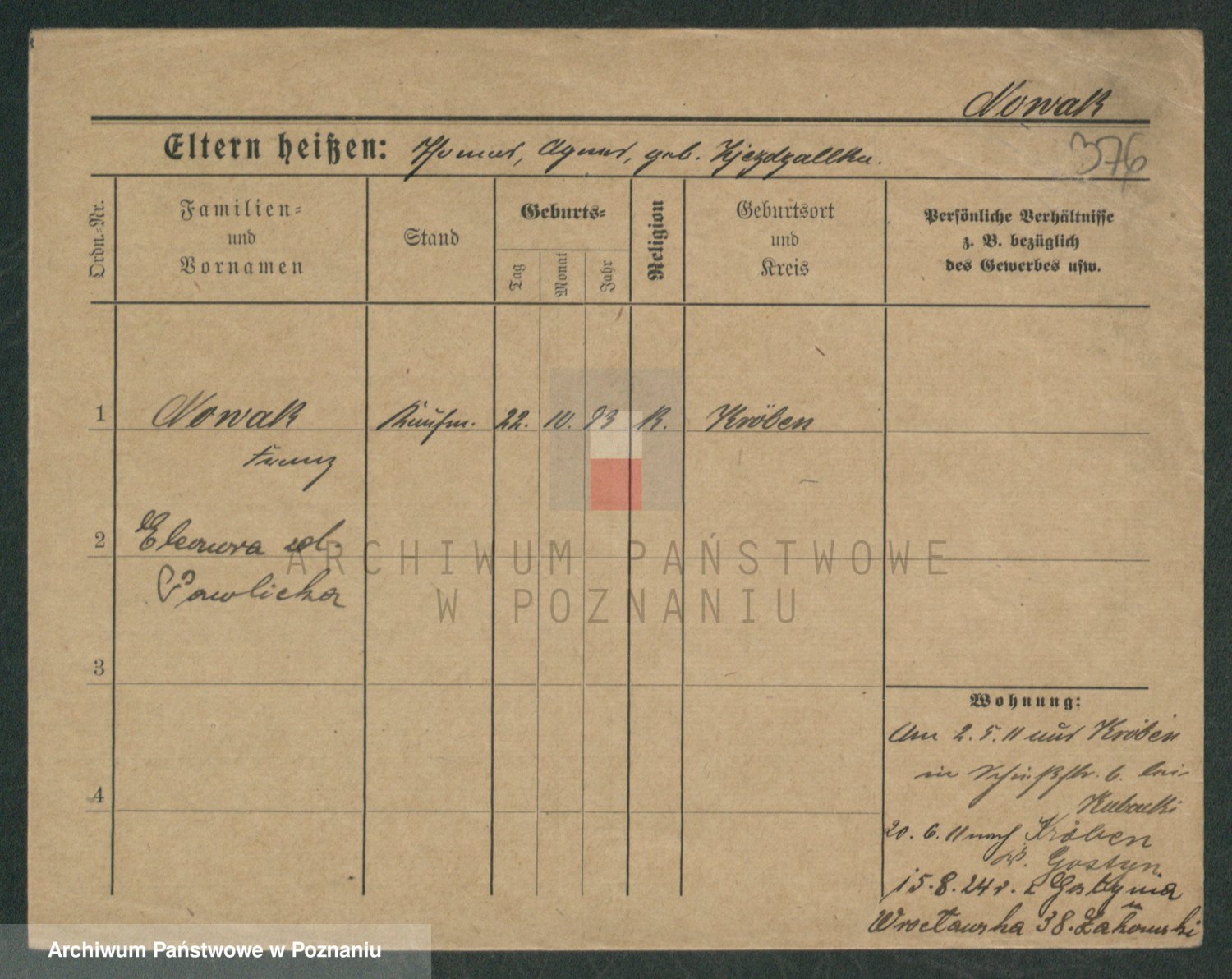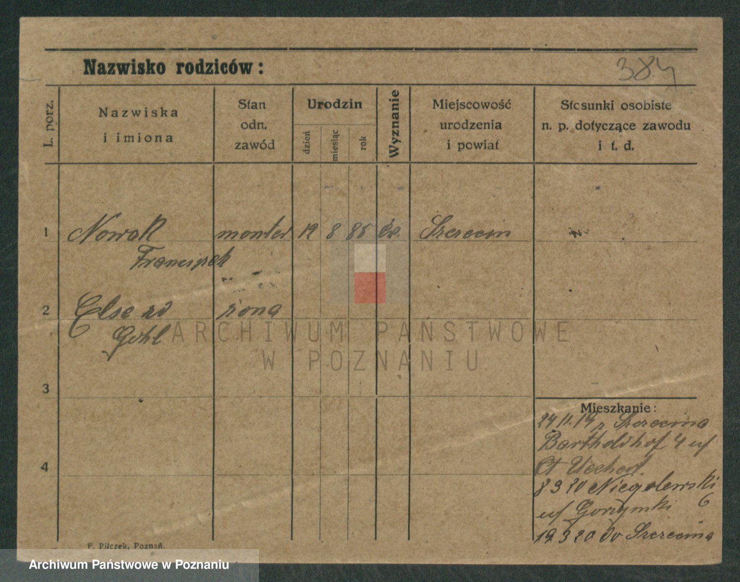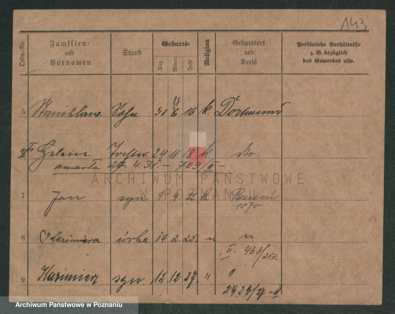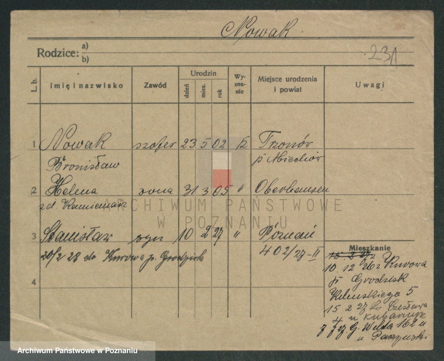 Podgląd karty osobowej dostępny jest po kliknięciu na nazwisko lub ikonkę karty. Można dokonywać powiększenia (ikony na górze) lub przechodzić między kolejnymi skanami (strzałki po bokach).
