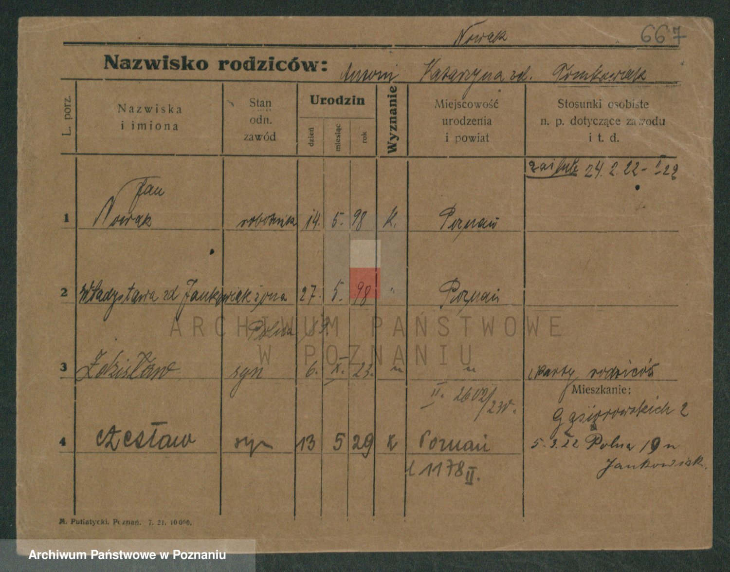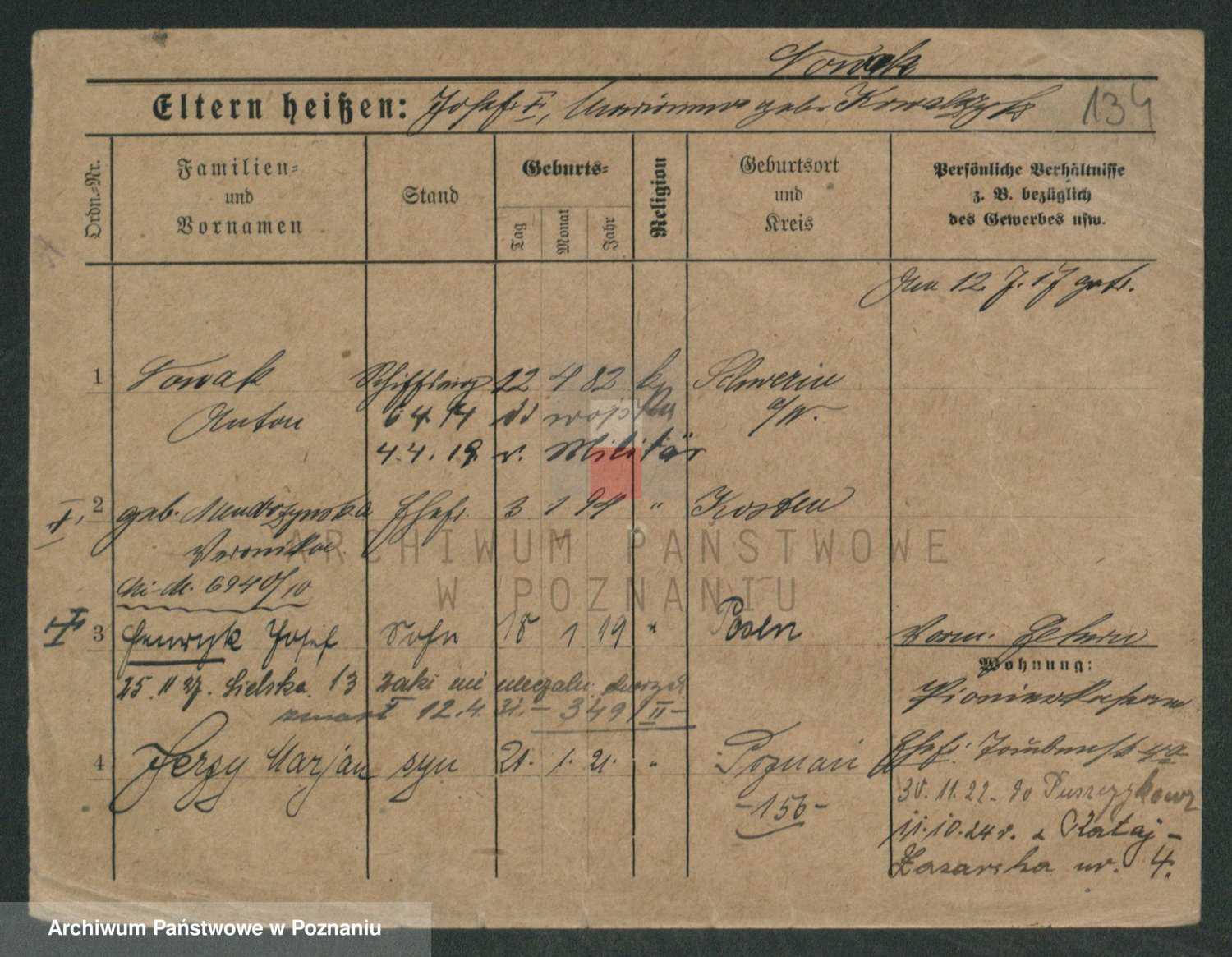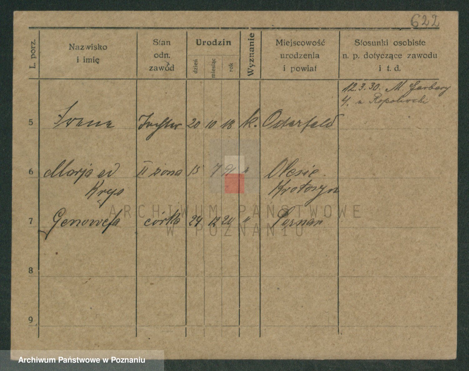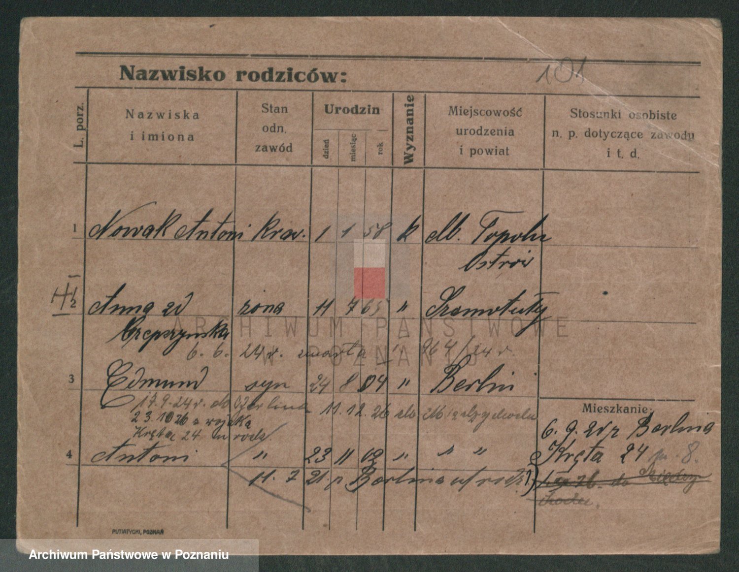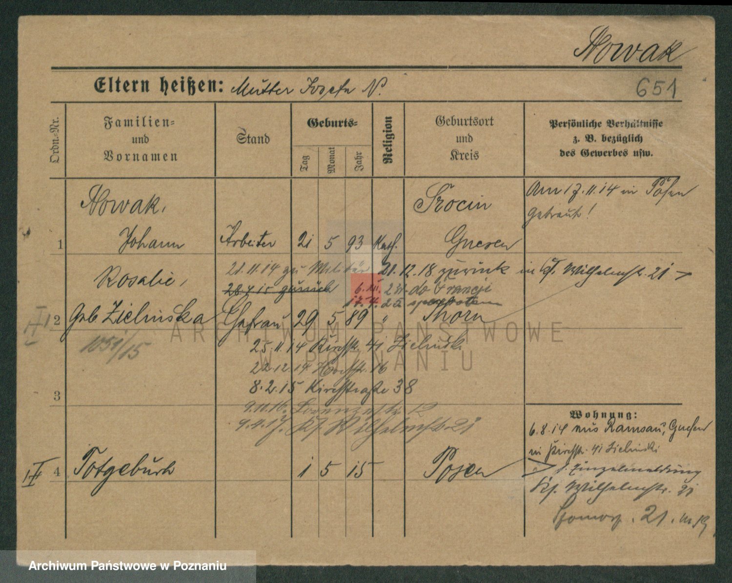 Podgląd karty osobowej dostępny jest po kliknięciu na nazwisko lub ikonkę karty. Można dokonywać powiększenia (ikony na górze) lub przechodzić między kolejnymi skanami (strzałki po bokach).