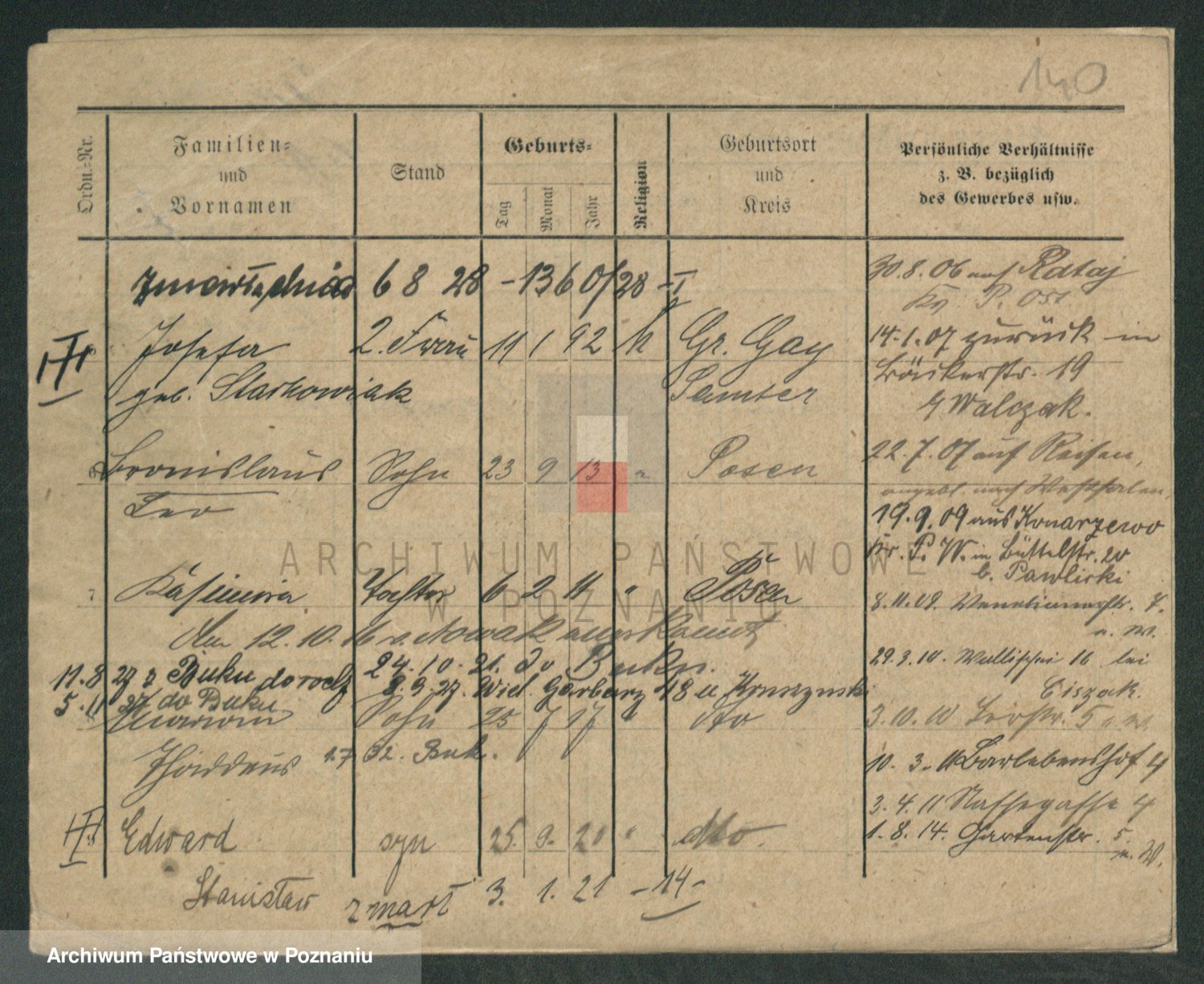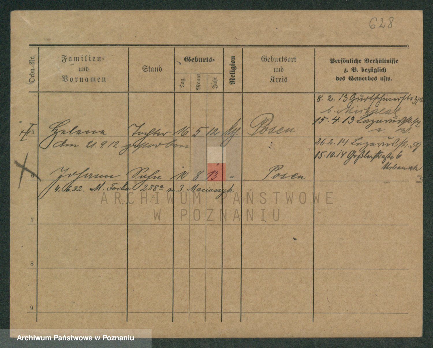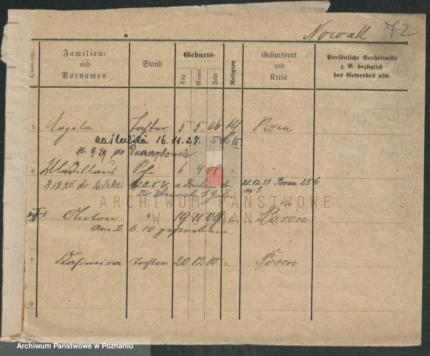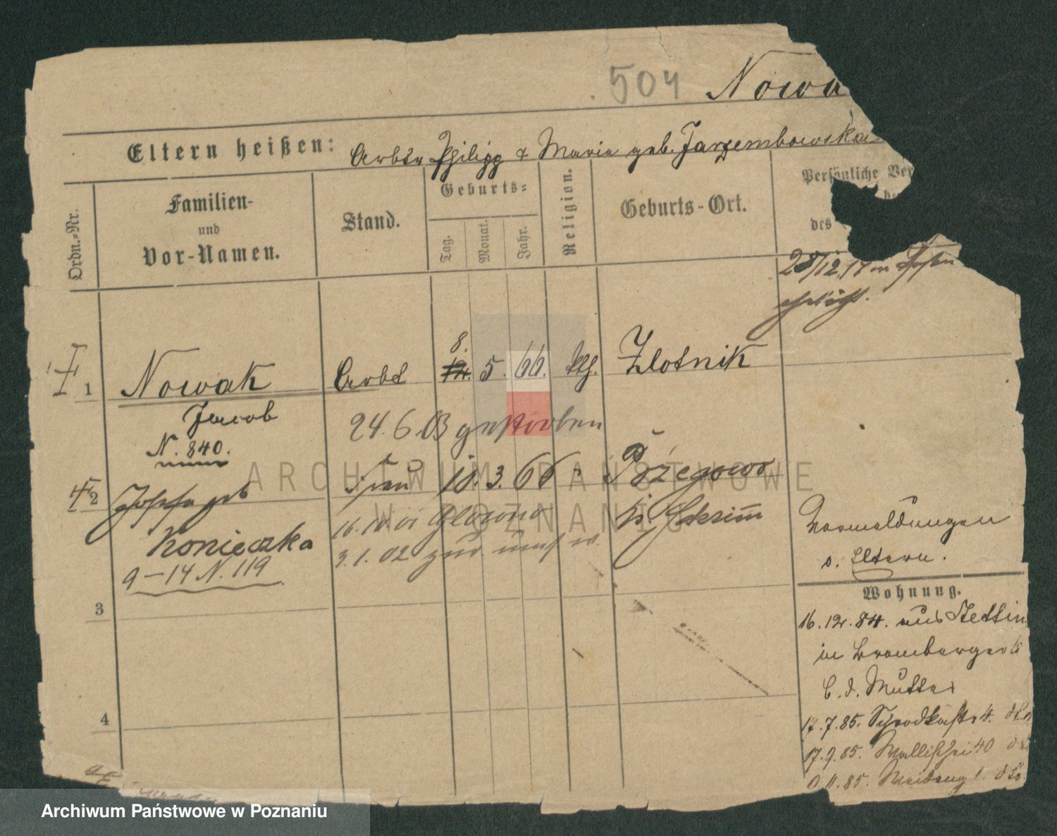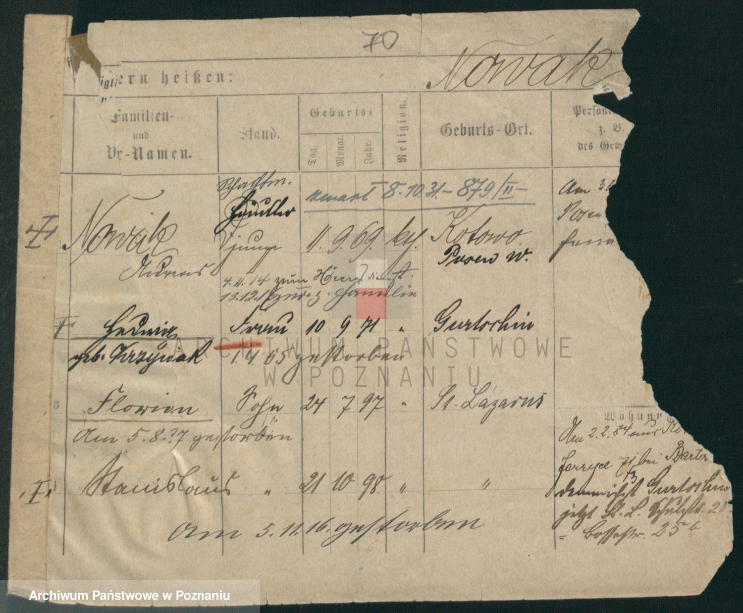 Podgląd karty osobowej dostępny jest po kliknięciu na nazwisko lub ikonkę karty. Można dokonywać powiększenia (ikony na górze) lub przechodzić między kolejnymi skanami (strzałki po bokach).