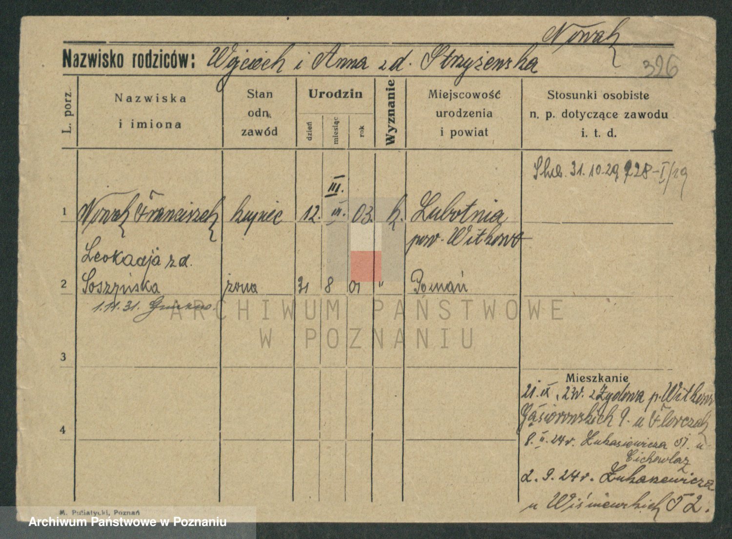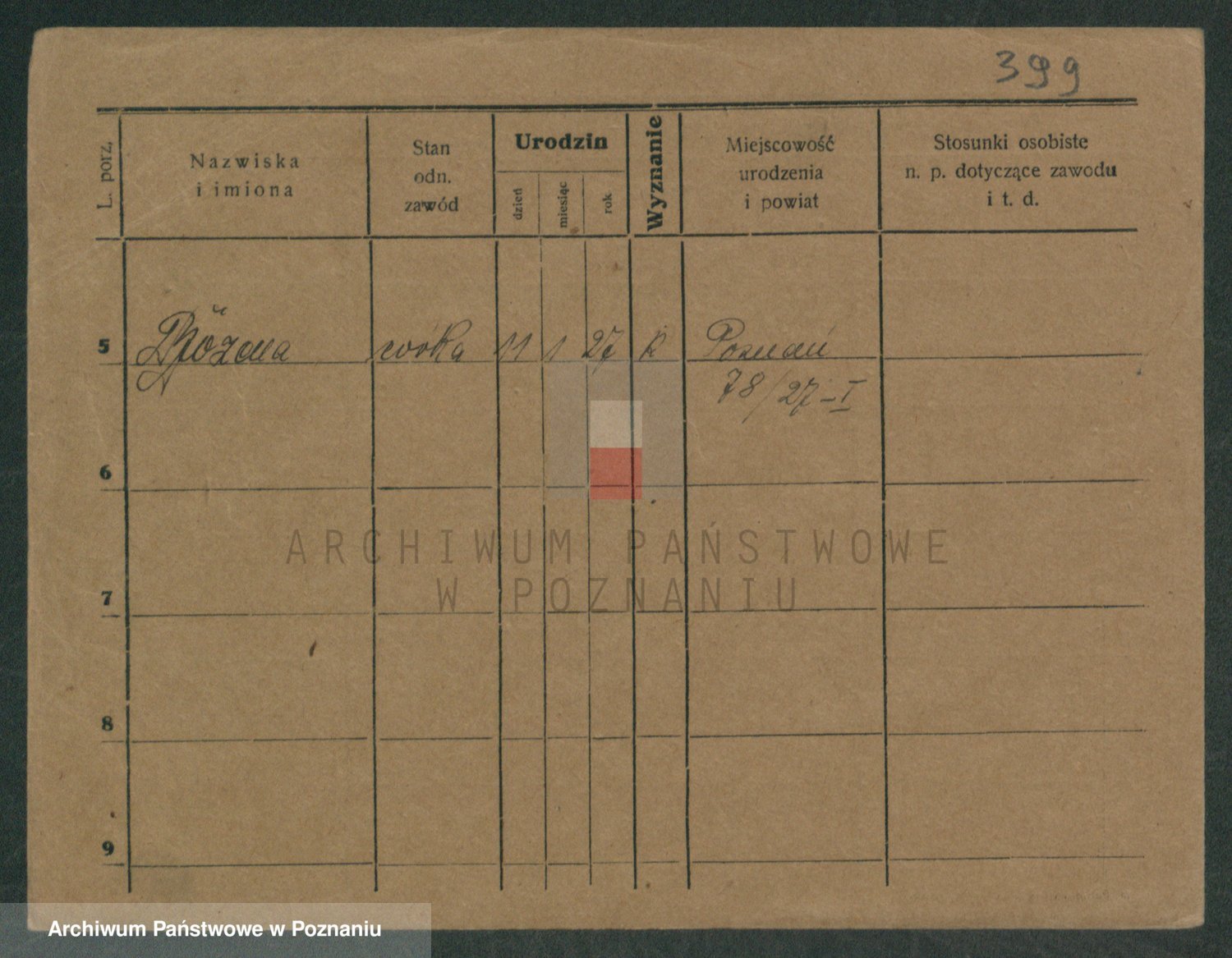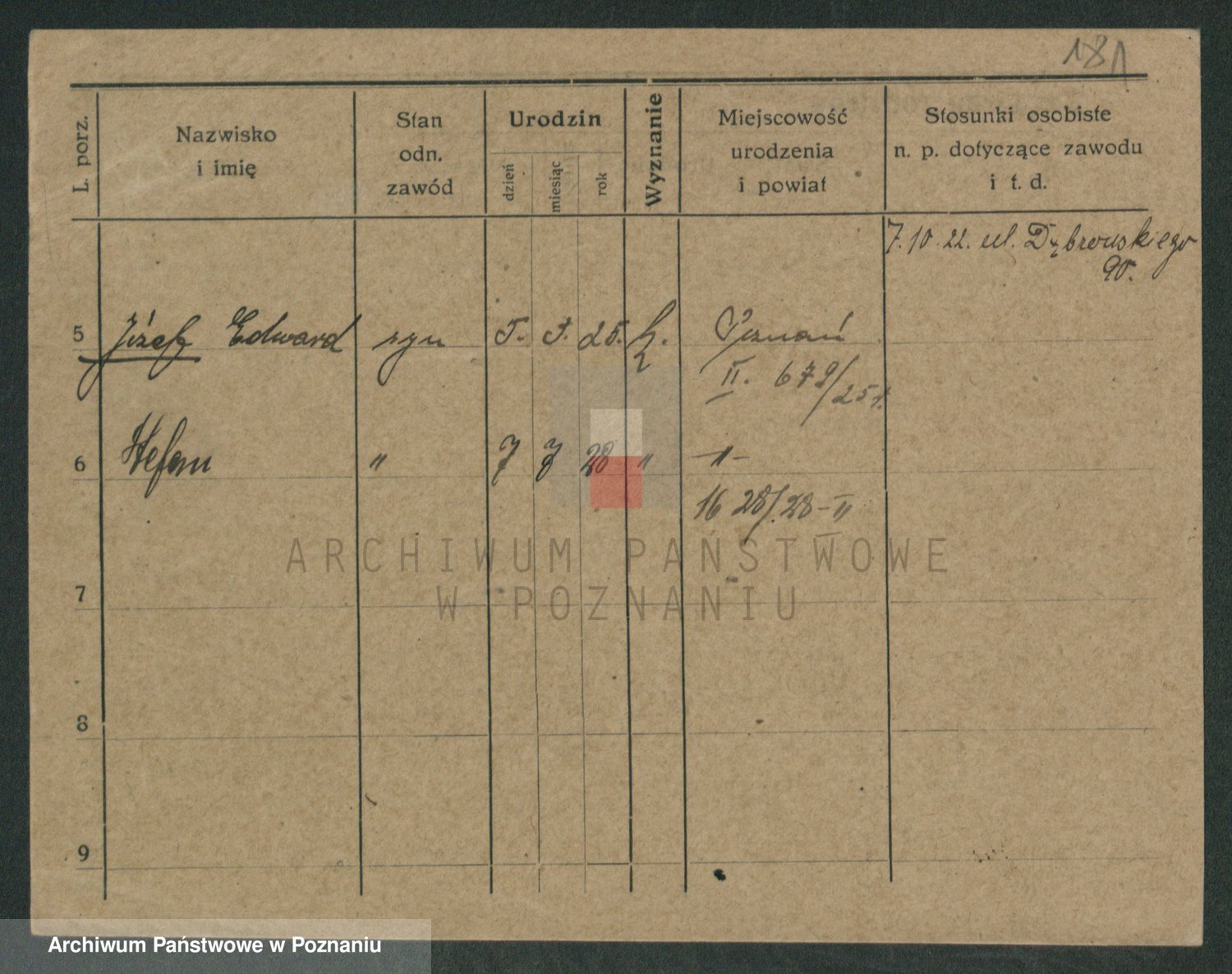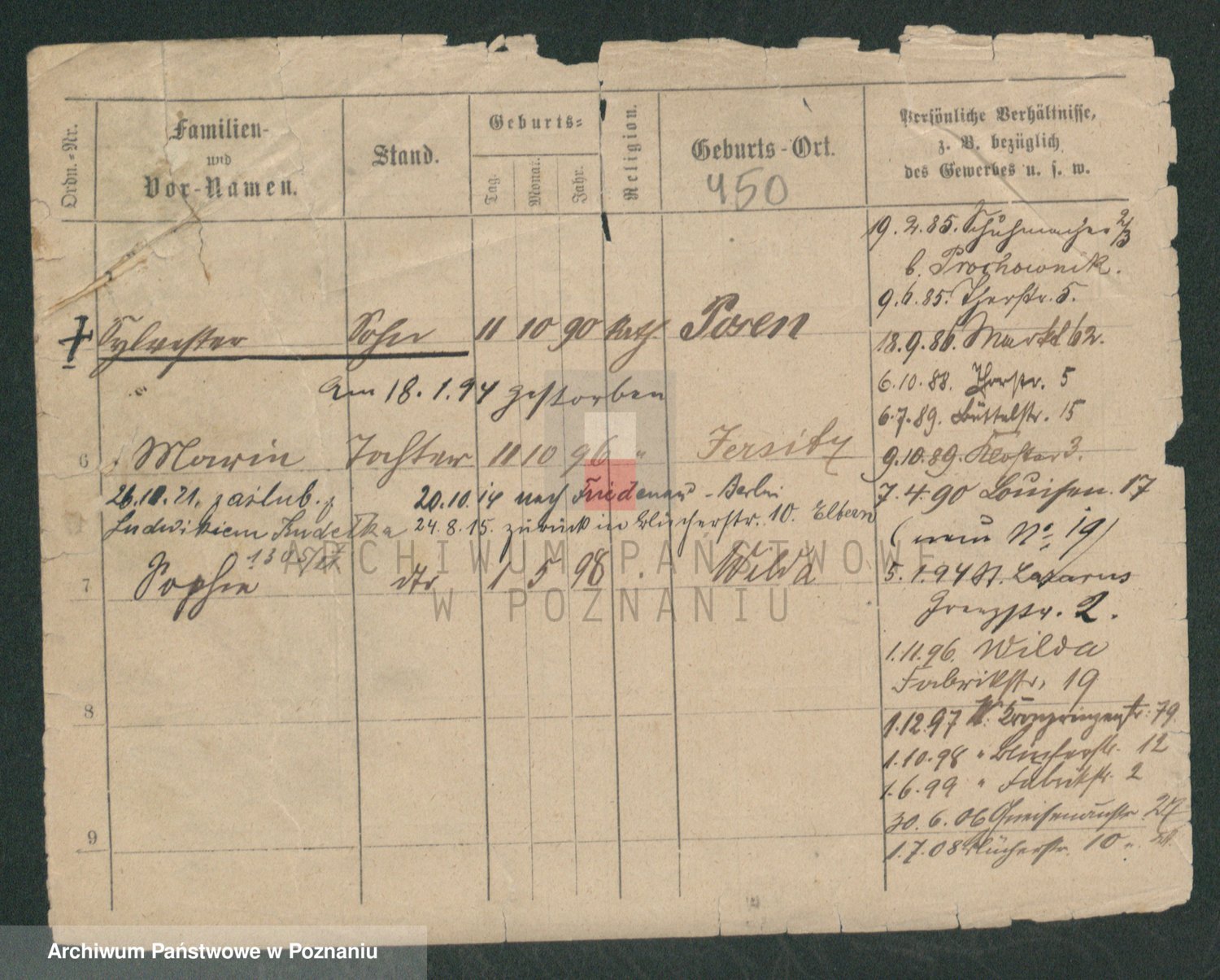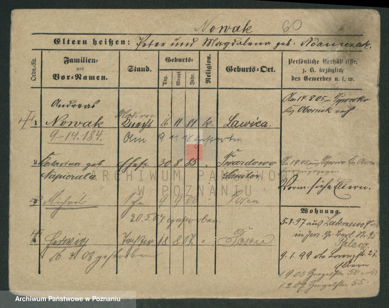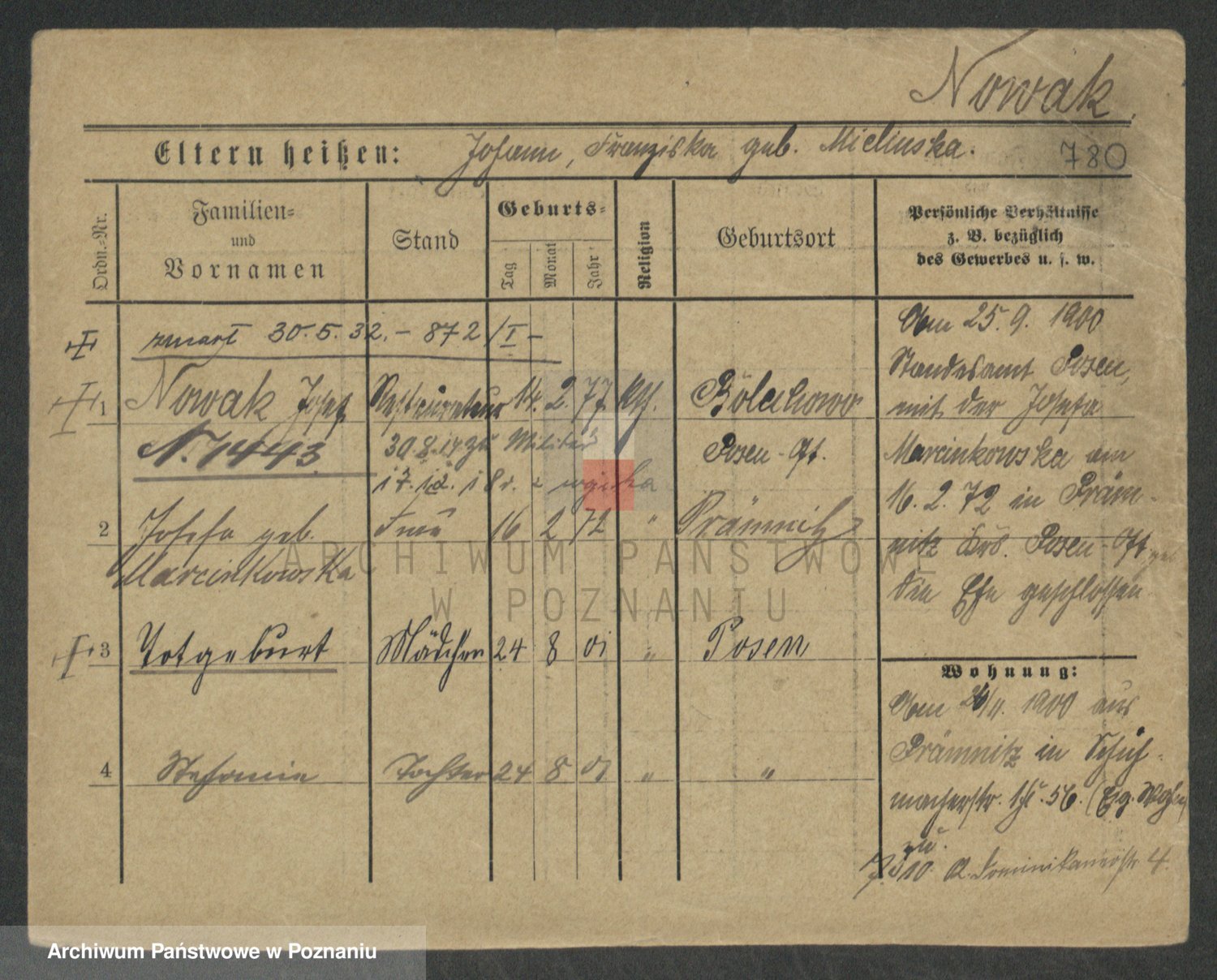Podgląd karty osobowej dostępny jest po kliknięciu na nazwisko lub ikonkę karty. Można dokonywać powiększenia (ikony na górze) lub przechodzić między kolejnymi skanami (strzałki po bokach).