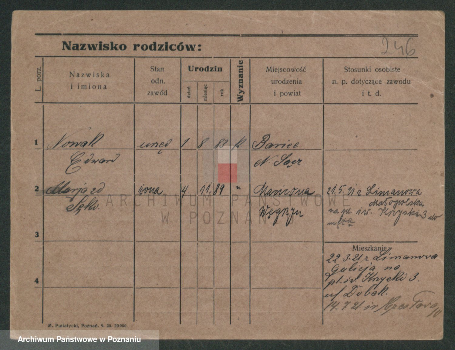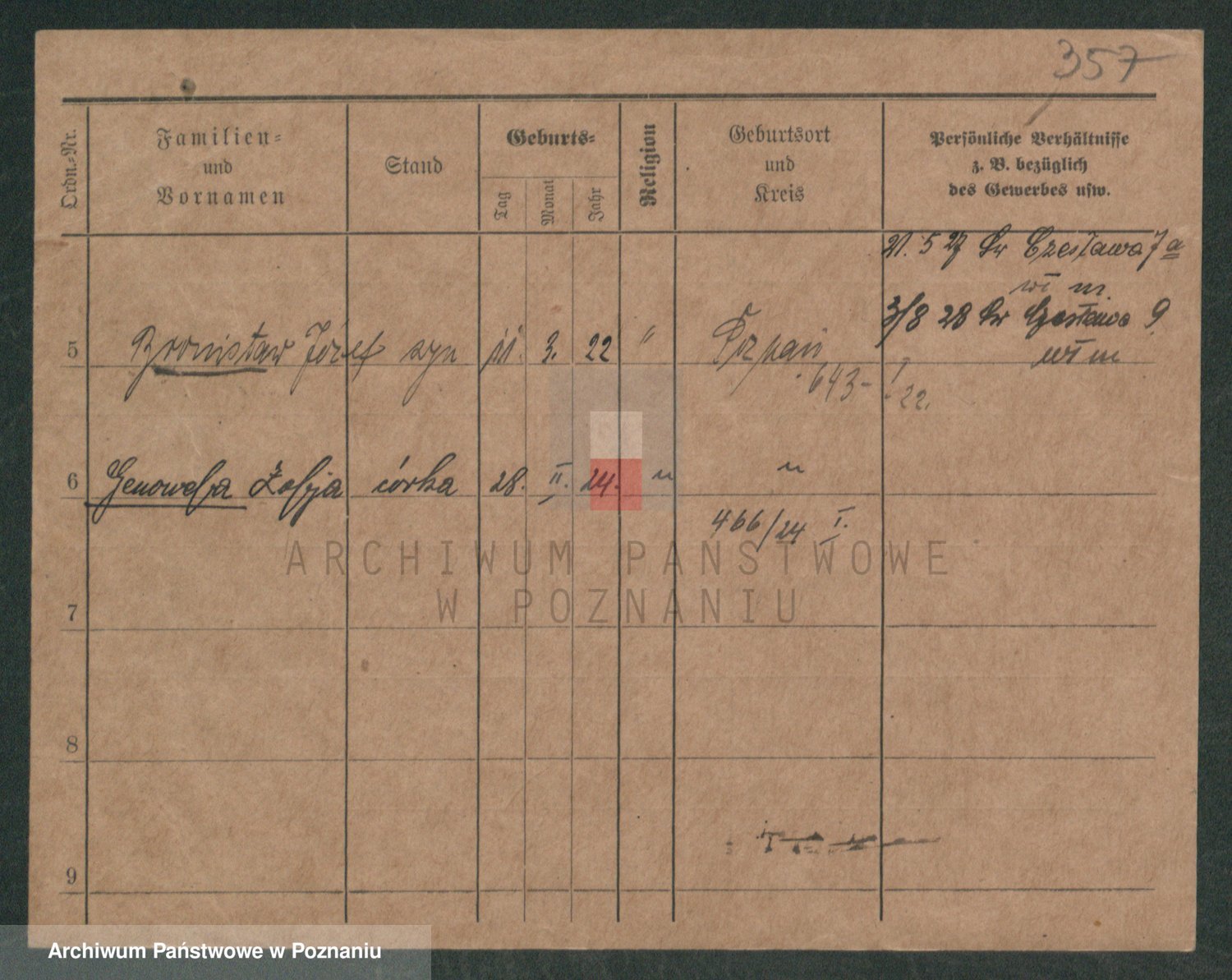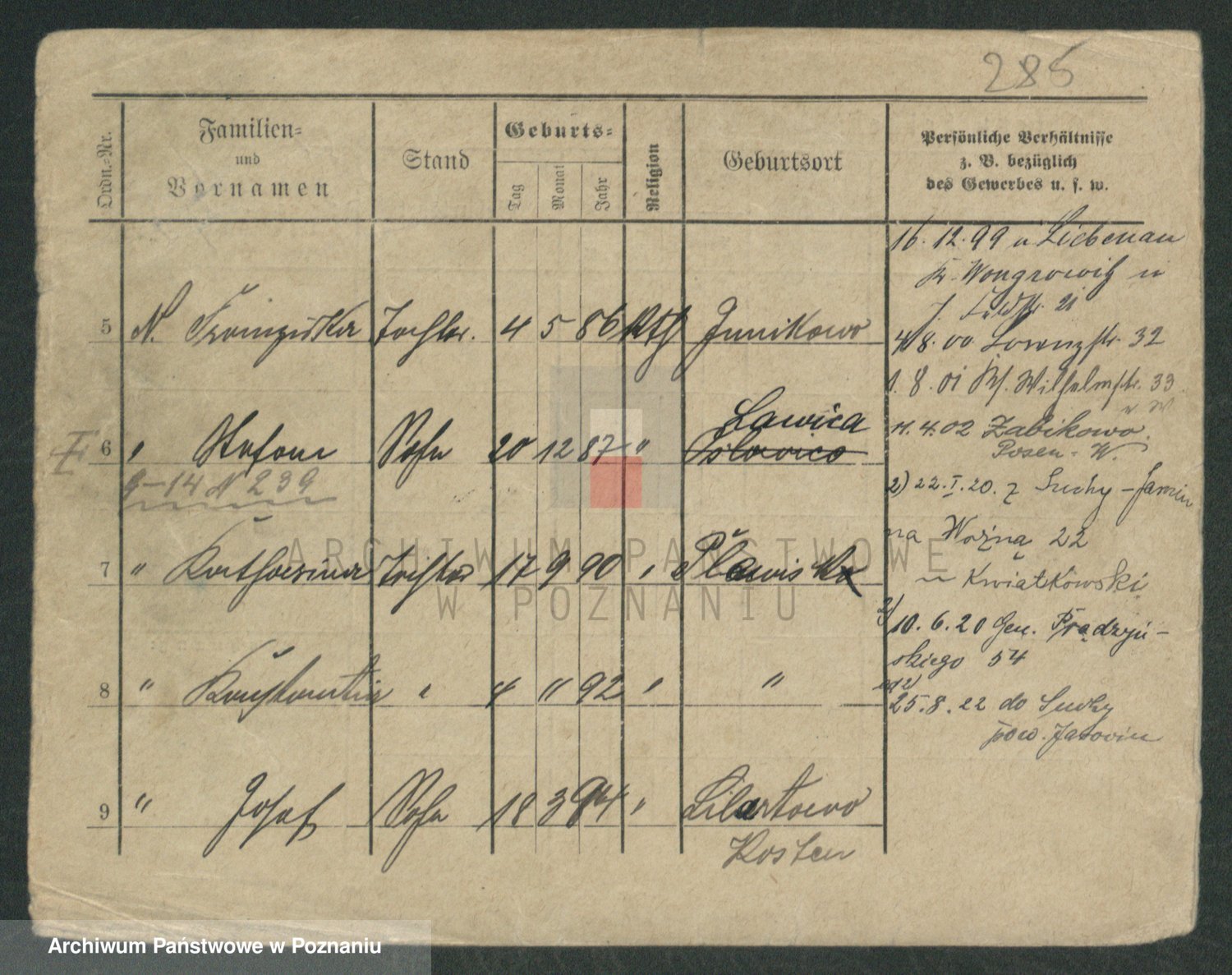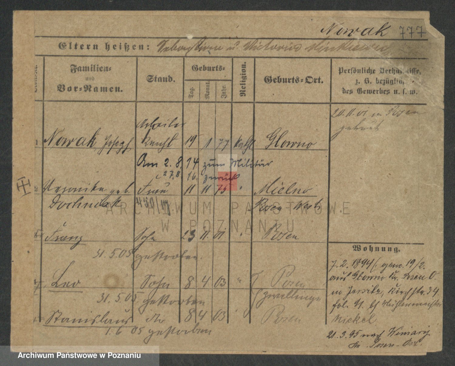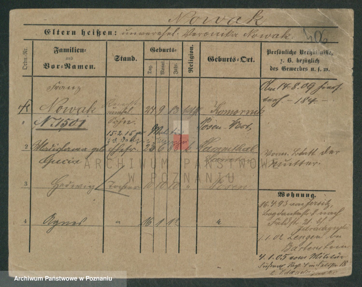 Podgląd karty osobowej dostępny jest po kliknięciu na nazwisko lub ikonkę karty. Można dokonywać powiększenia (ikony na górze) lub przechodzić między kolejnymi skanami (strzałki po bokach).