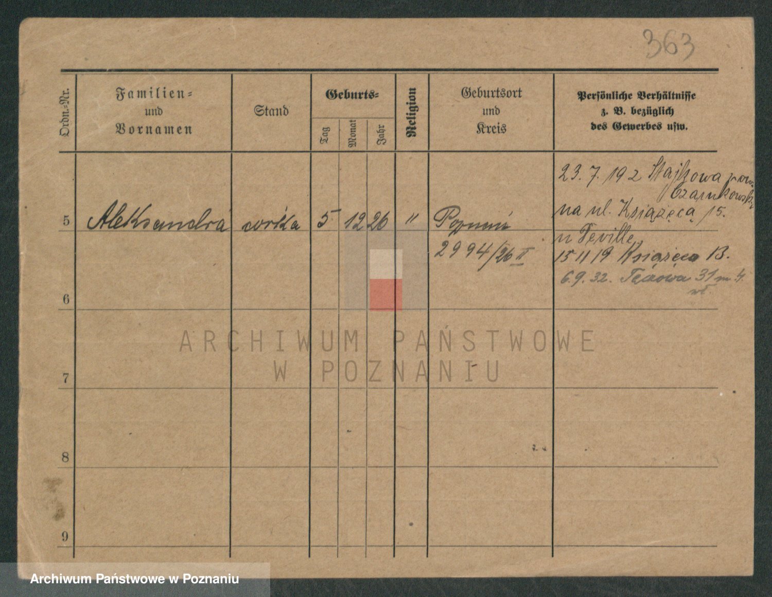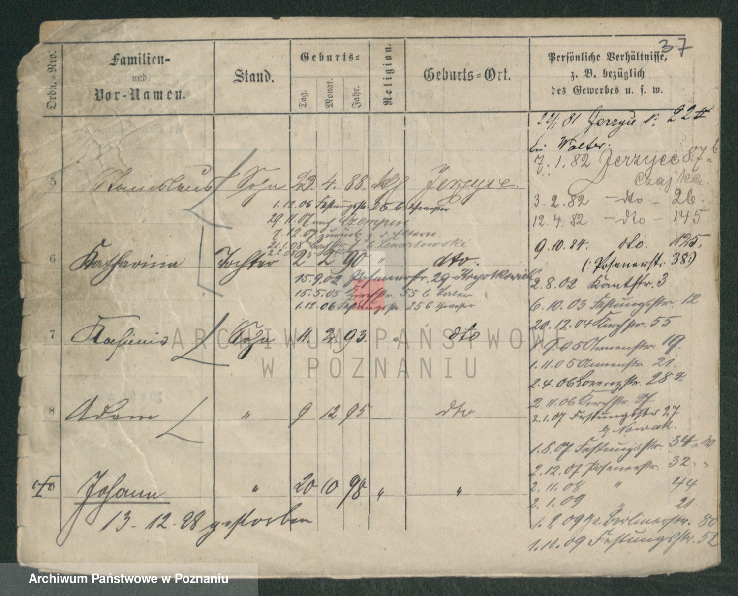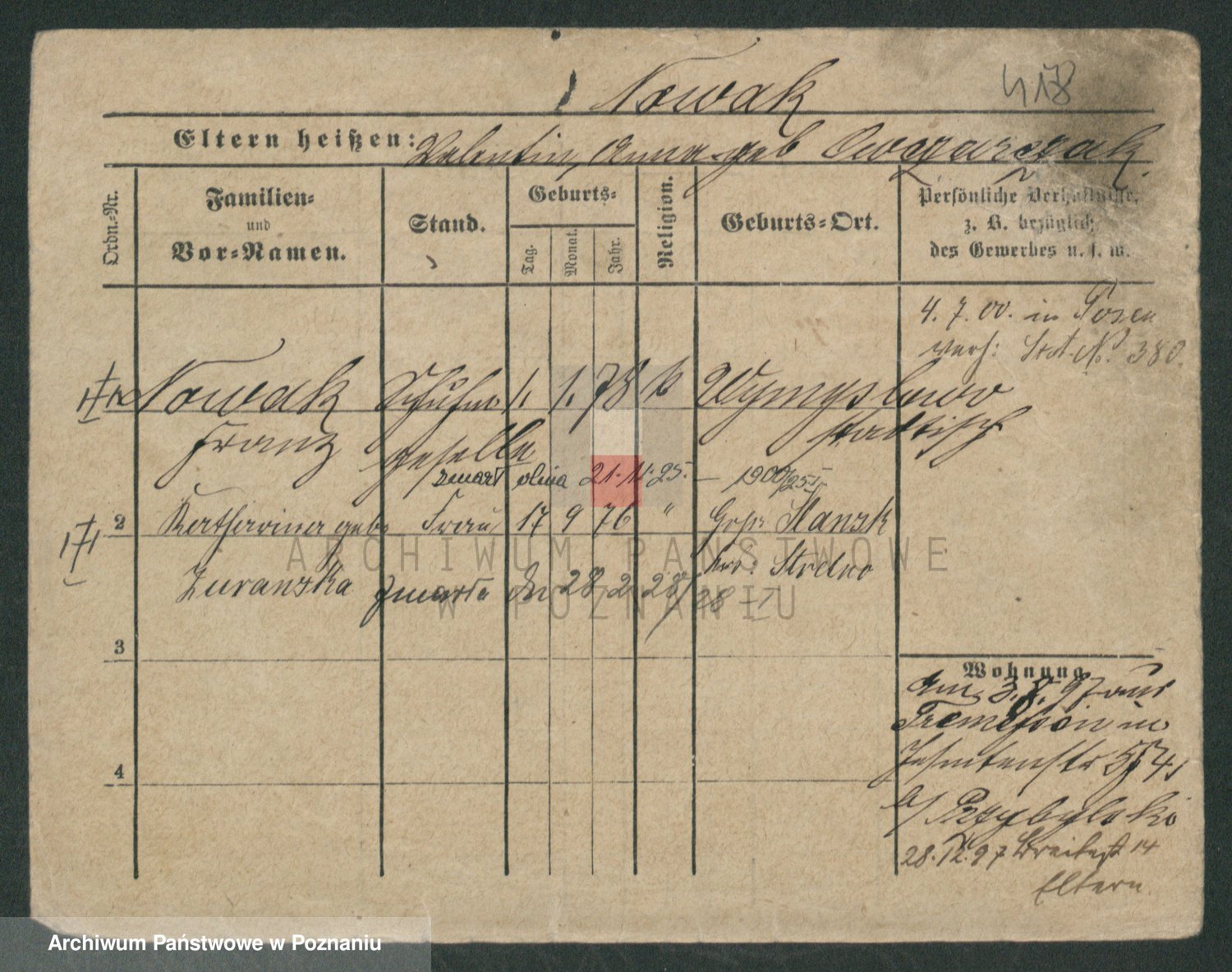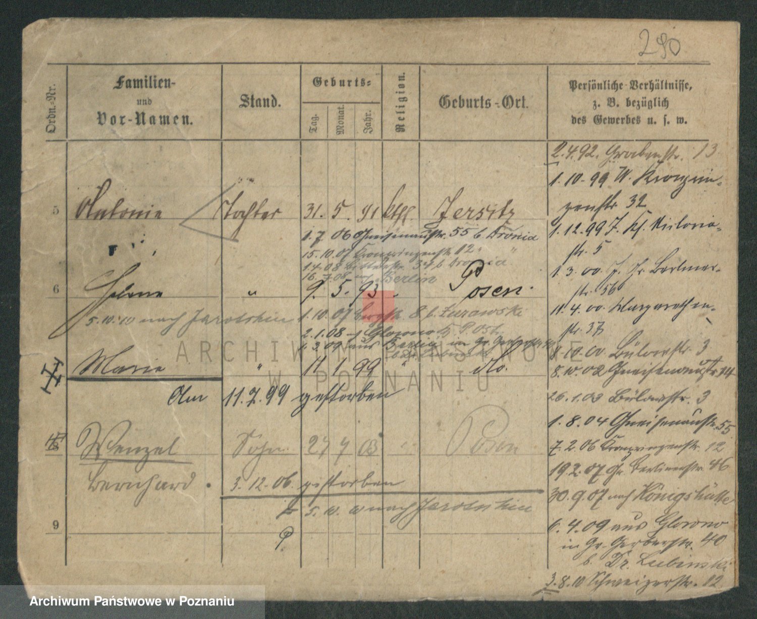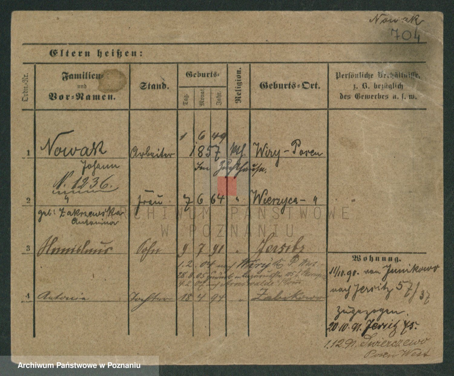 Podgląd karty osobowej dostępny jest po kliknięciu na nazwisko lub ikonkę karty. Można dokonywać powiększenia (ikony na górze) lub przechodzić między kolejnymi skanami (strzałki po bokach).