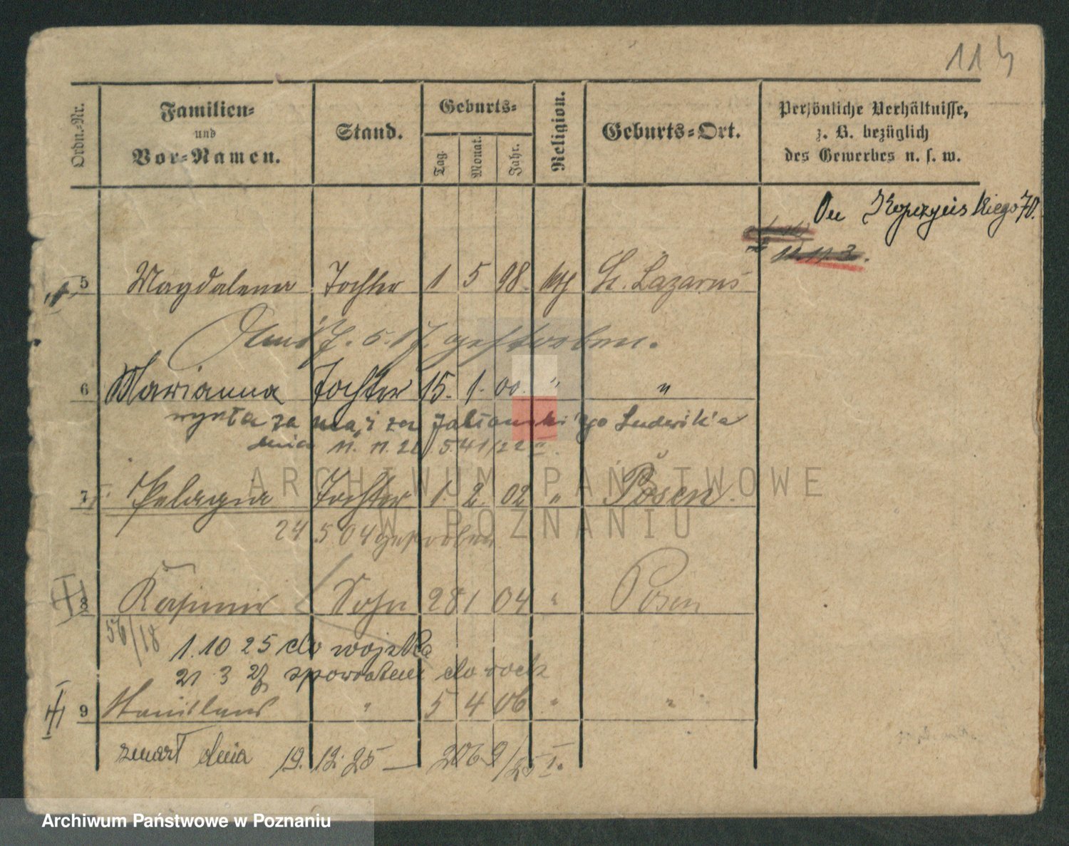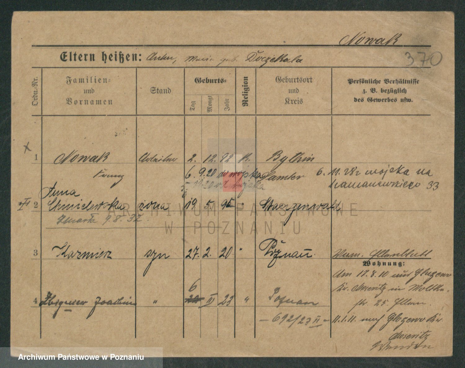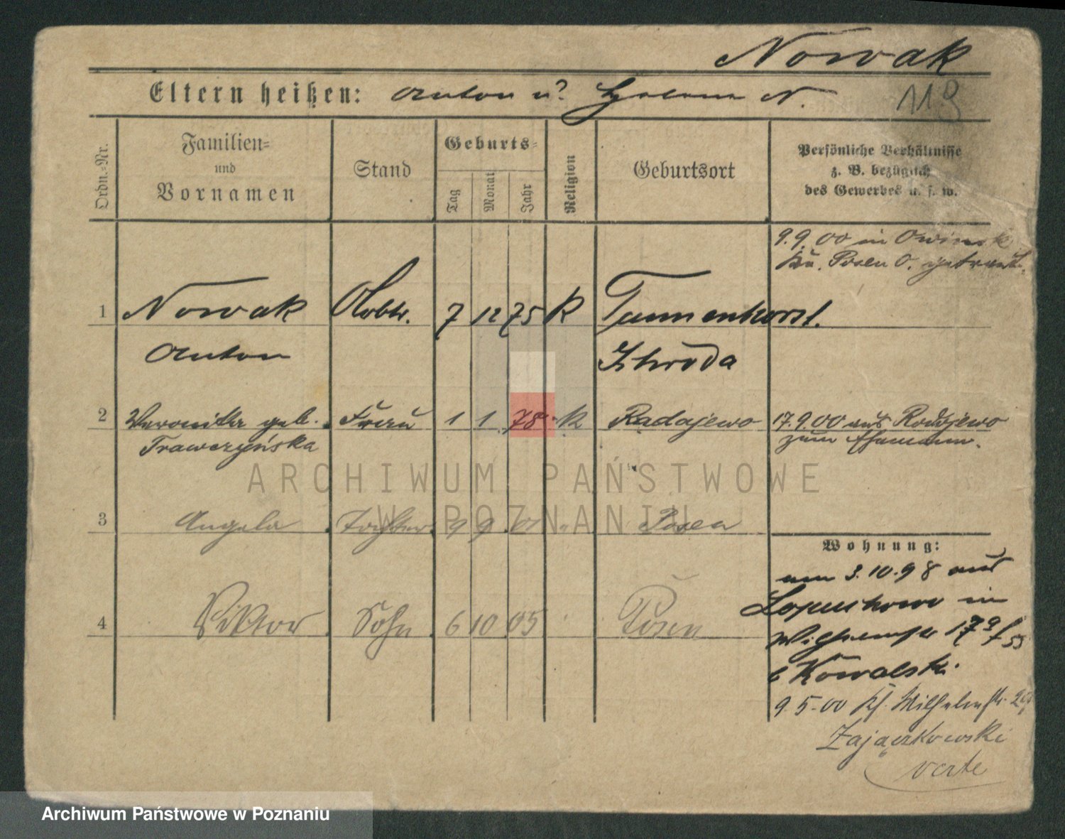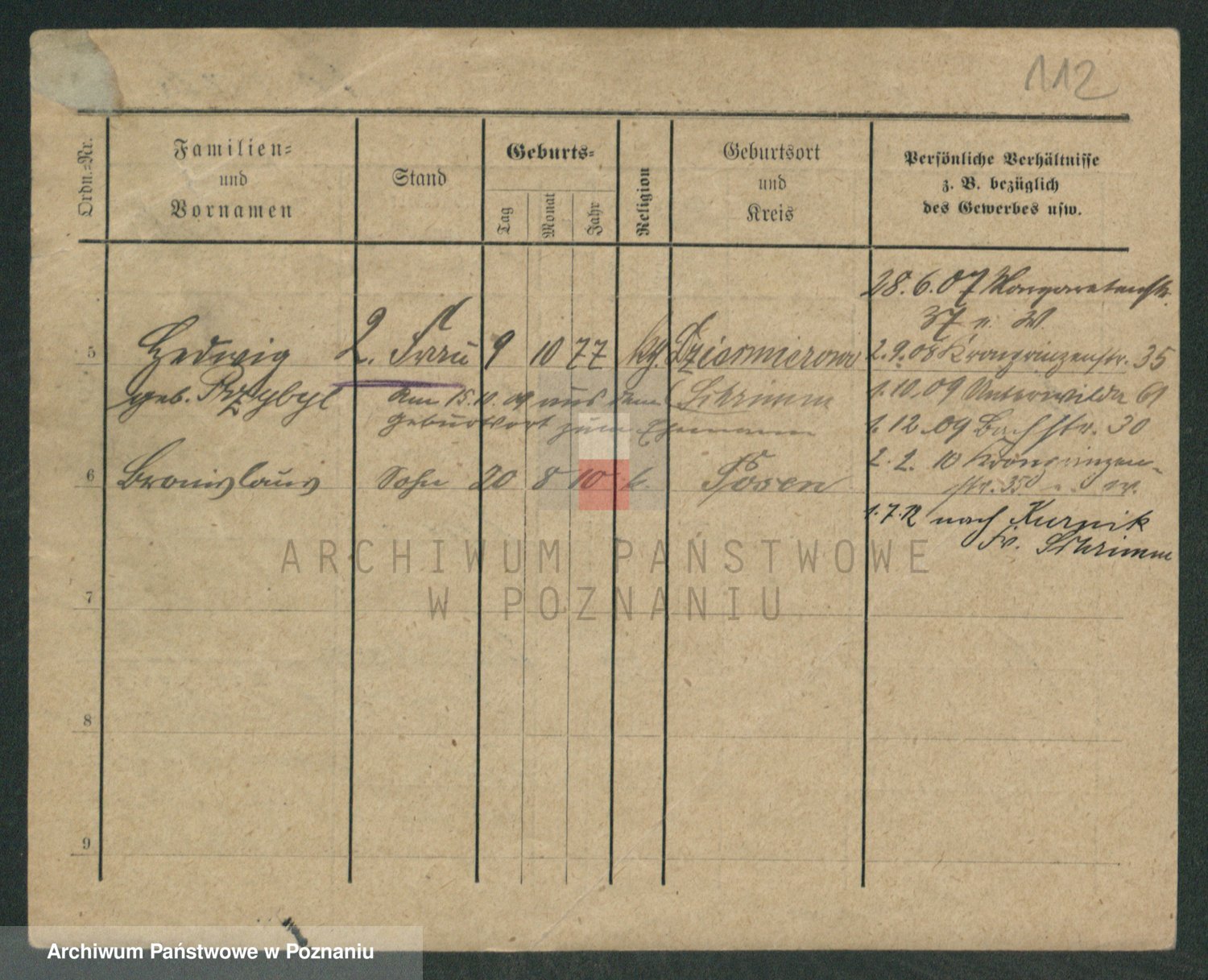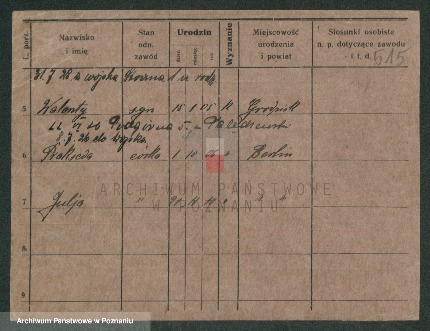Podgląd karty osobowej dostępny jest po kliknięciu na nazwisko lub ikonkę karty. Można dokonywać powiększenia (ikony na górze) lub przechodzić między kolejnymi skanami (strzałki po bokach).