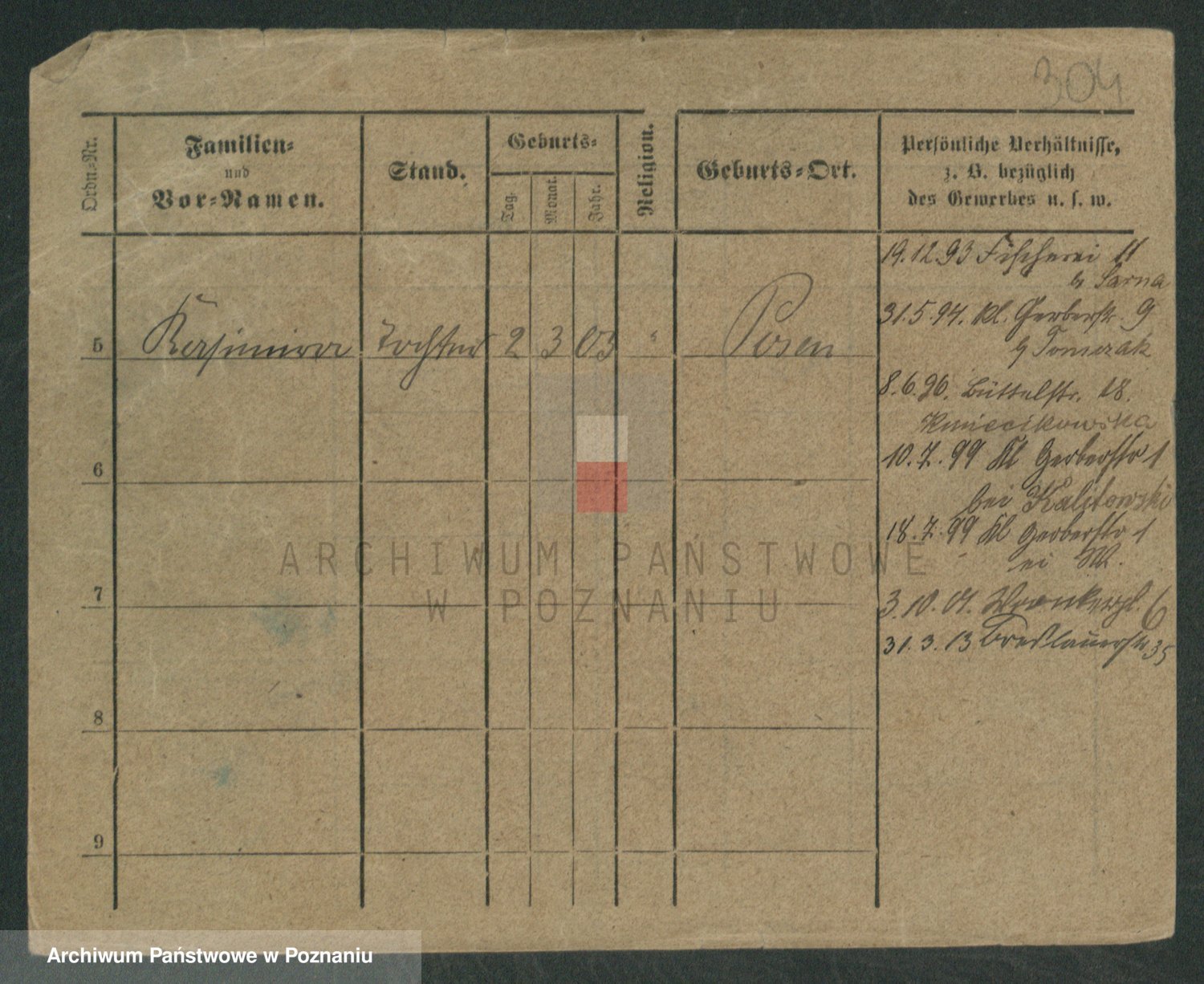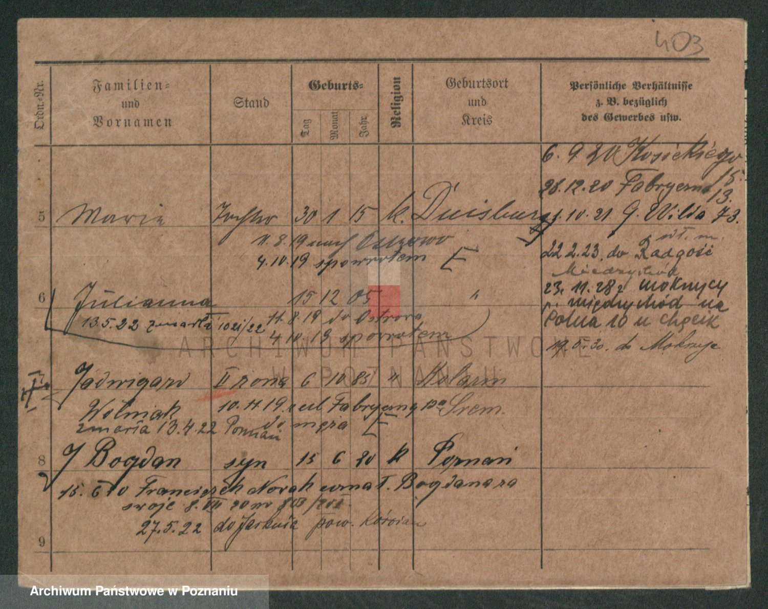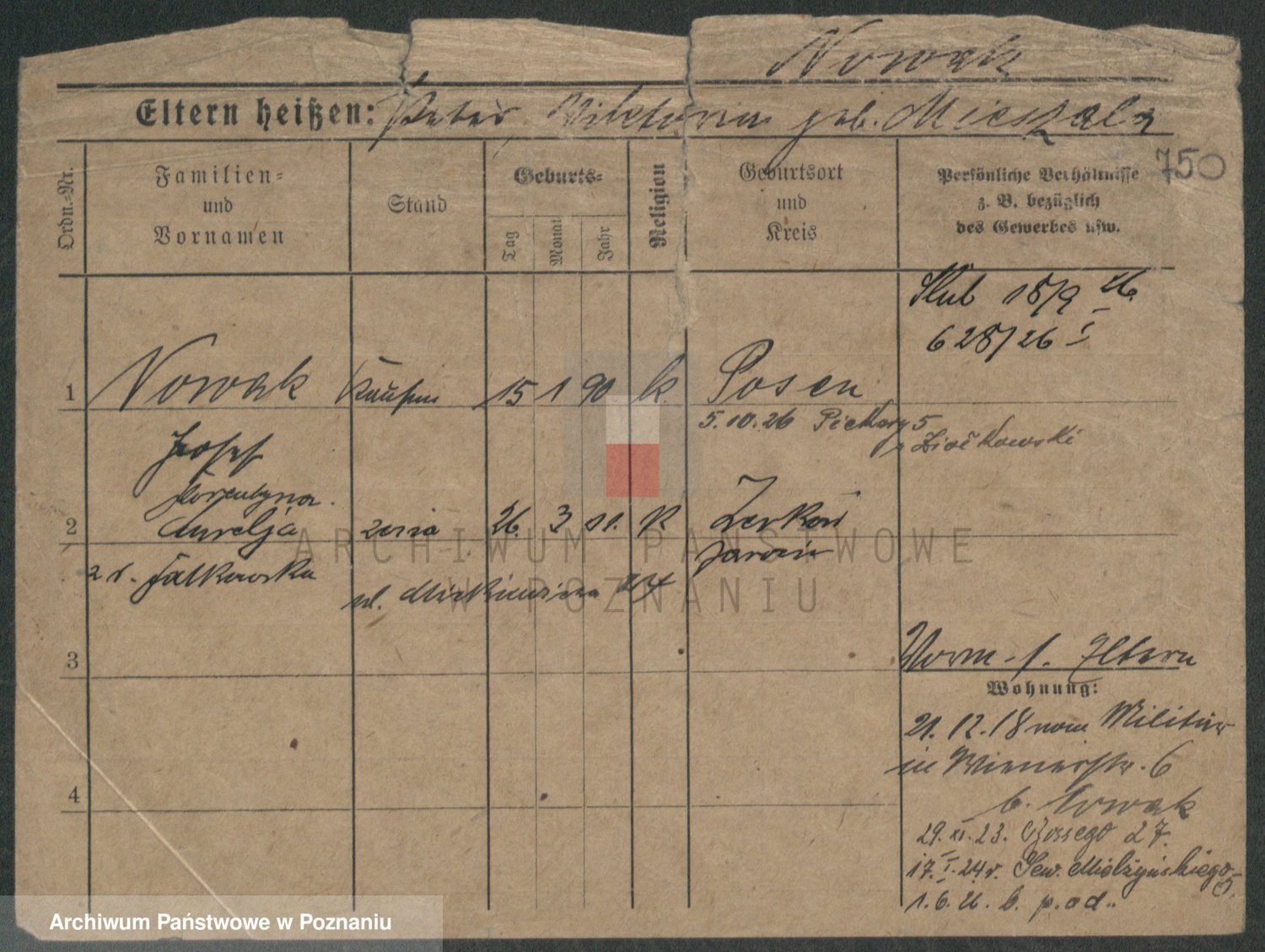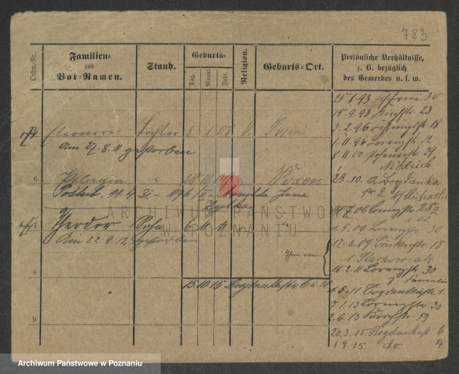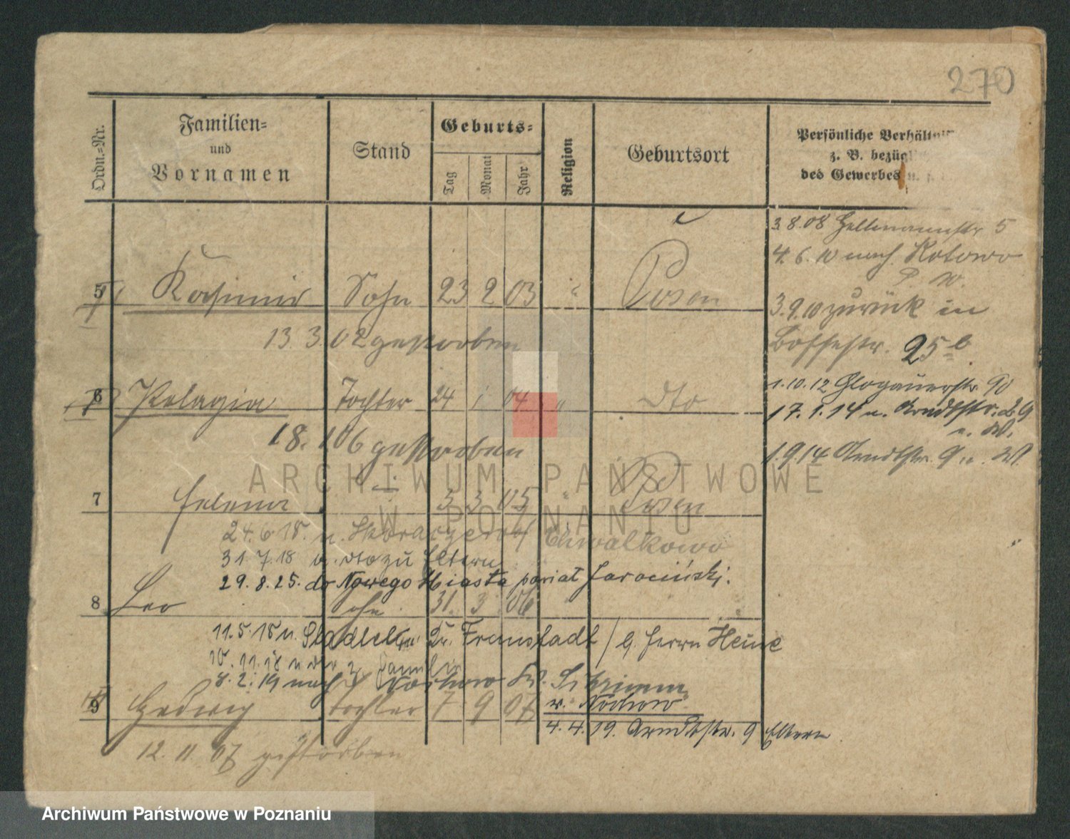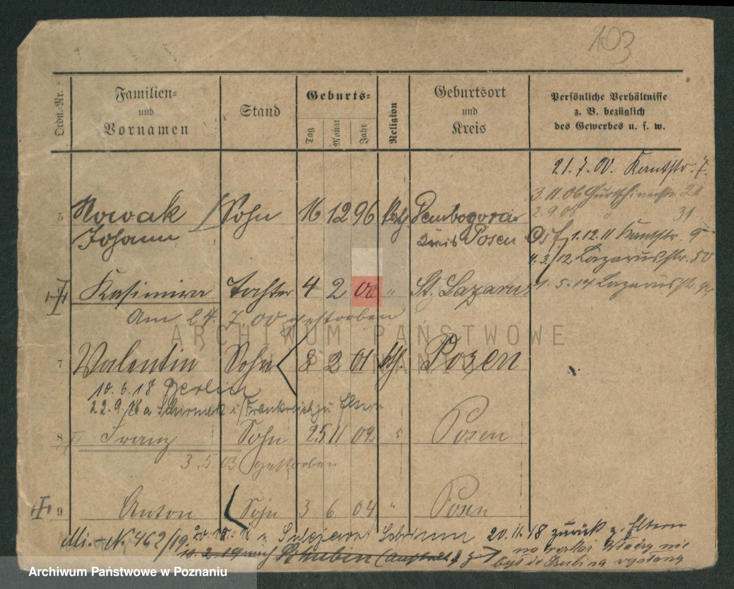Podgląd karty osobowej dostępny jest po kliknięciu na nazwisko lub ikonkę karty. Można dokonywać powiększenia (ikony na górze) lub przechodzić między kolejnymi skanami (strzałki po bokach).