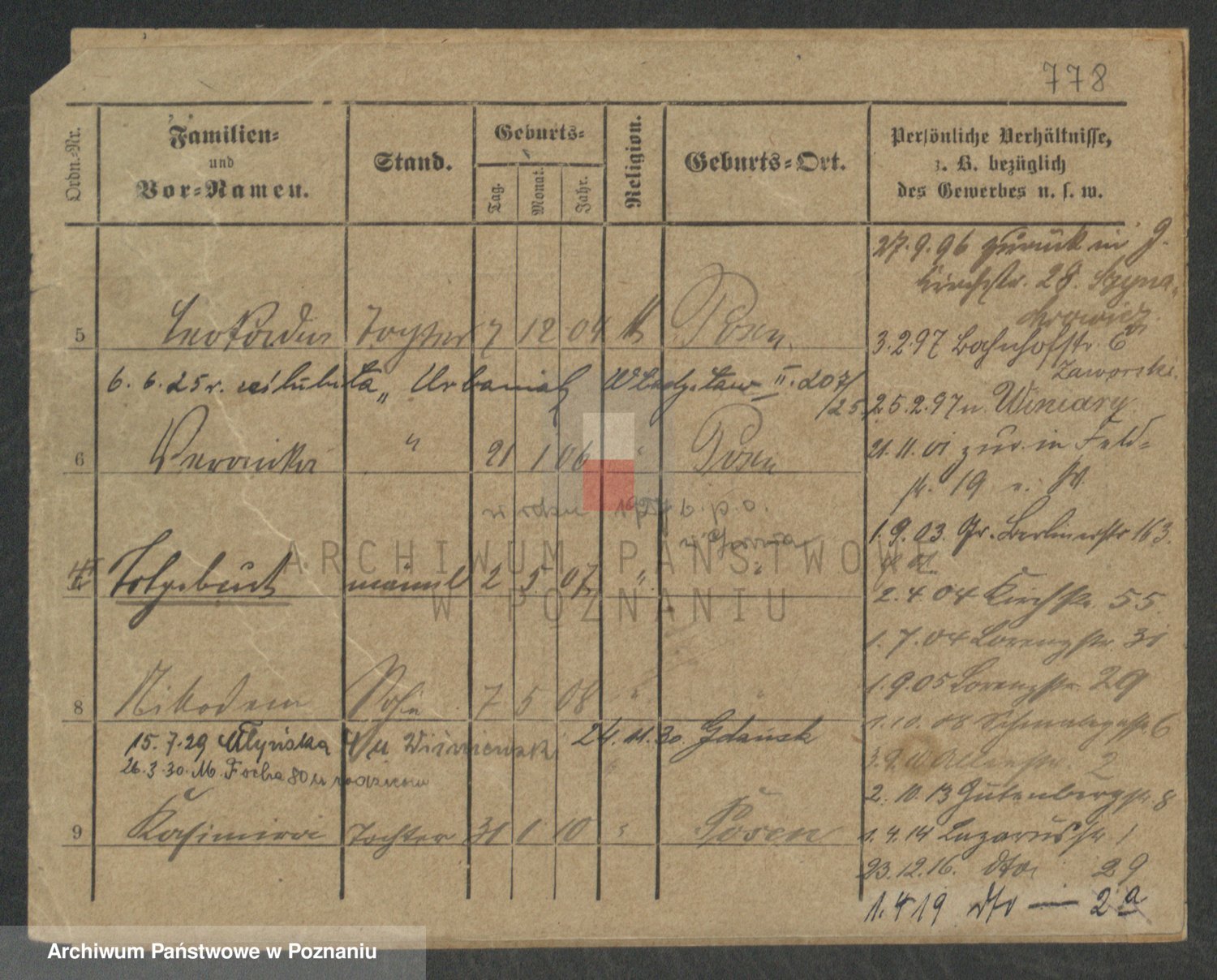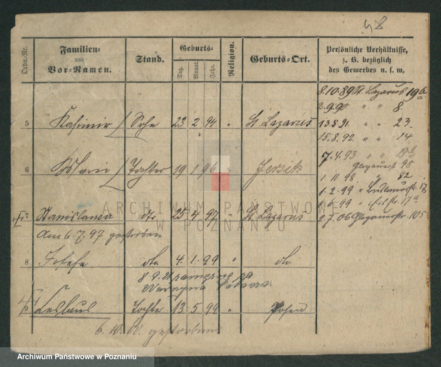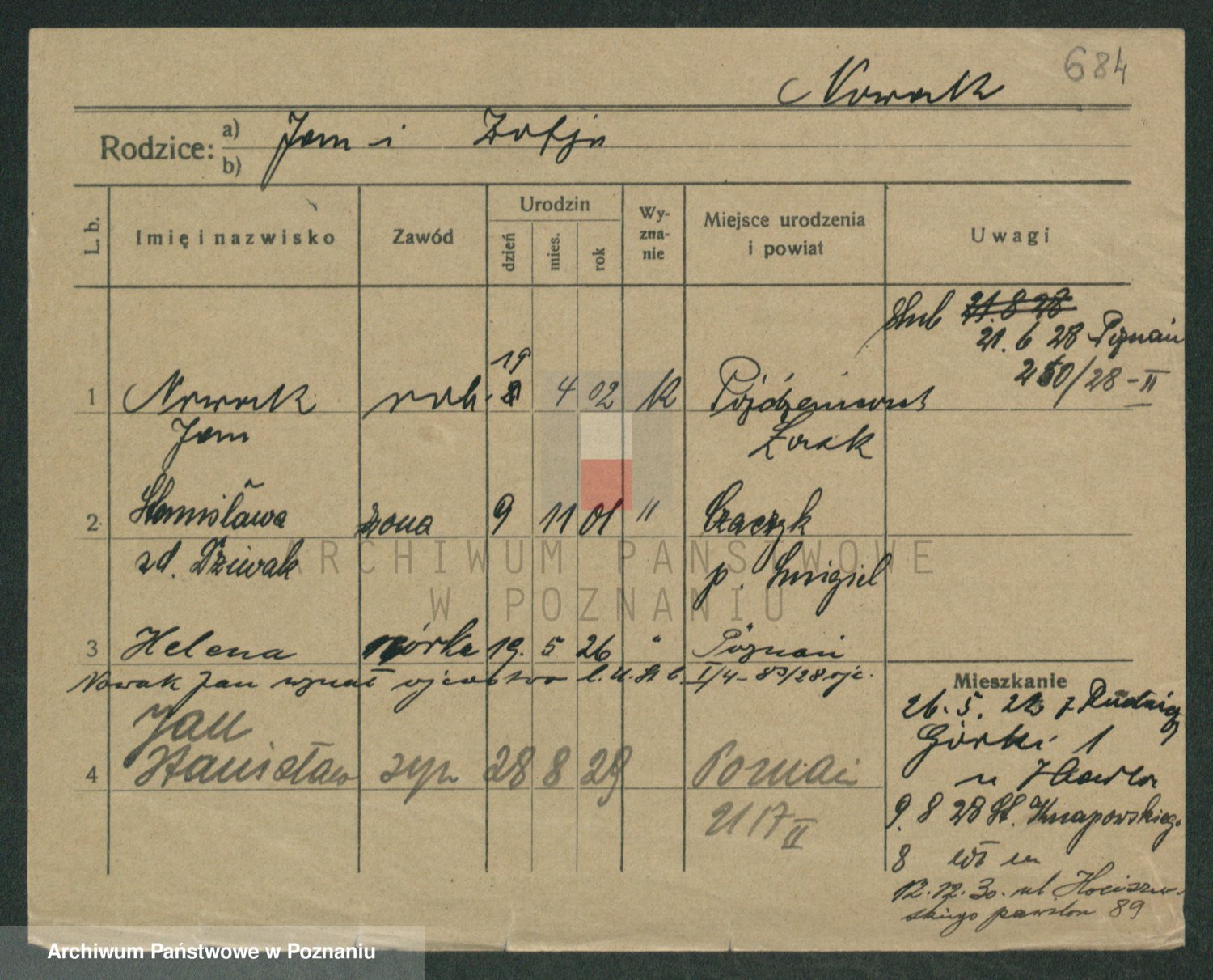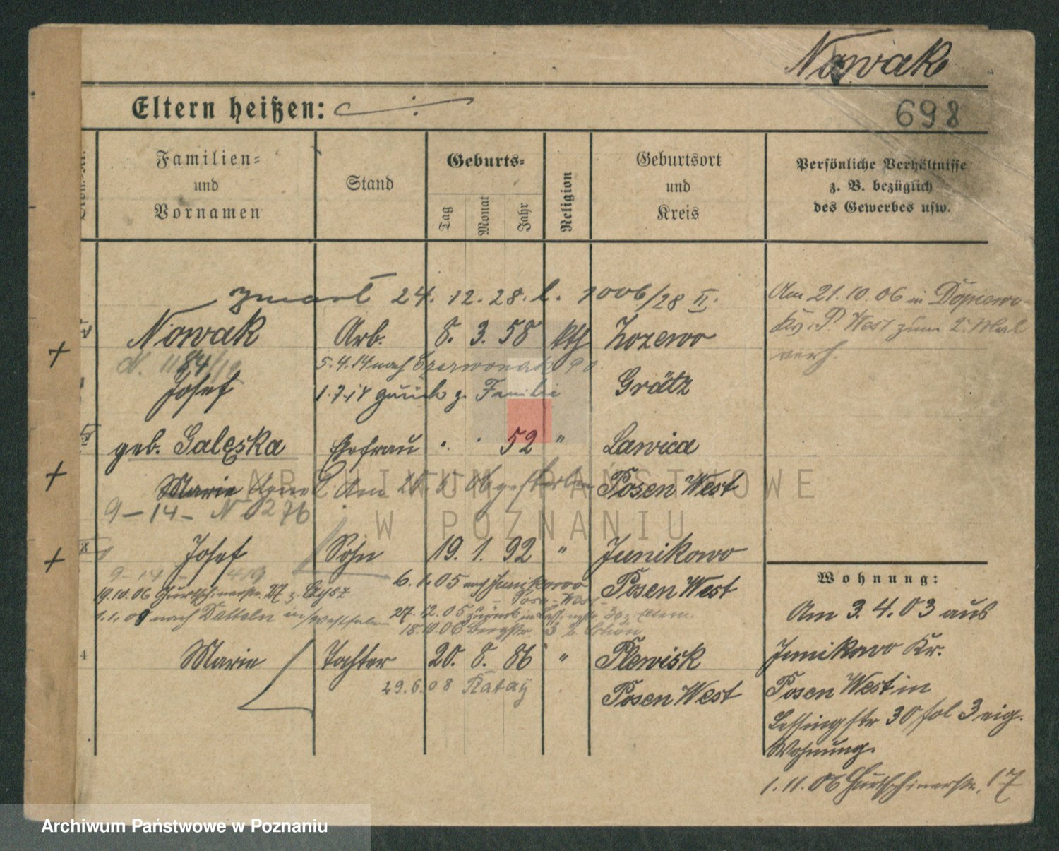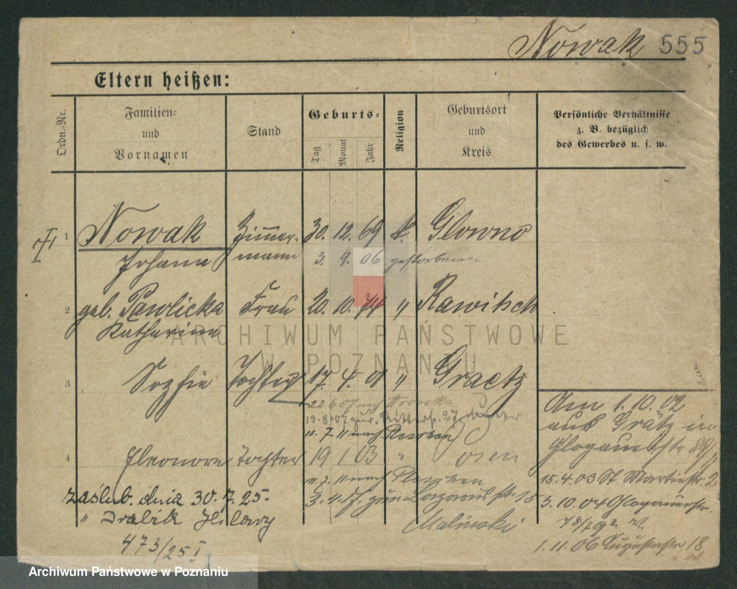 Podgląd karty osobowej dostępny jest po kliknięciu na nazwisko lub ikonkę karty. Można dokonywać powiększenia (ikony na górze) lub przechodzić między kolejnymi skanami (strzałki po bokach).