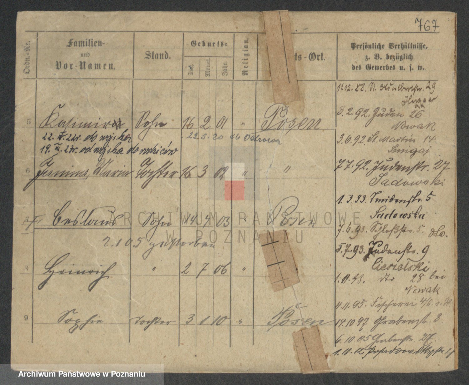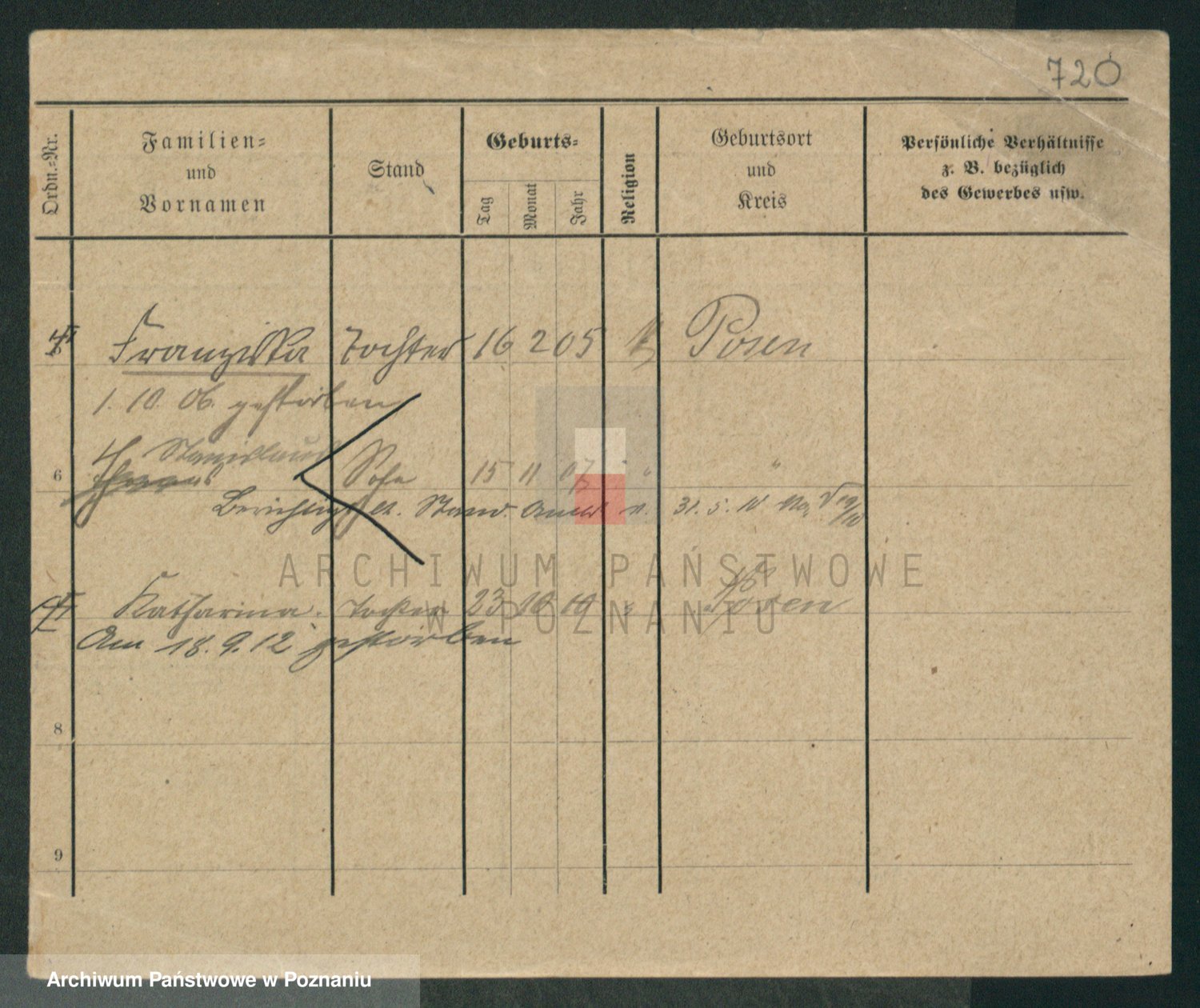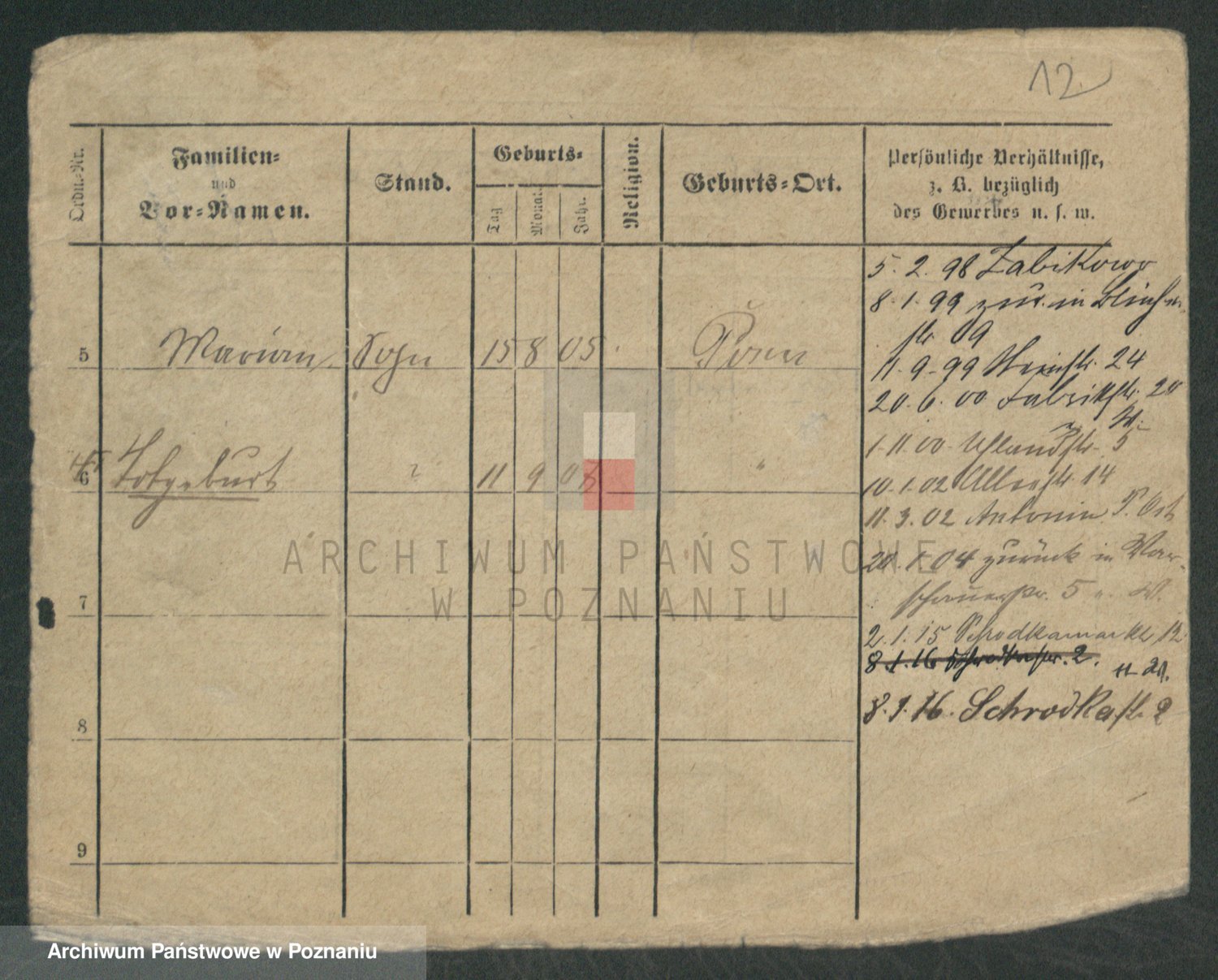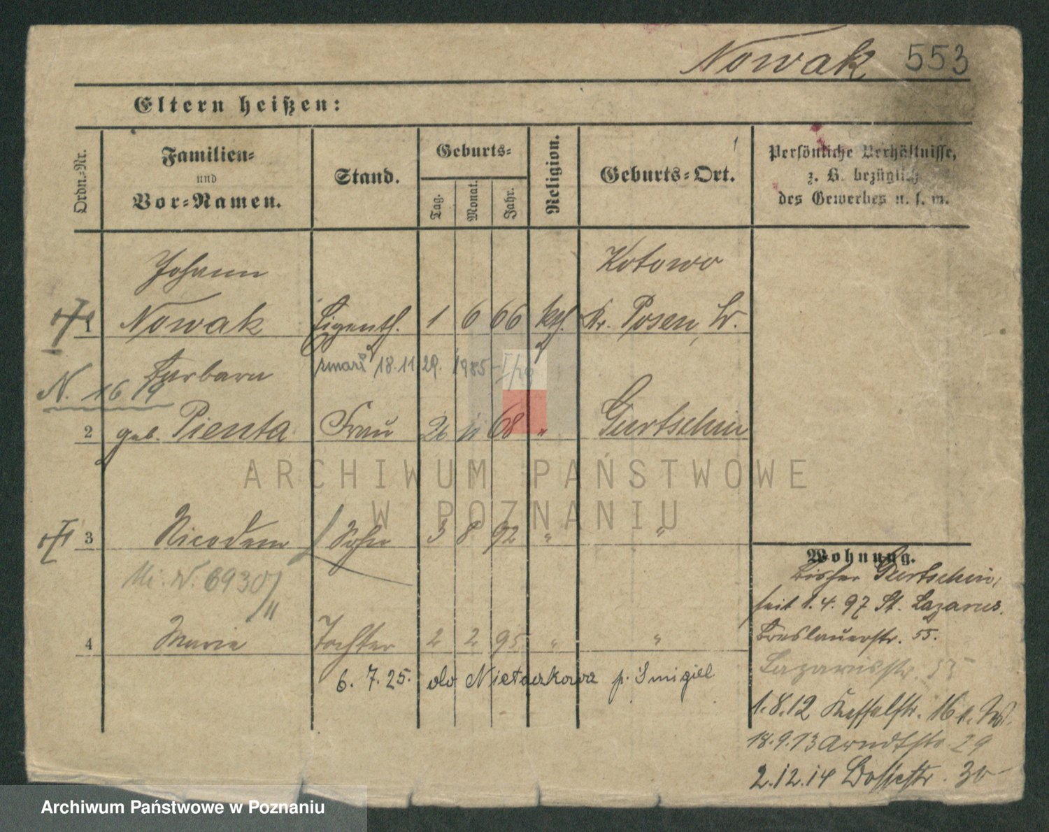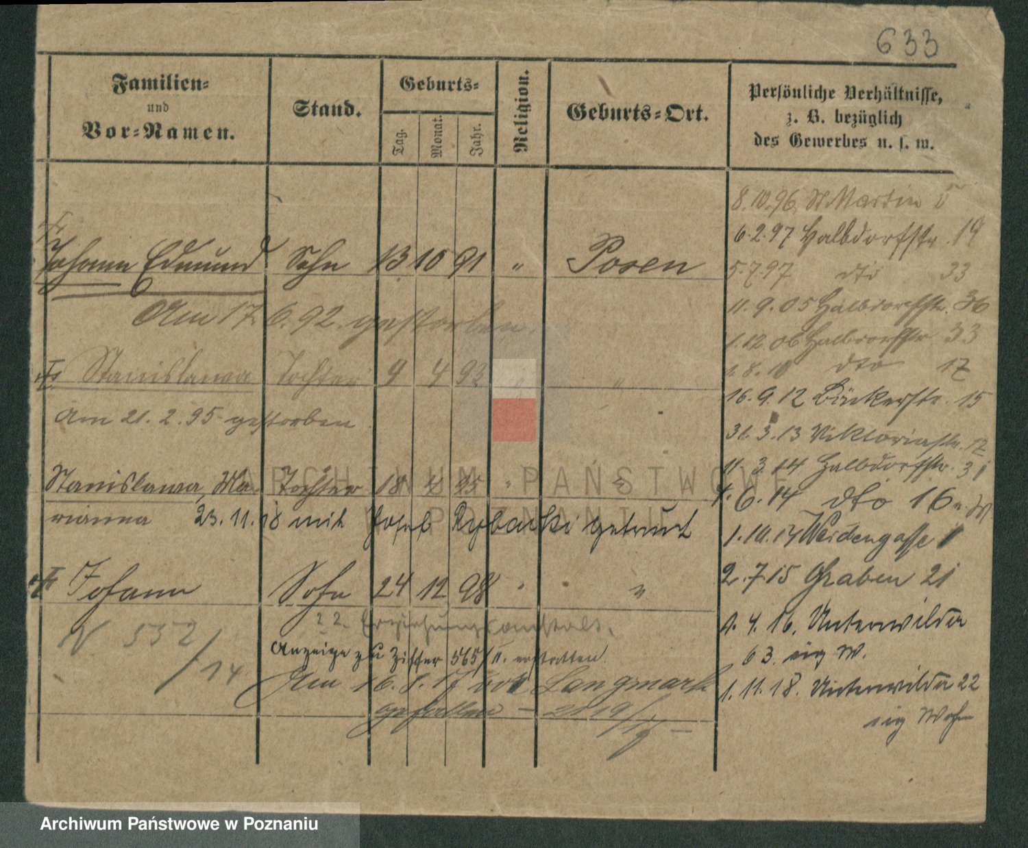 Podgląd karty osobowej dostępny jest po kliknięciu na nazwisko lub ikonkę karty. Można dokonywać powiększenia (ikony na górze) lub przechodzić między kolejnymi skanami (strzałki po bokach).