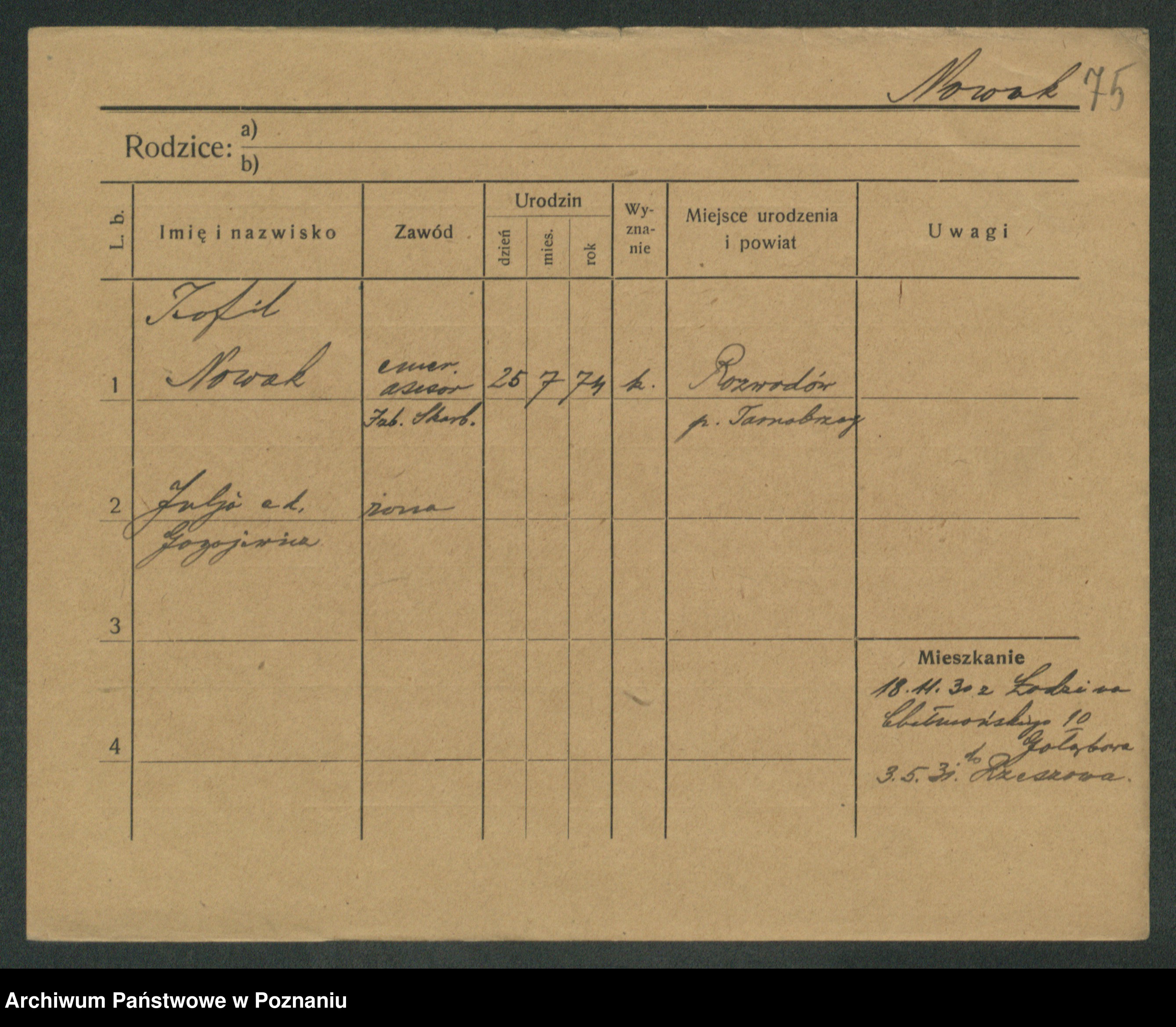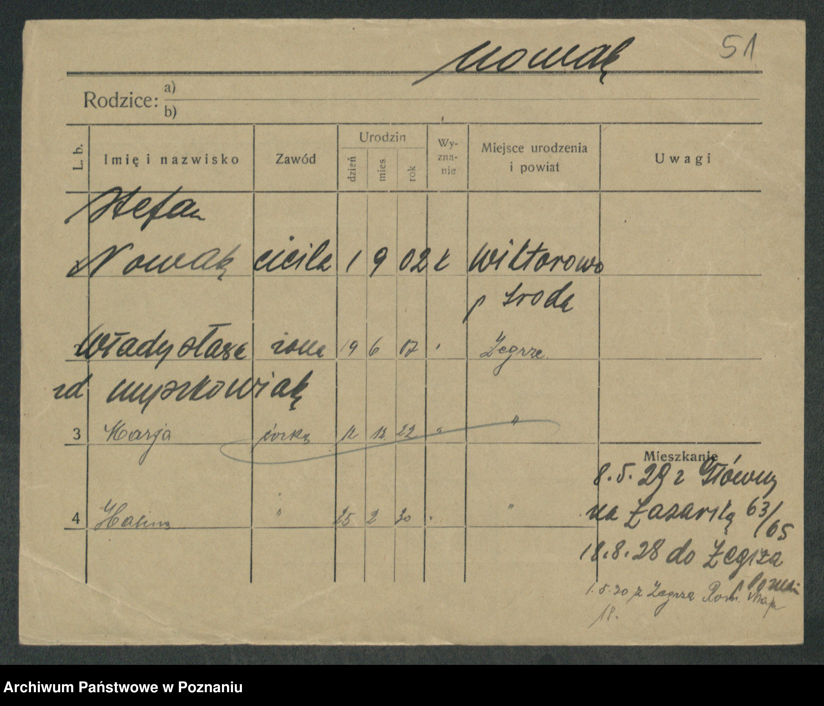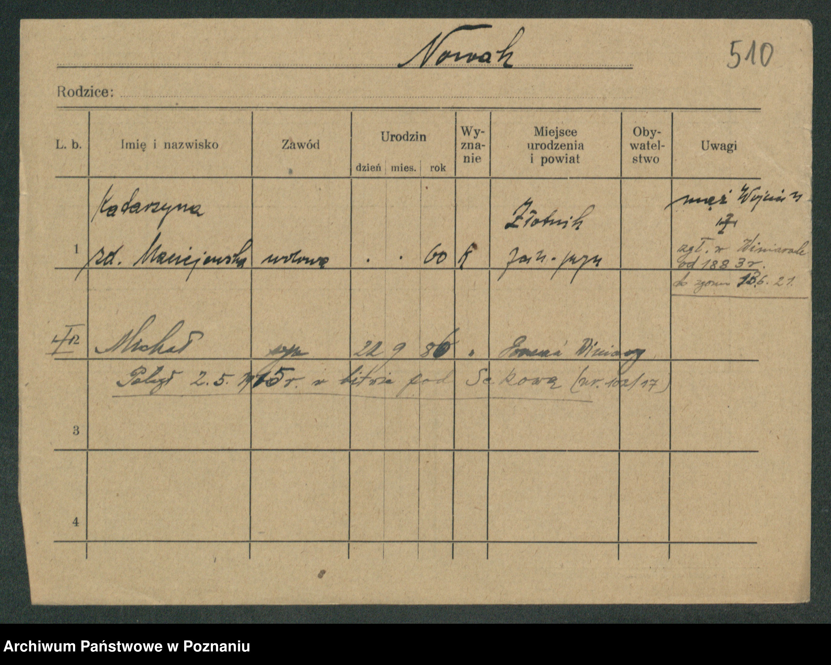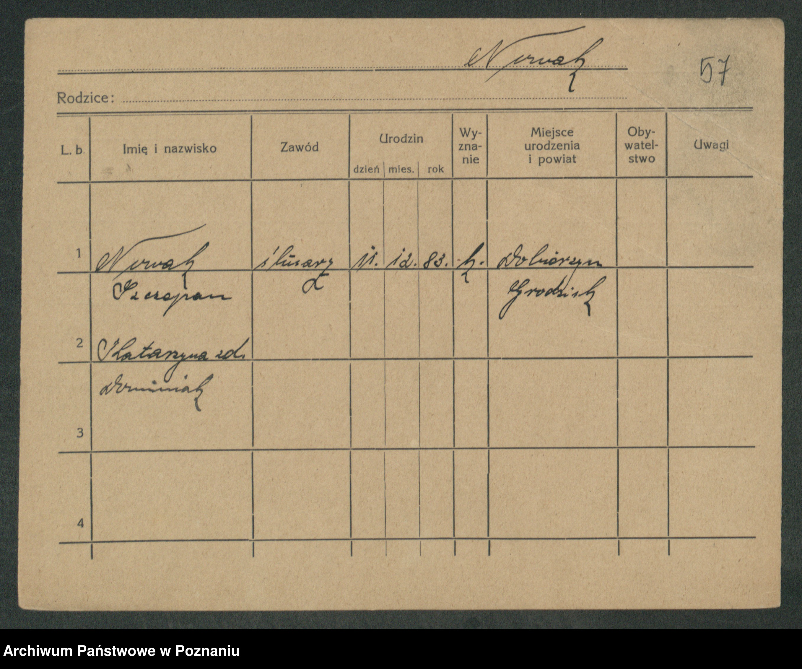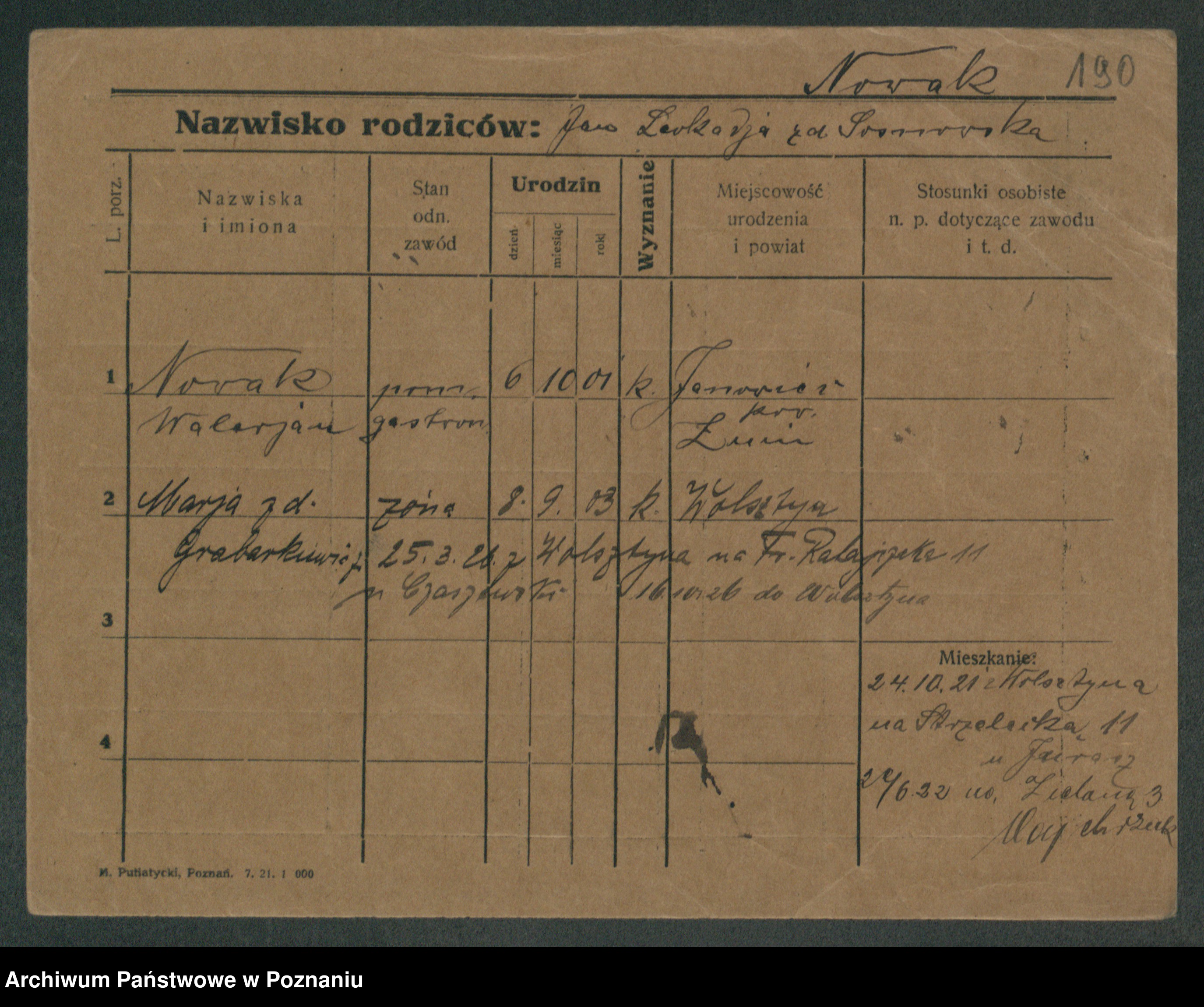 Podgląd karty osobowej dostępny jest po kliknięciu na nazwisko lub ikonkę karty. Można dokonywać powiększenia (ikony na górze) lub przechodzić między kolejnymi skanami (strzałki po bokach).