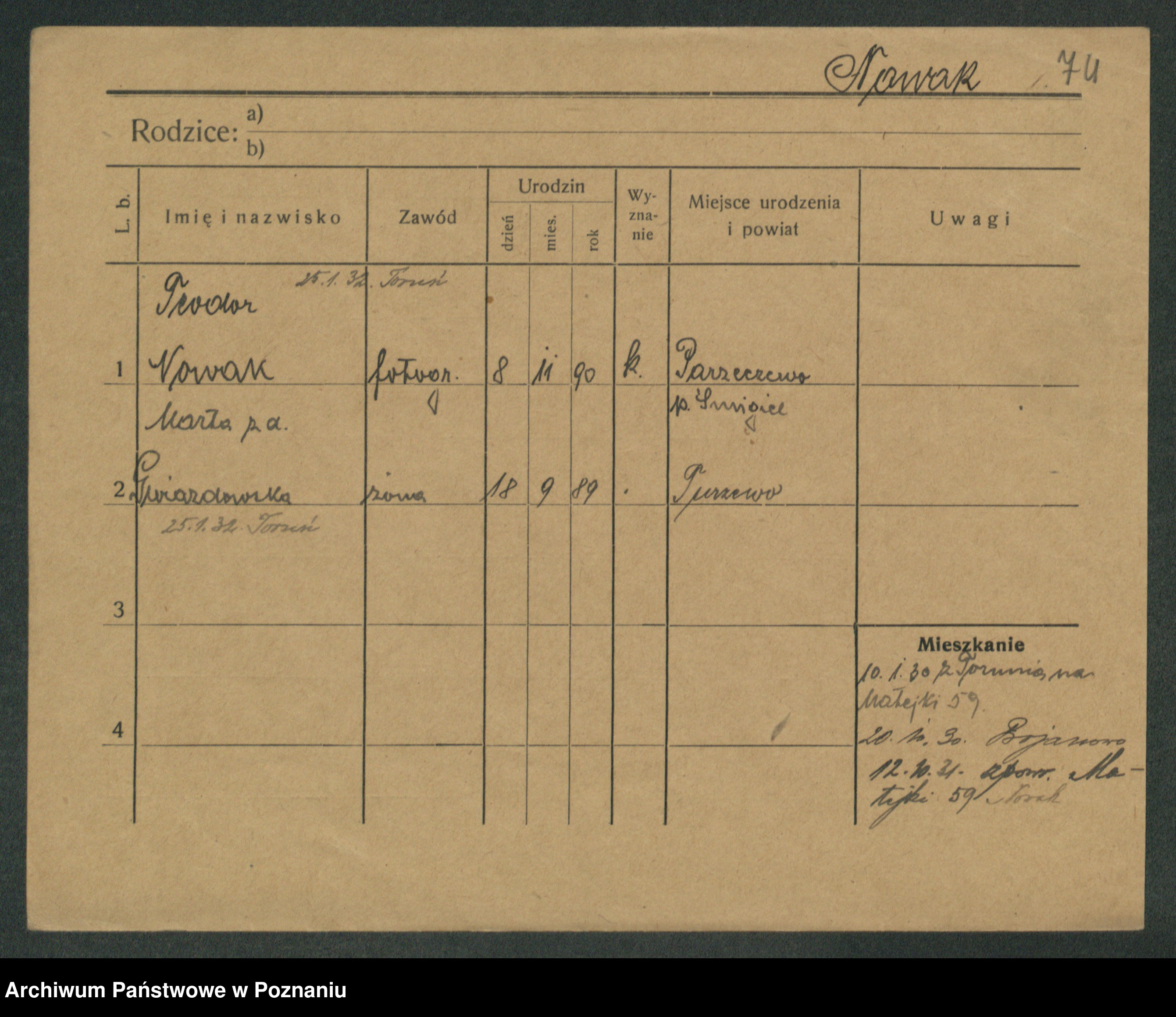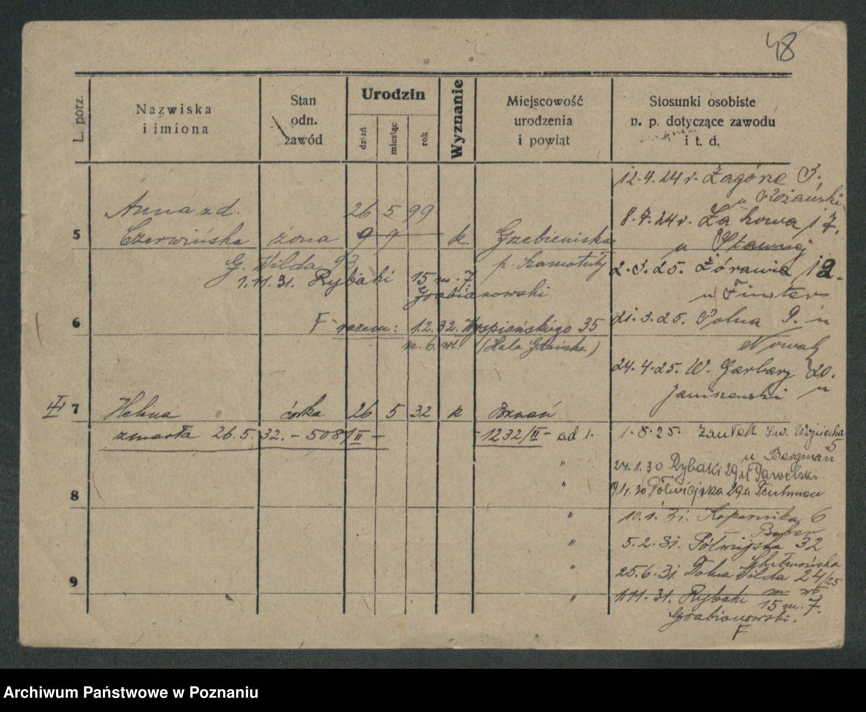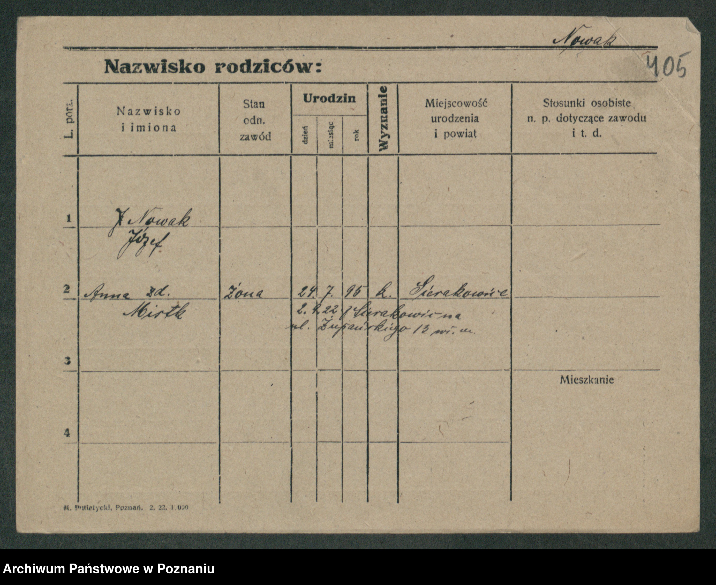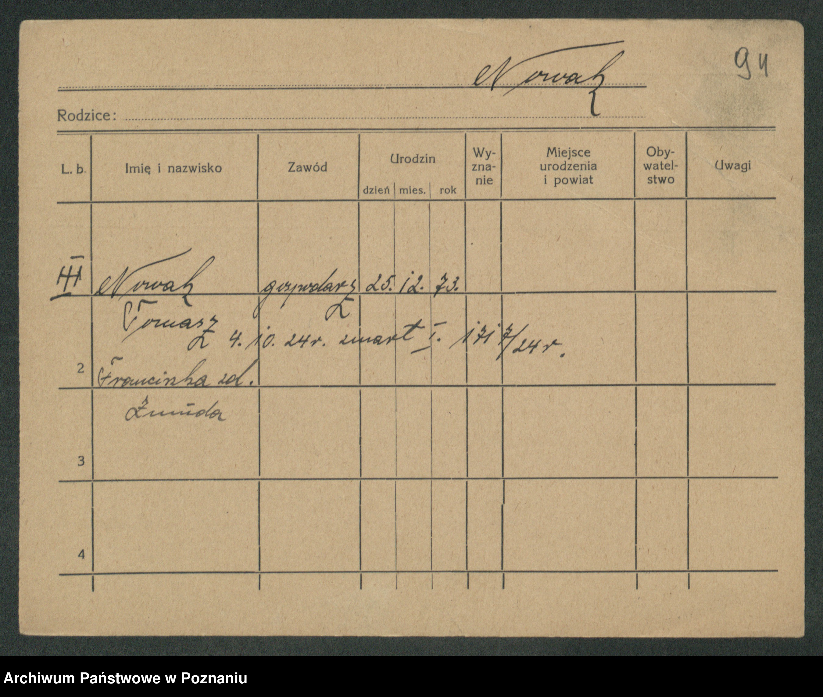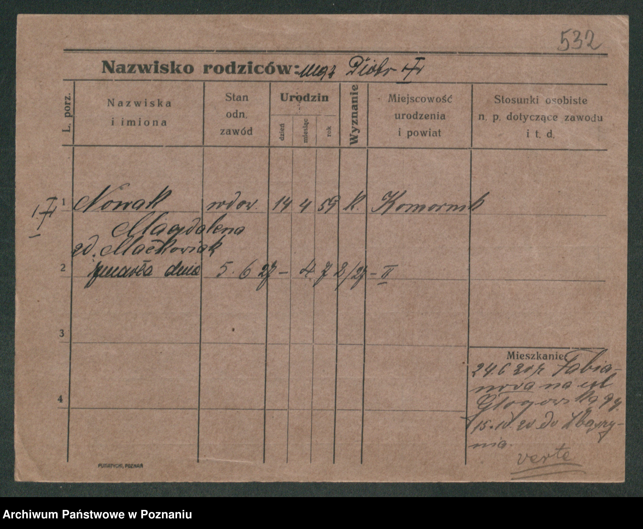 Podgląd karty osobowej dostępny jest po kliknięciu na nazwisko lub ikonkę karty. Można dokonywać powiększenia (ikony na górze) lub przechodzić między kolejnymi skanami (strzałki po bokach).
