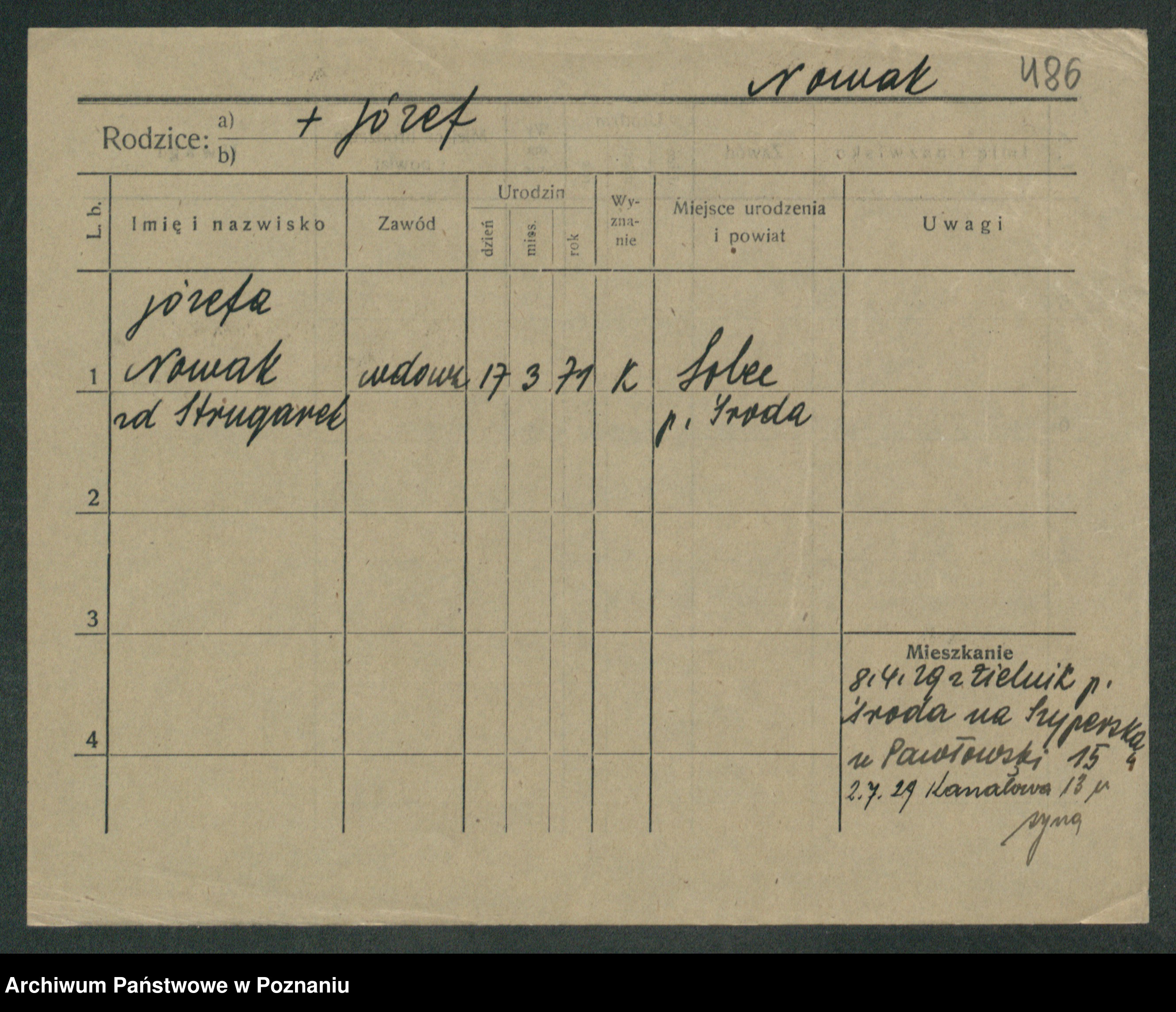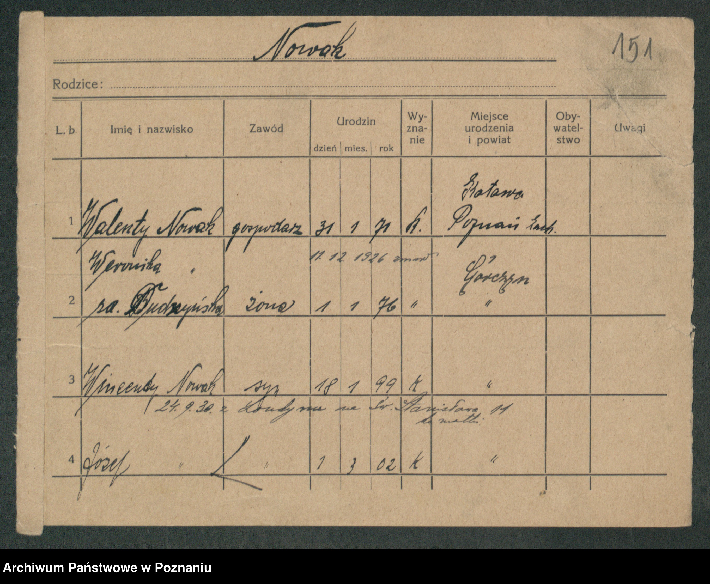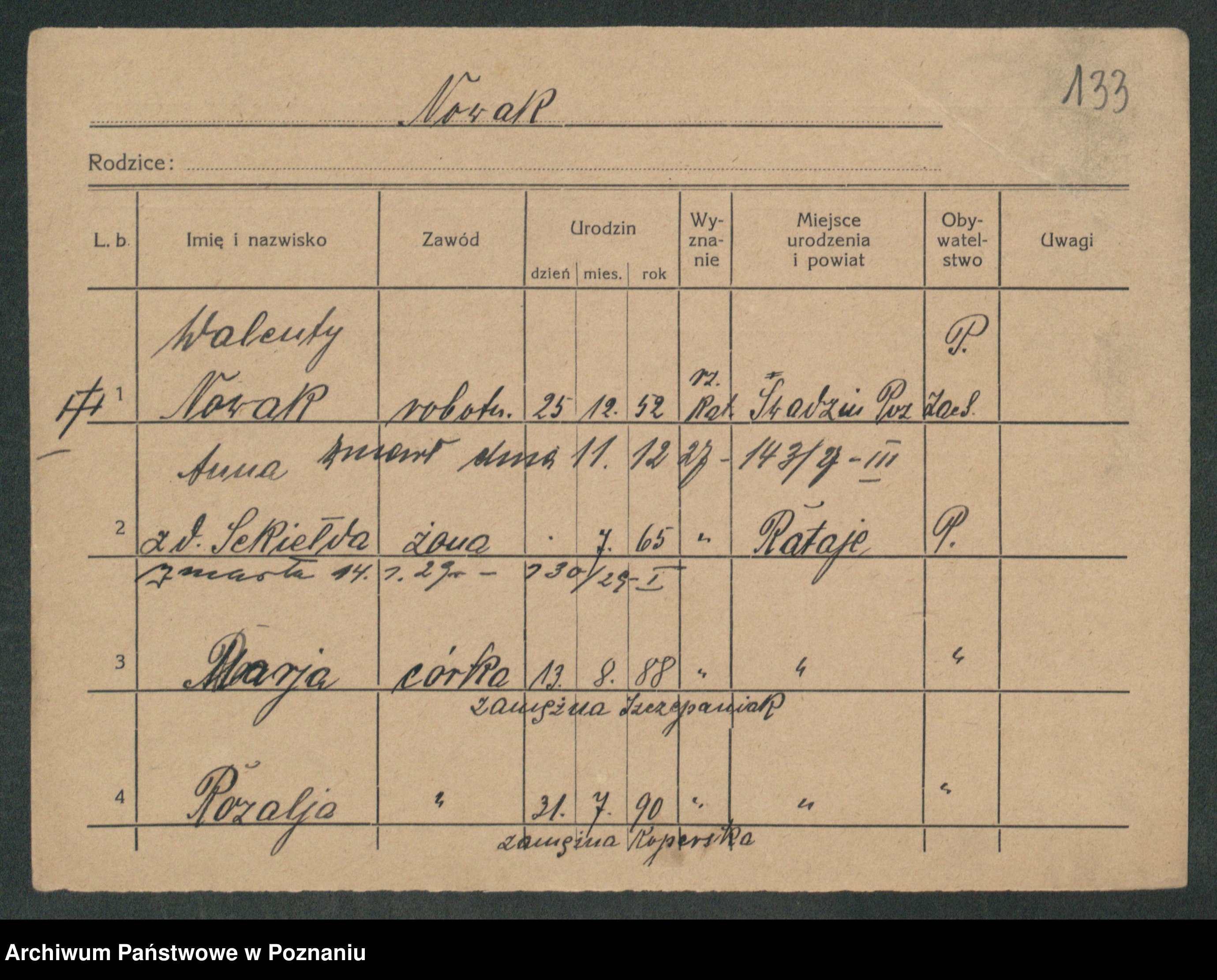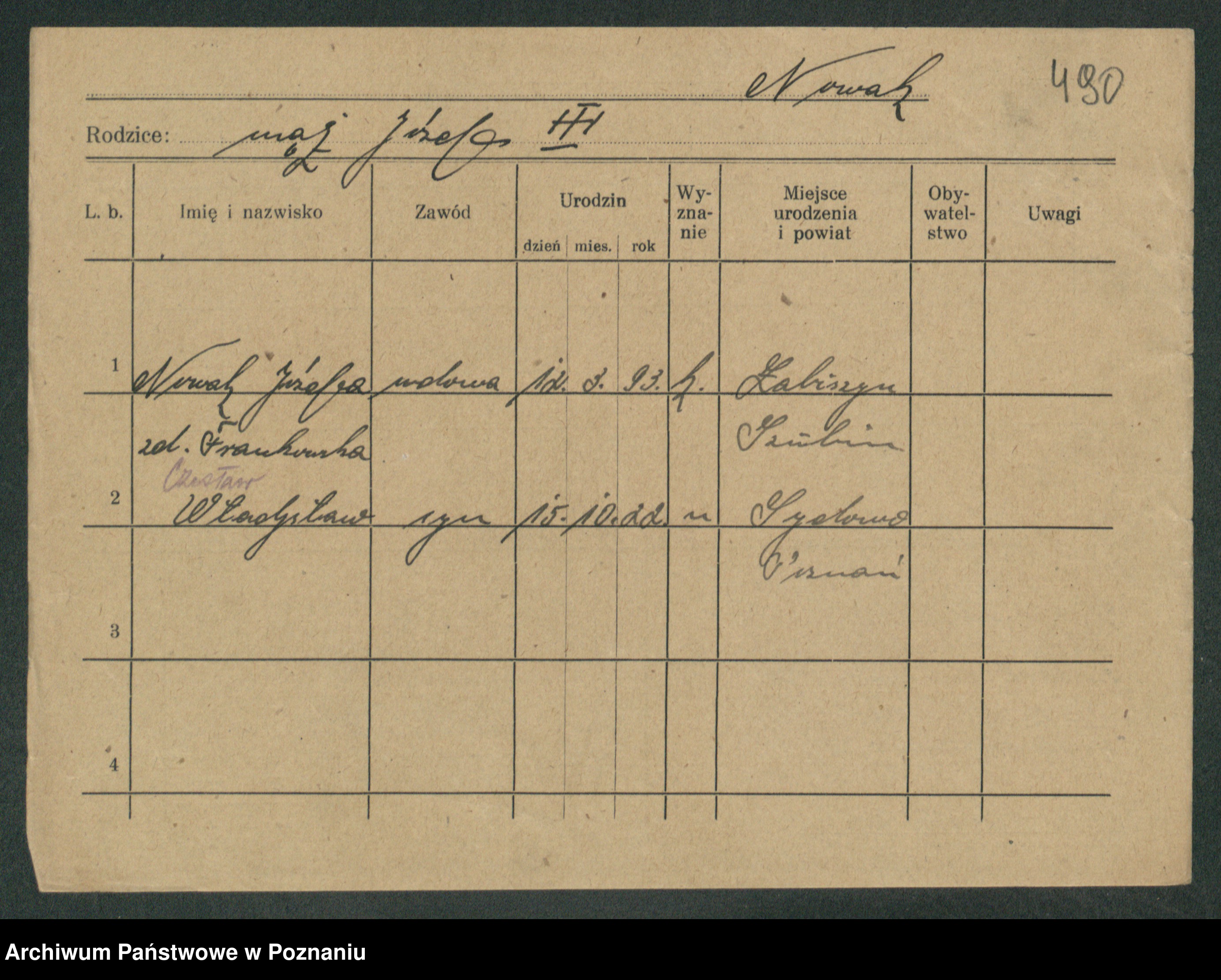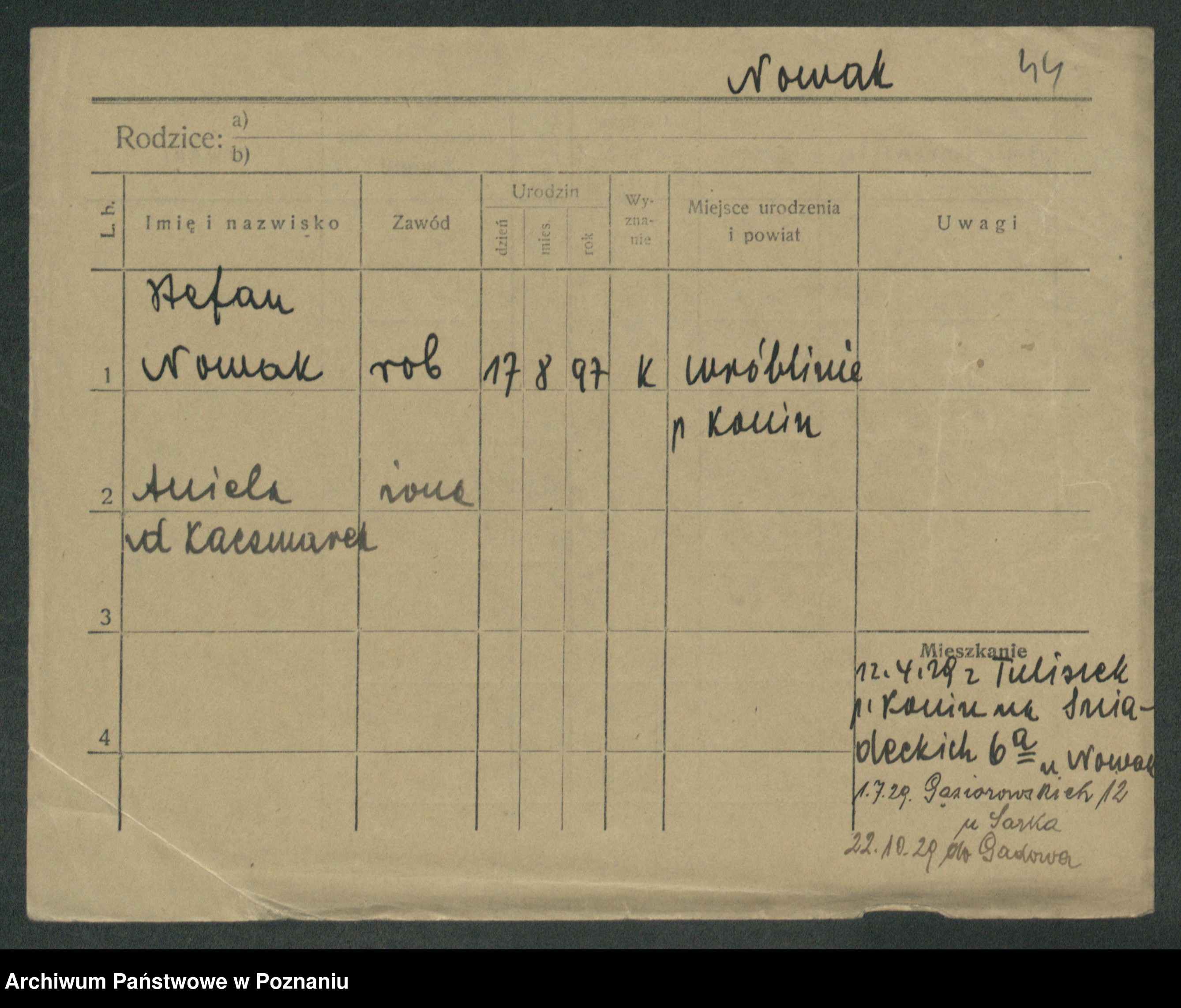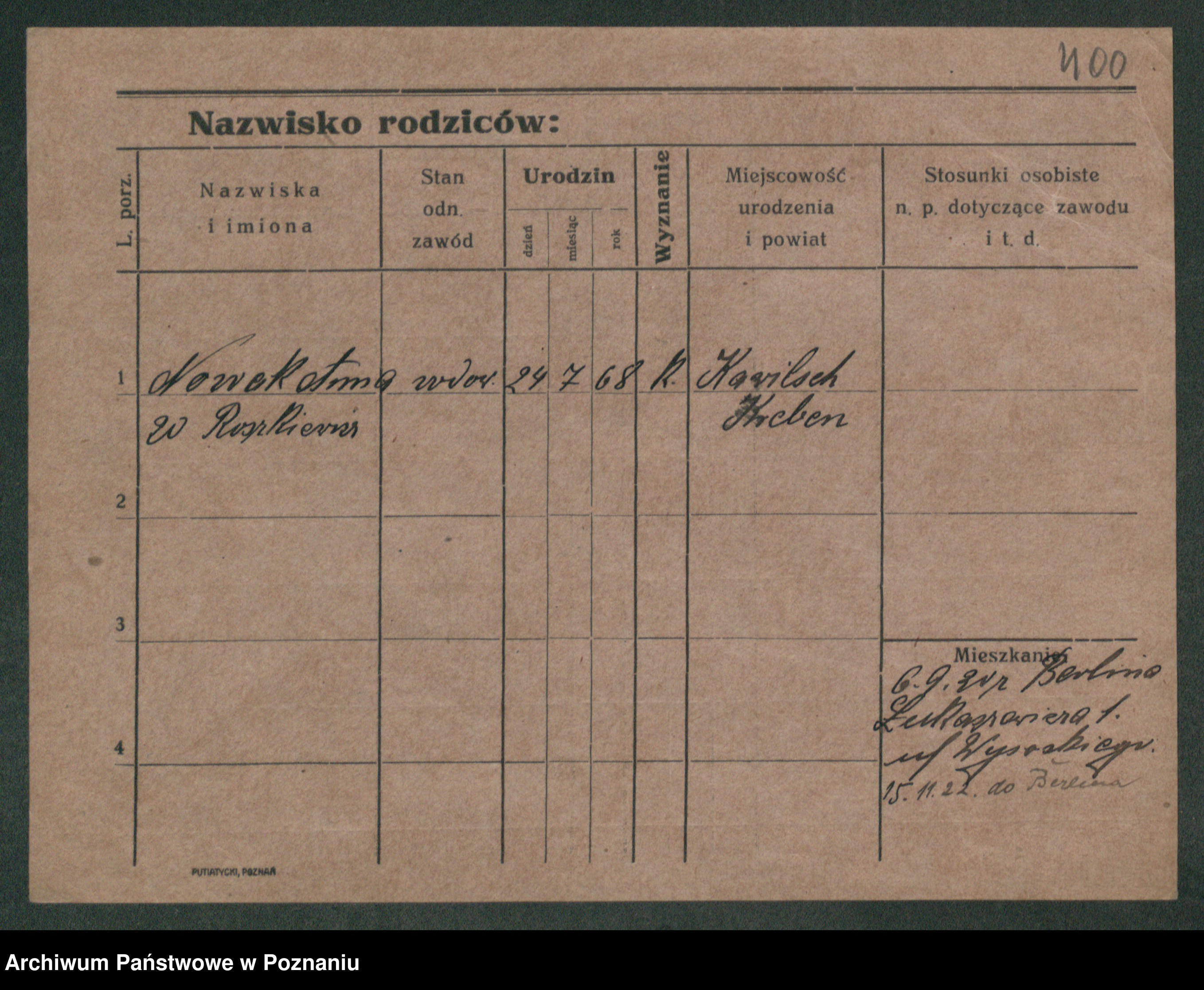 Podgląd karty osobowej dostępny jest po kliknięciu na nazwisko lub ikonkę karty. Można dokonywać powiększenia (ikony na górze) lub przechodzić między kolejnymi skanami (strzałki po bokach).