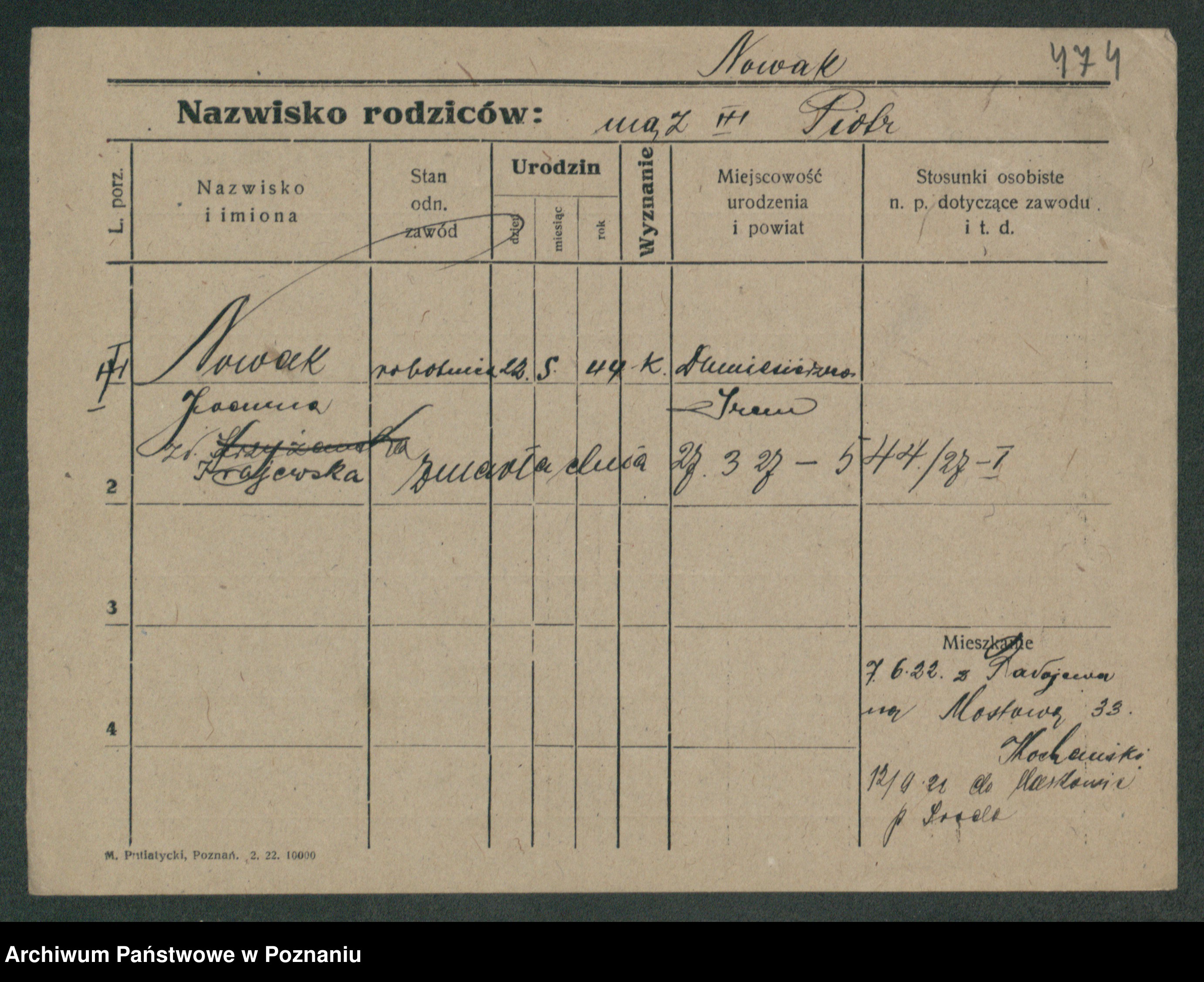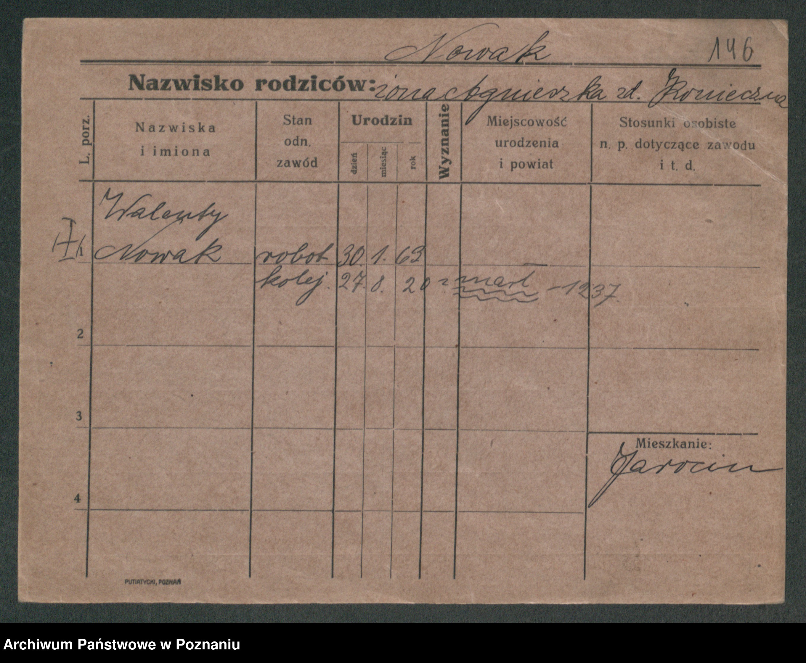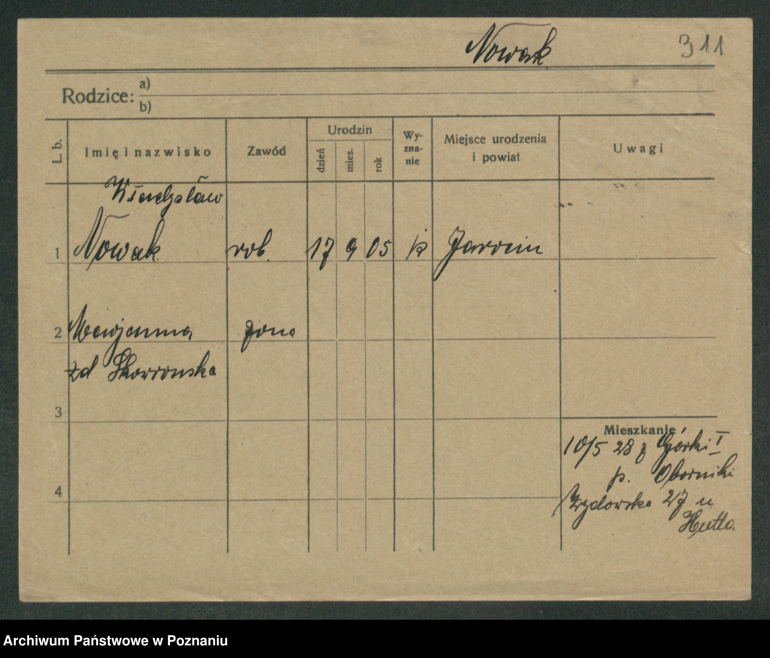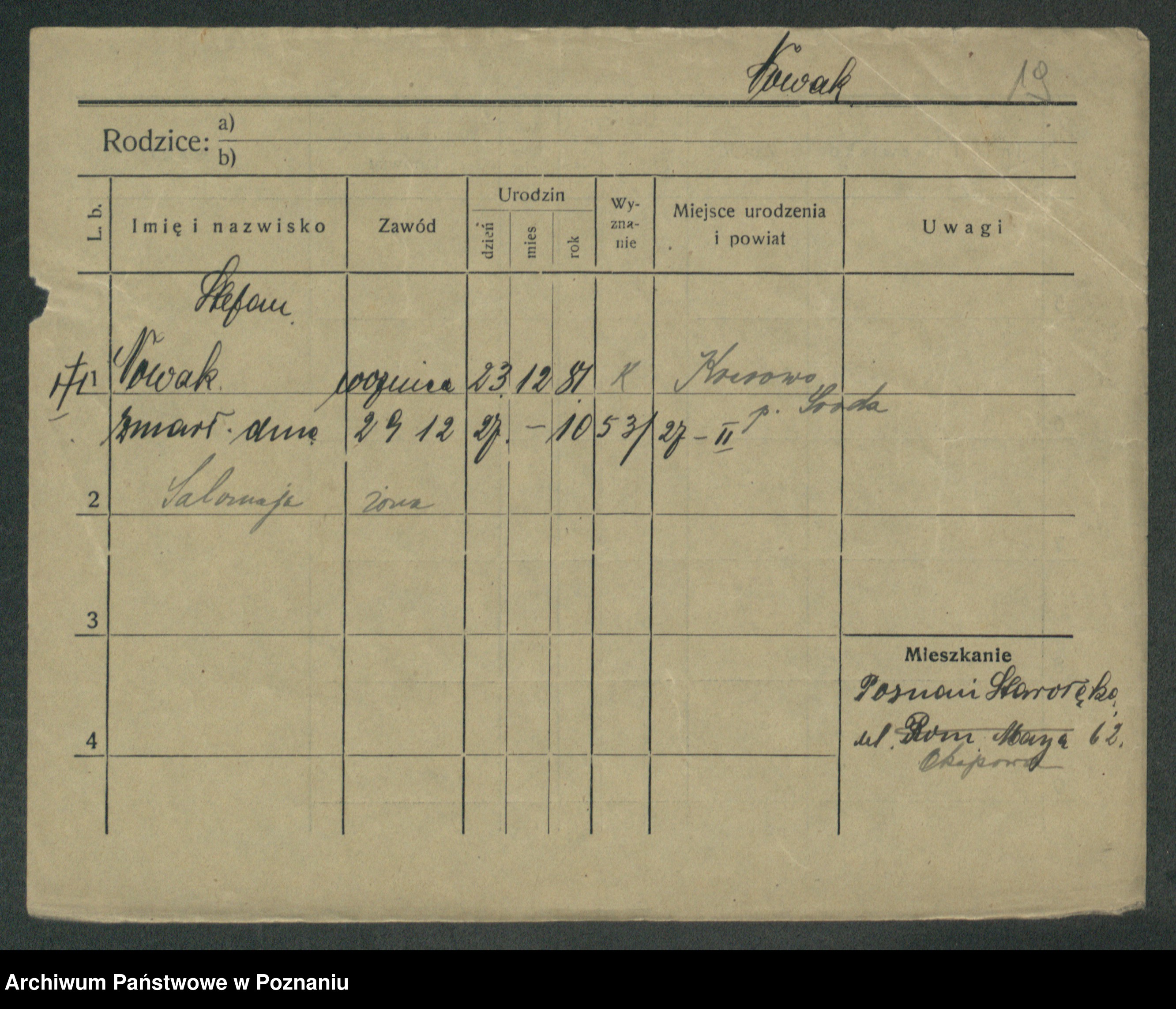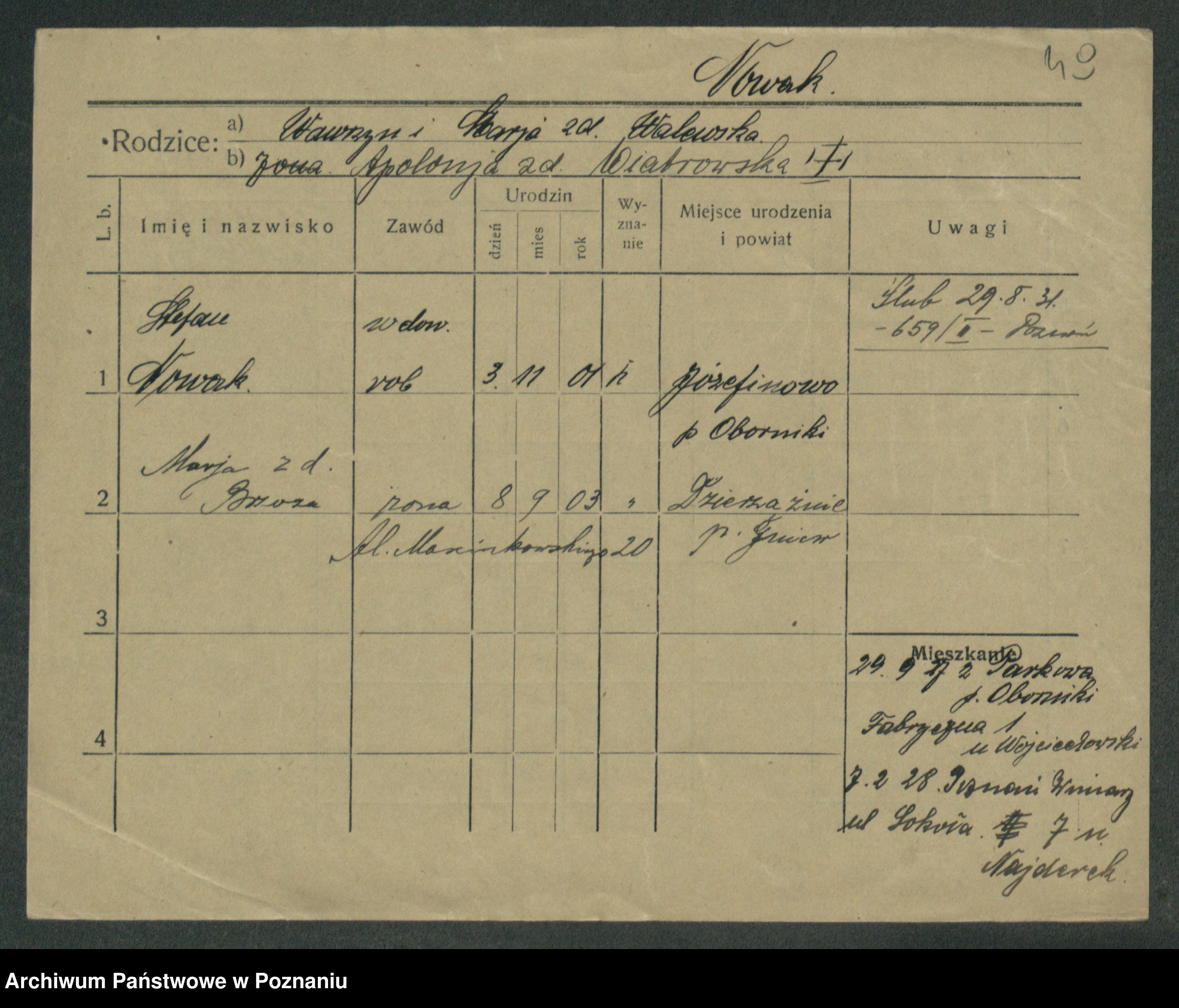 Podgląd karty osobowej dostępny jest po kliknięciu na nazwisko lub ikonkę karty. Można dokonywać powiększenia (ikony na górze) lub przechodzić między kolejnymi skanami (strzałki po bokach).