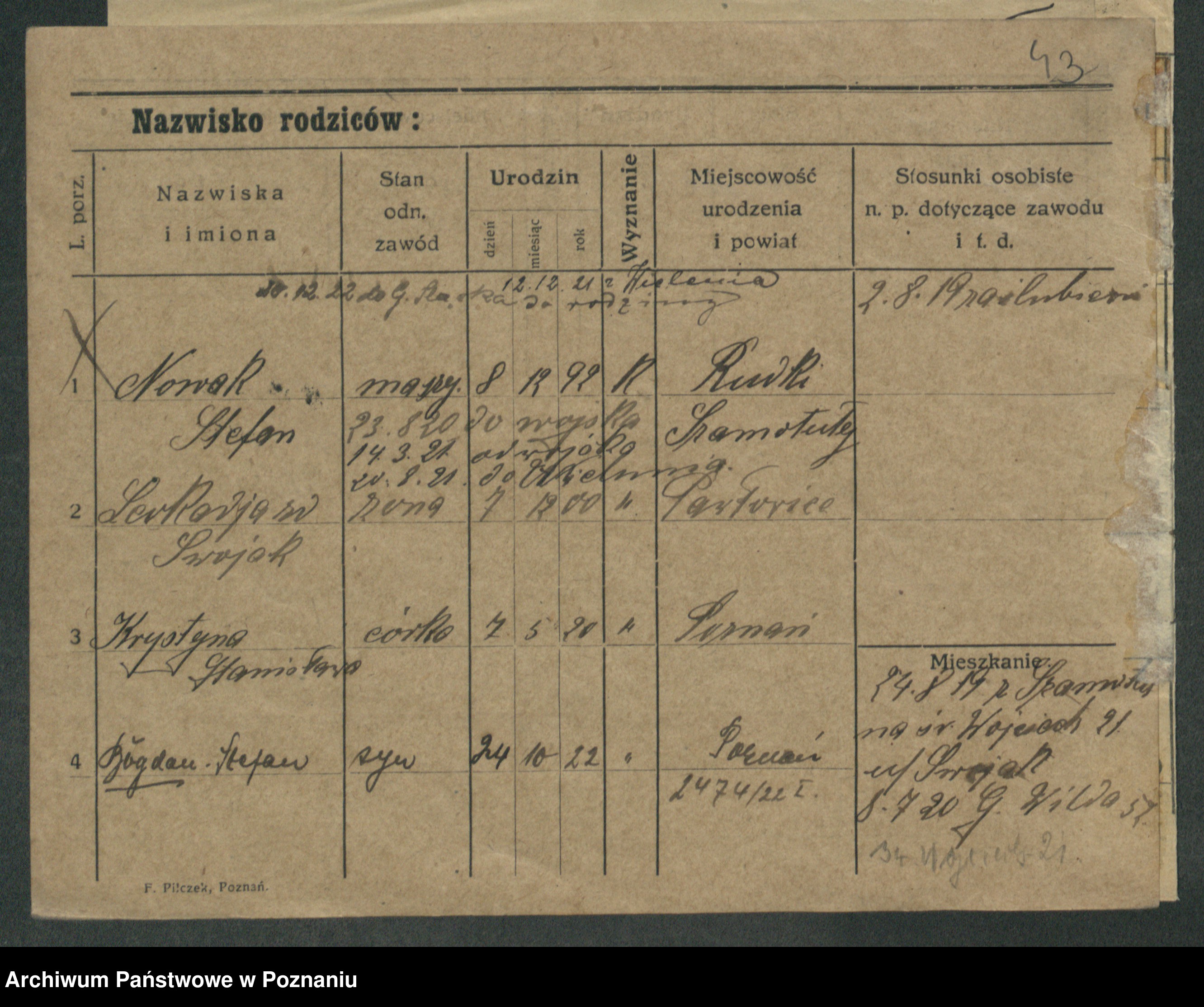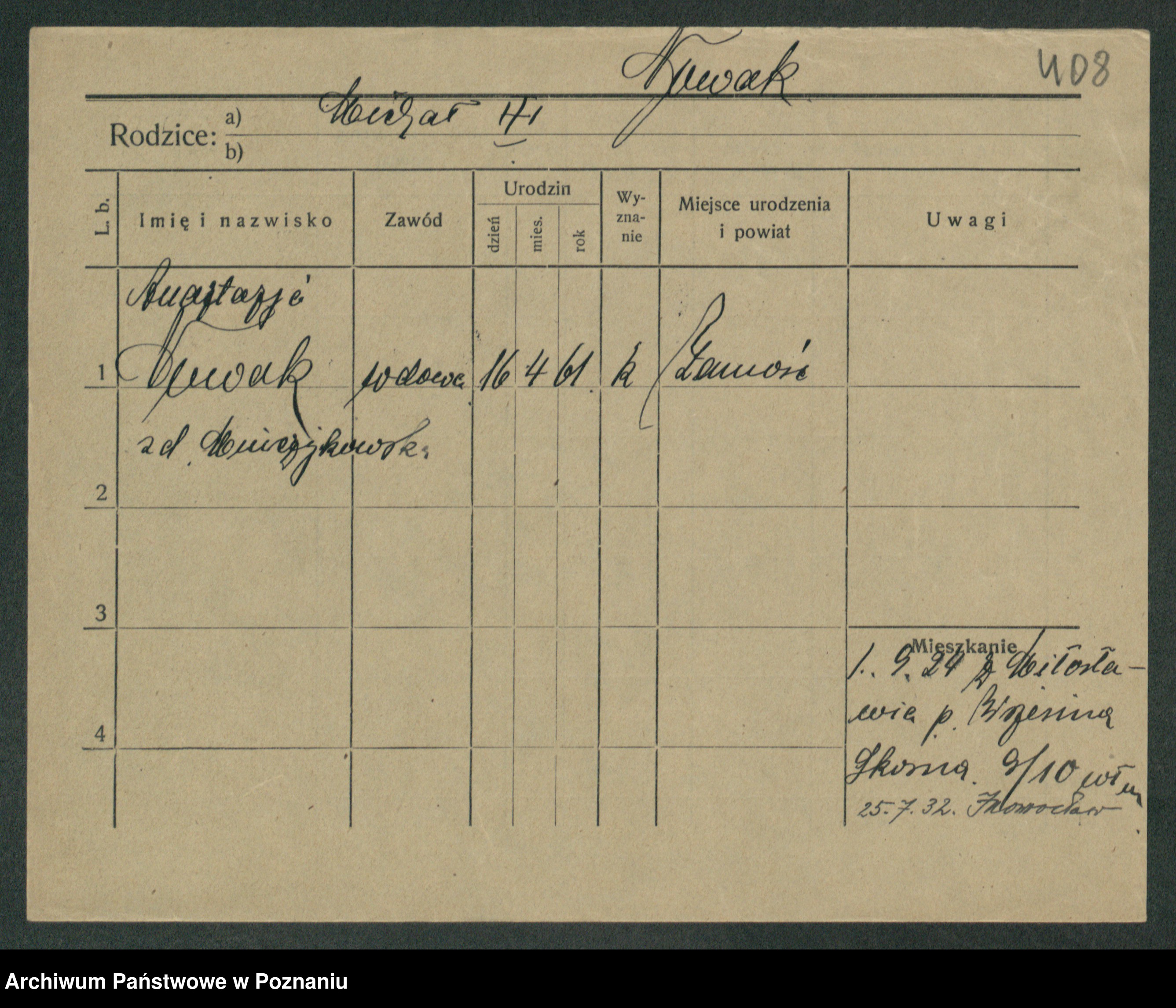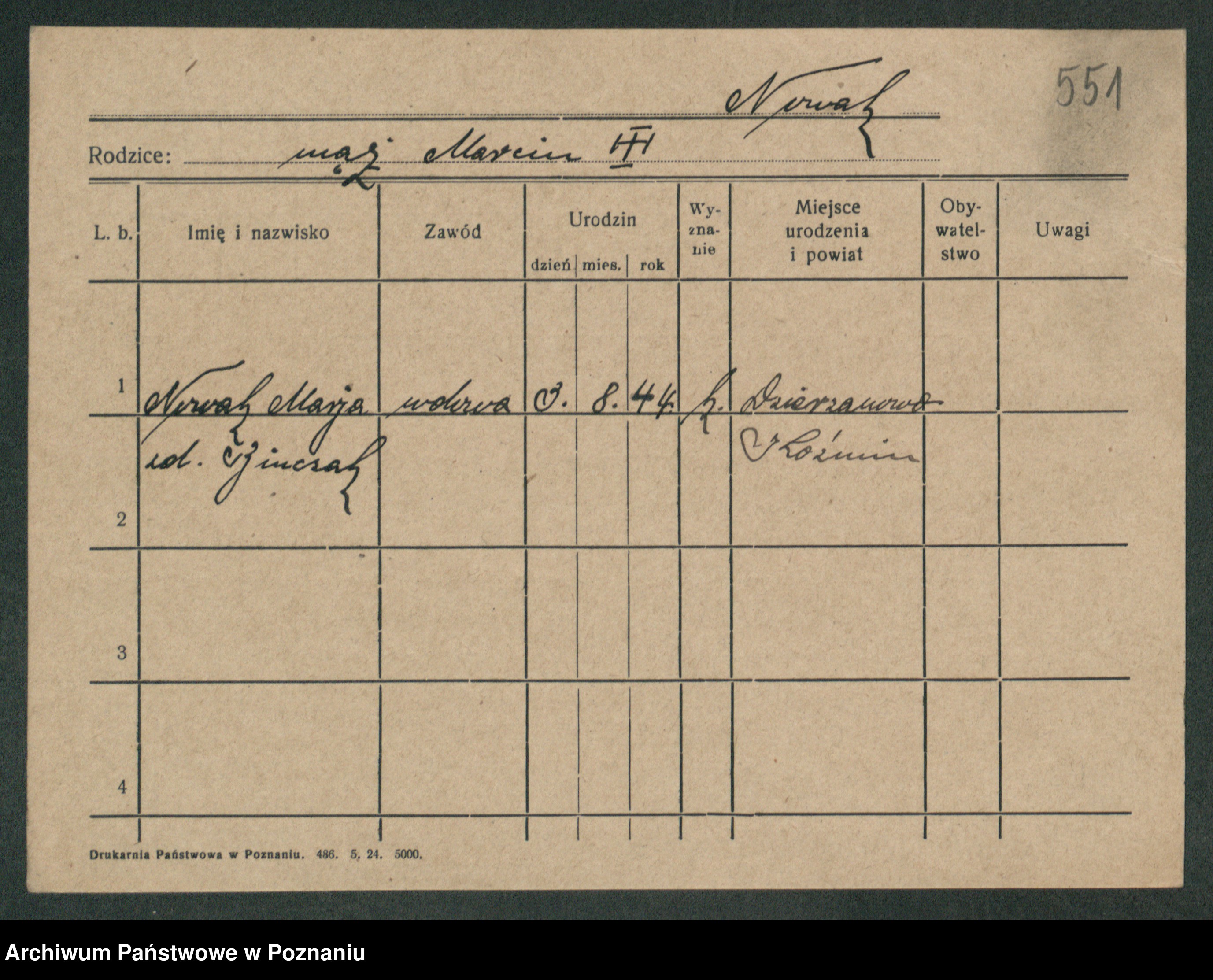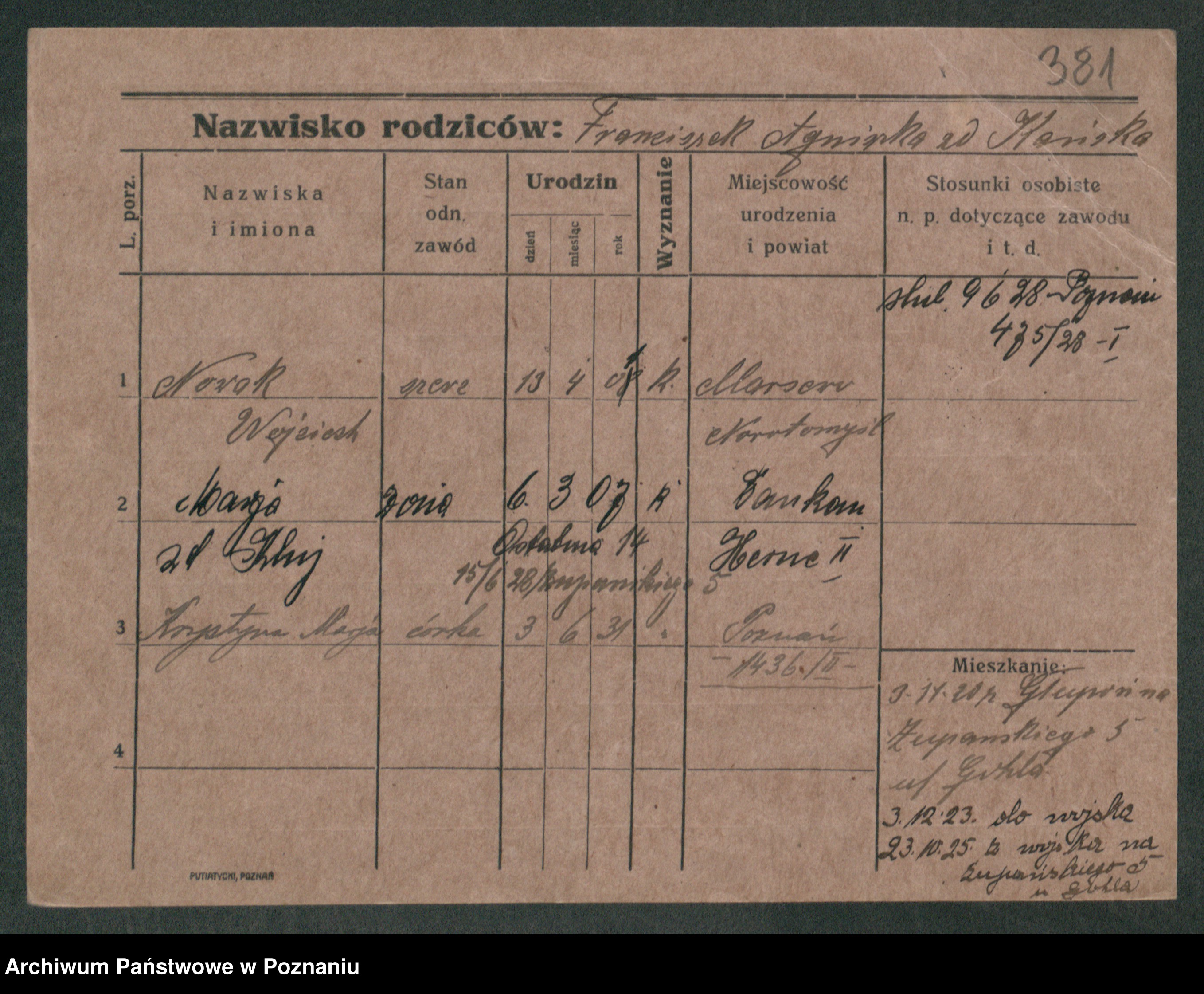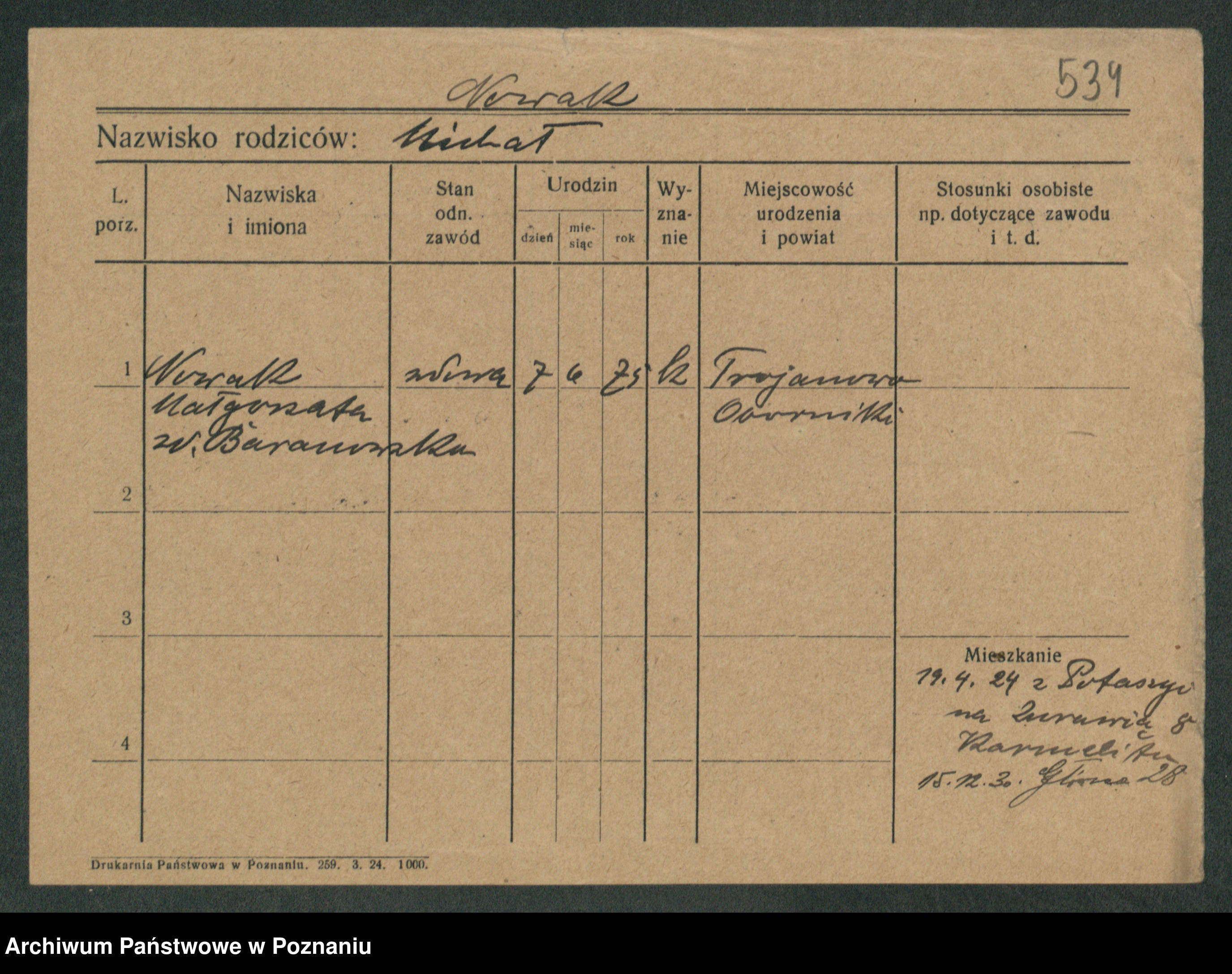 Podgląd karty osobowej dostępny jest po kliknięciu na nazwisko lub ikonkę karty. Można dokonywać powiększenia (ikony na górze) lub przechodzić między kolejnymi skanami (strzałki po bokach).